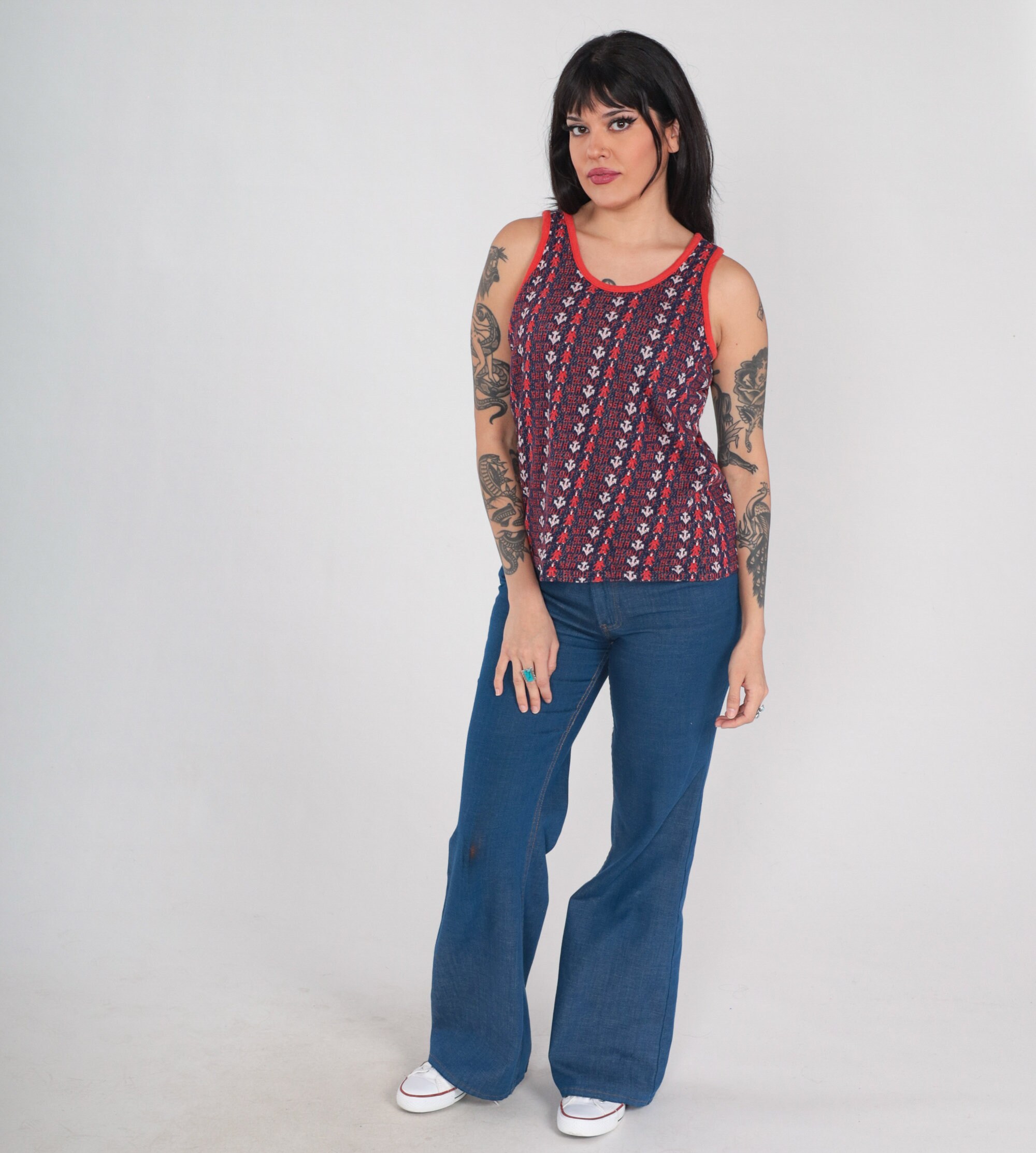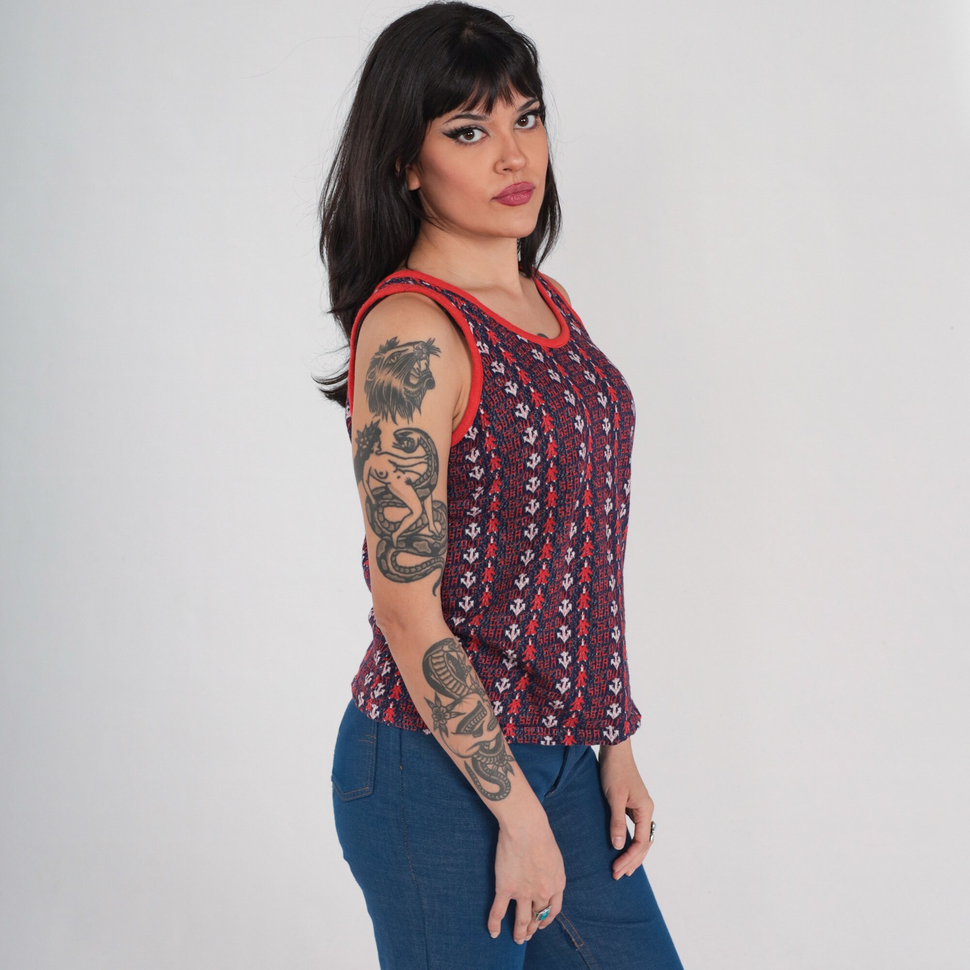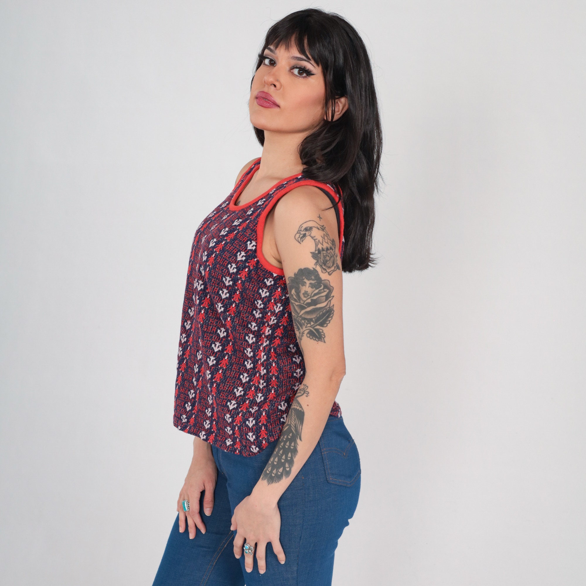 Vintage 70s tank top with an anchor print and "Sea Scout" throughout.