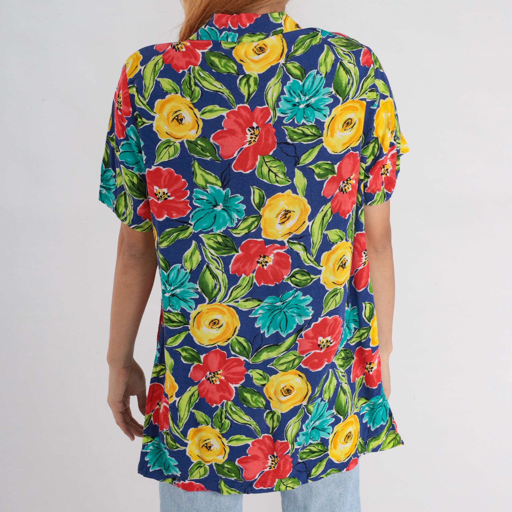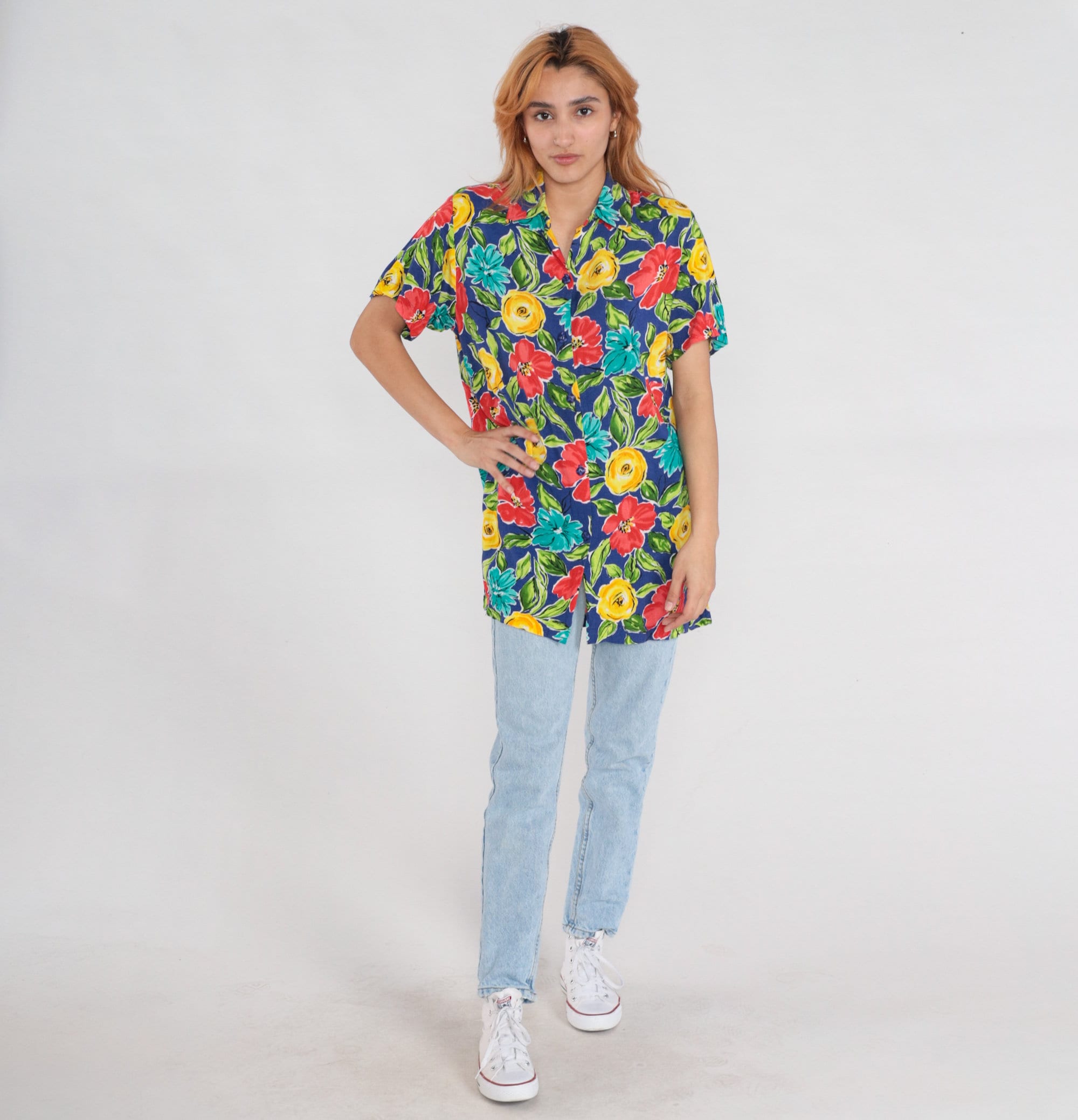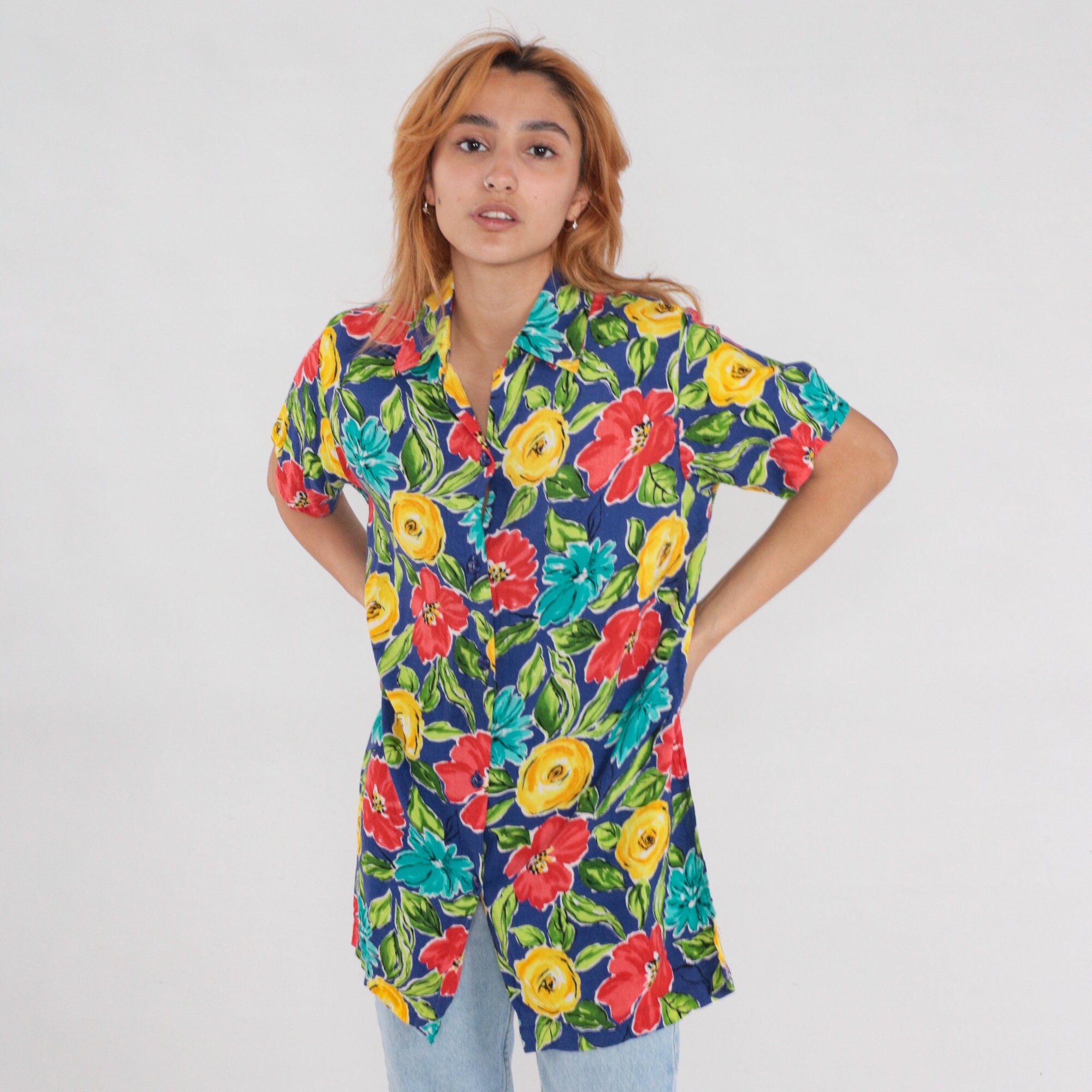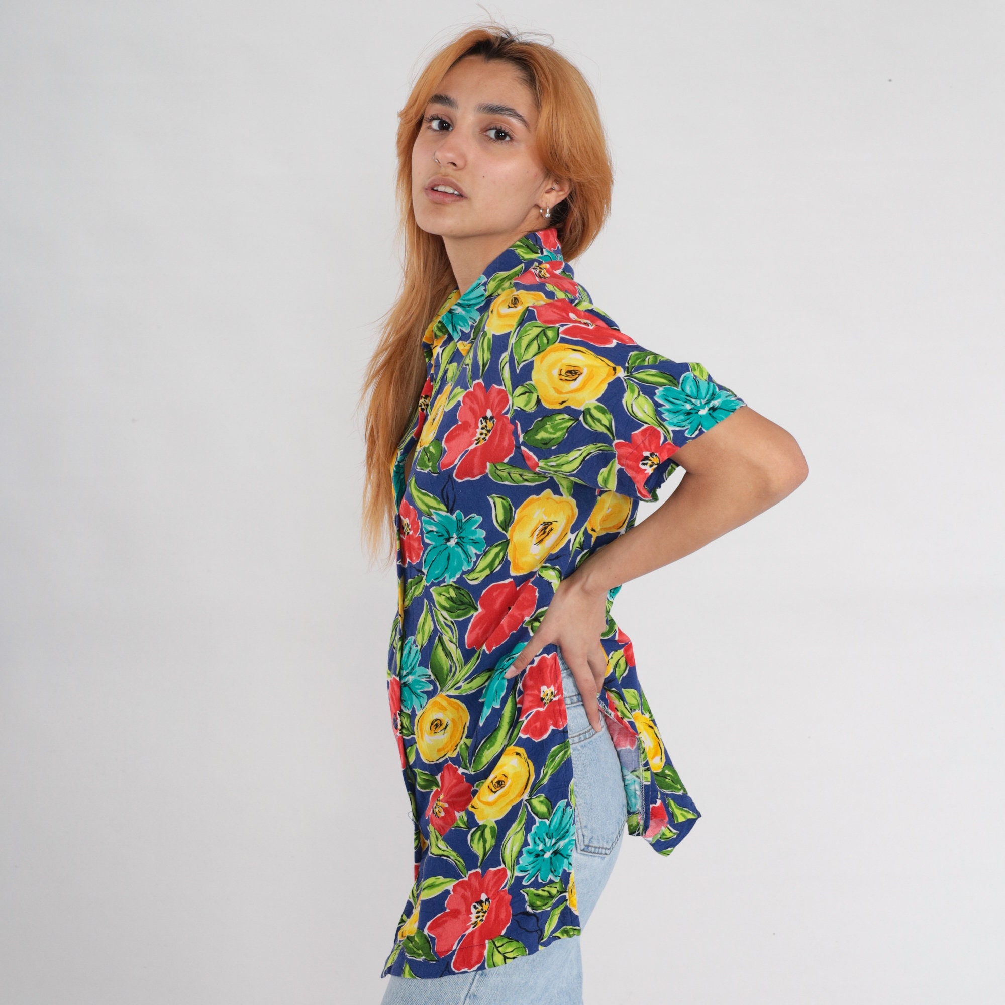 Vintage 90s blouse in a floral print. Short sleeves, buttons up the front.