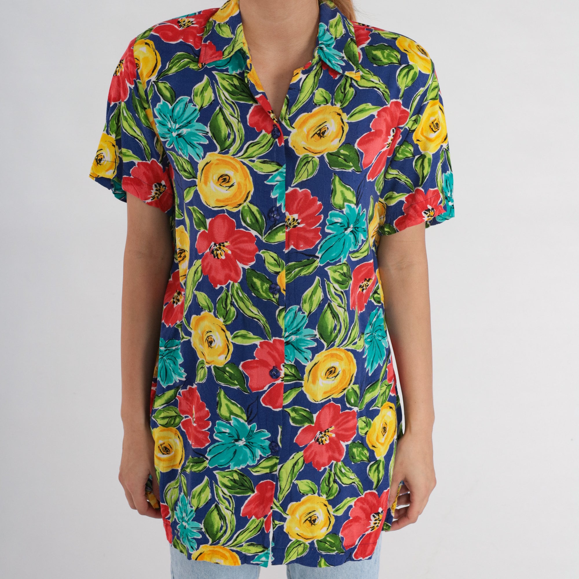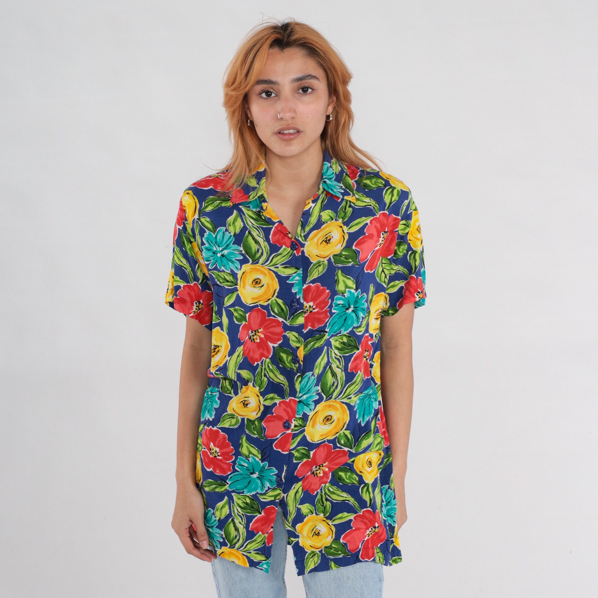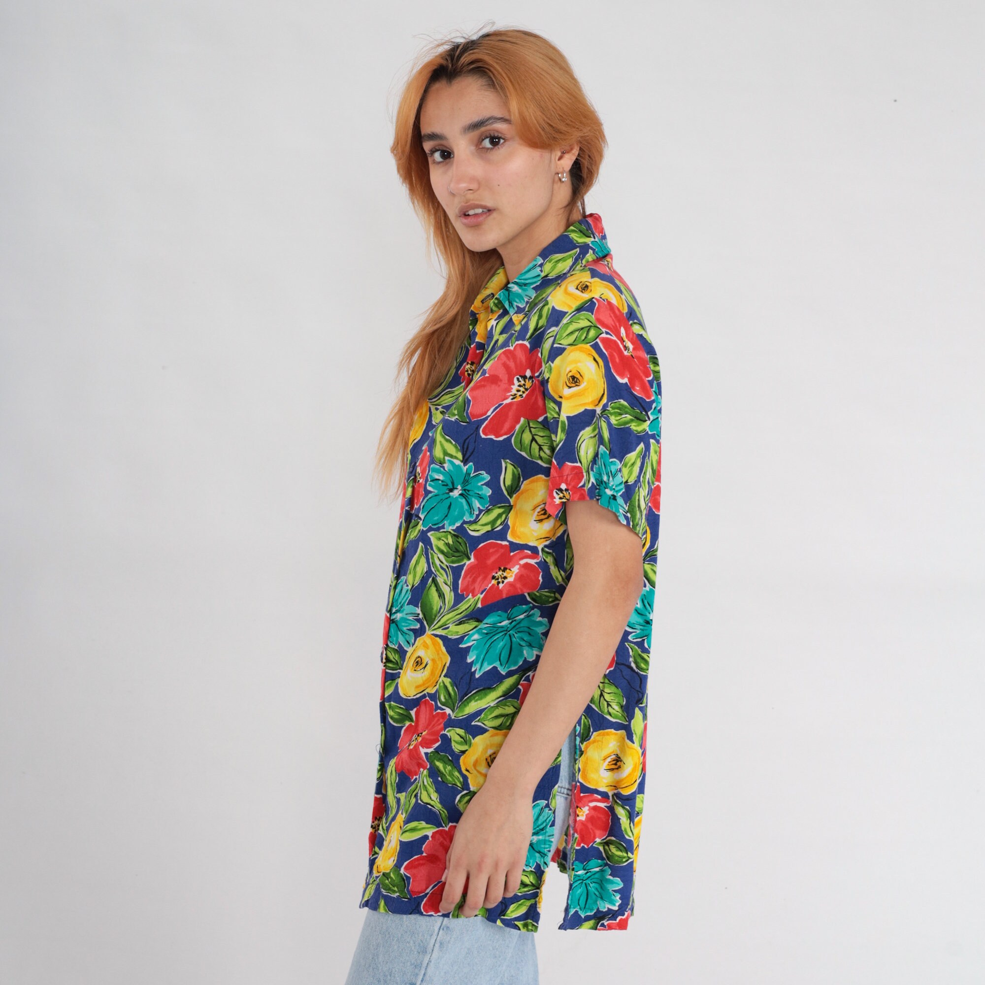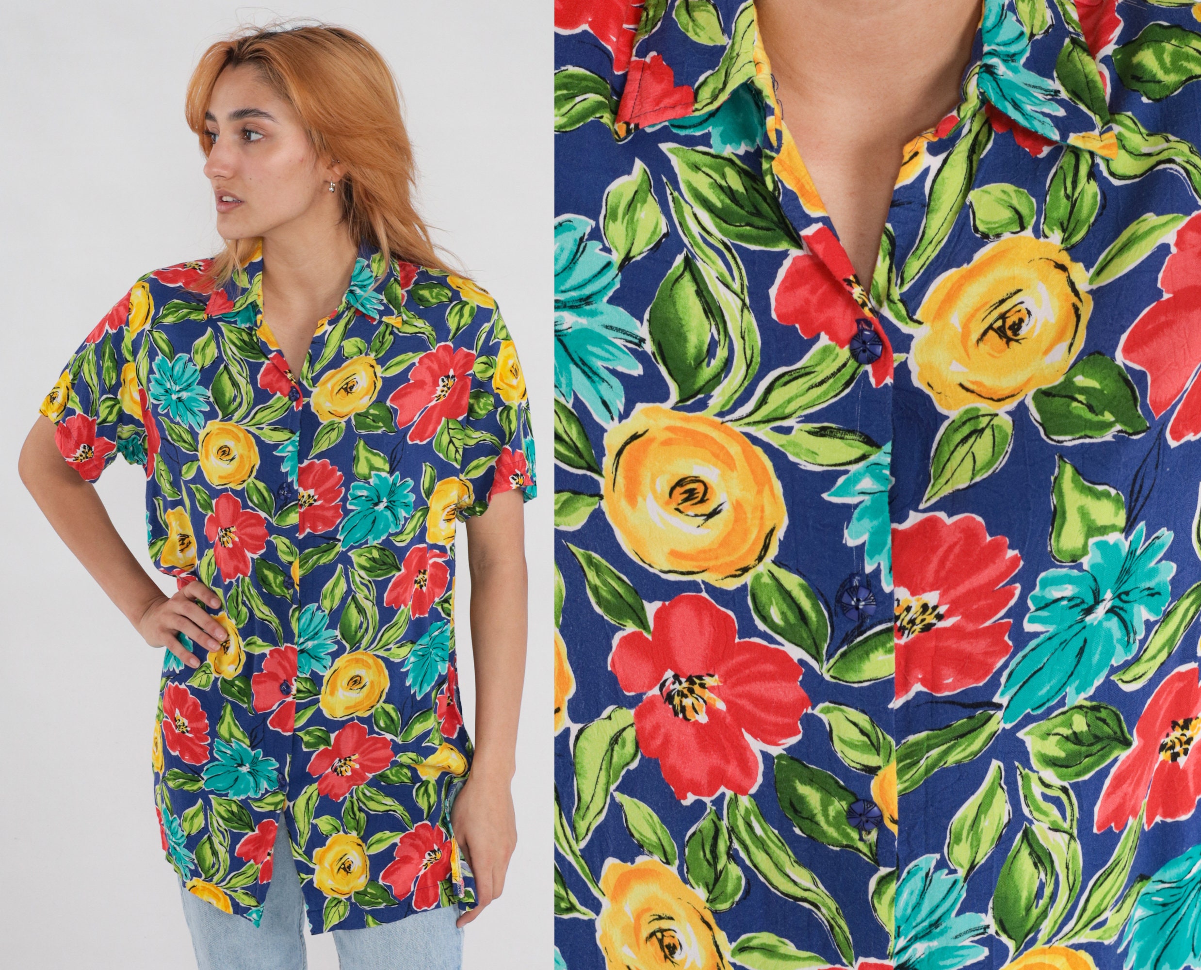 Vintage 90s blouse in a floral print. Short sleeves, buttons up the front.