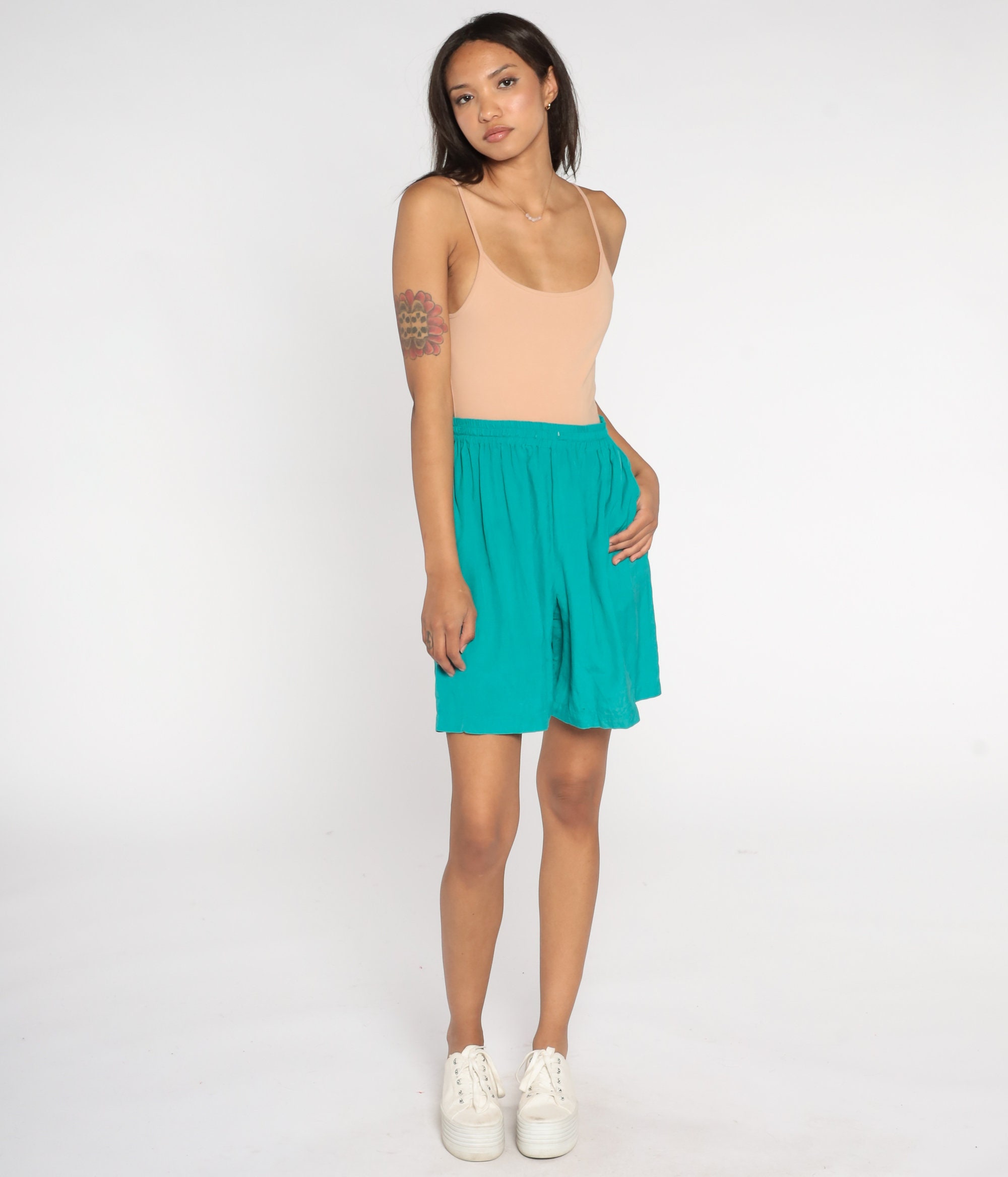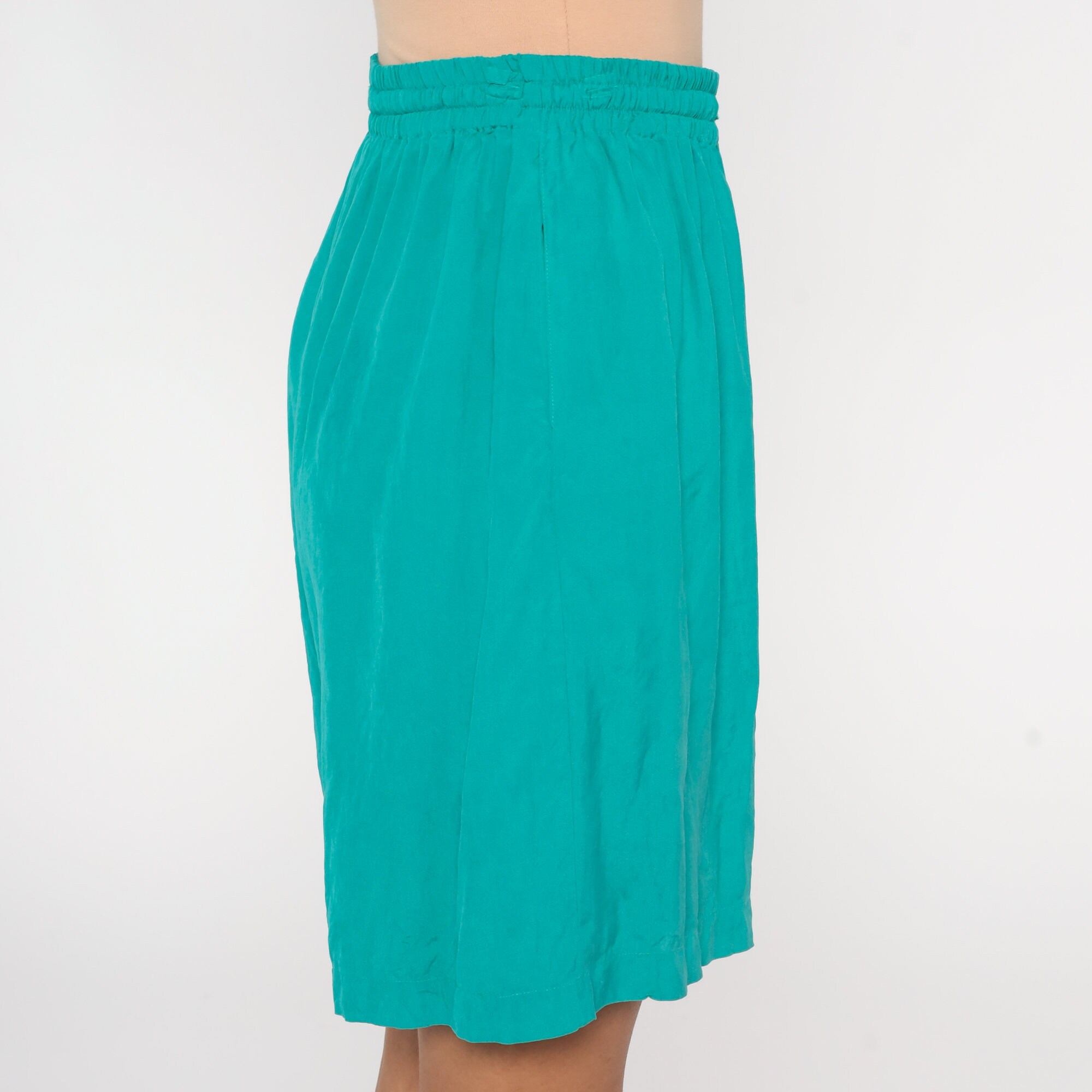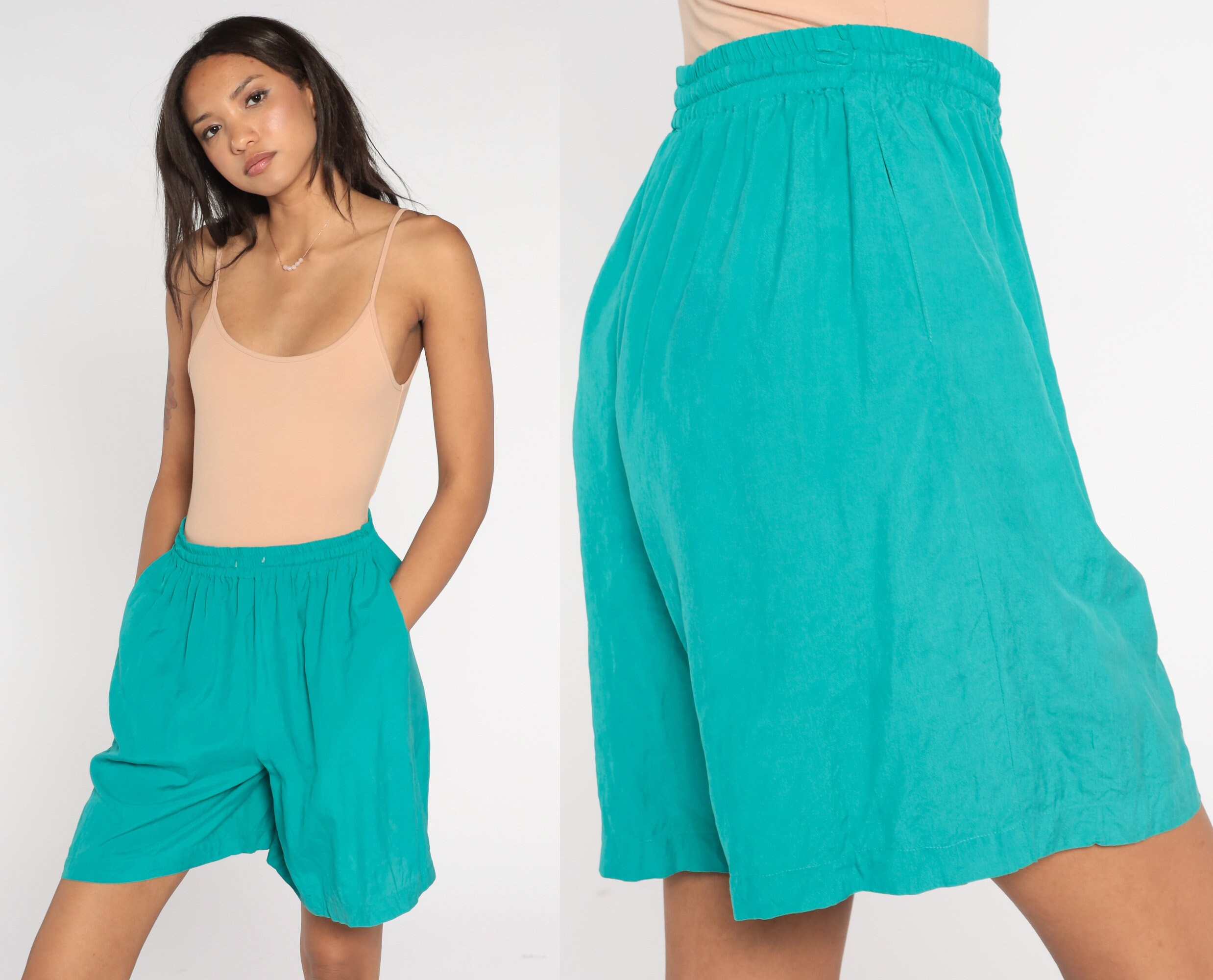 Vintage 90s shorts green silk with a baggy fit and a high elastic waist.