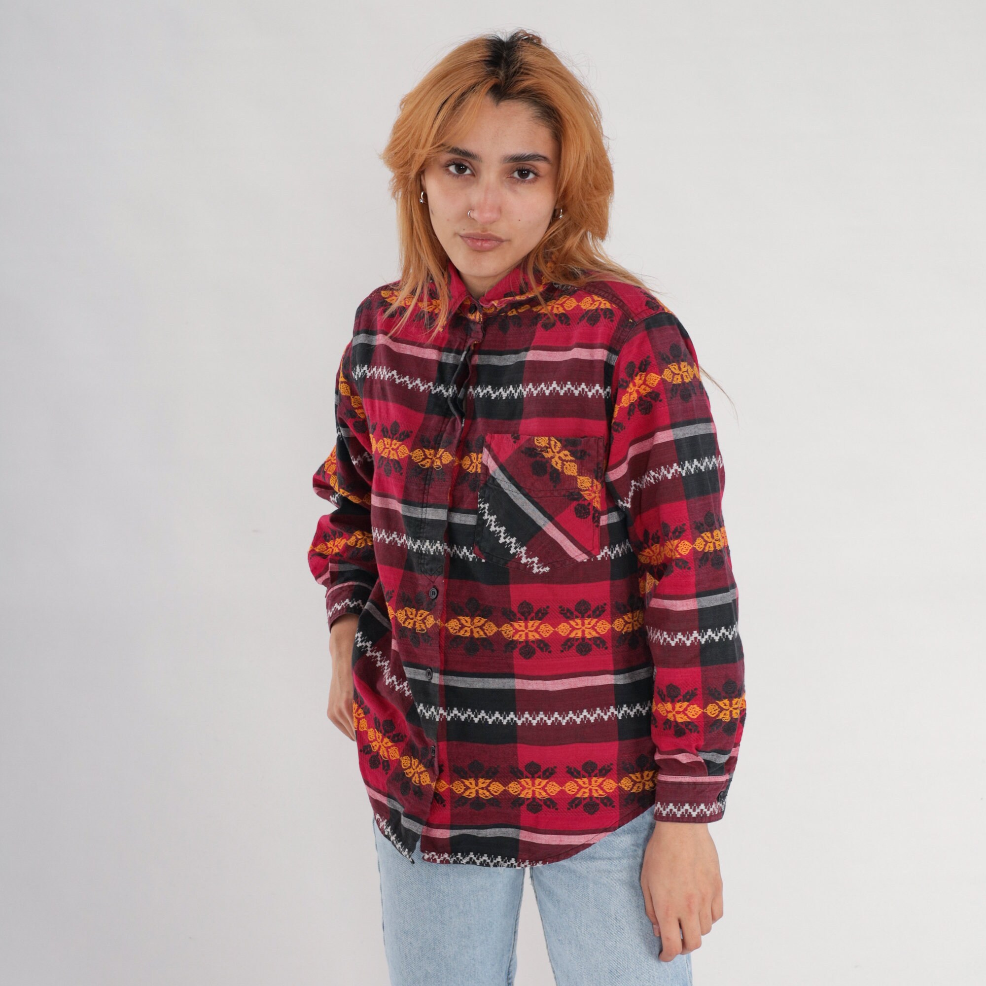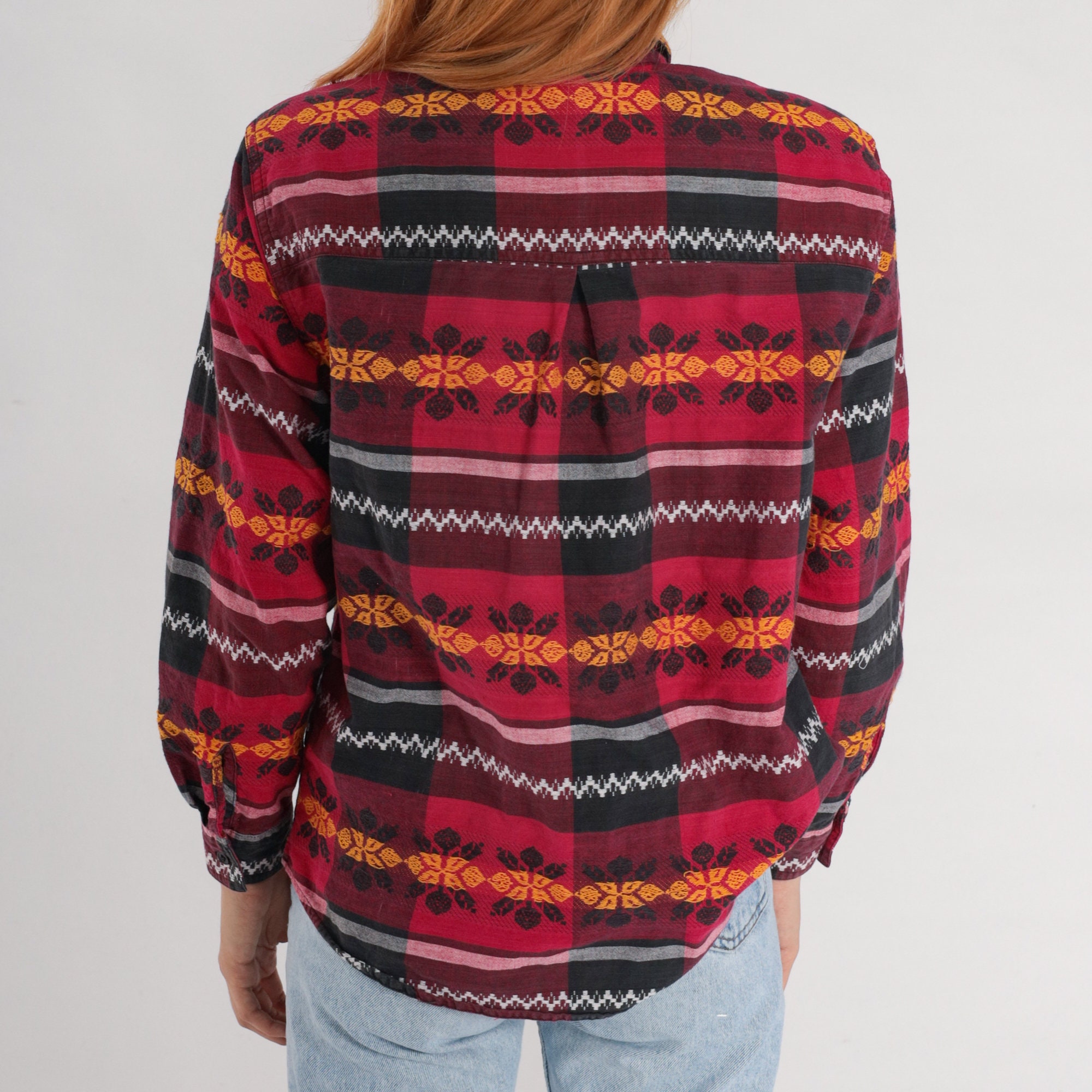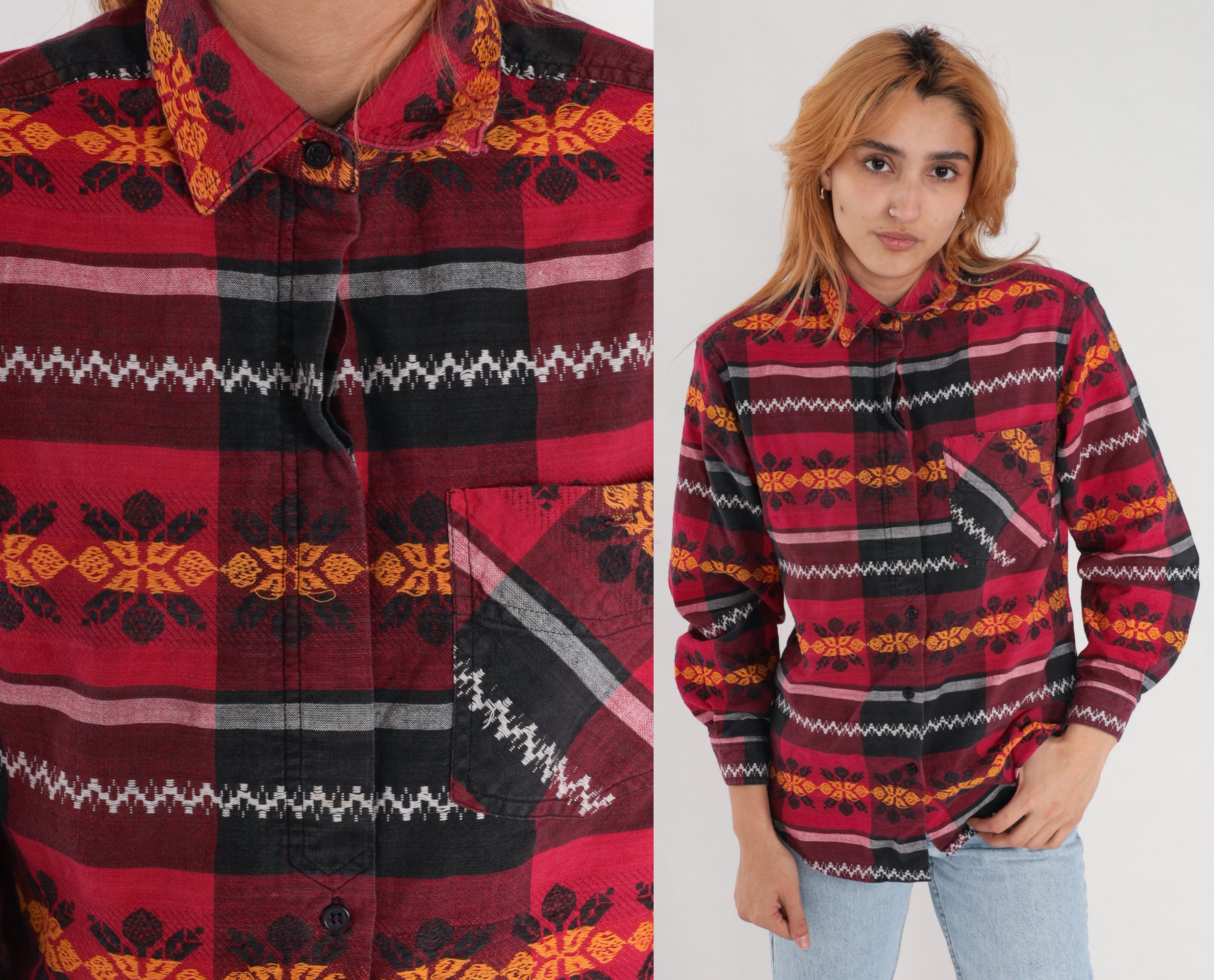 Vintage 90s shirt with a black and red checkered print and floral embroidery. Long sleeves, buttons up the front.