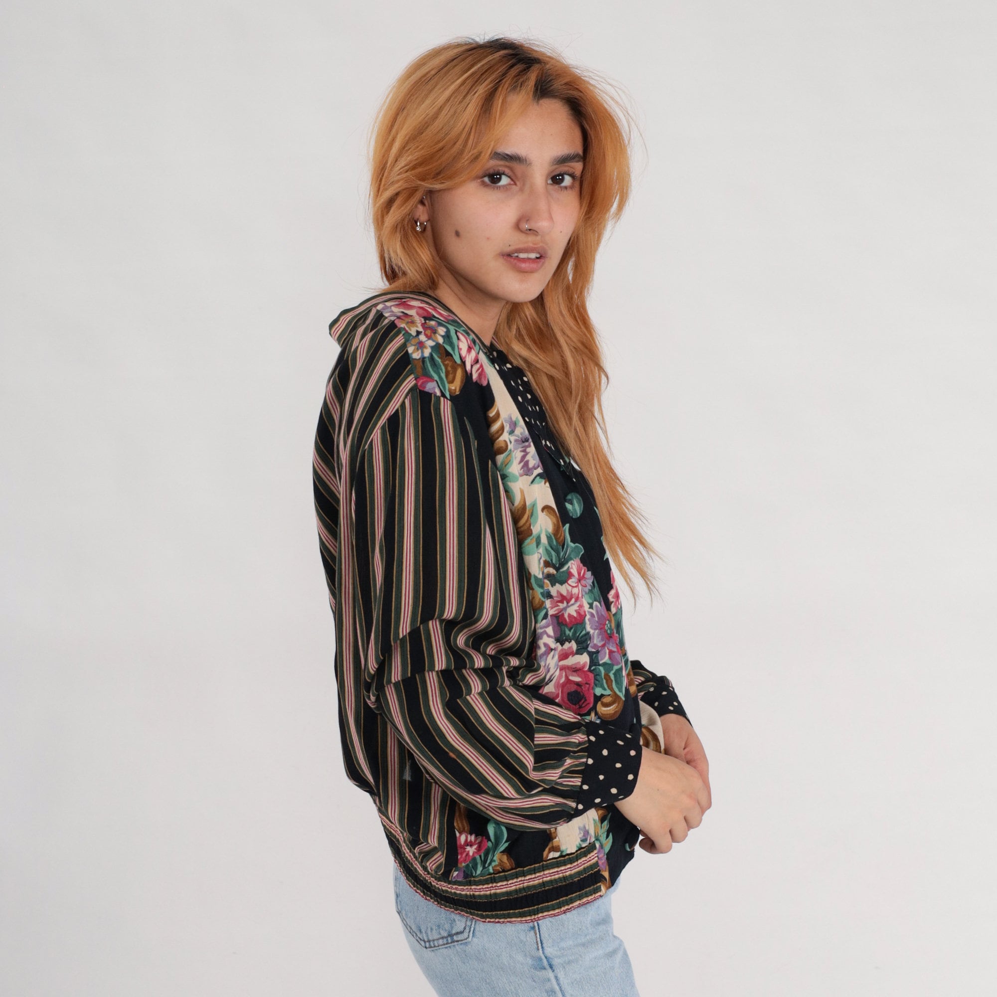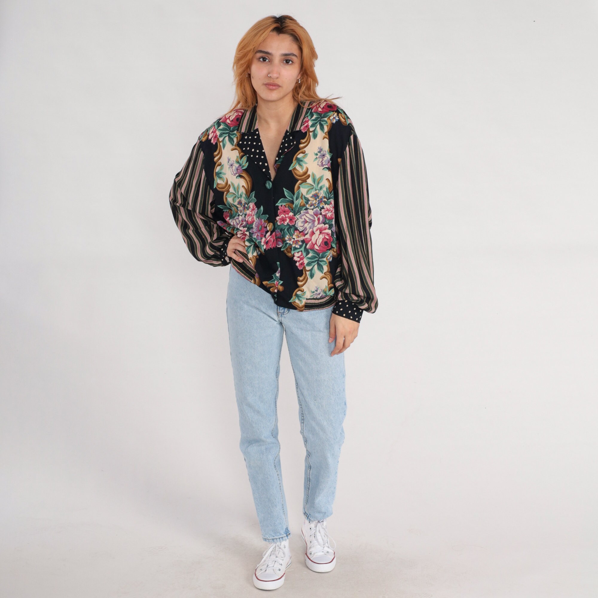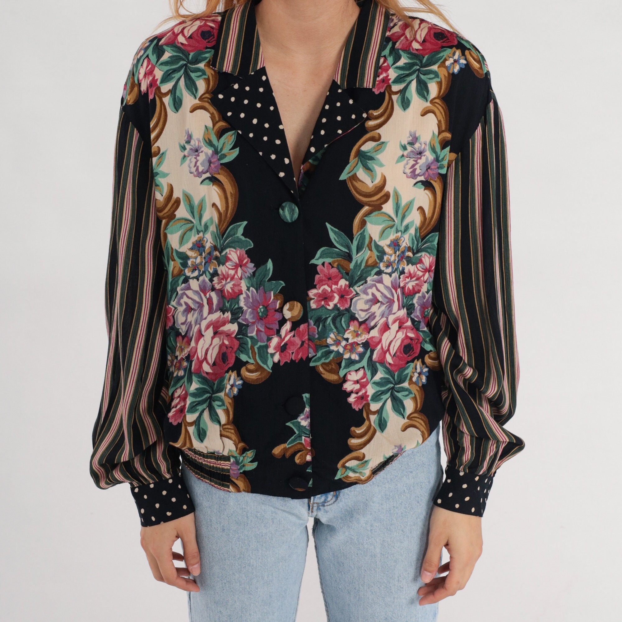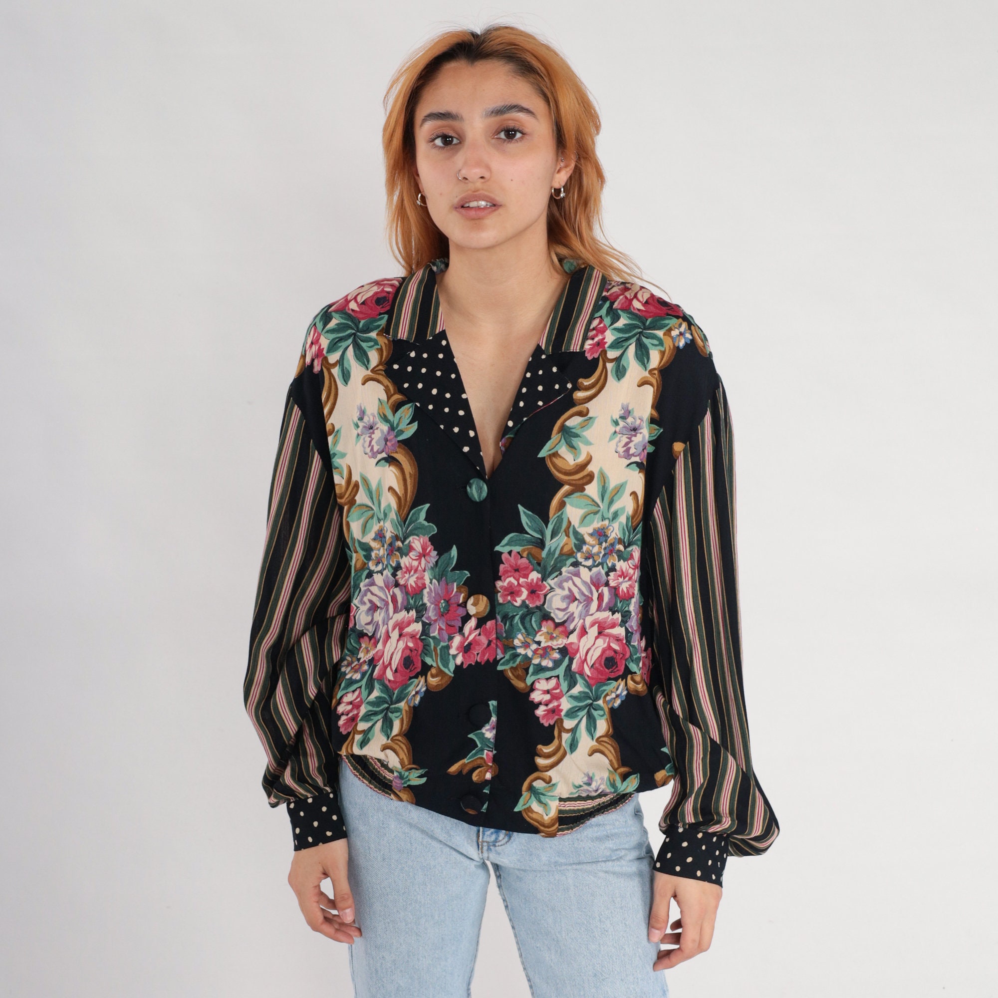 Vintage 90s shirt in rayon with a floral print. It has long sleeves and buttons up the front.