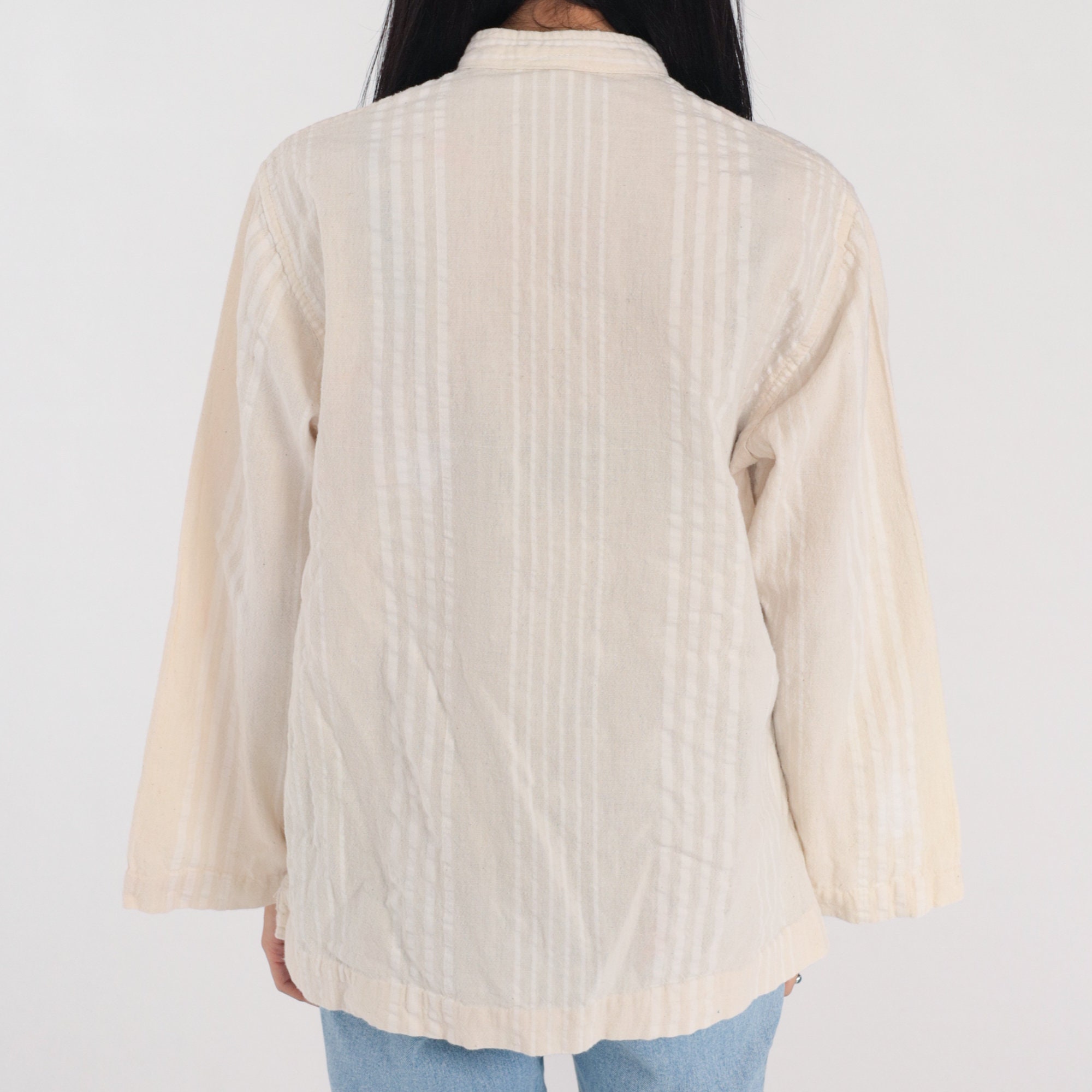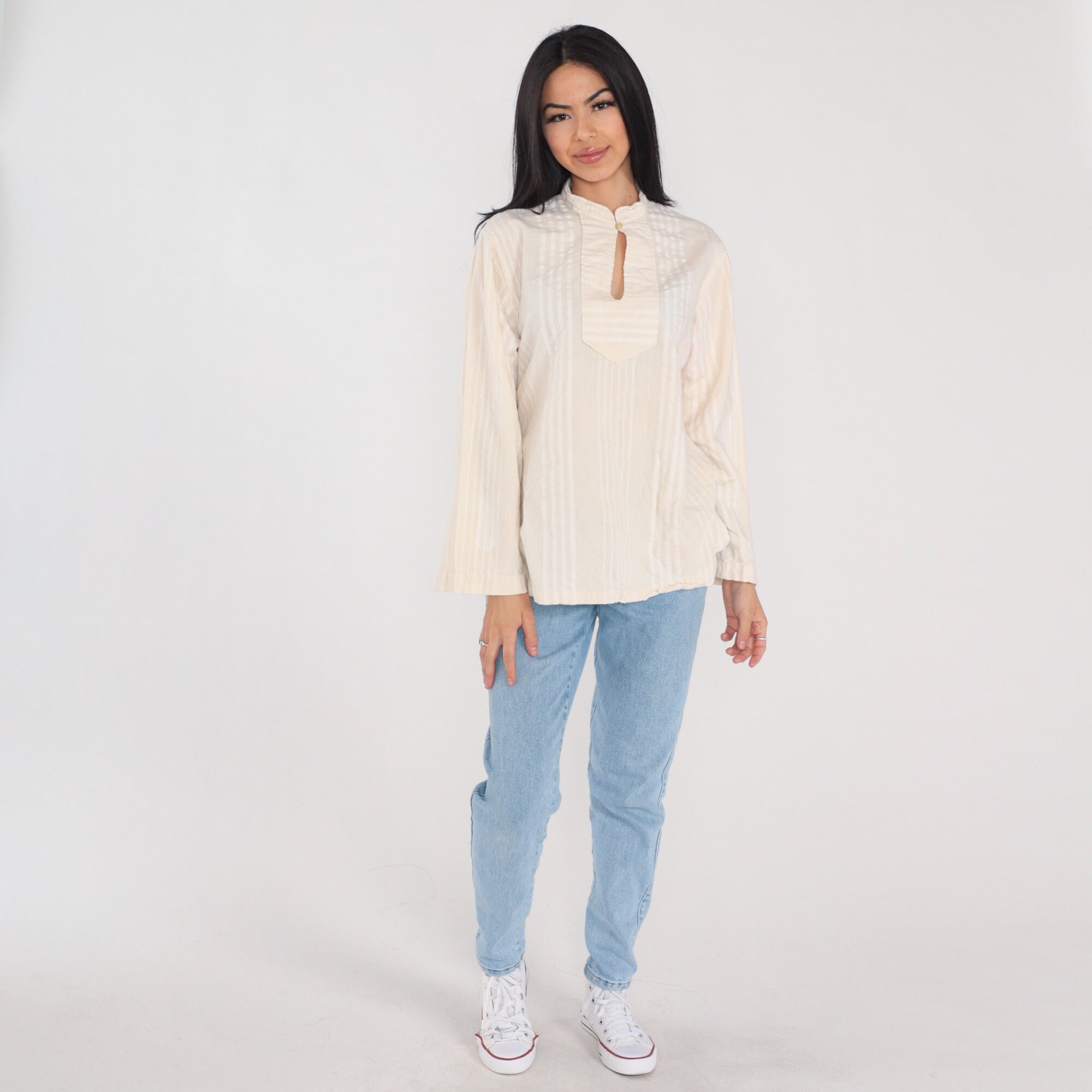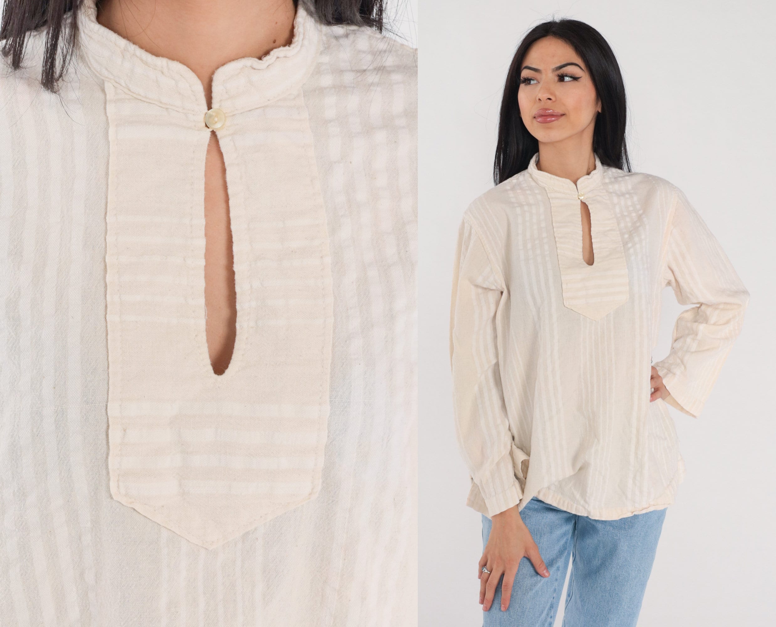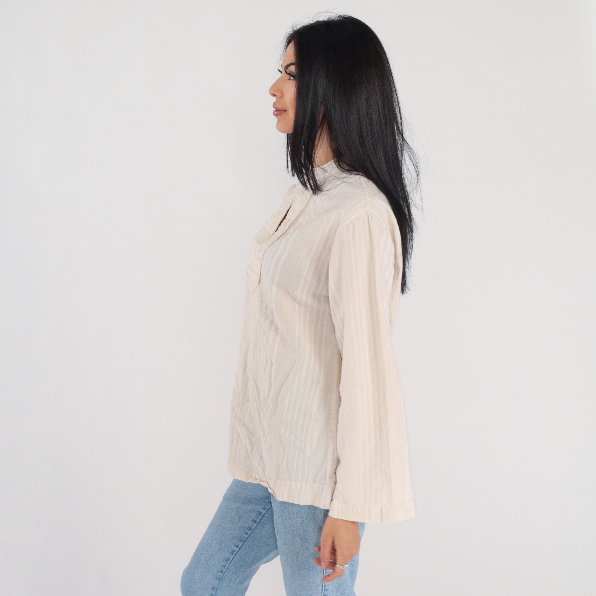 Vintage 00s blouse in cream with subtle stripes. It has long wide sleeves, a high neck, and a keyhole button.