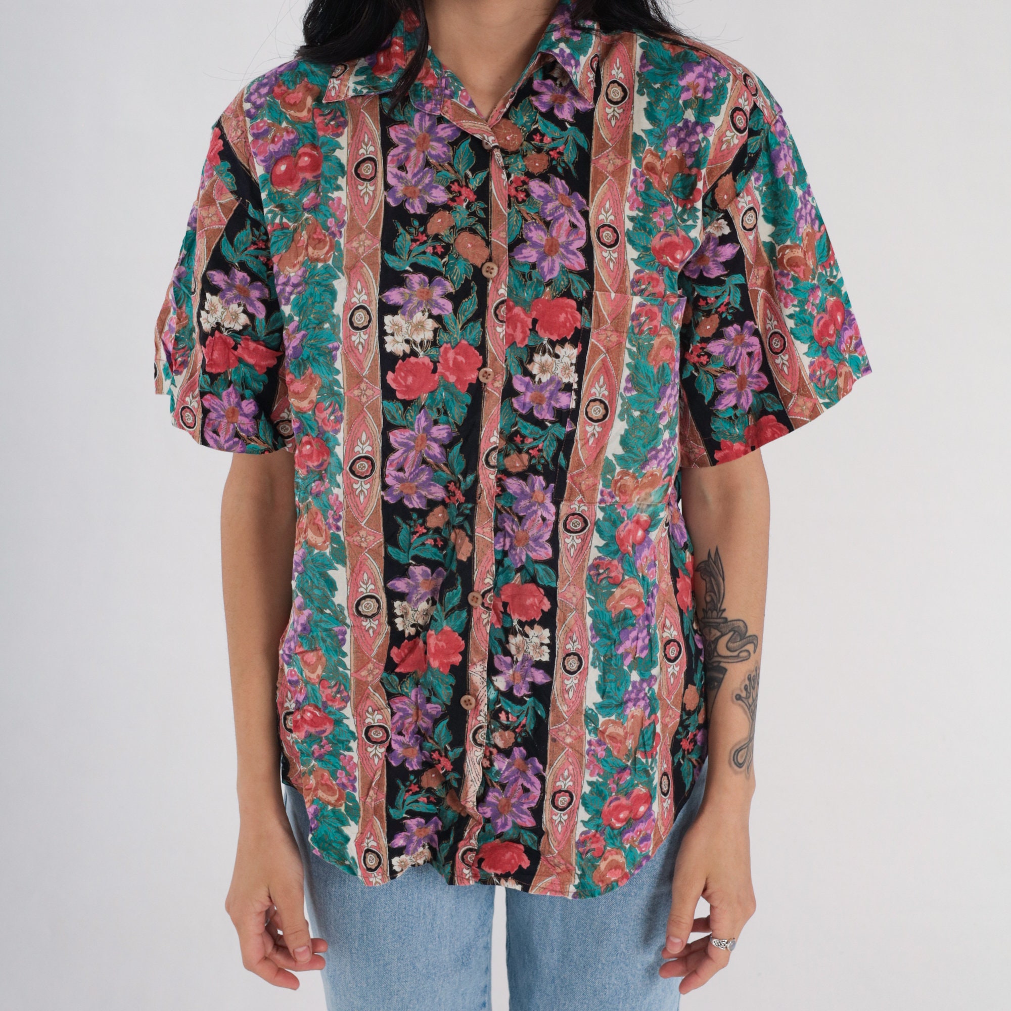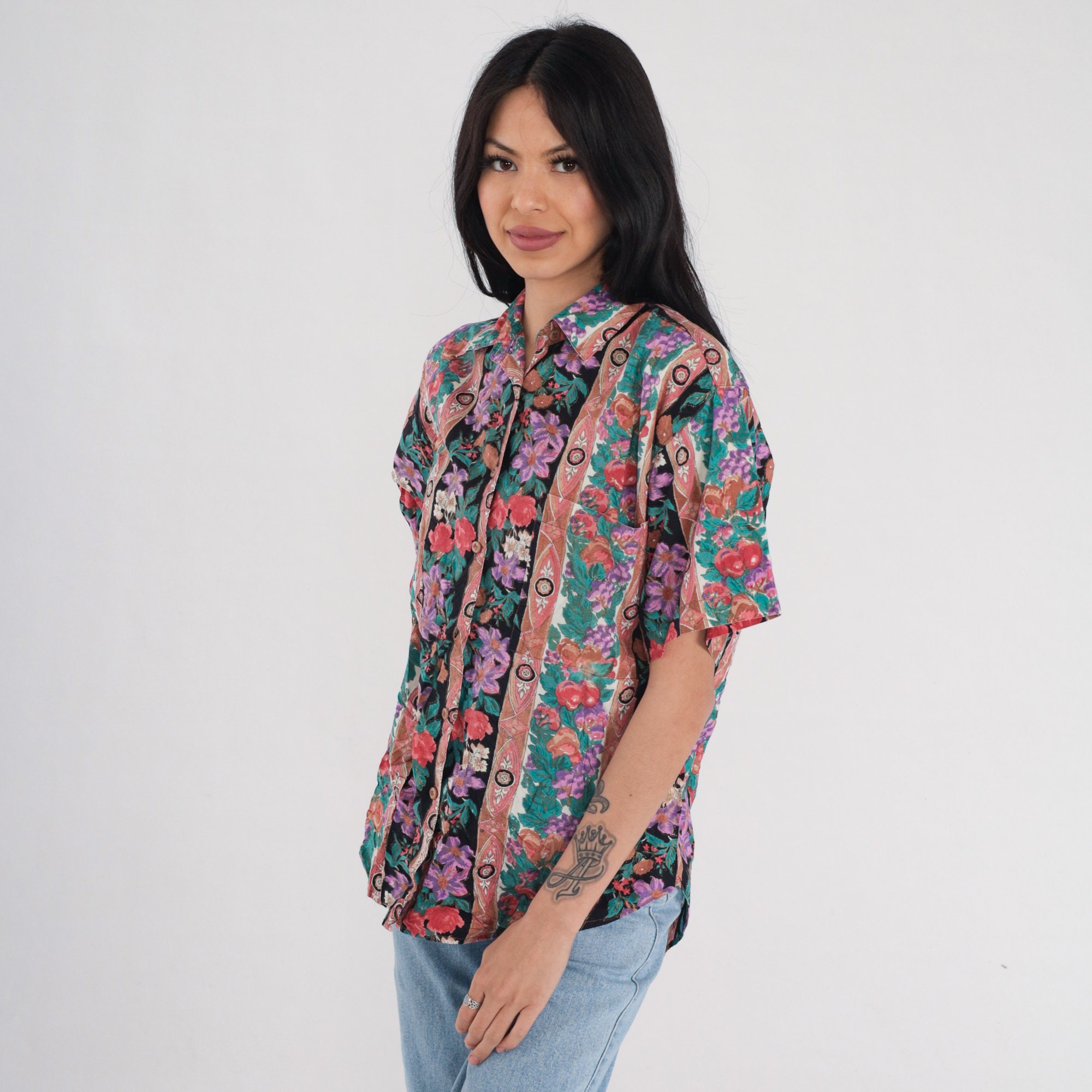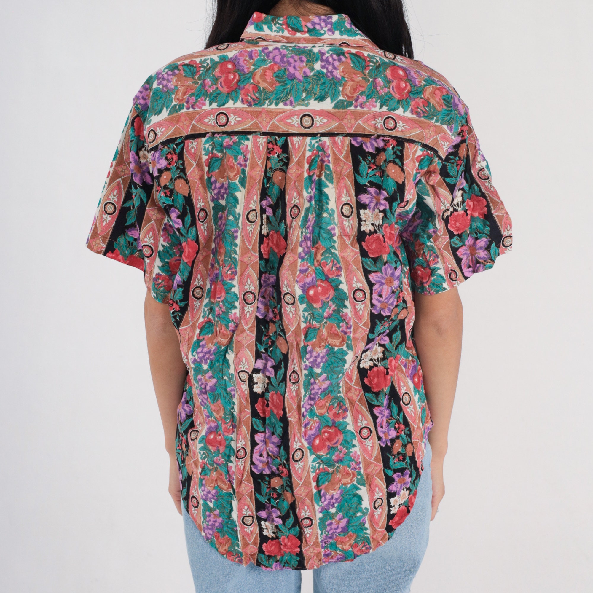 Vintage 90s shirt in a striped floral and fruit print with short sleeves and buttons up the front.