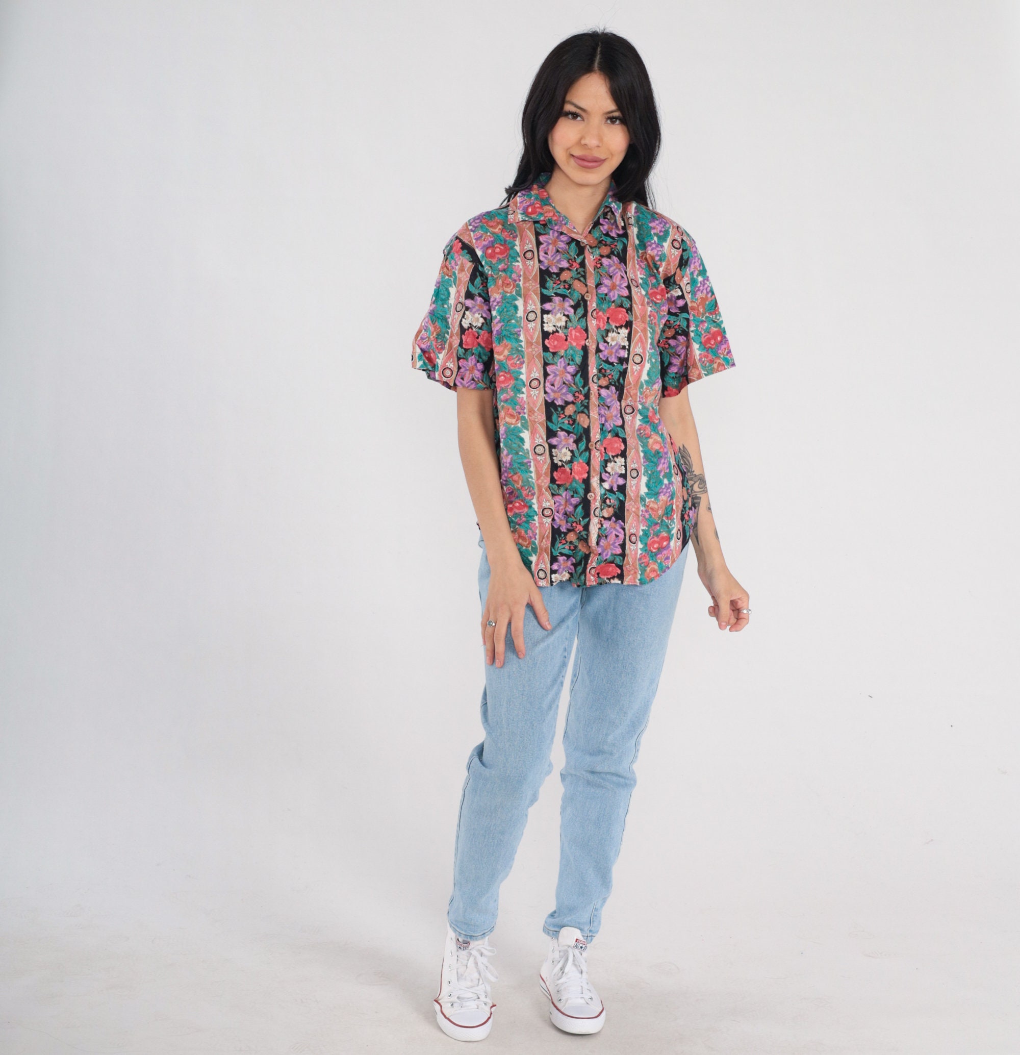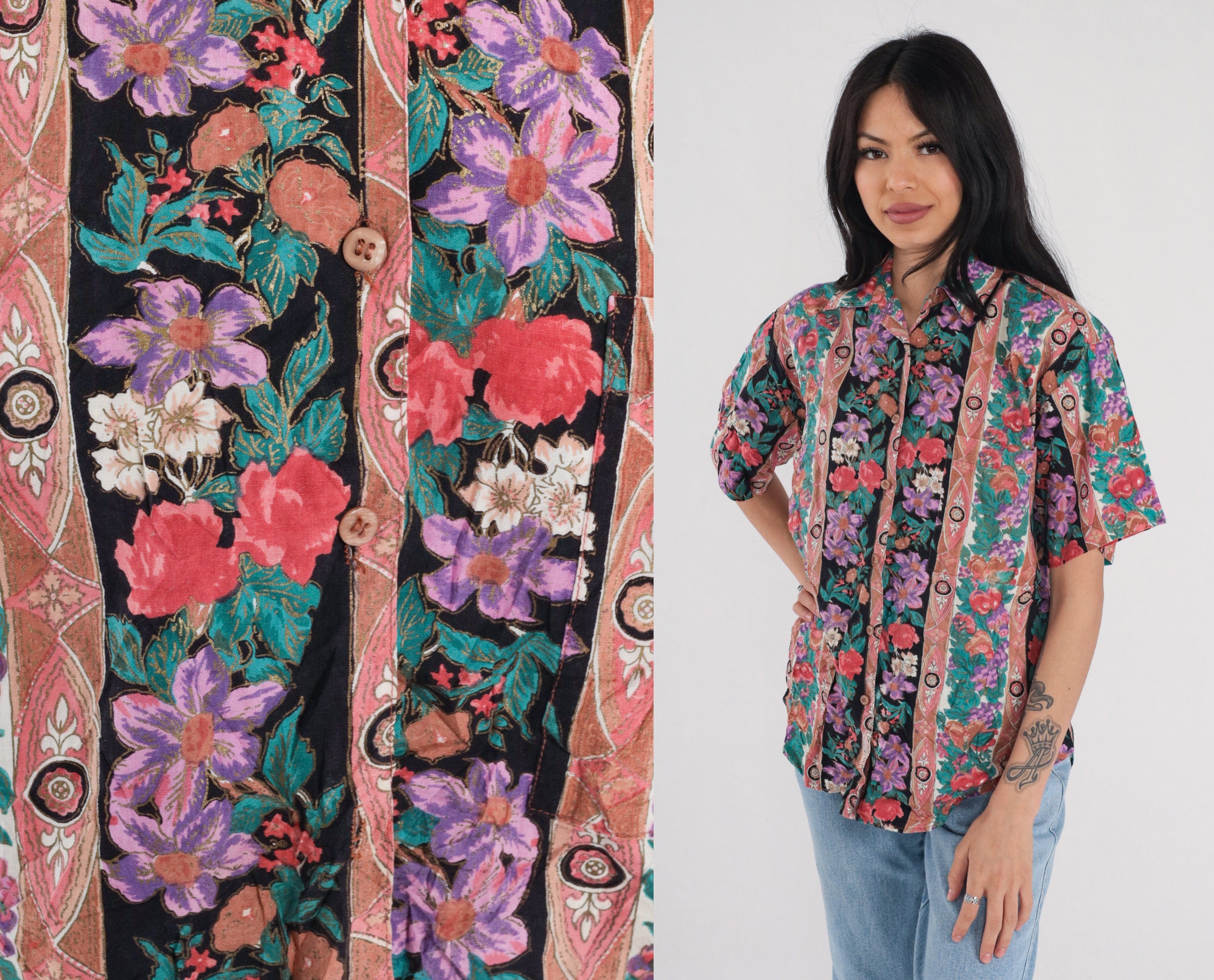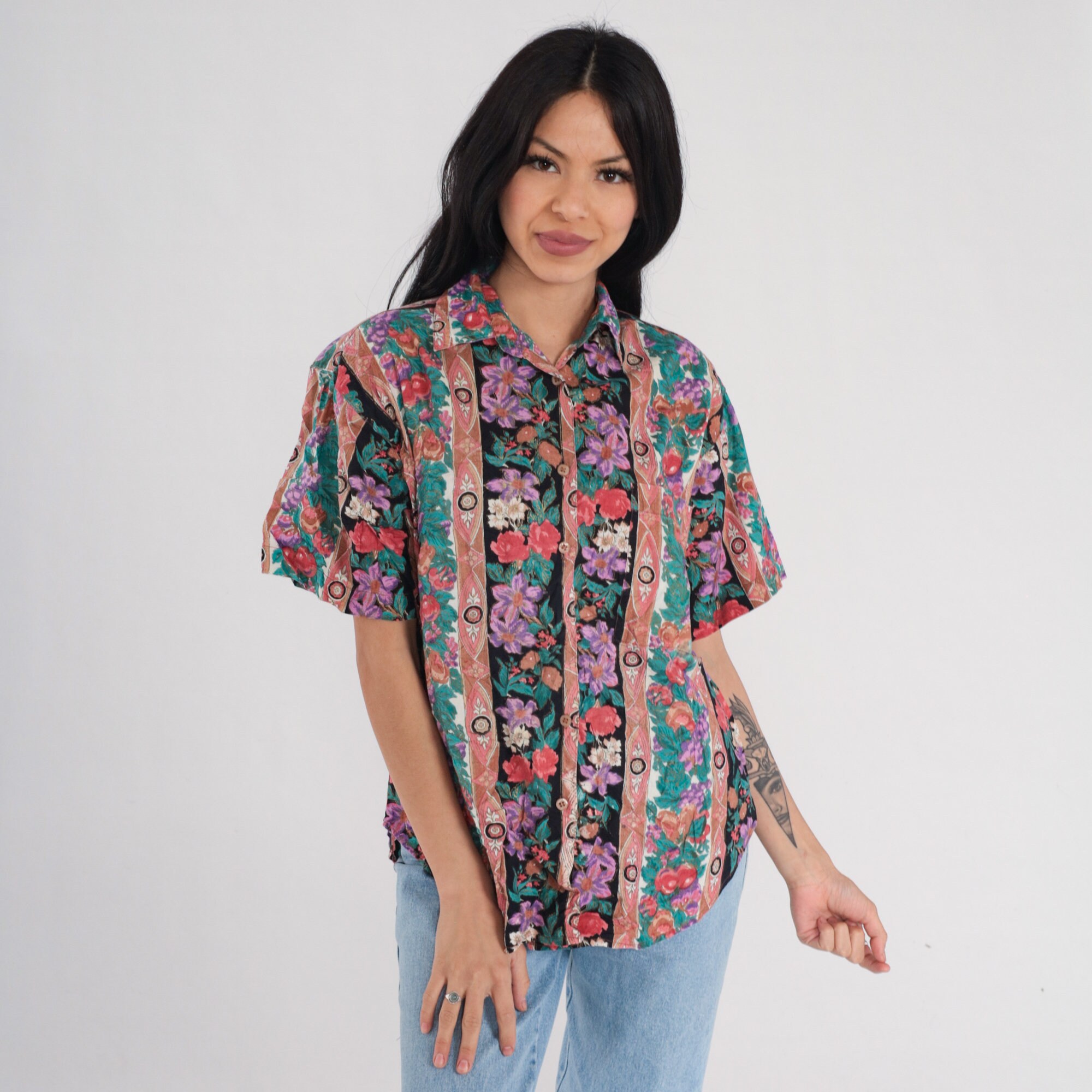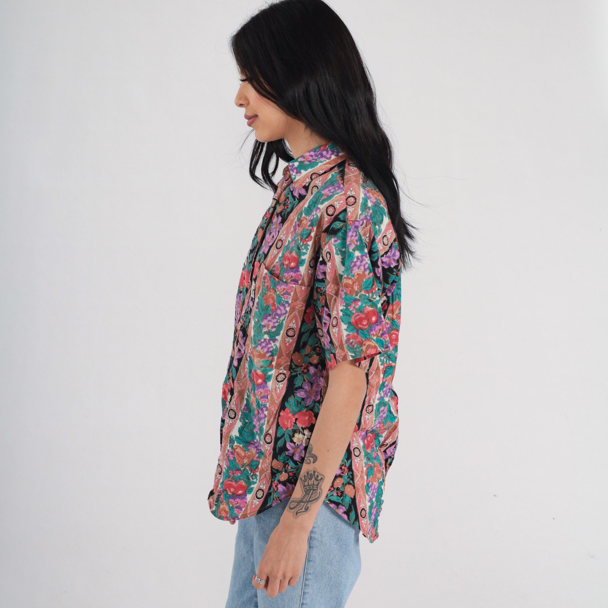 Vintage 90s shirt in a striped floral and fruit print with short sleeves and buttons up the front.