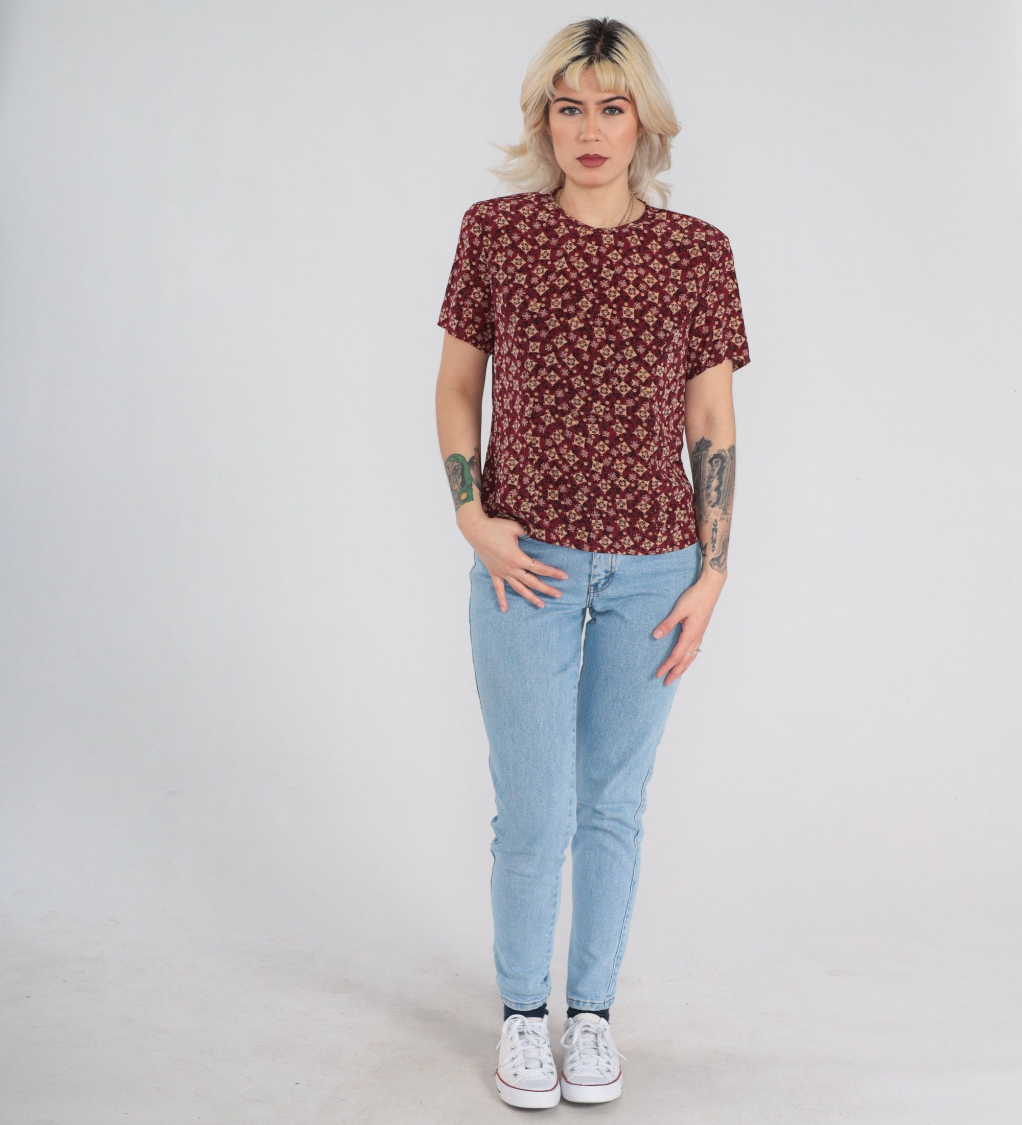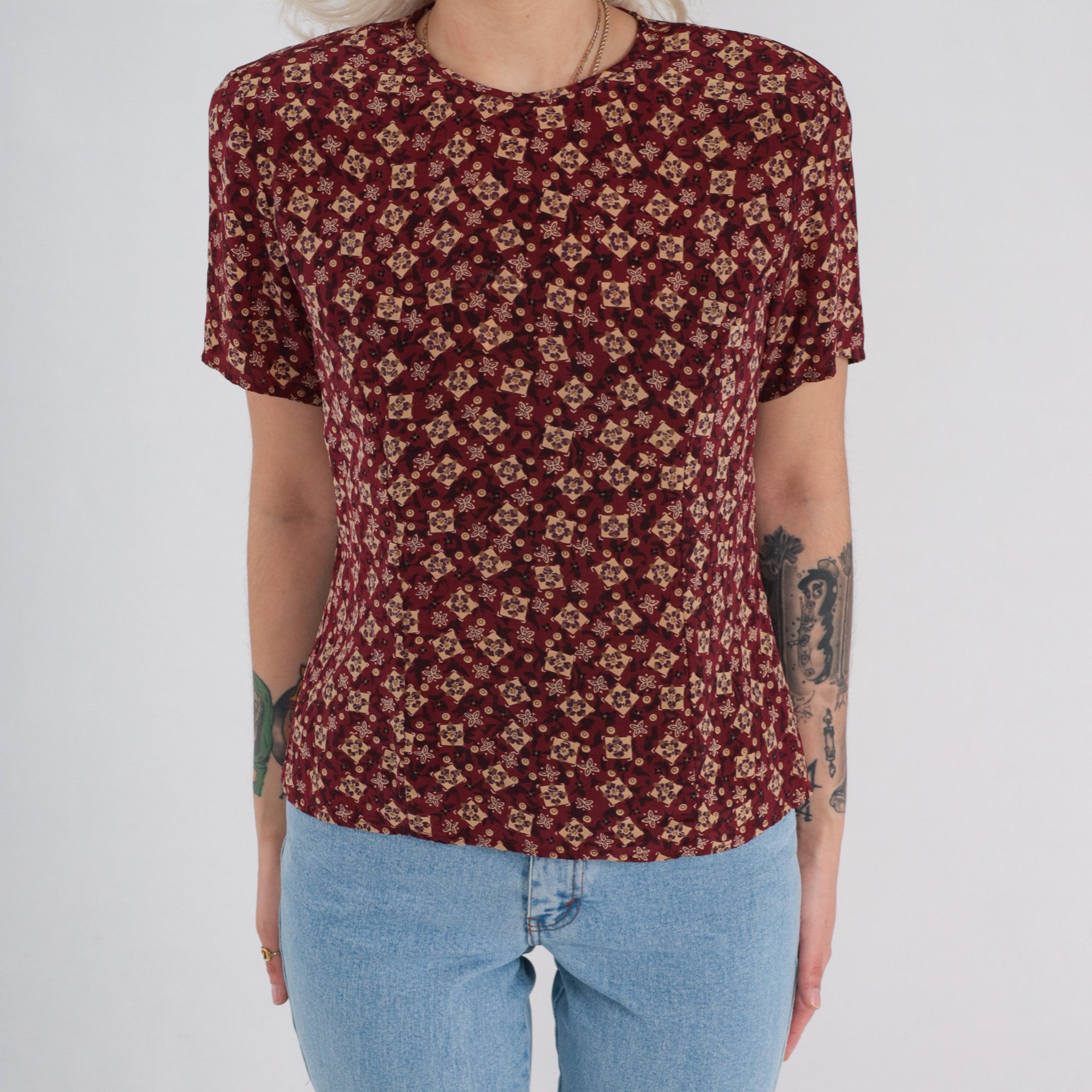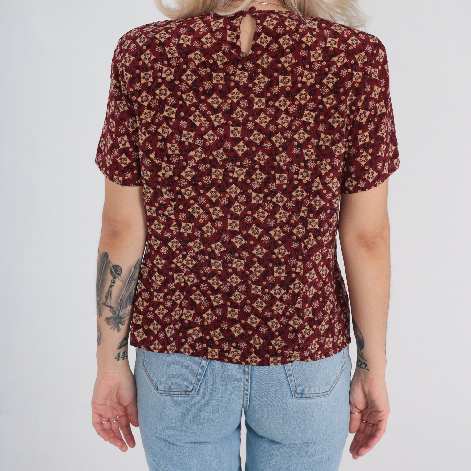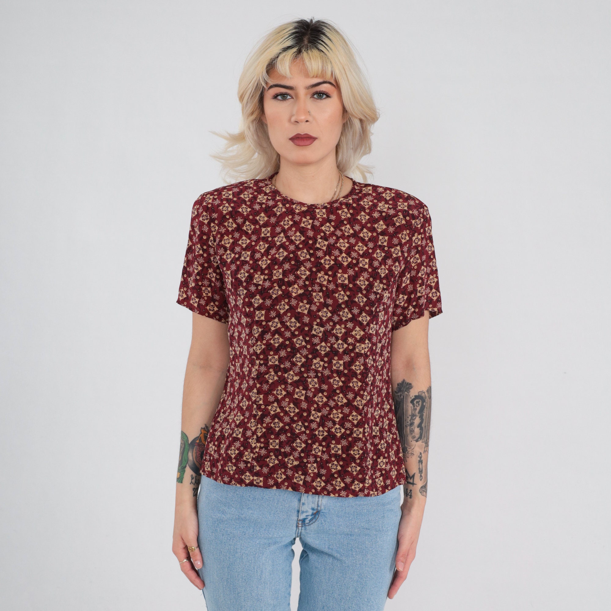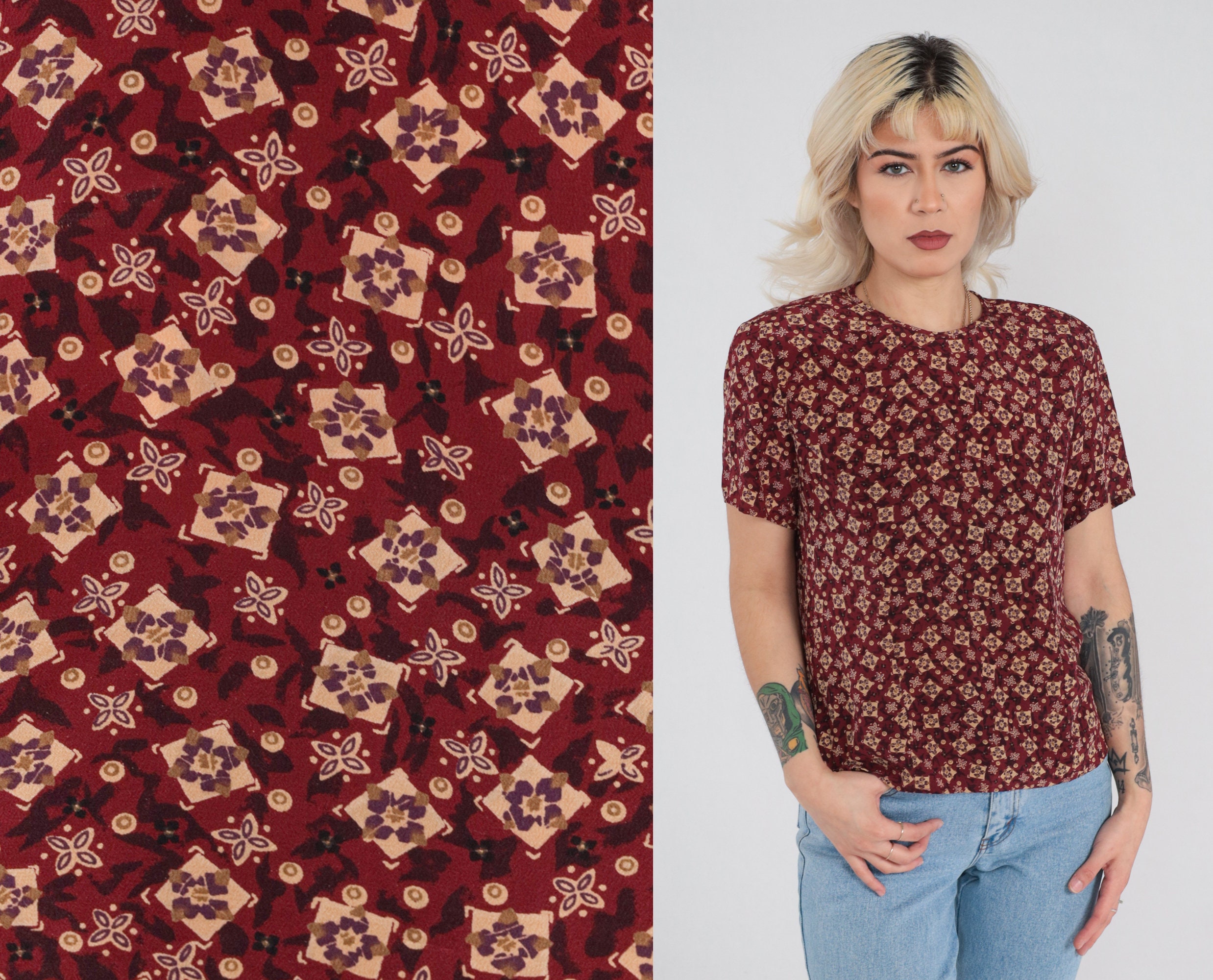 Vintage 90s silk shirt in red with a tile print. It has short sleeves and a keyhole button in the back.