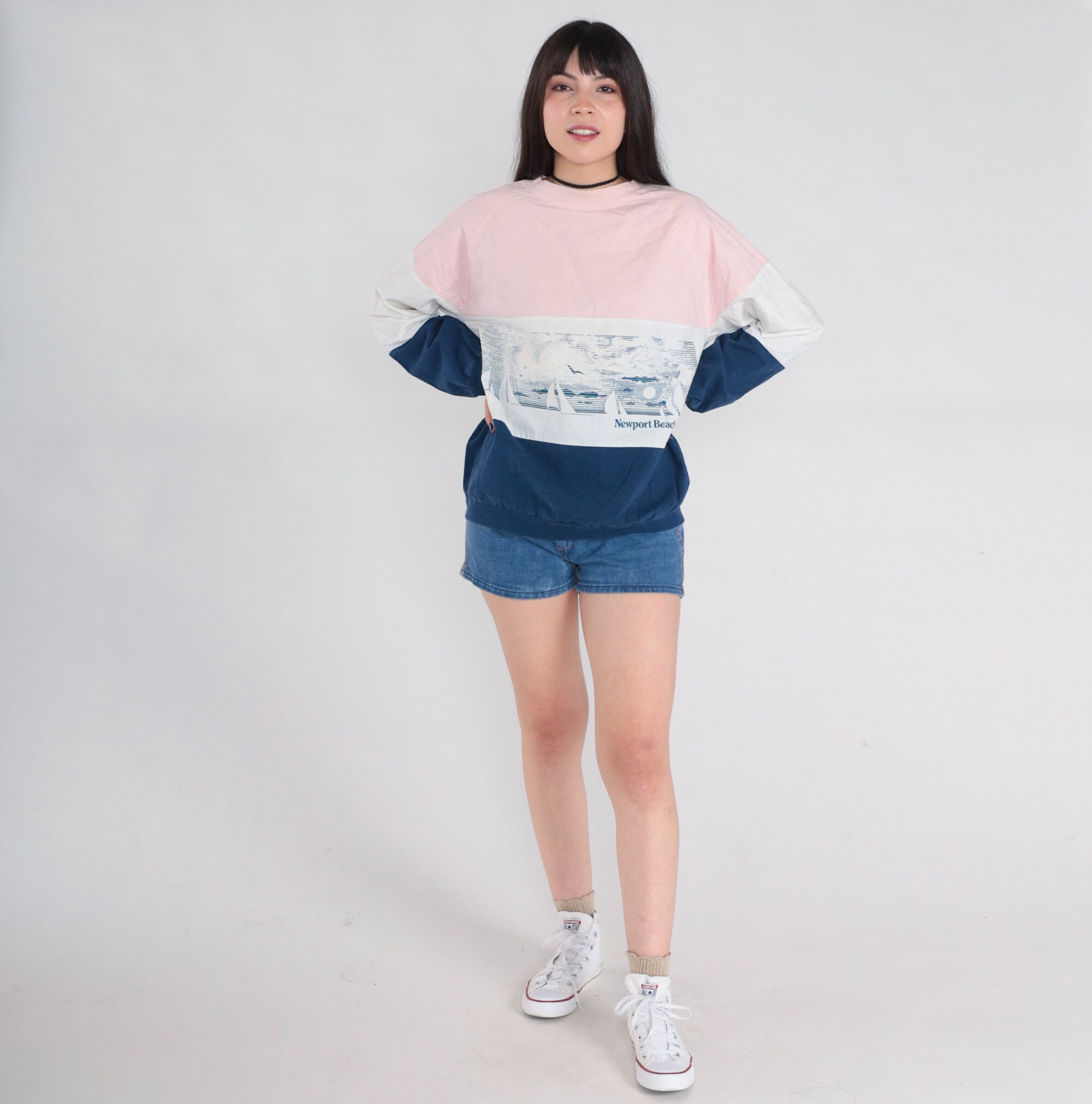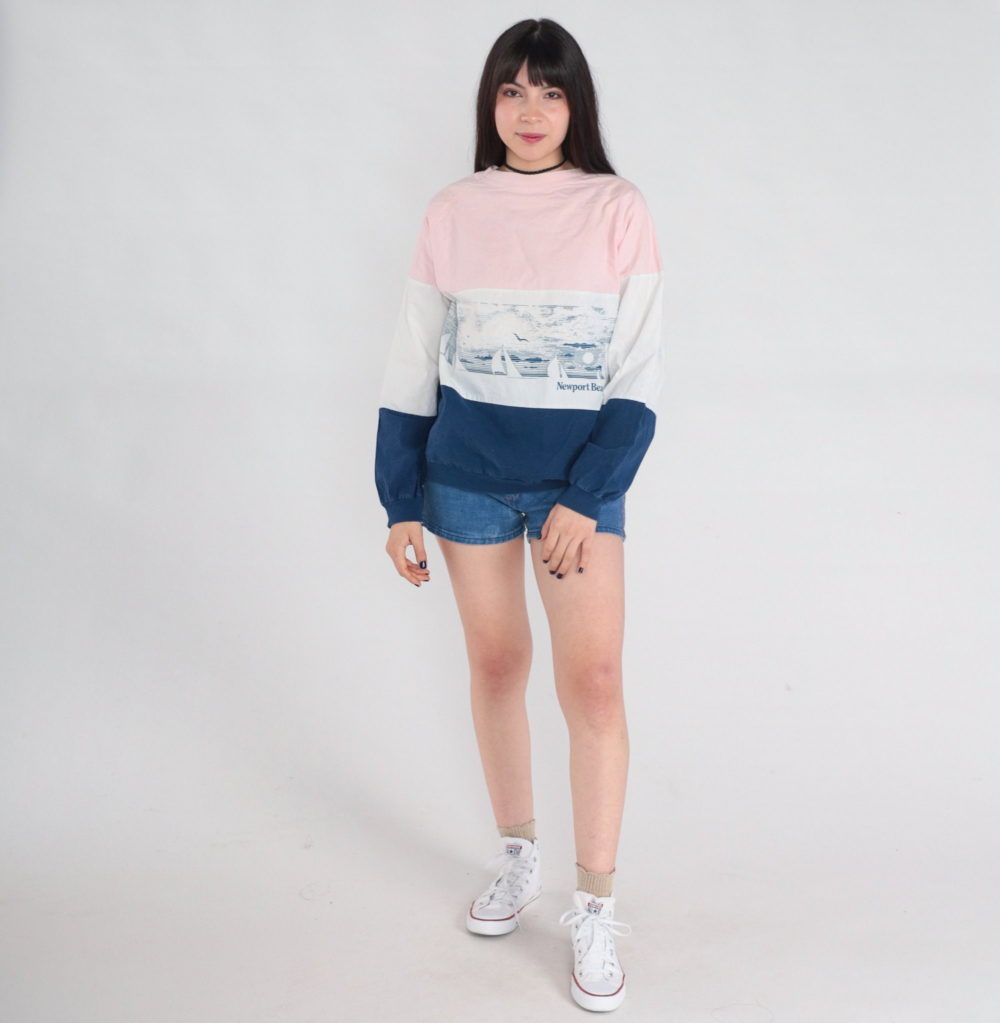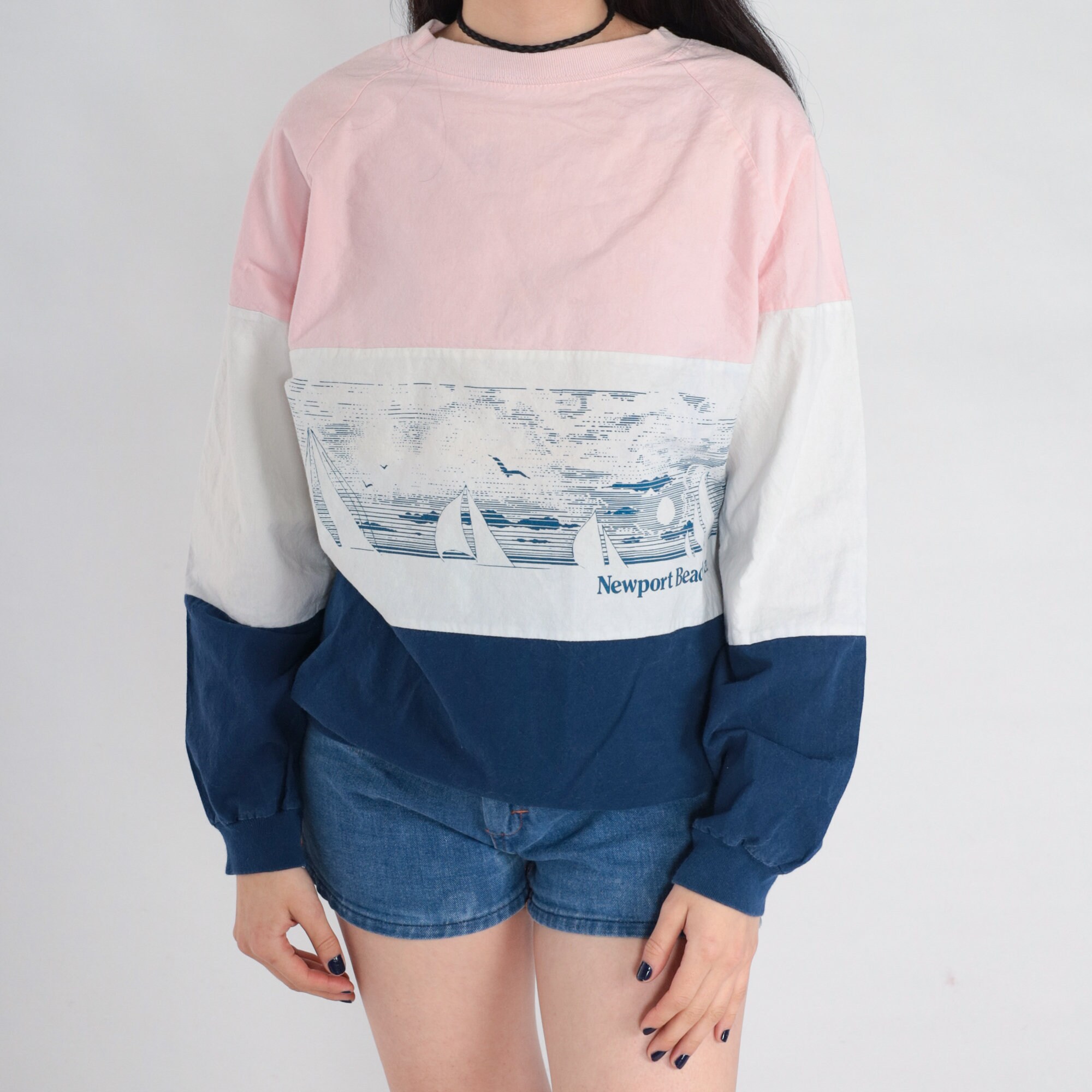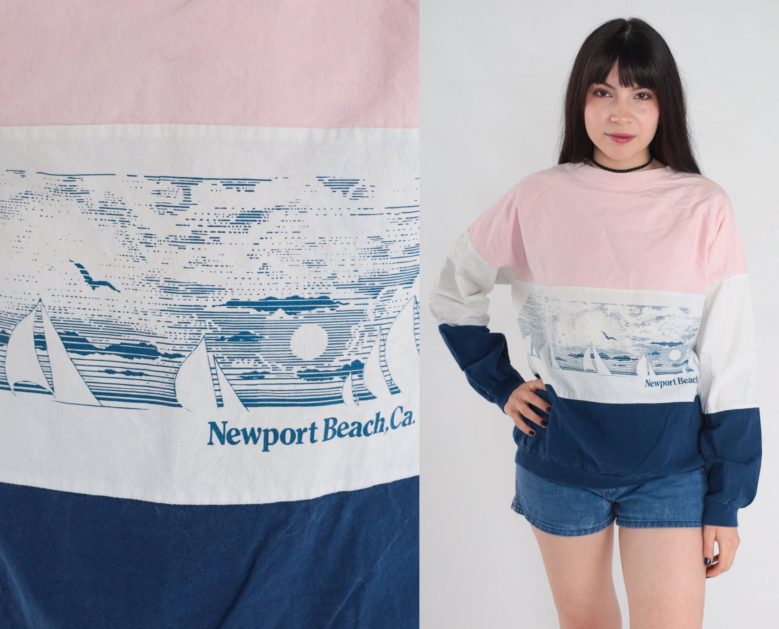 Vintage 80s sweatshirt in pink, white, and blue stripes with a sailboat print and "Newport Beach." Pullover style with raglan sleeves.