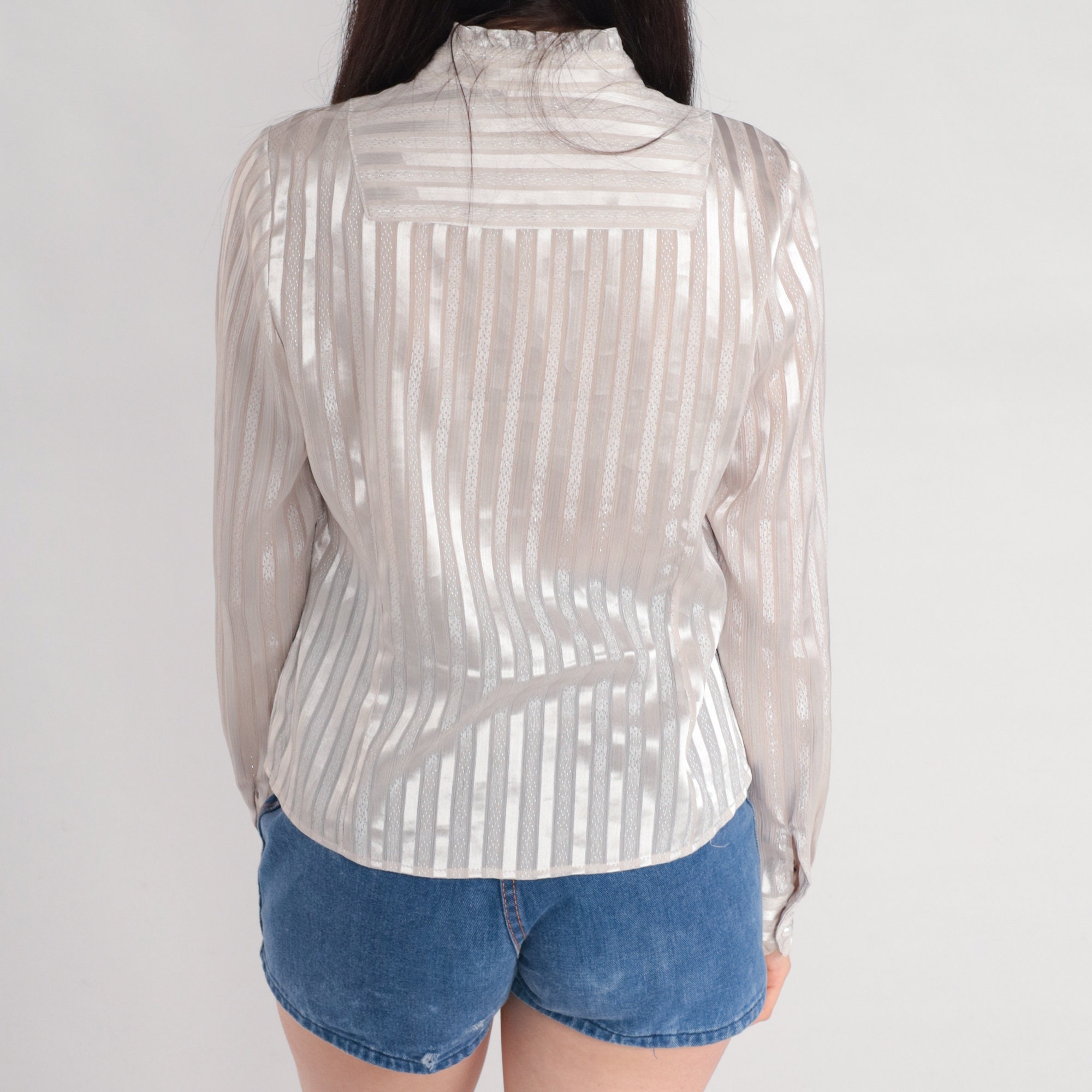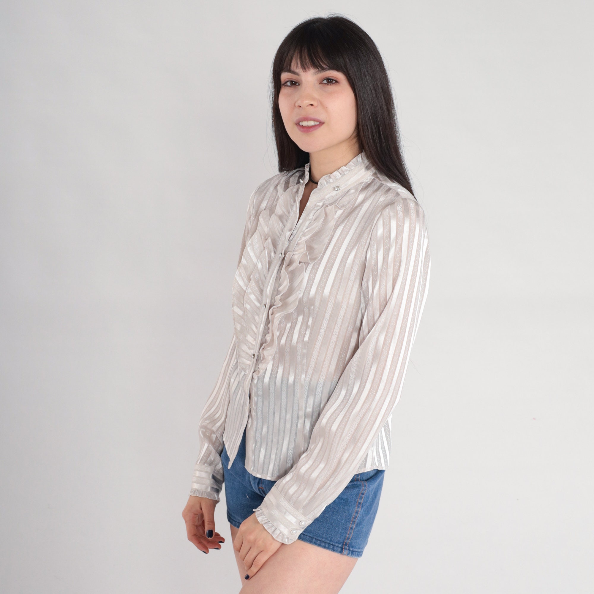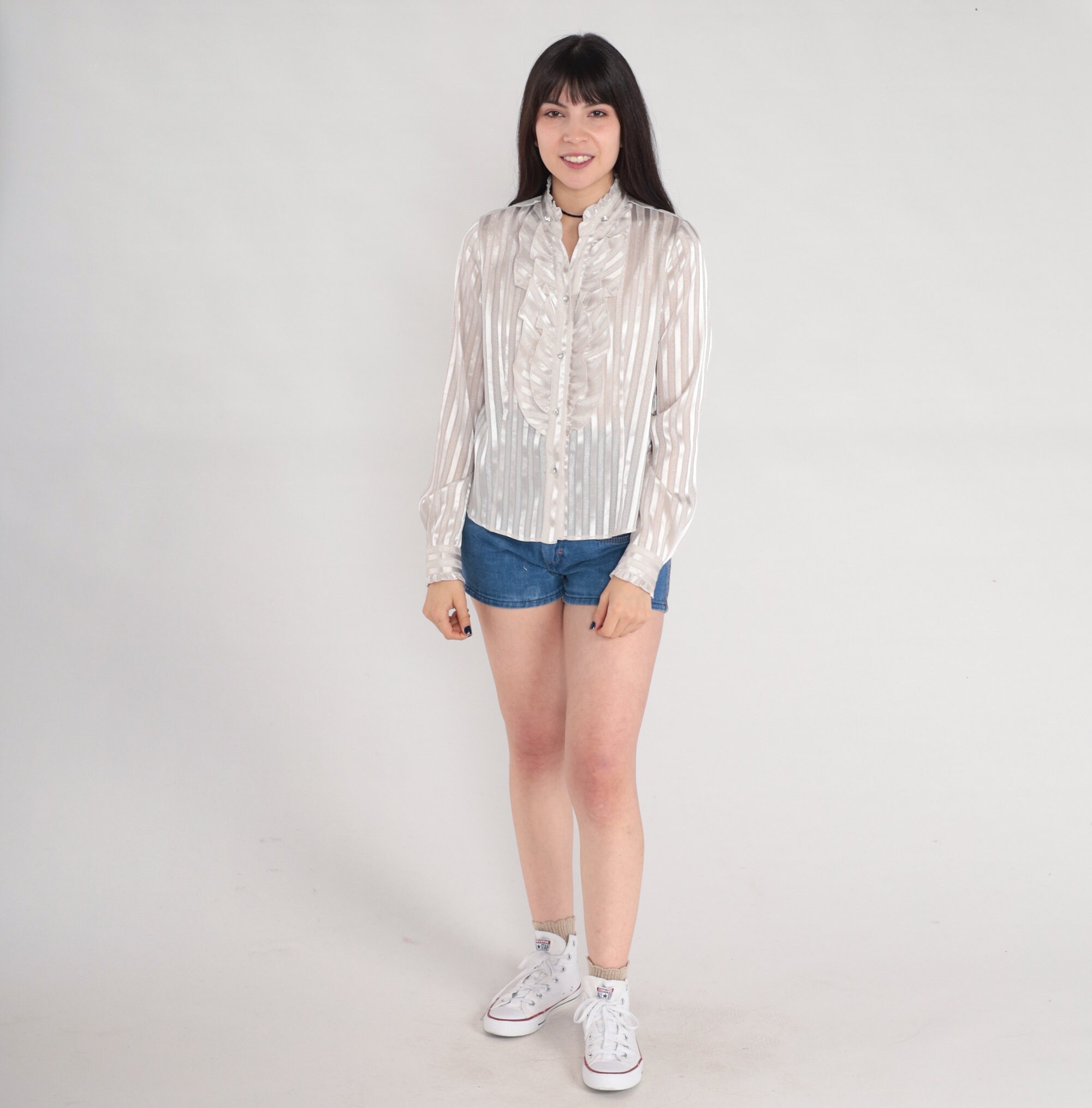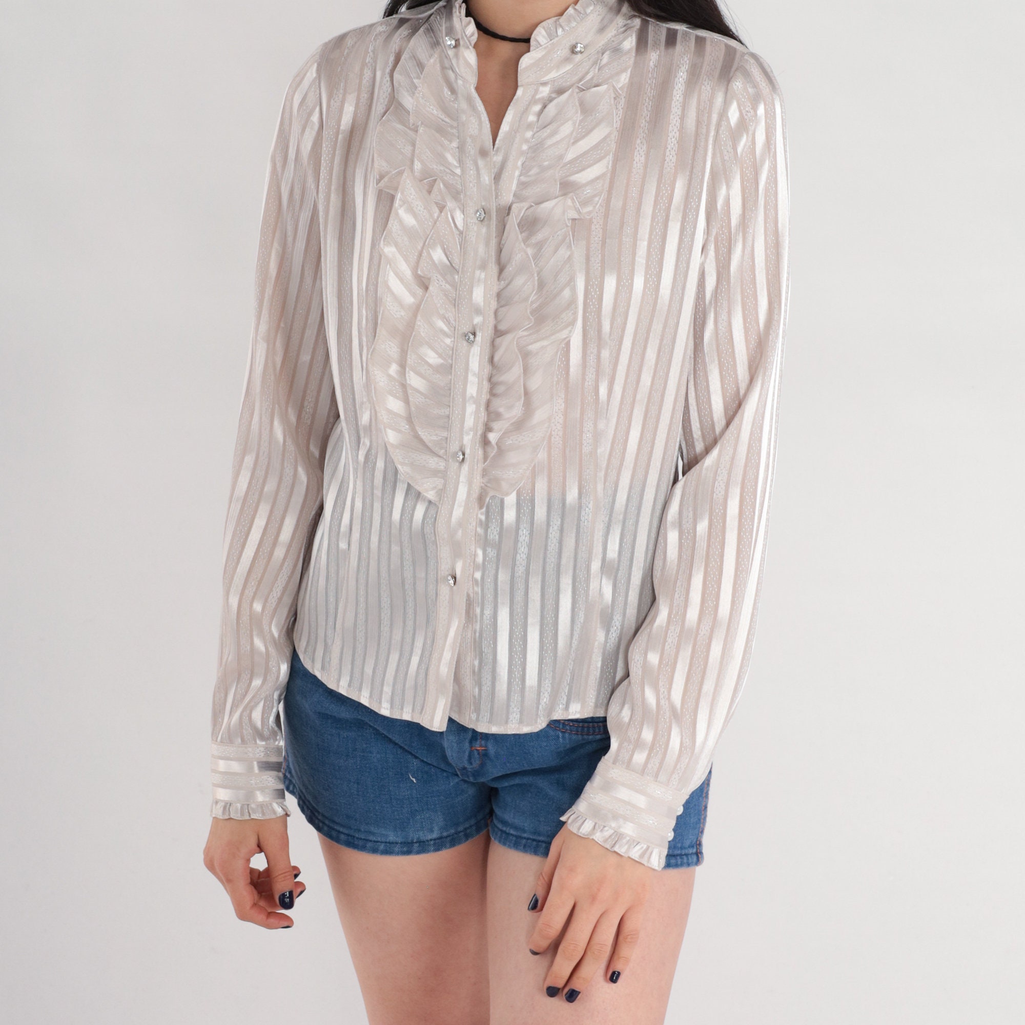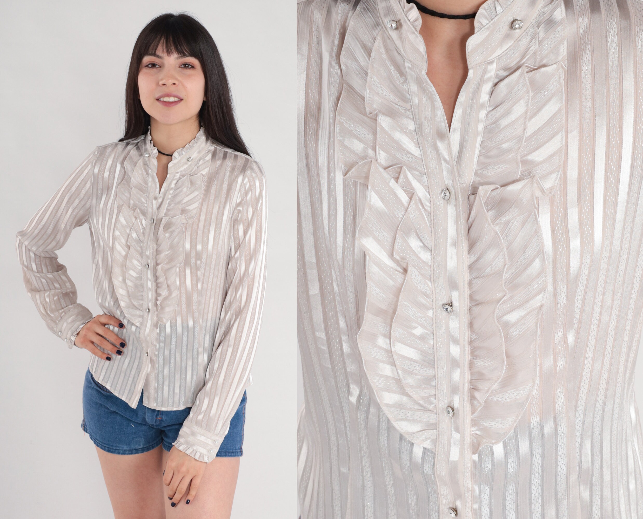 Vintage y2k blouse in shiny striped white with a tuxedo ruffle. It has long sleeves, a high neck, and rhinestone buttons up the front.