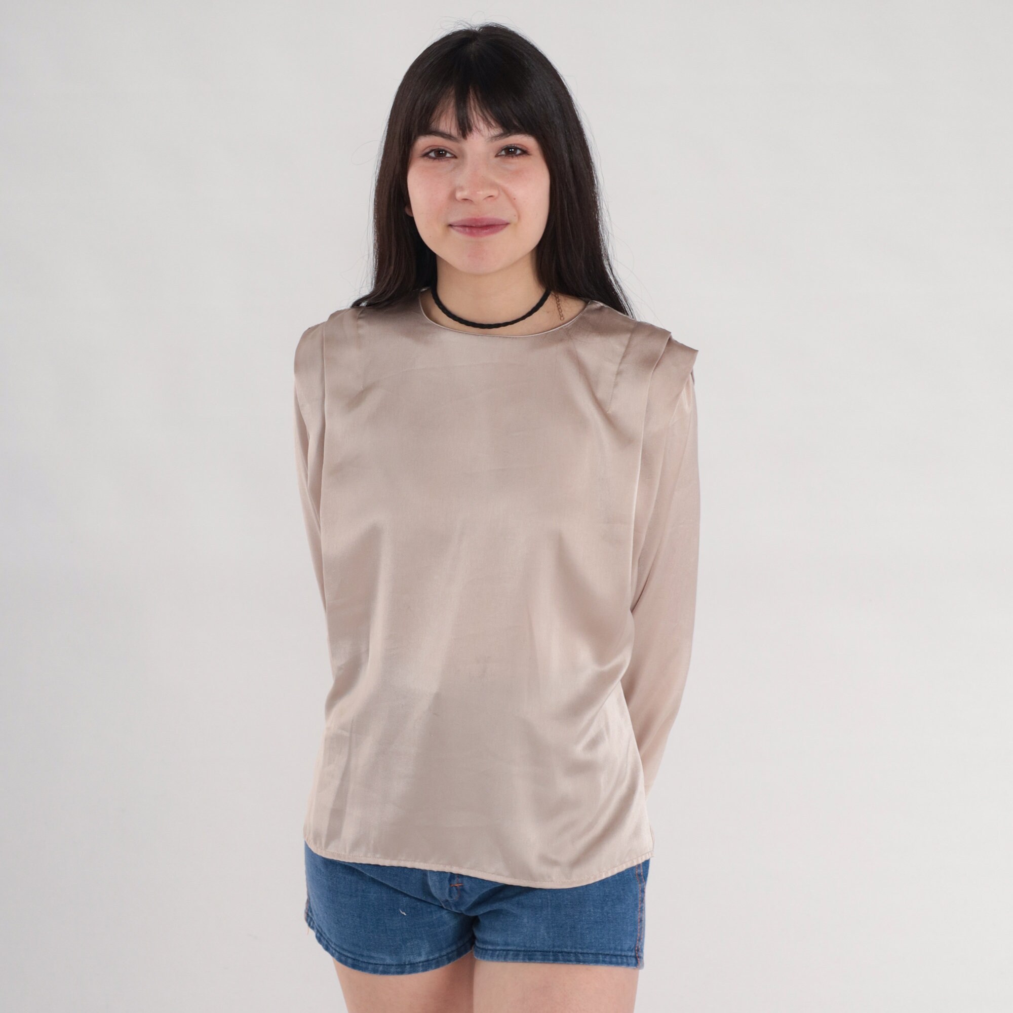 Vintage 80s blouse in shiny champagne with long sleeves and pleats on the shoulders. Buttons up the back.