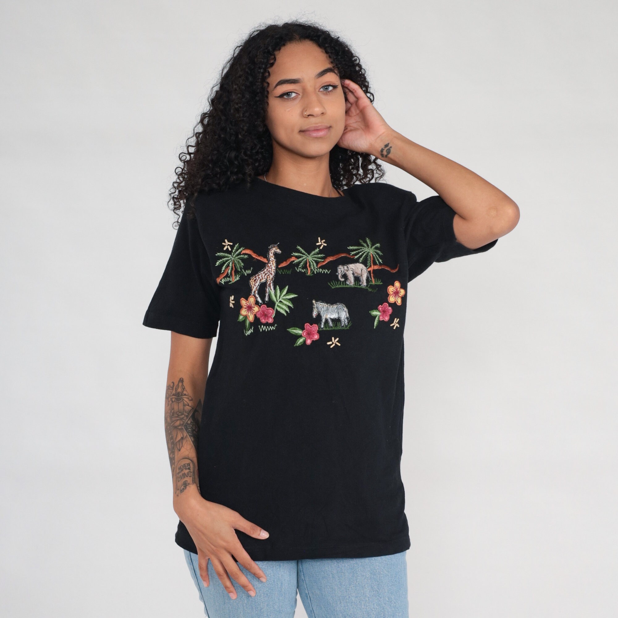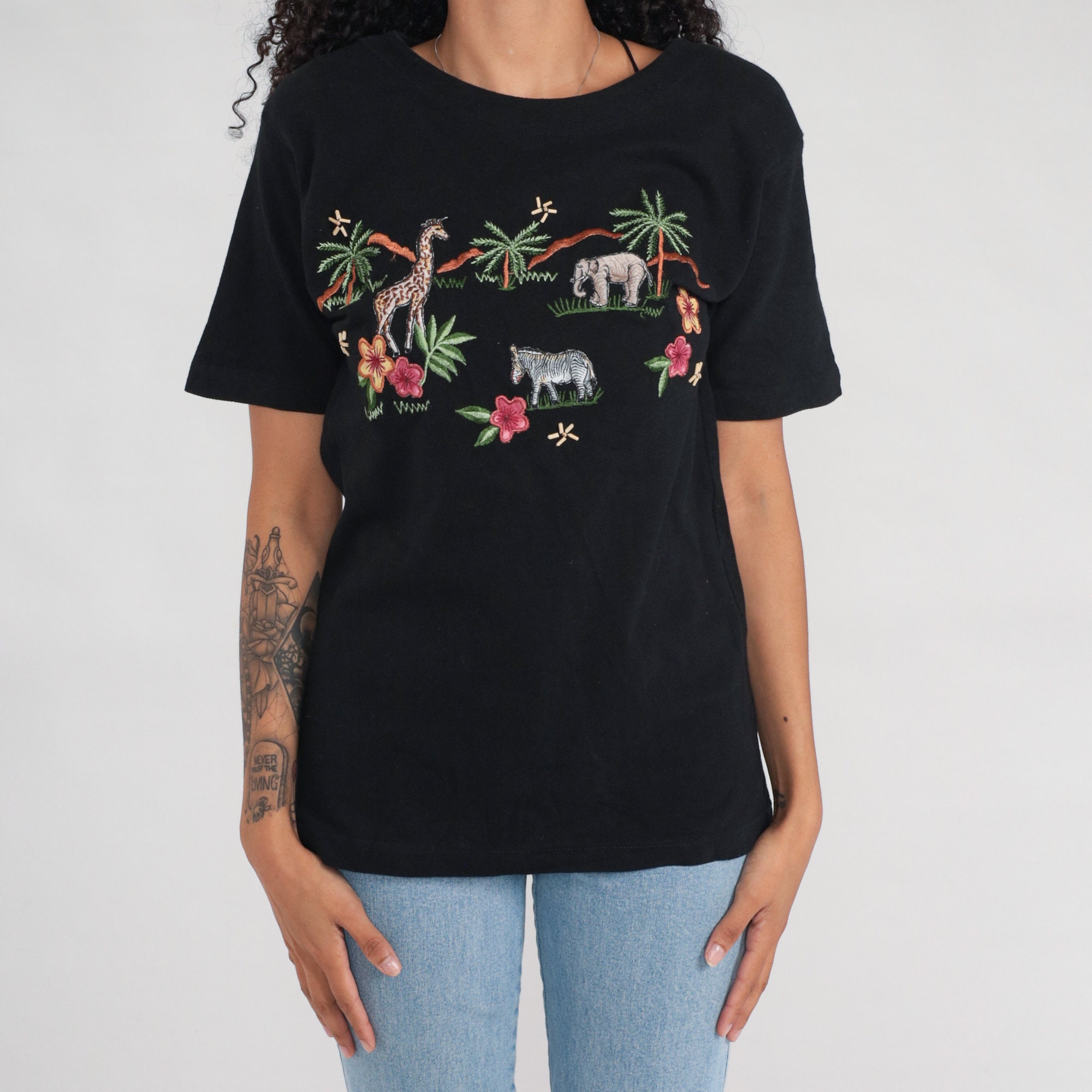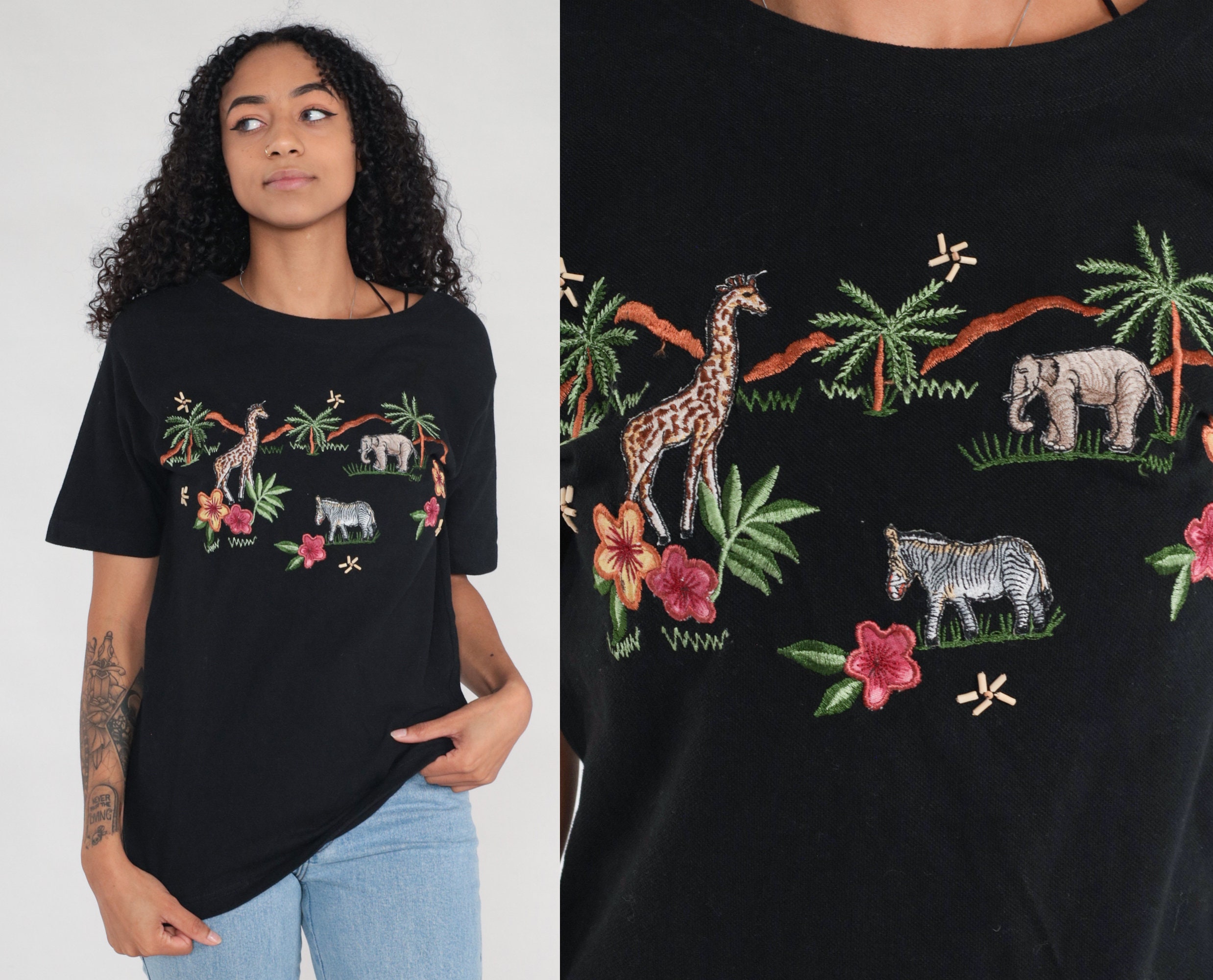 Vintage 00s t shirt with a safari animal print embroidered on front, and beaded flowers.