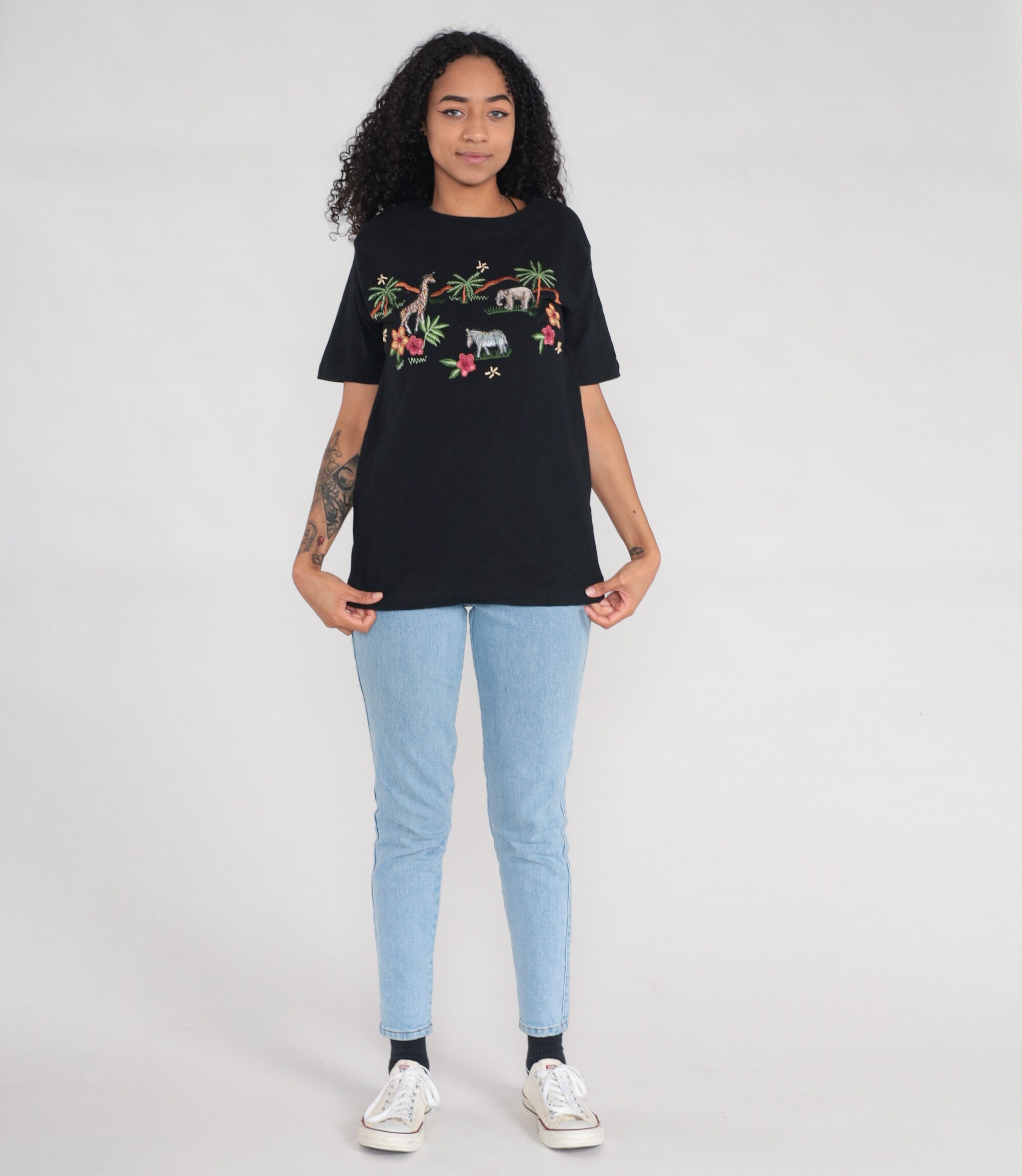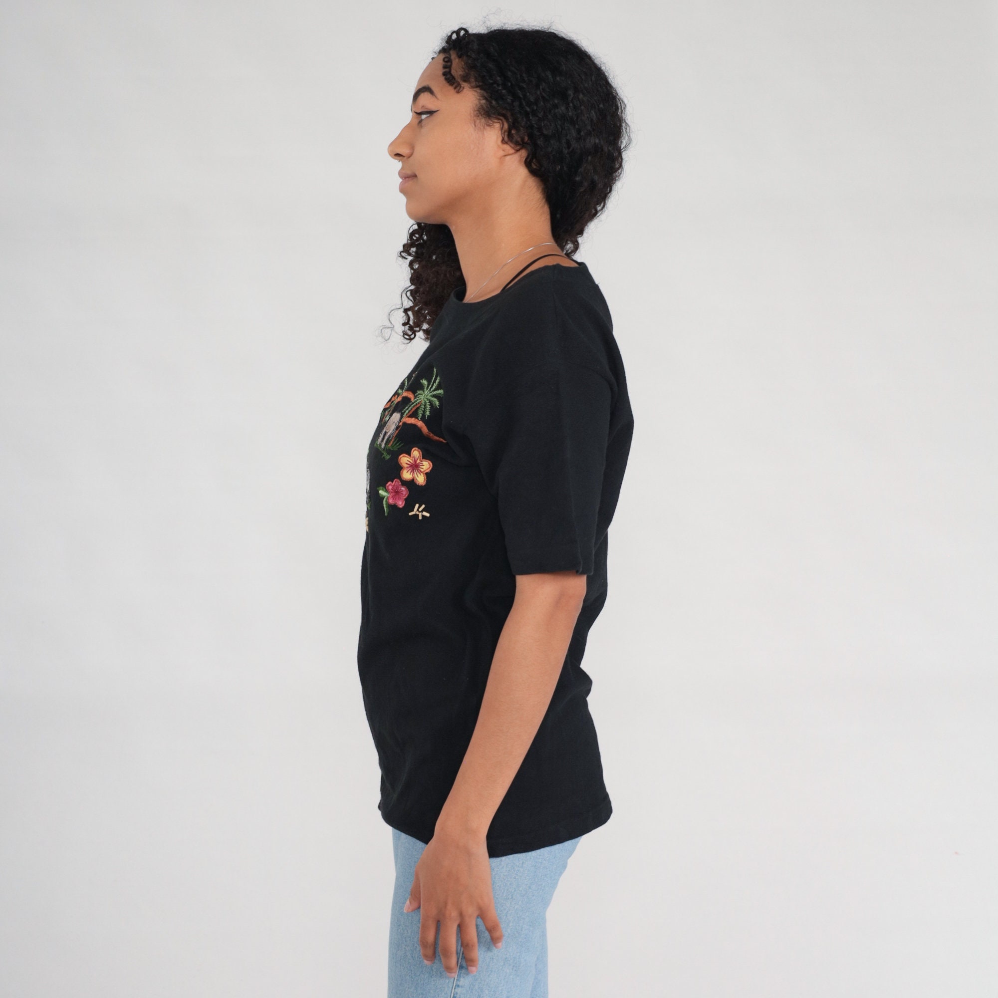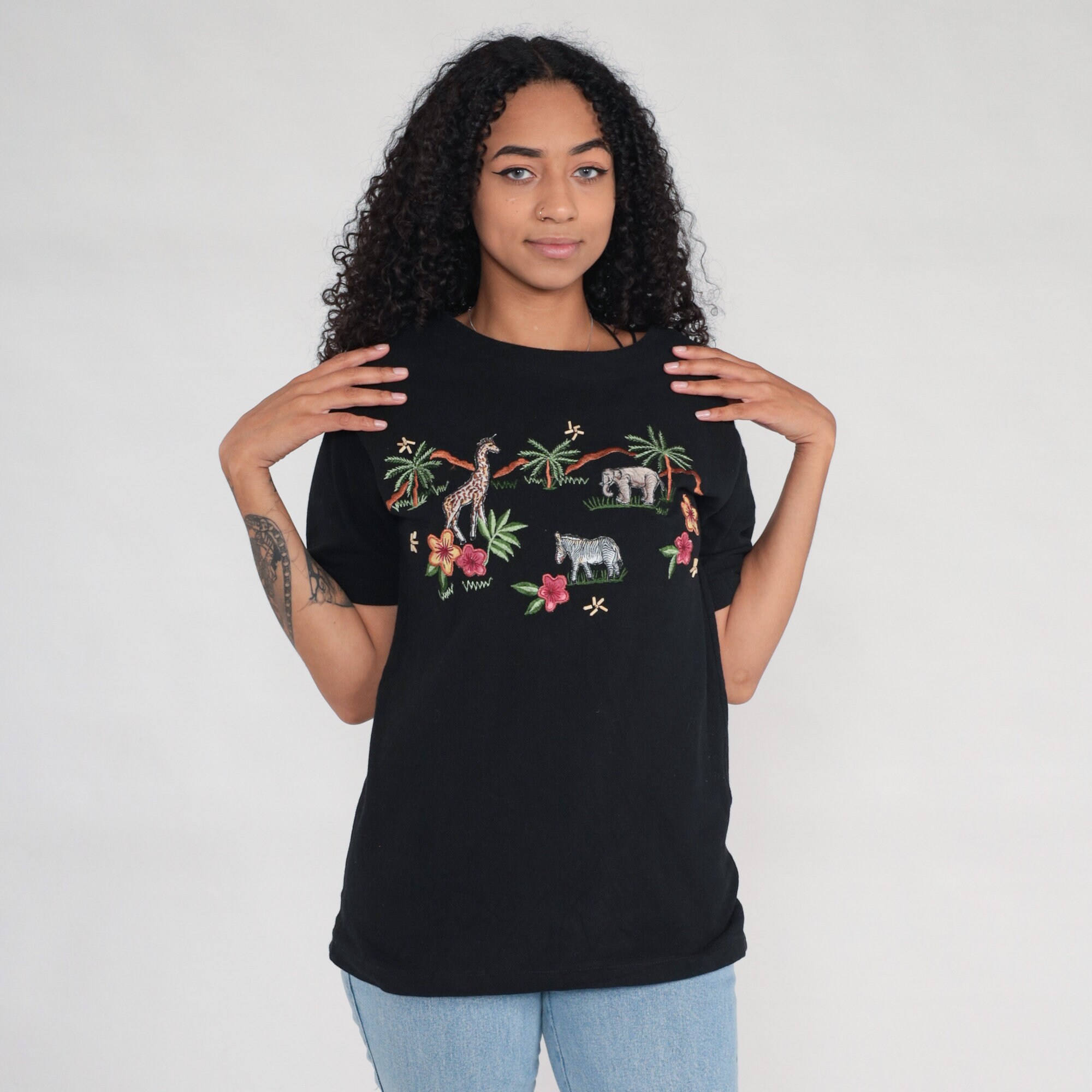Vintage 00s t shirt with a safari animal print embroidered on front, and beaded flowers.