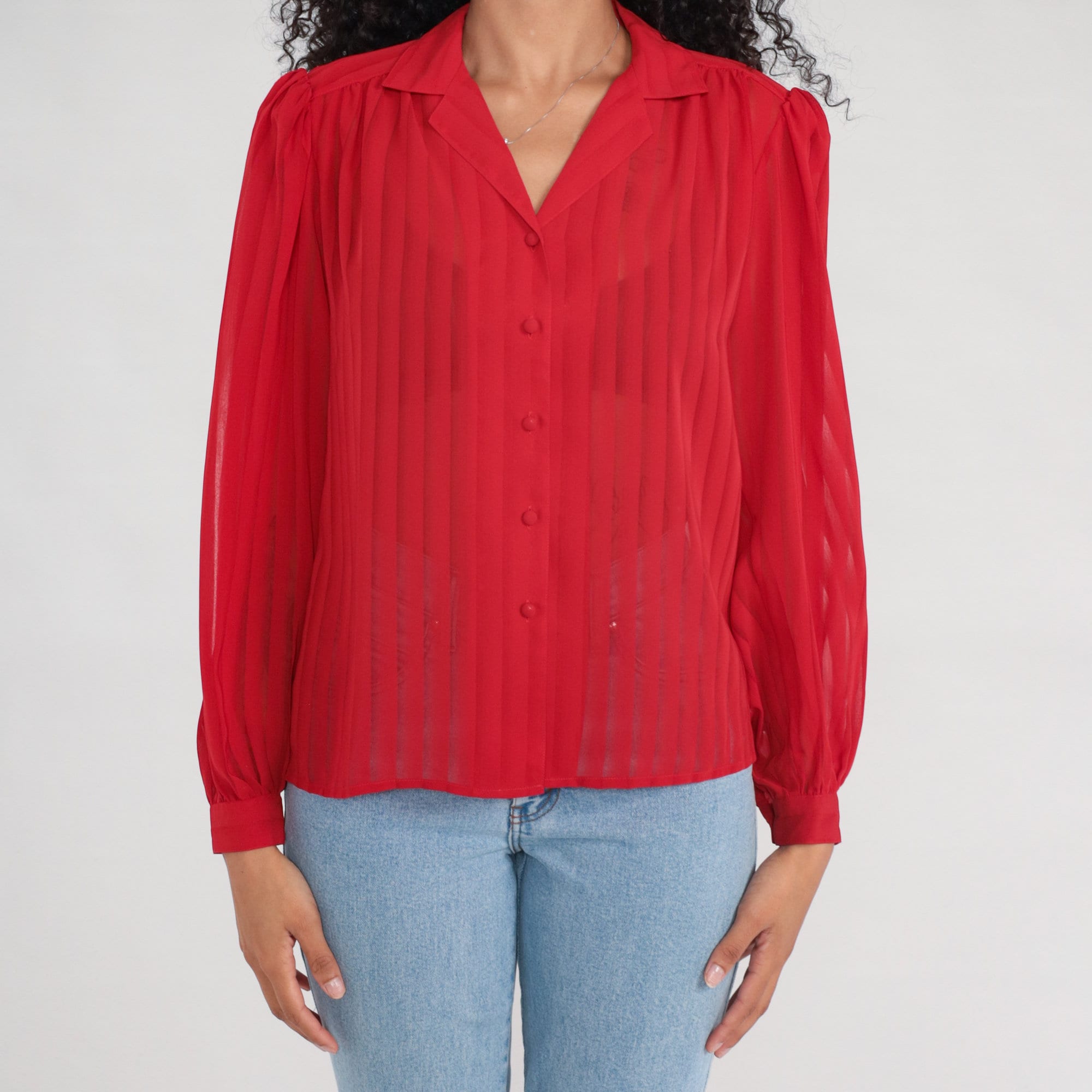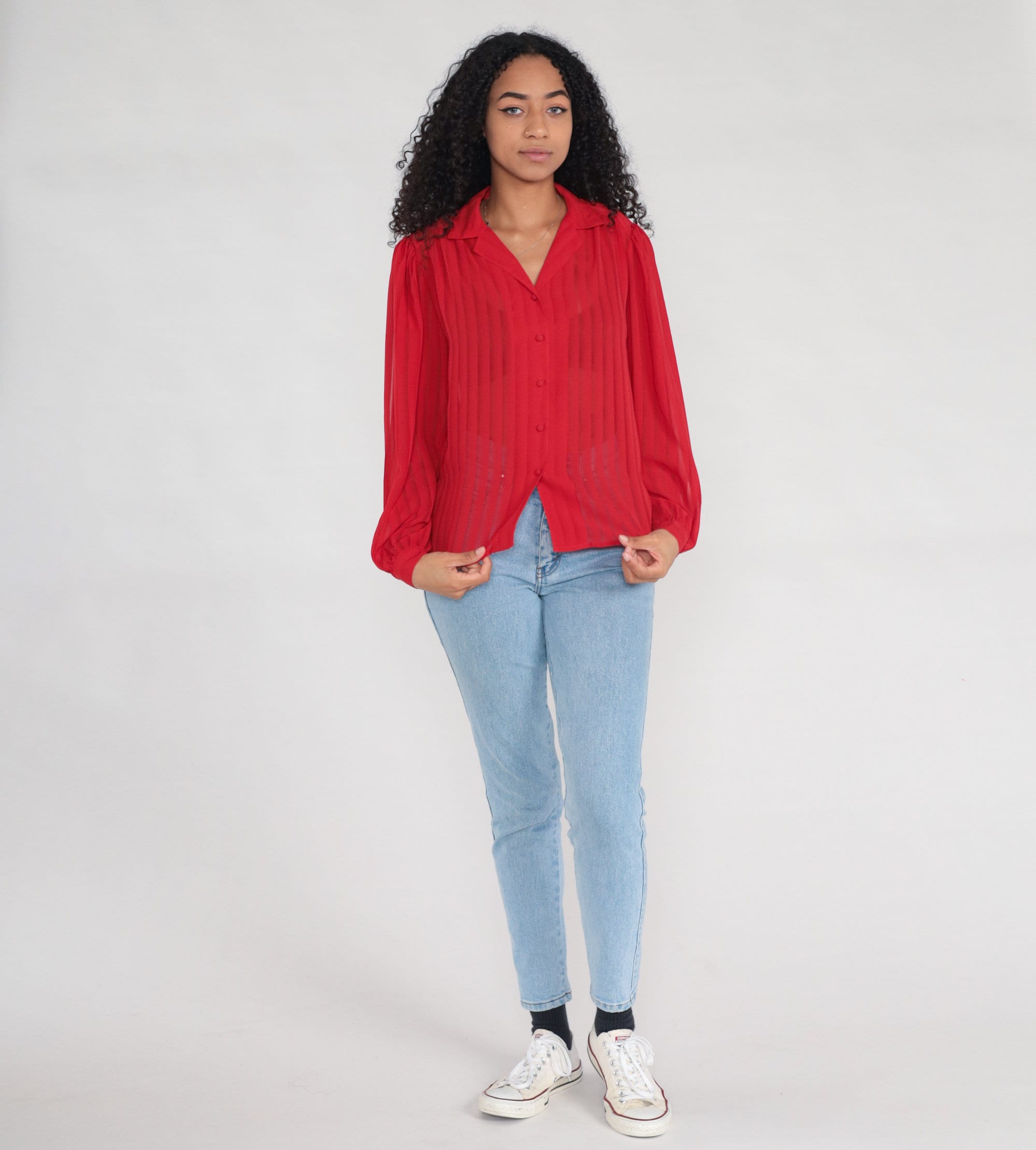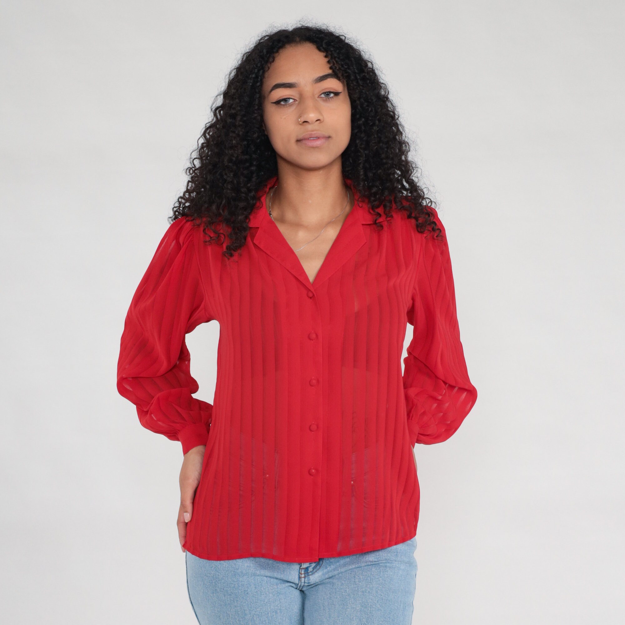 Vintage 80s blouse in semi-sheer red with stripes. It has long puff sleeves and buttons up the front.