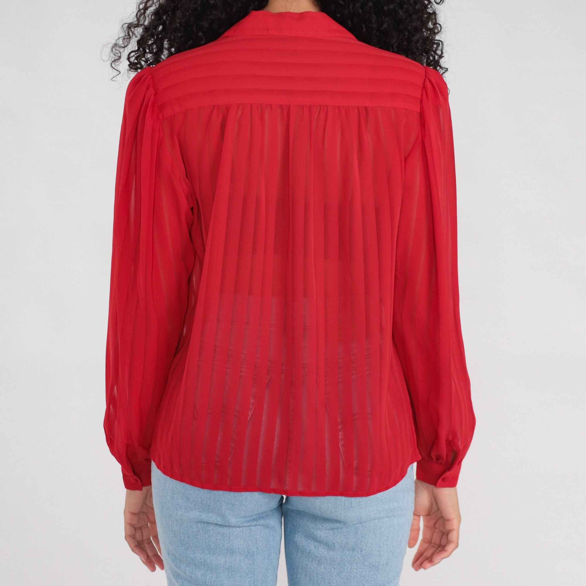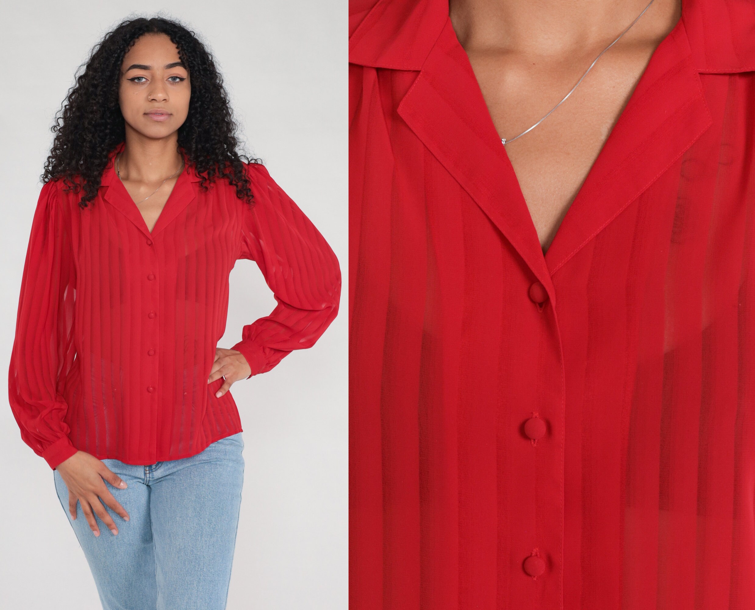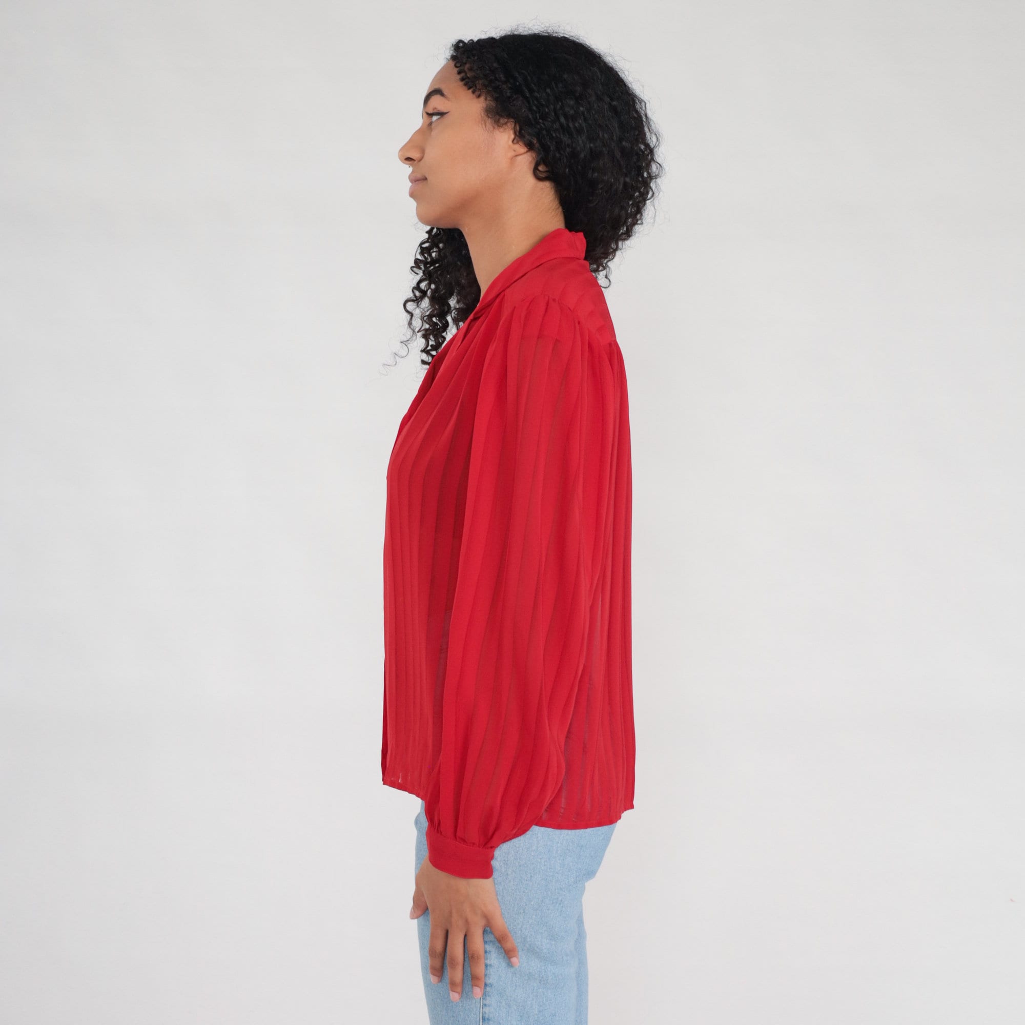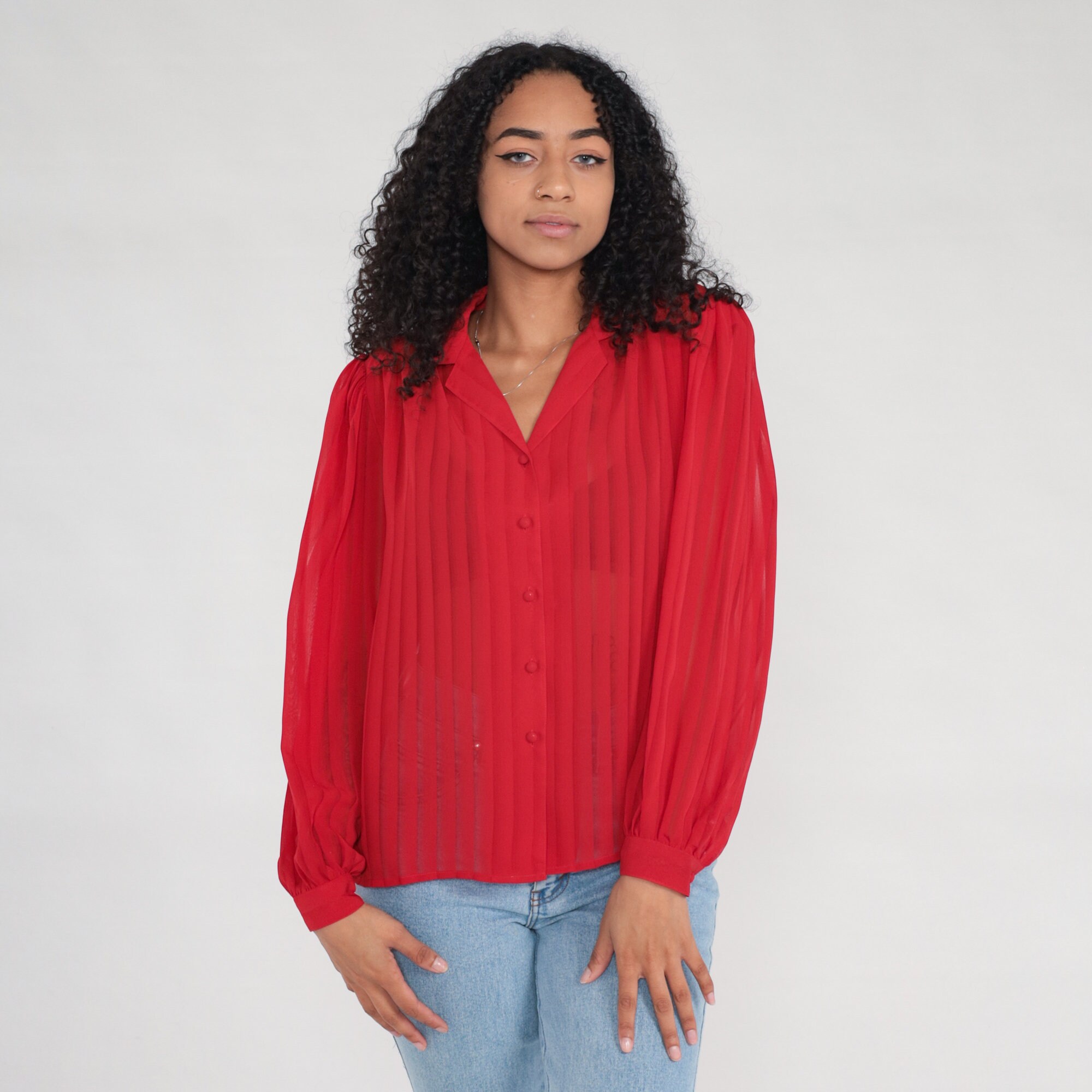 Vintage 80s blouse in semi-sheer red with stripes. It has long puff sleeves and buttons up the front.