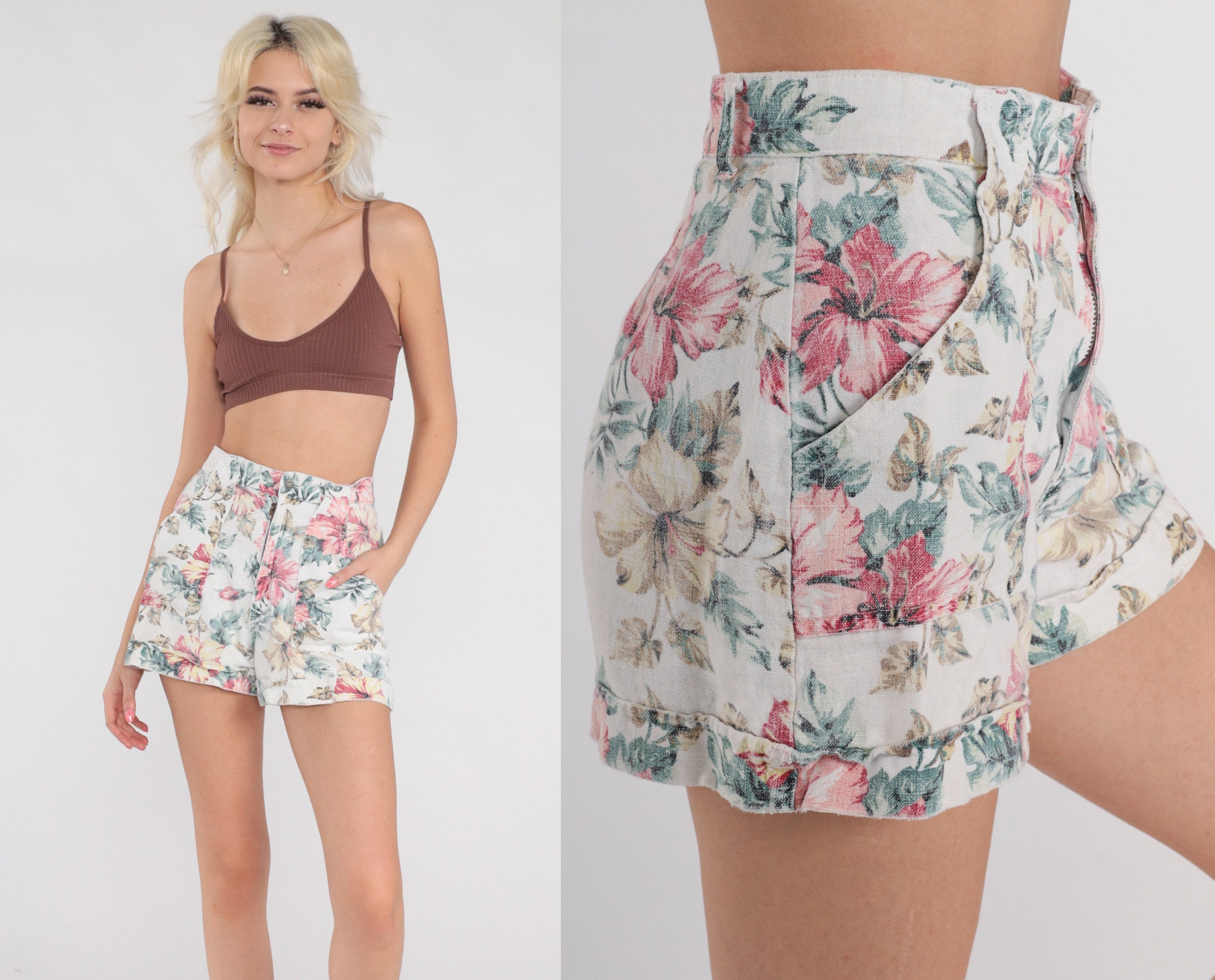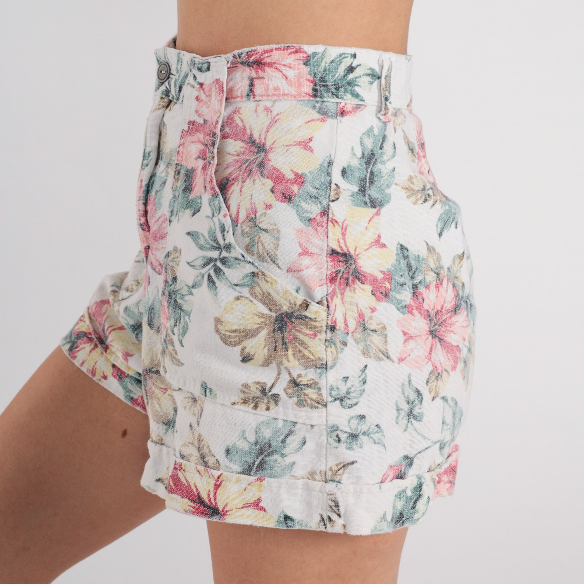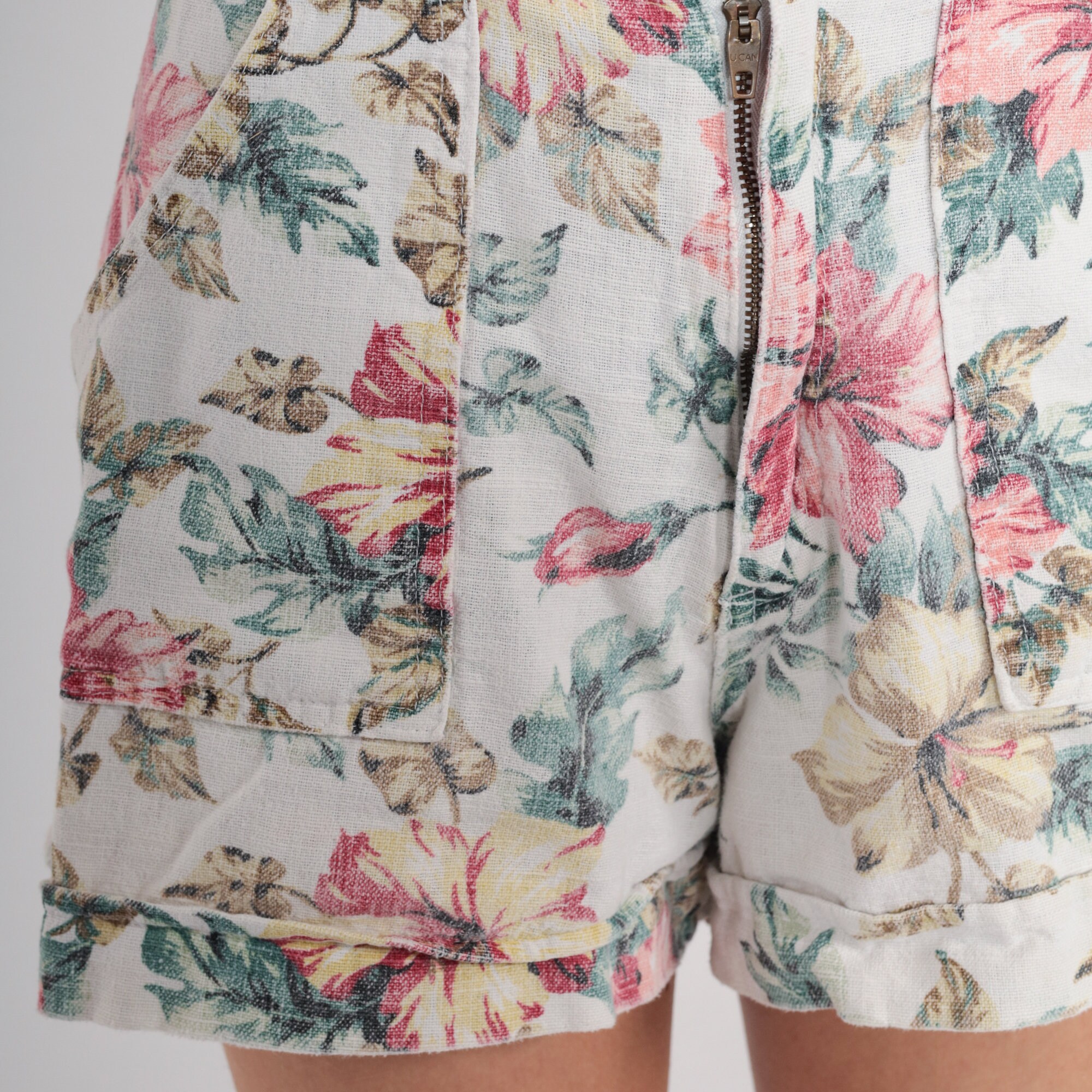 Vintage 90s shorts in white with a floral print. Has pockets and a high waist.