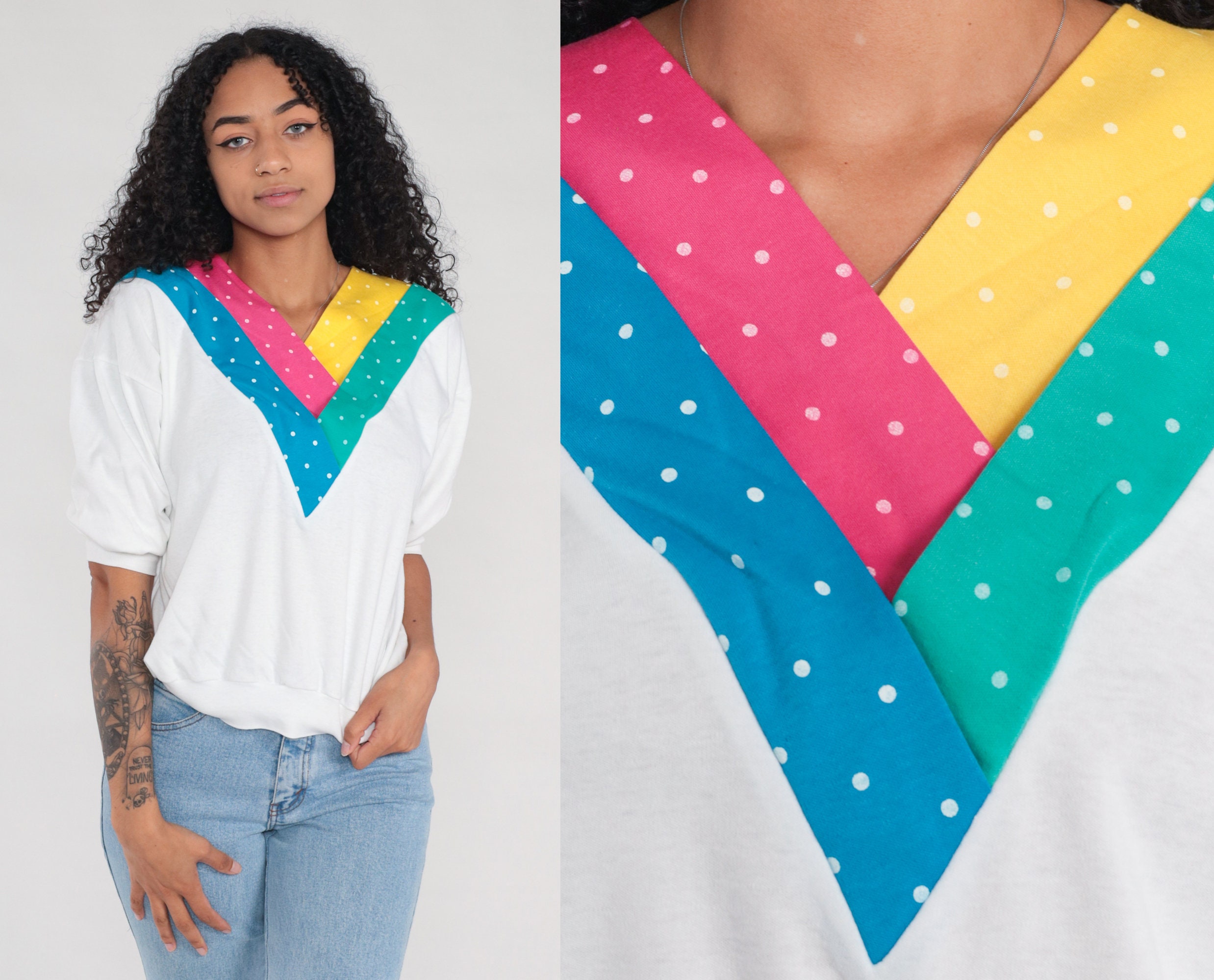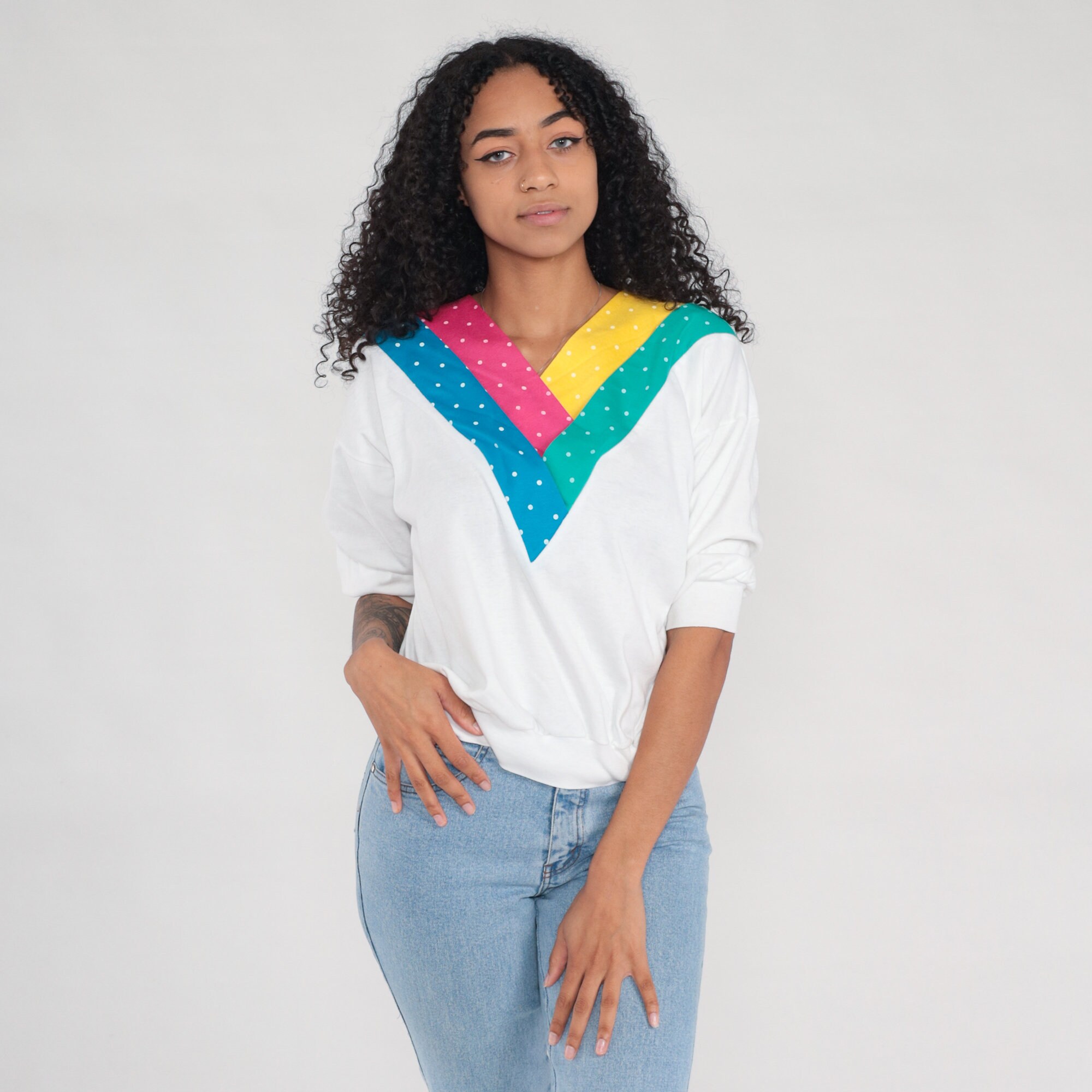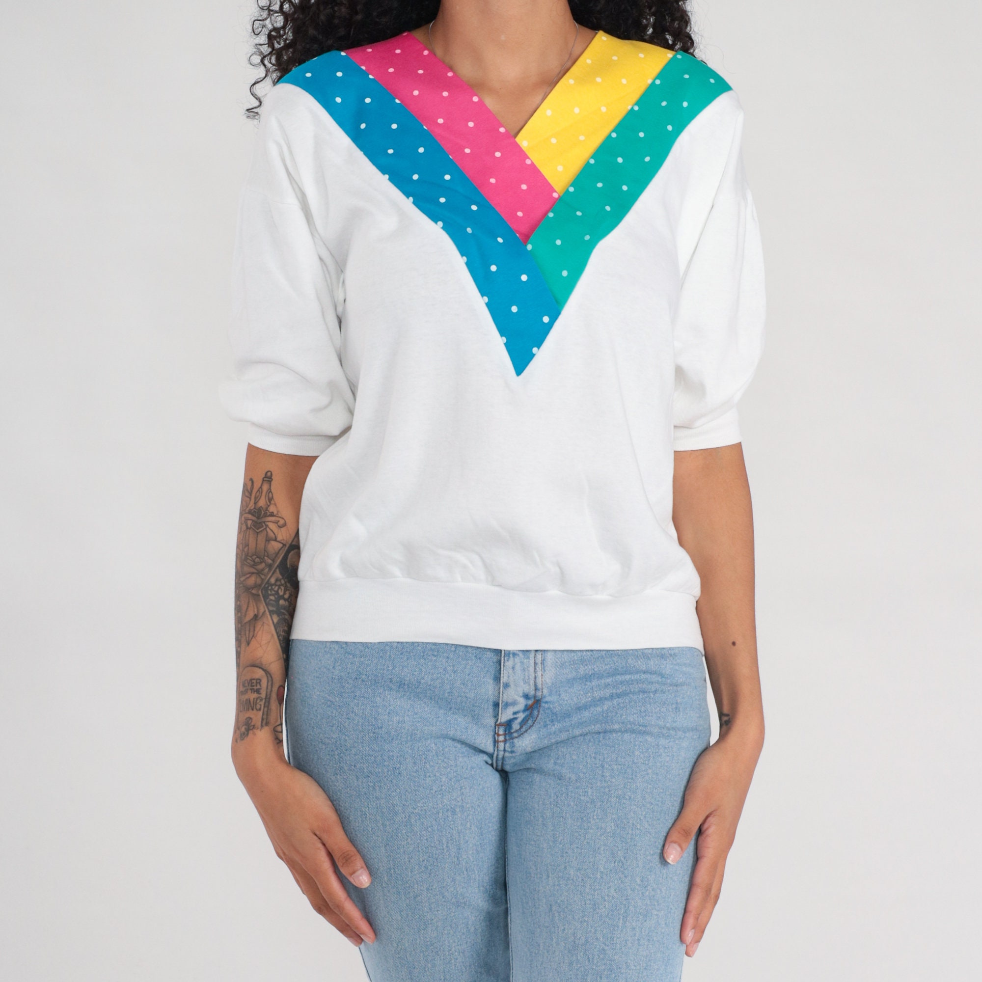 Vintage 80s shirt in white with striped polka dot trim and a slouchy fit.