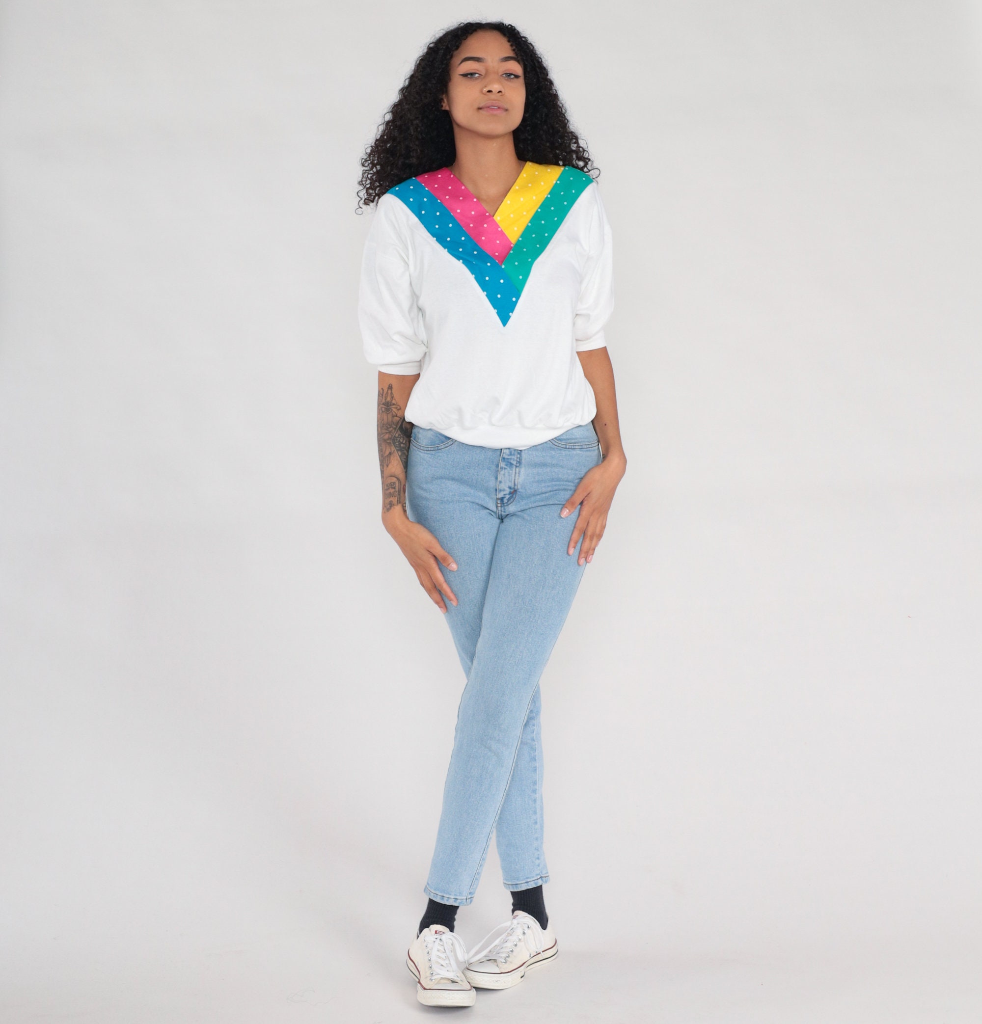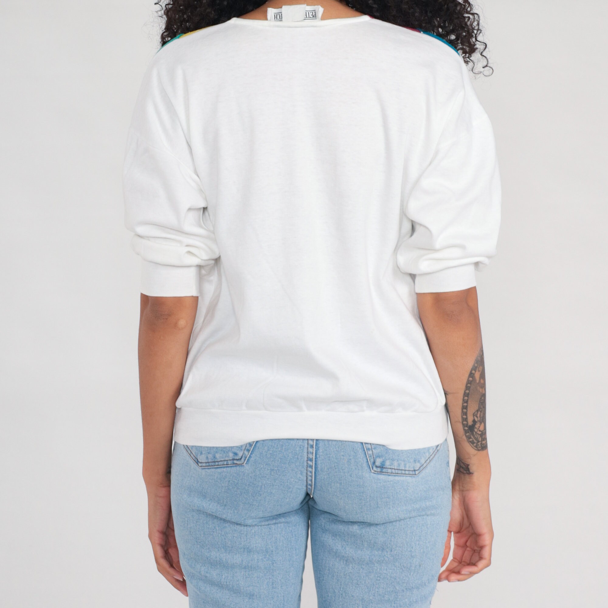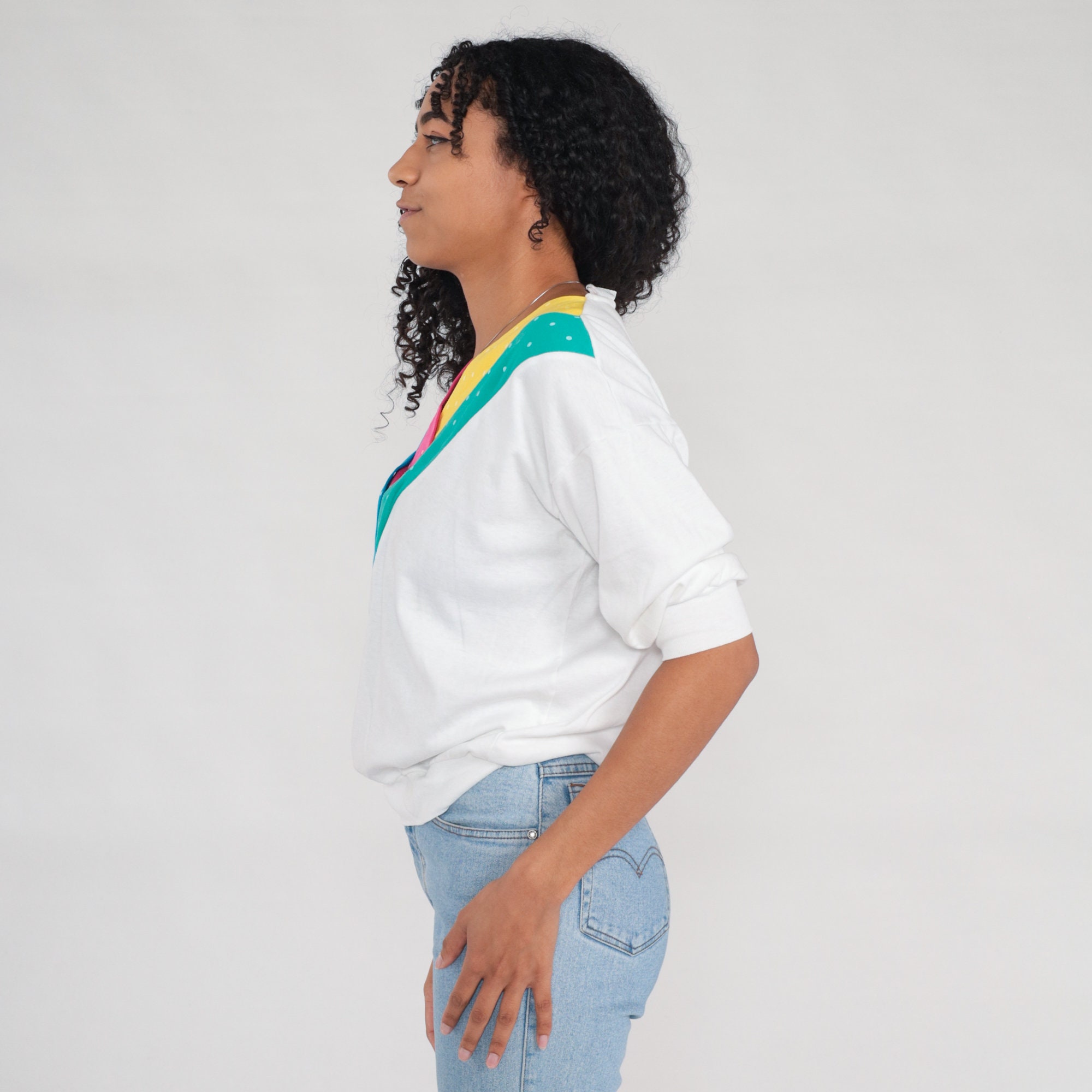 Vintage 80s shirt in white with striped polka dot trim and a slouchy fit.