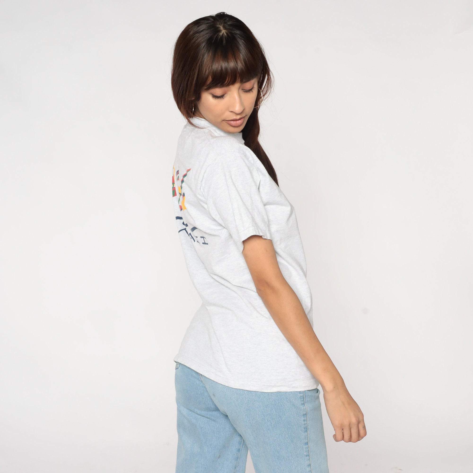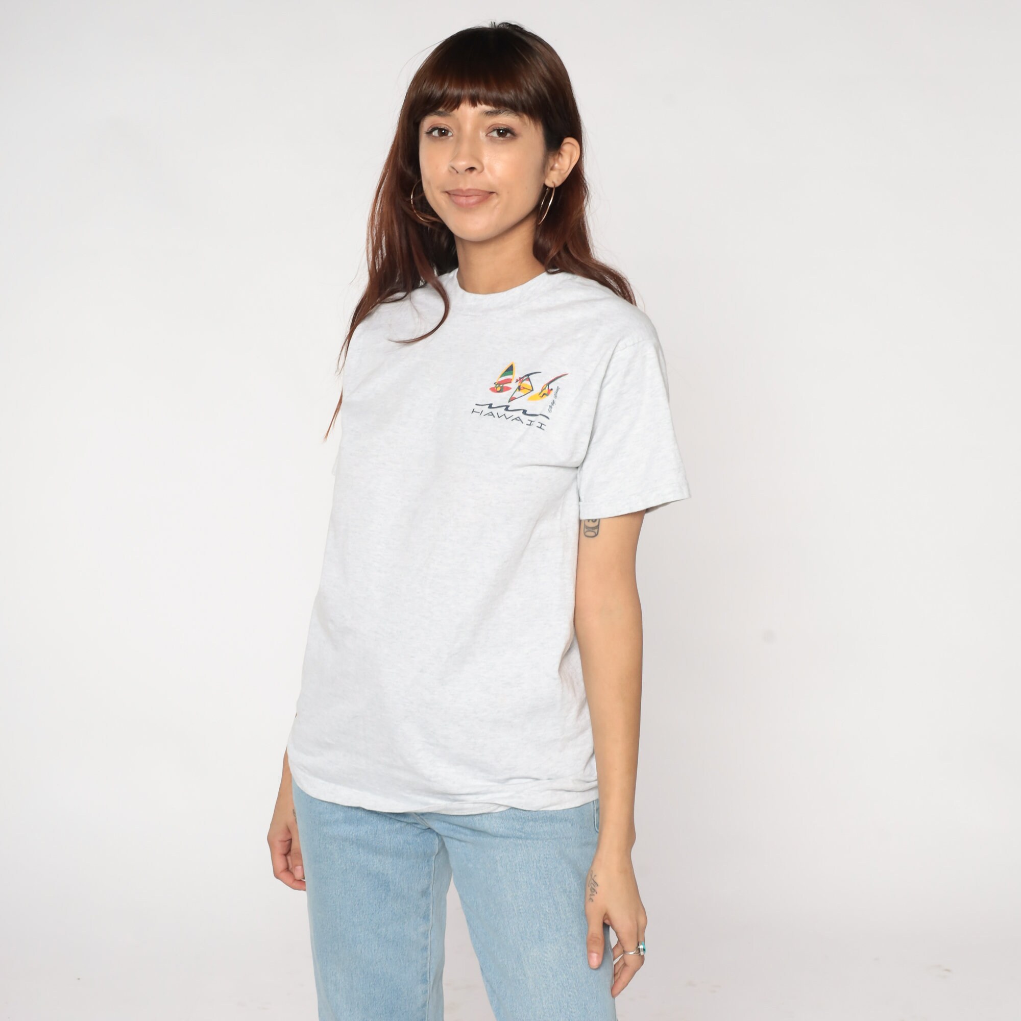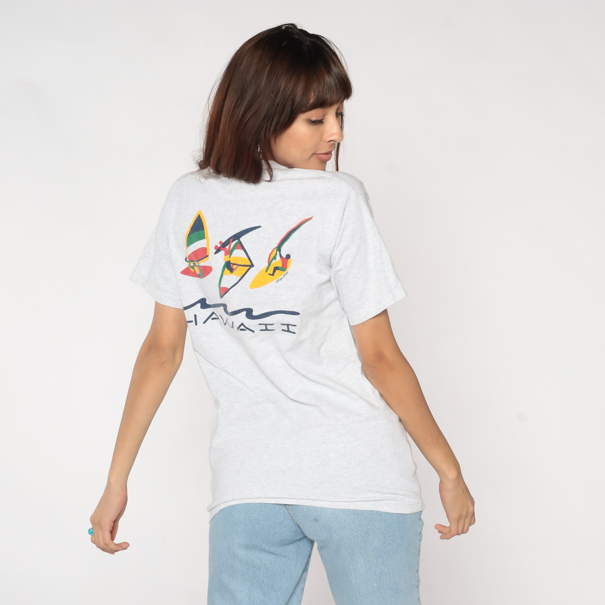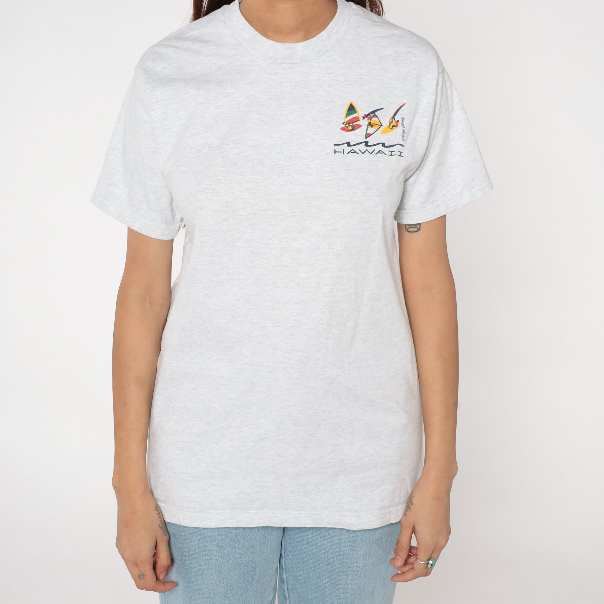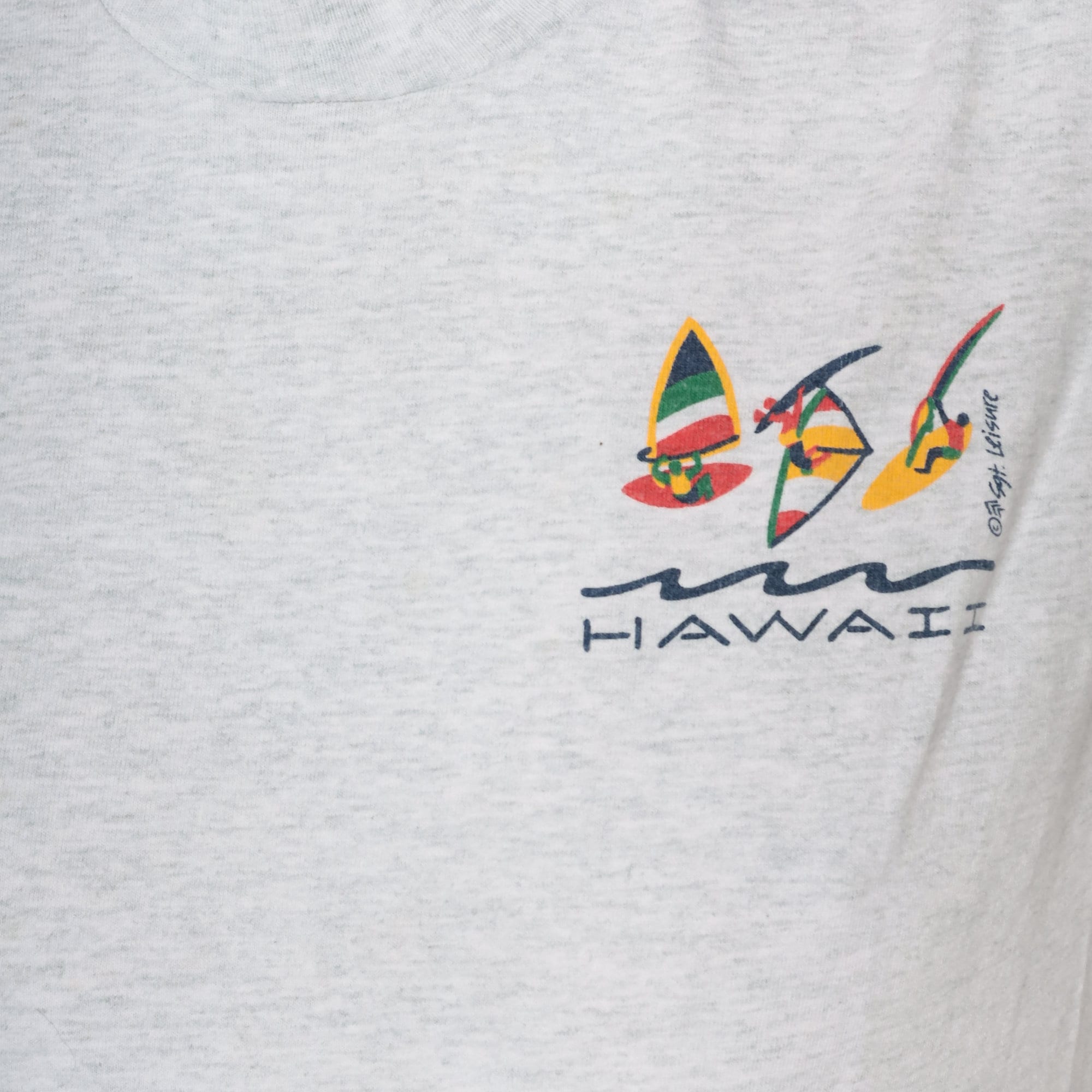 Vintage 90s shirt in light heather grey with a Hawaii water sports graphic on the chest and back.