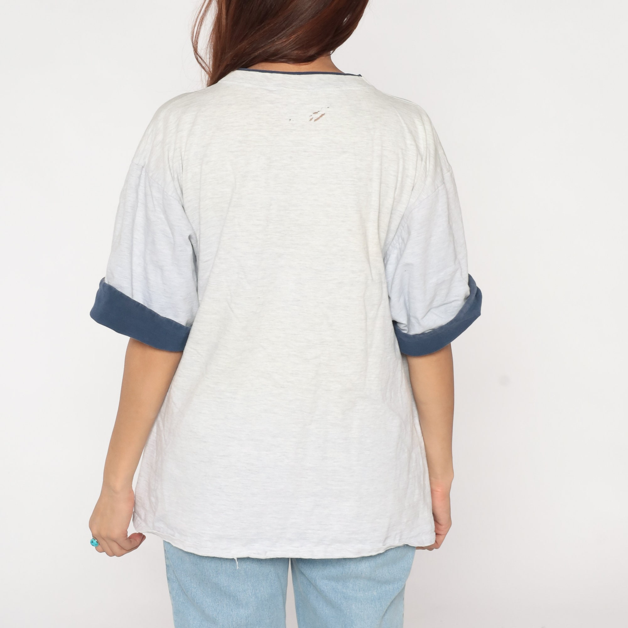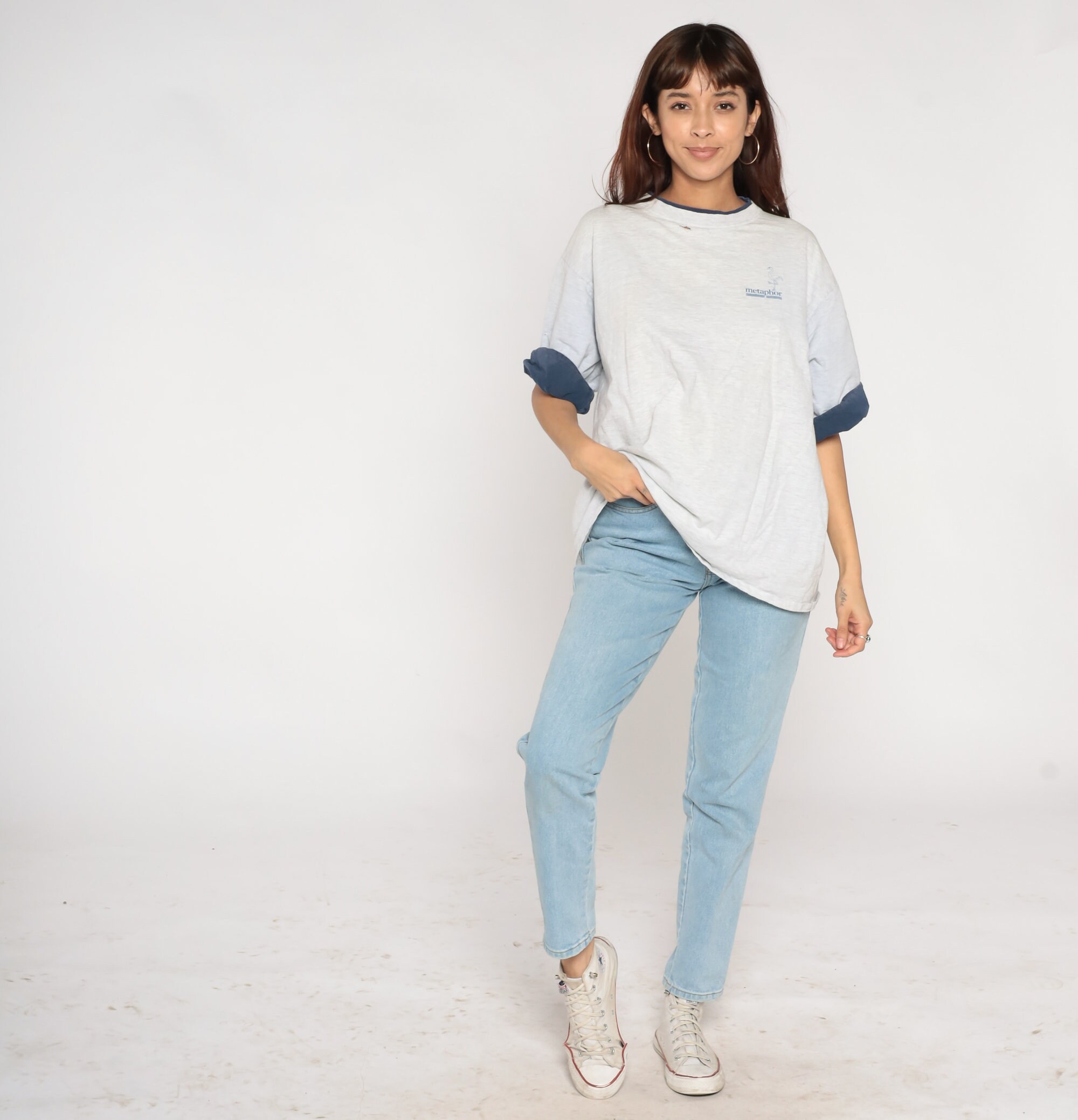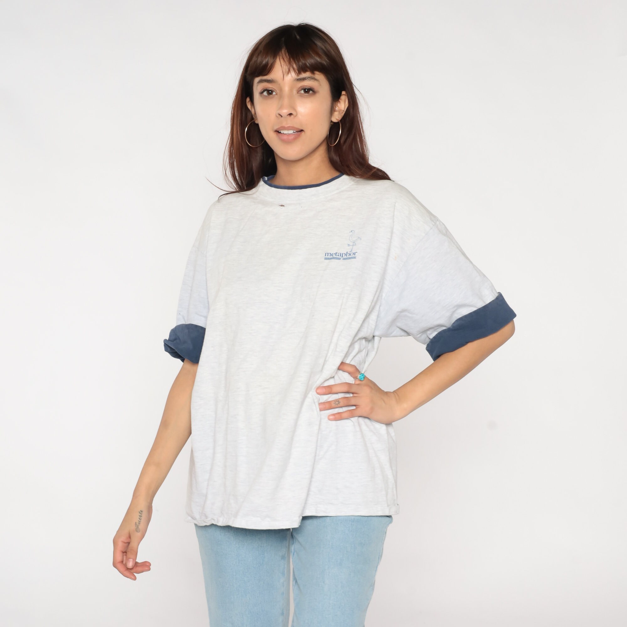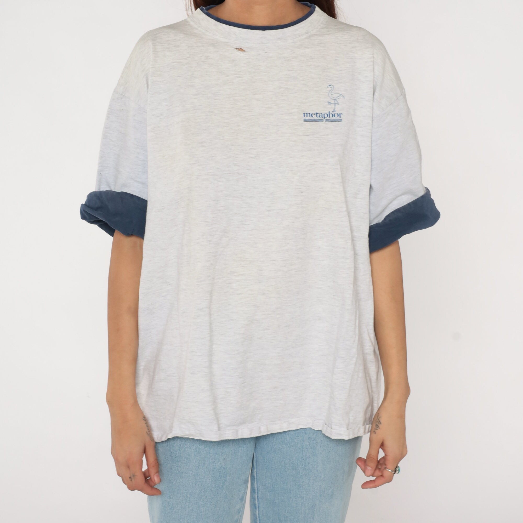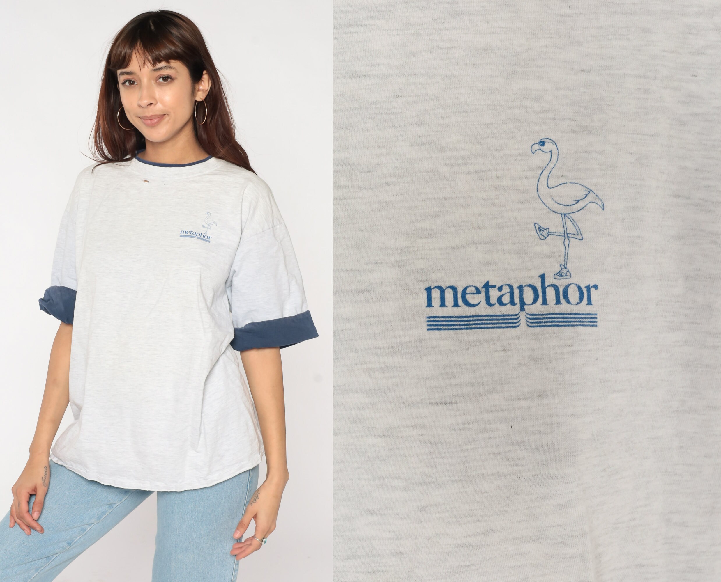 Vintage 90s t-shirt in light heather grey with the Metaphor flamingo logo on the chest and cuffed navy blue sleeves.