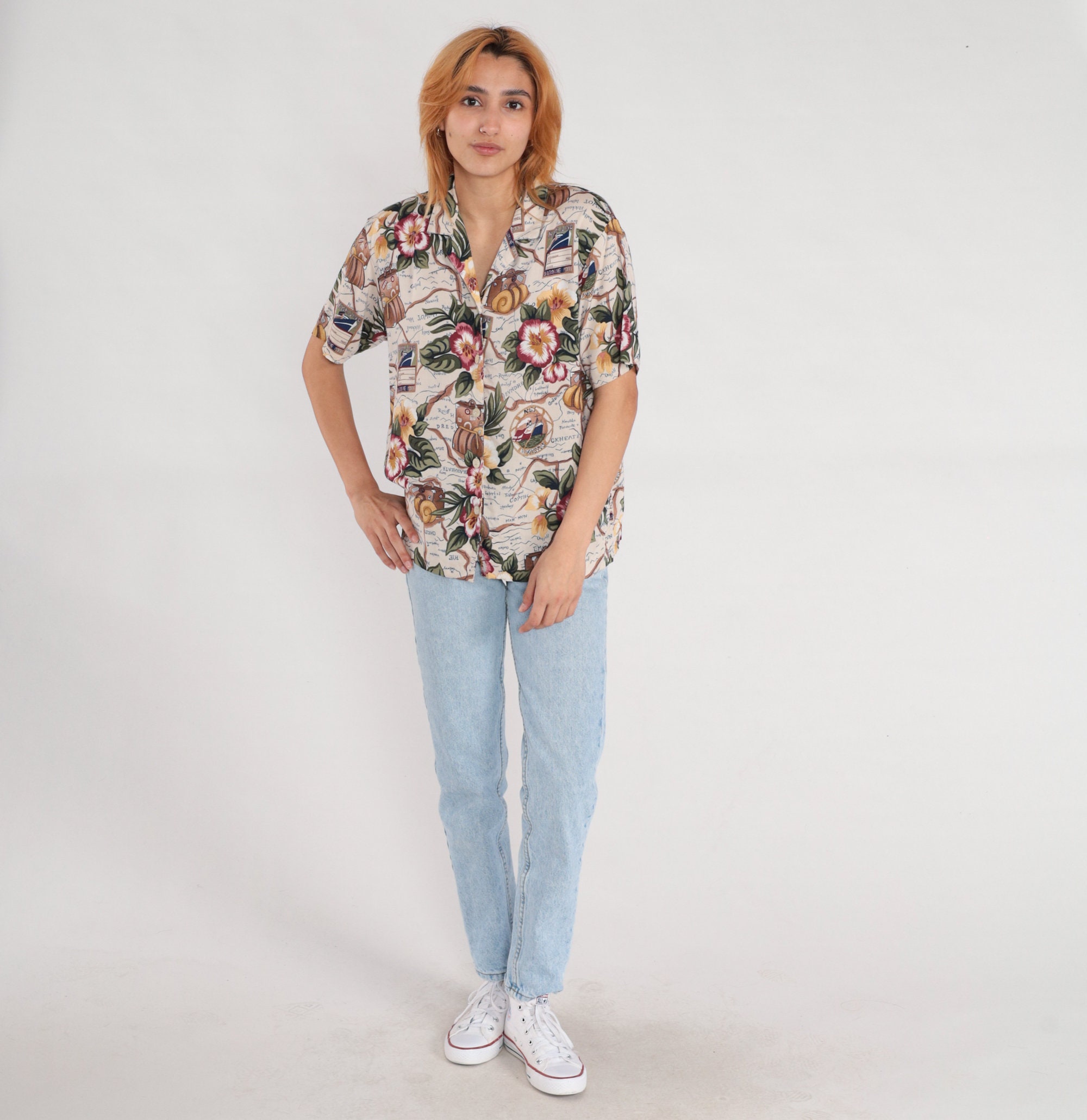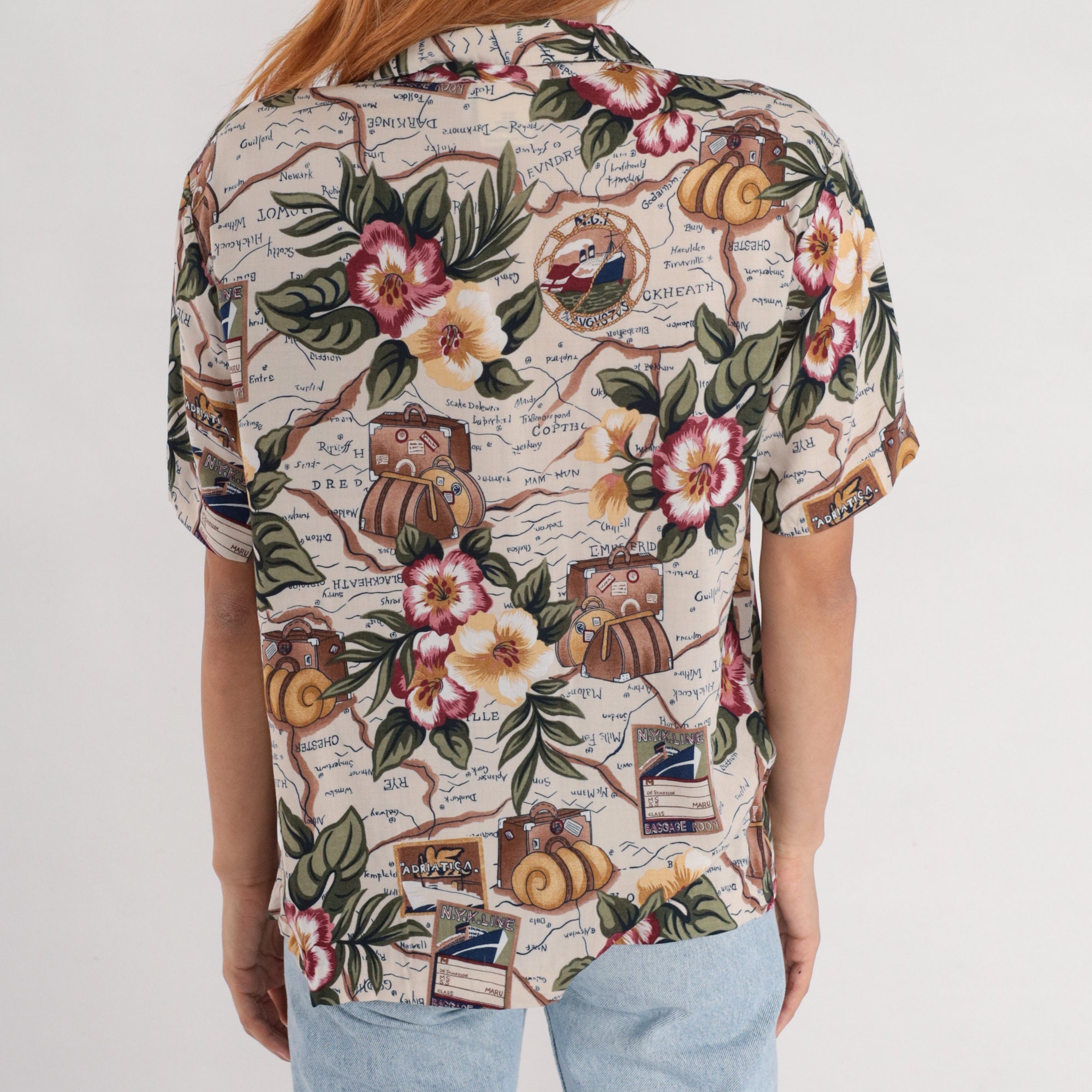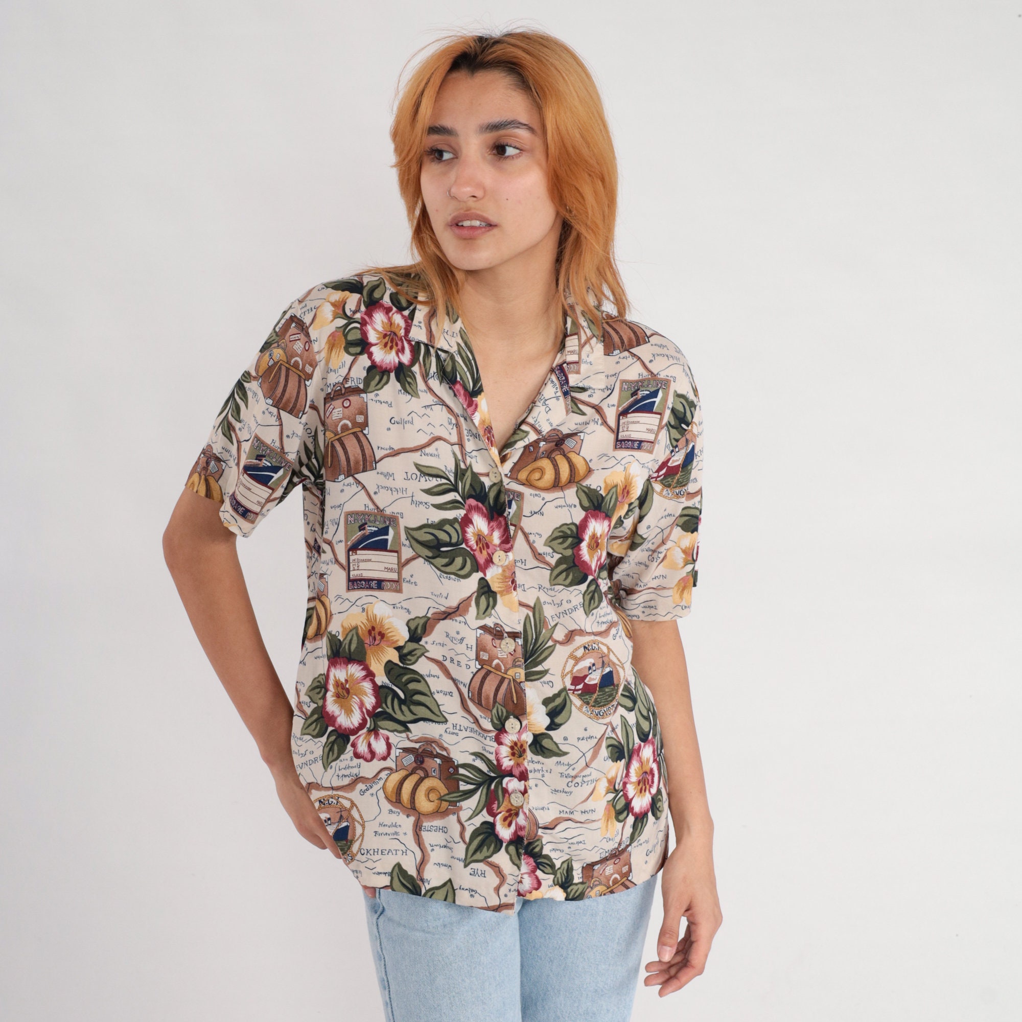 Vintage 90s shirt in a floral, ship and suitcase print. It has short sleeves and buttons up the front.