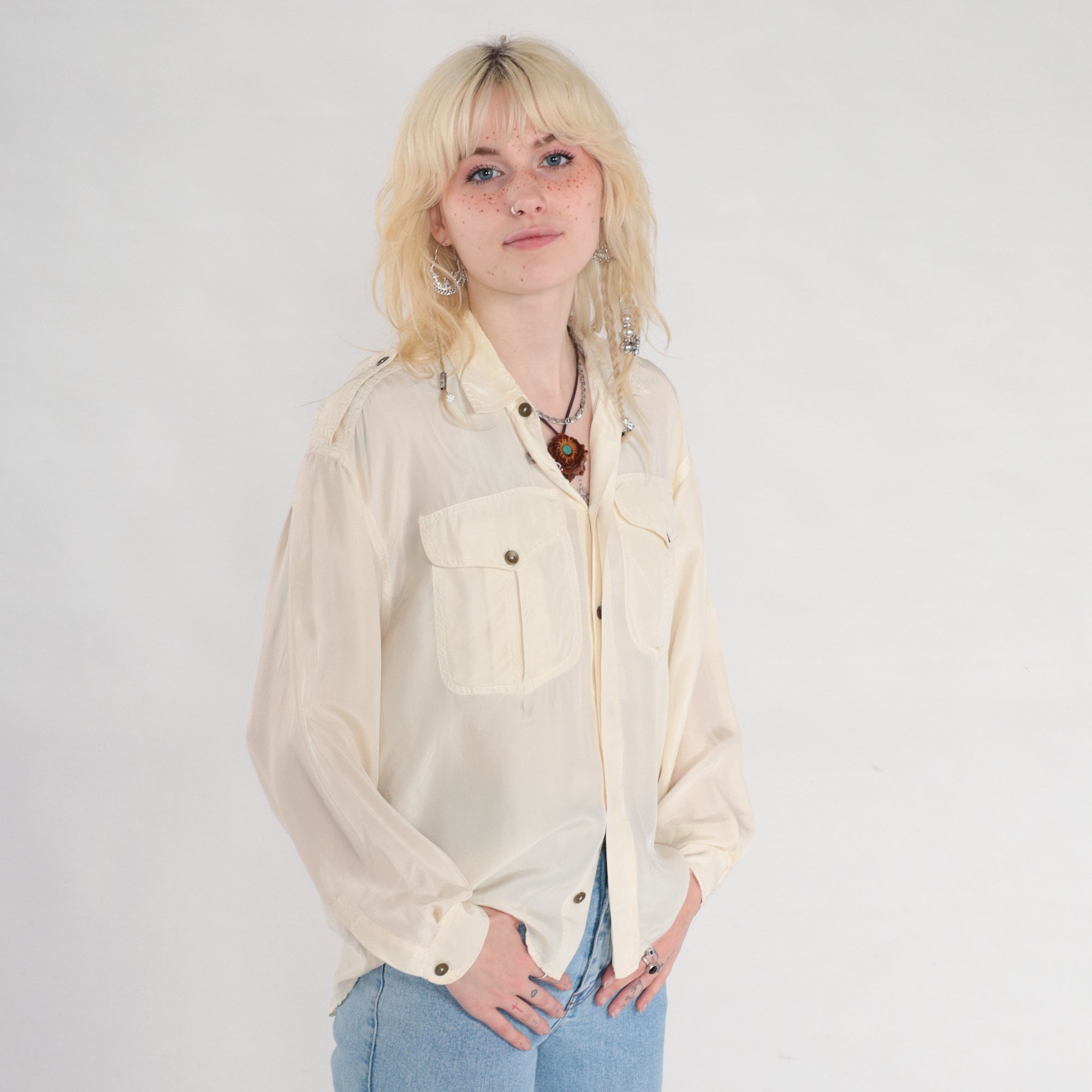 Vintage 90s blouse in Semi-Sheer cream silk with long sleeves, chest pockets, and hidden buttons up the front.
