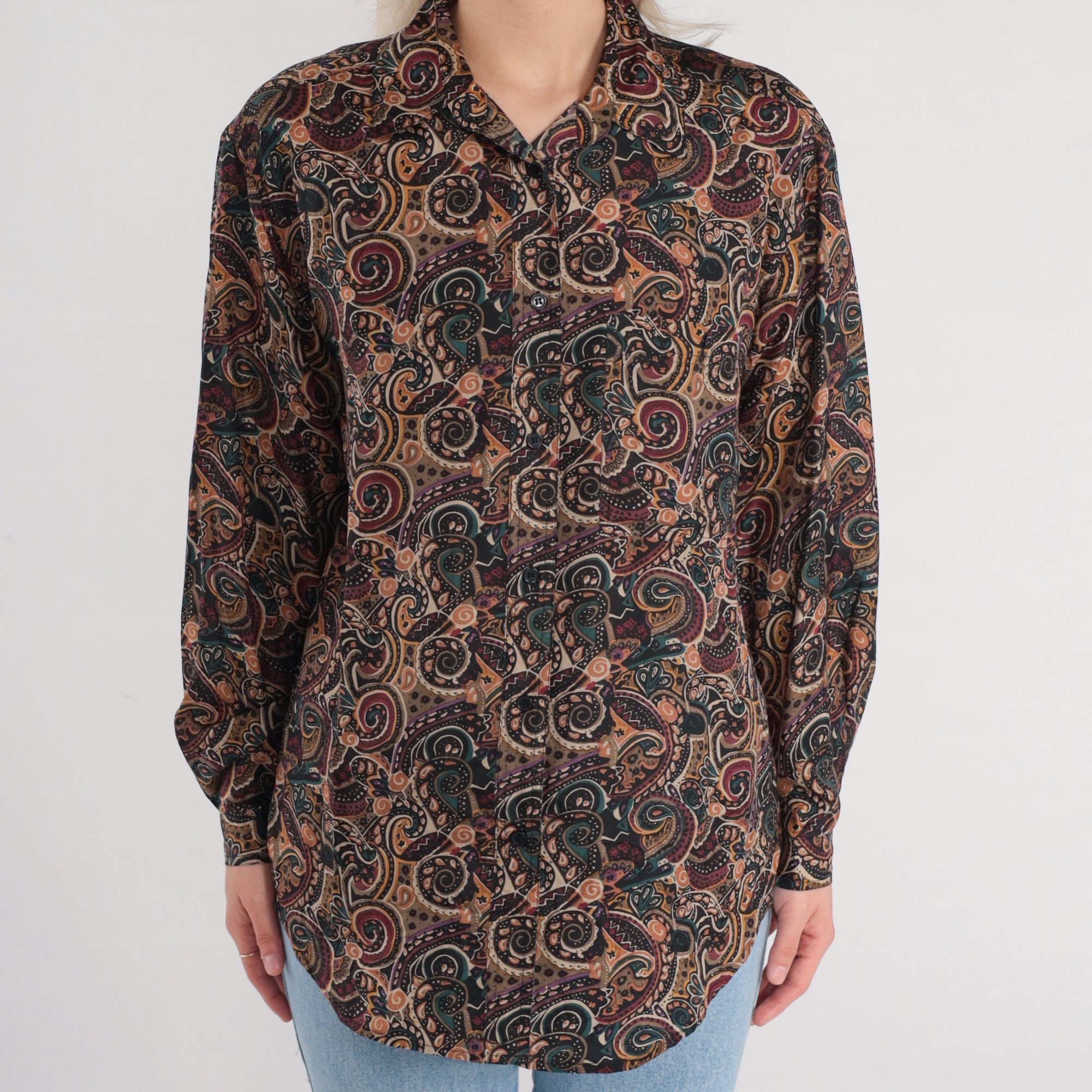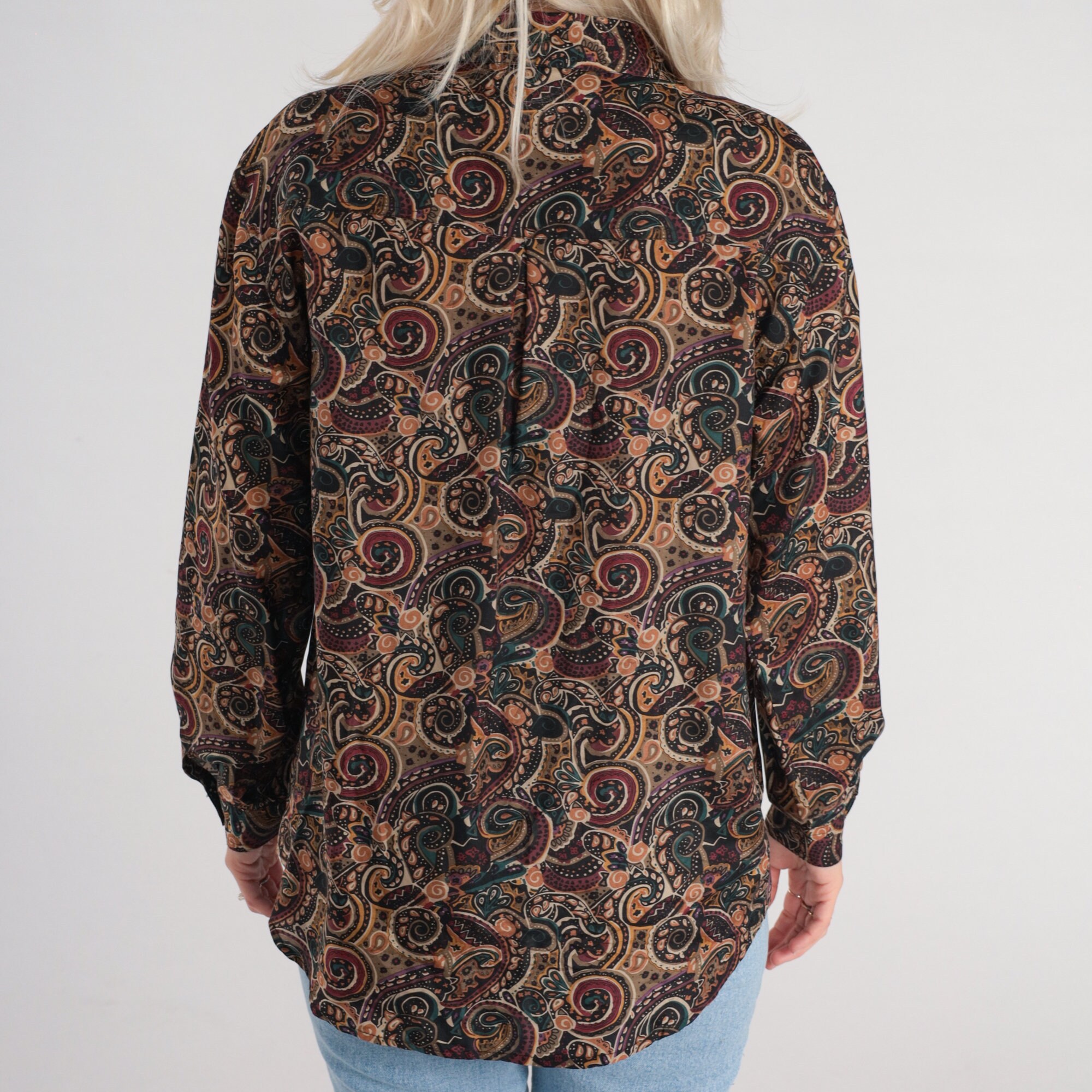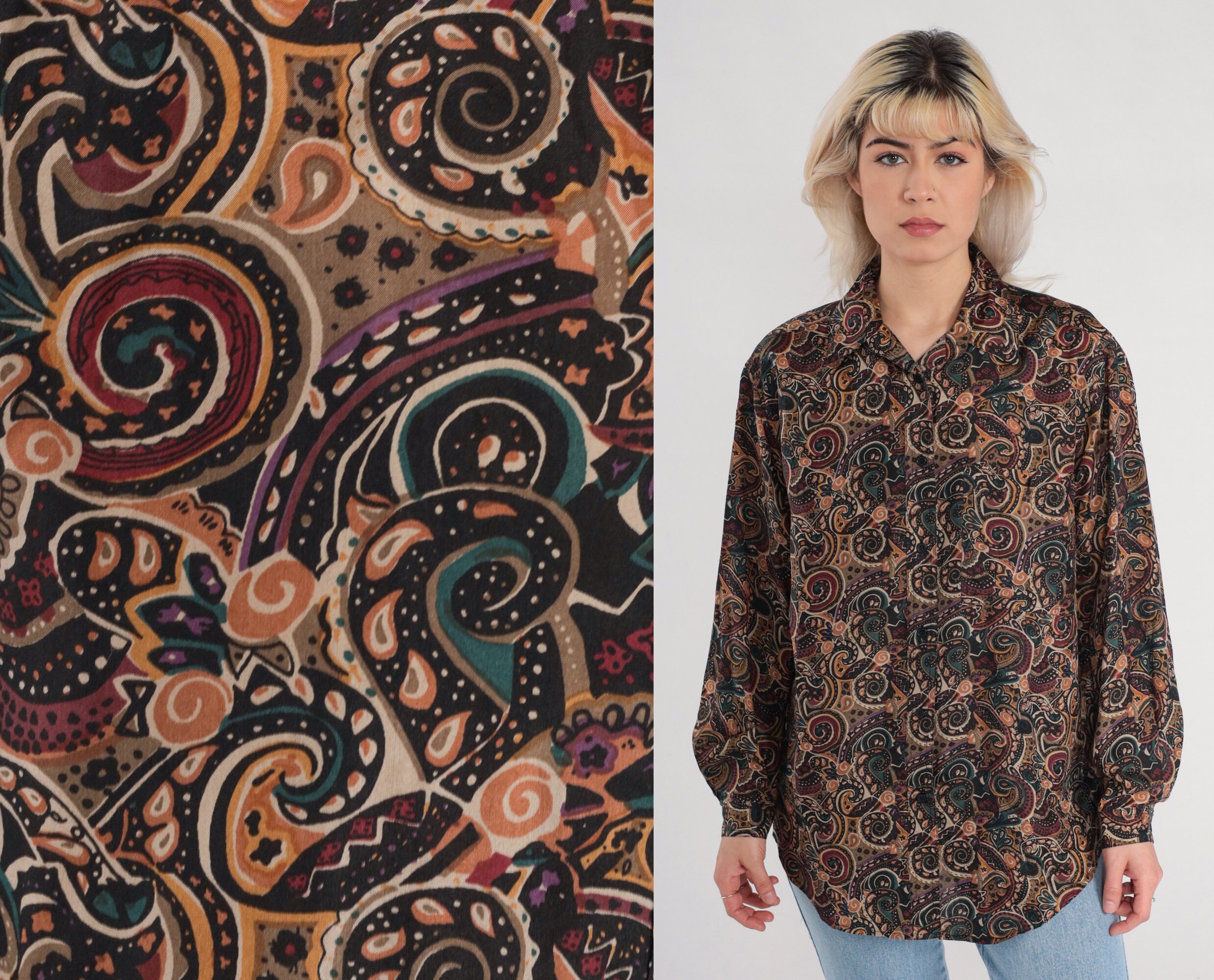 Vintage 90s shirt in an abstract paisley swirl print with long sleeves and buttons up the front.