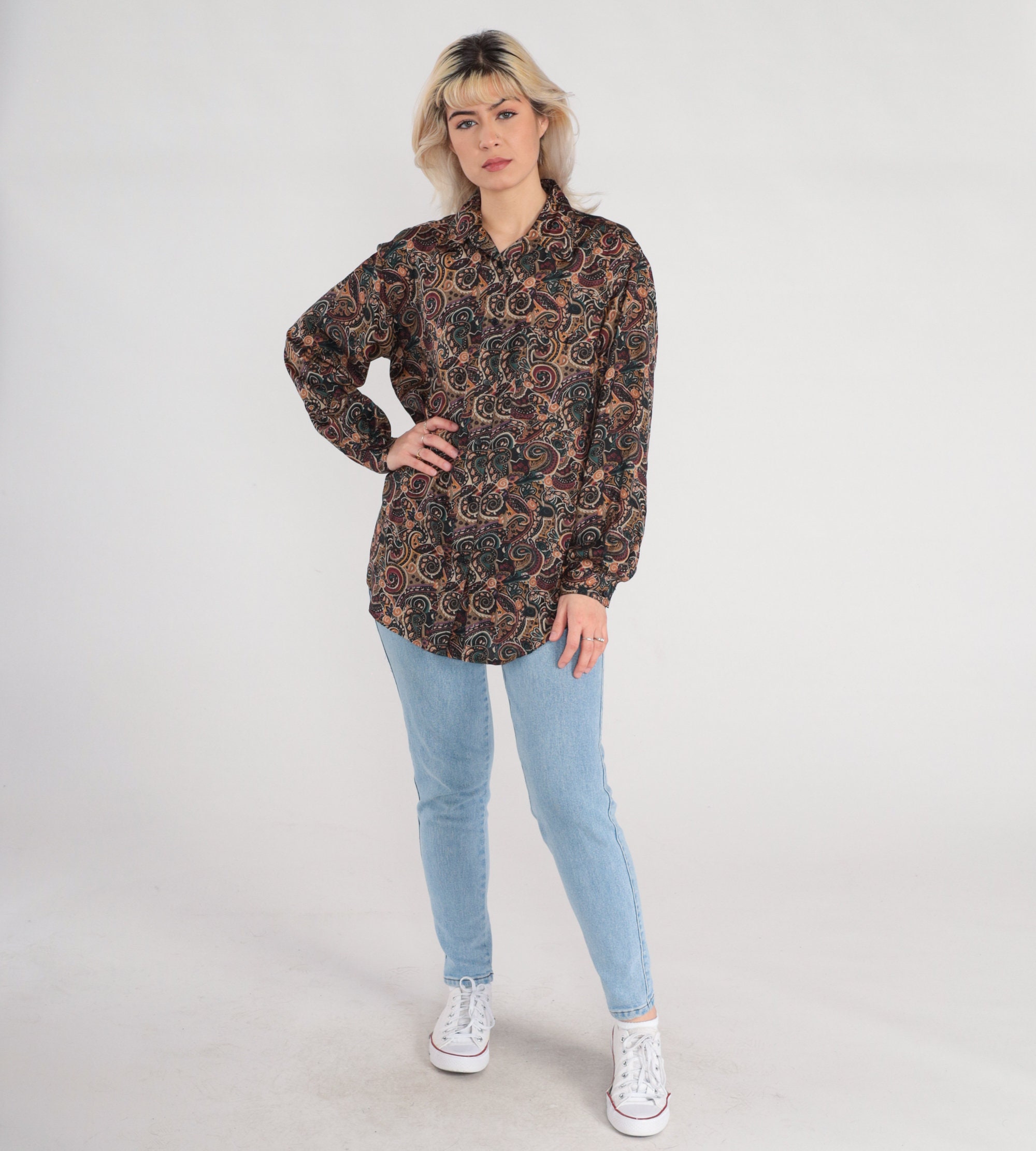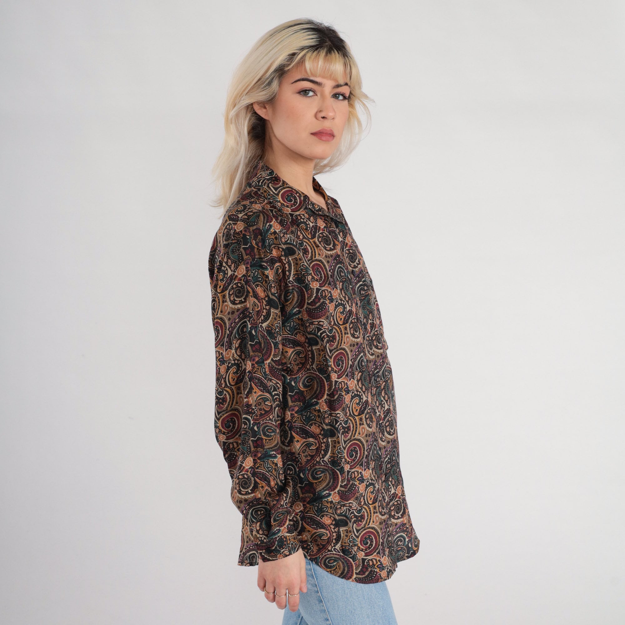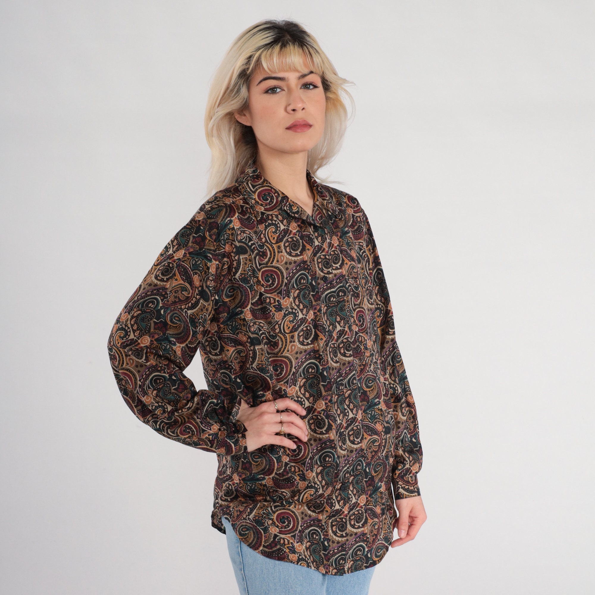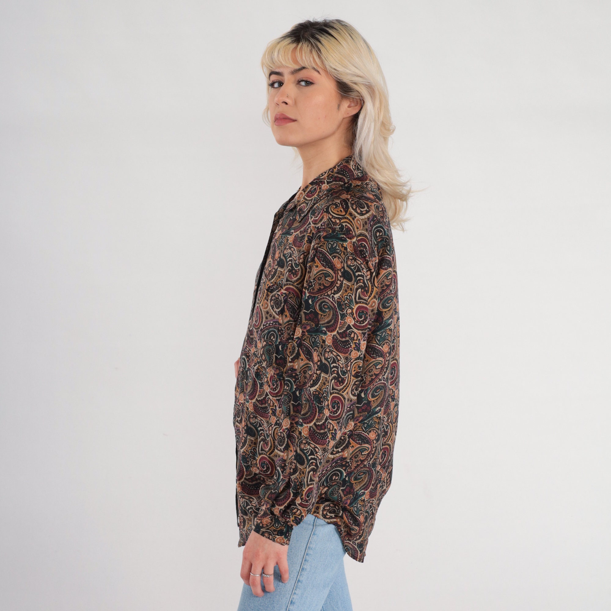 Vintage 90s shirt in an abstract paisley swirl print with long sleeves and buttons up the front.
