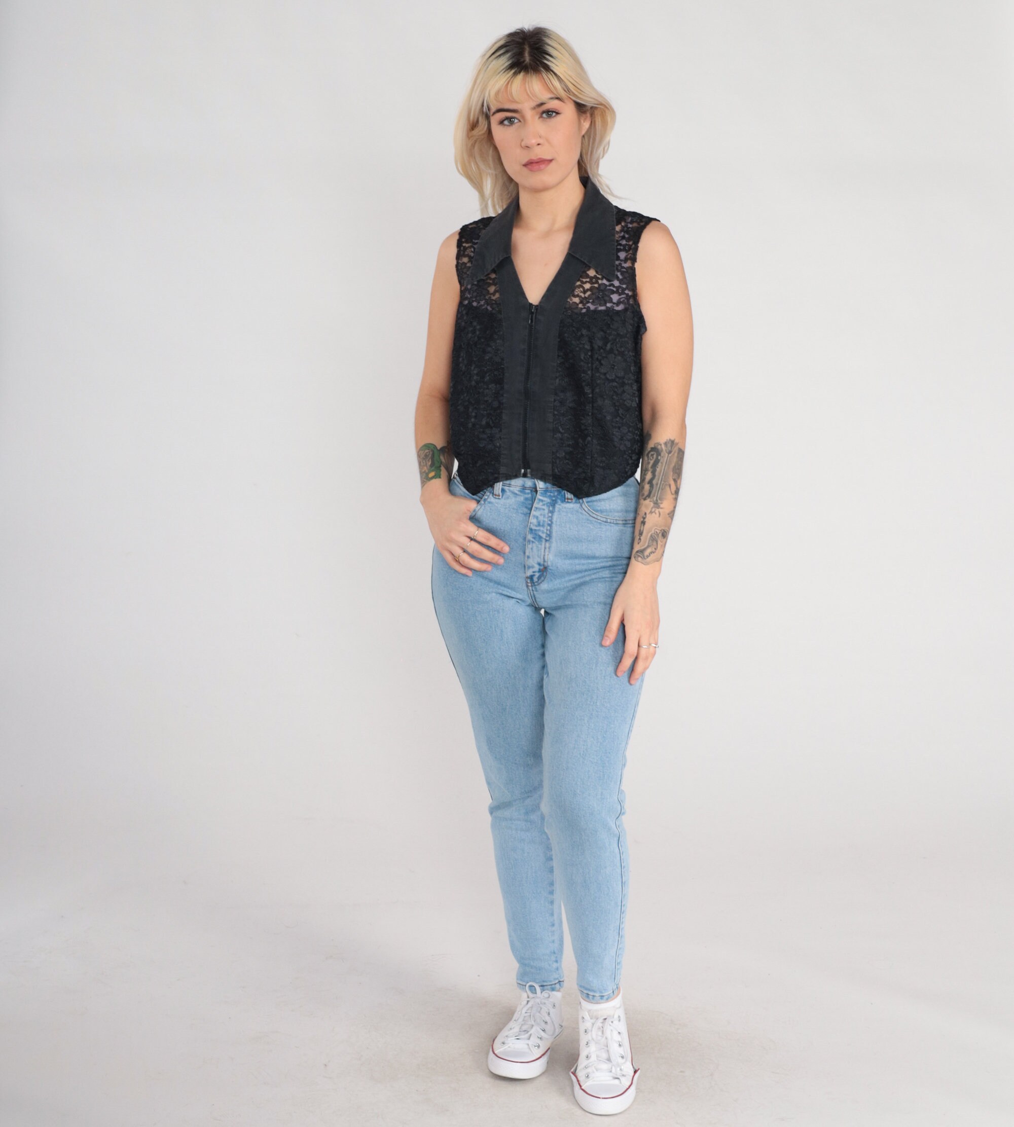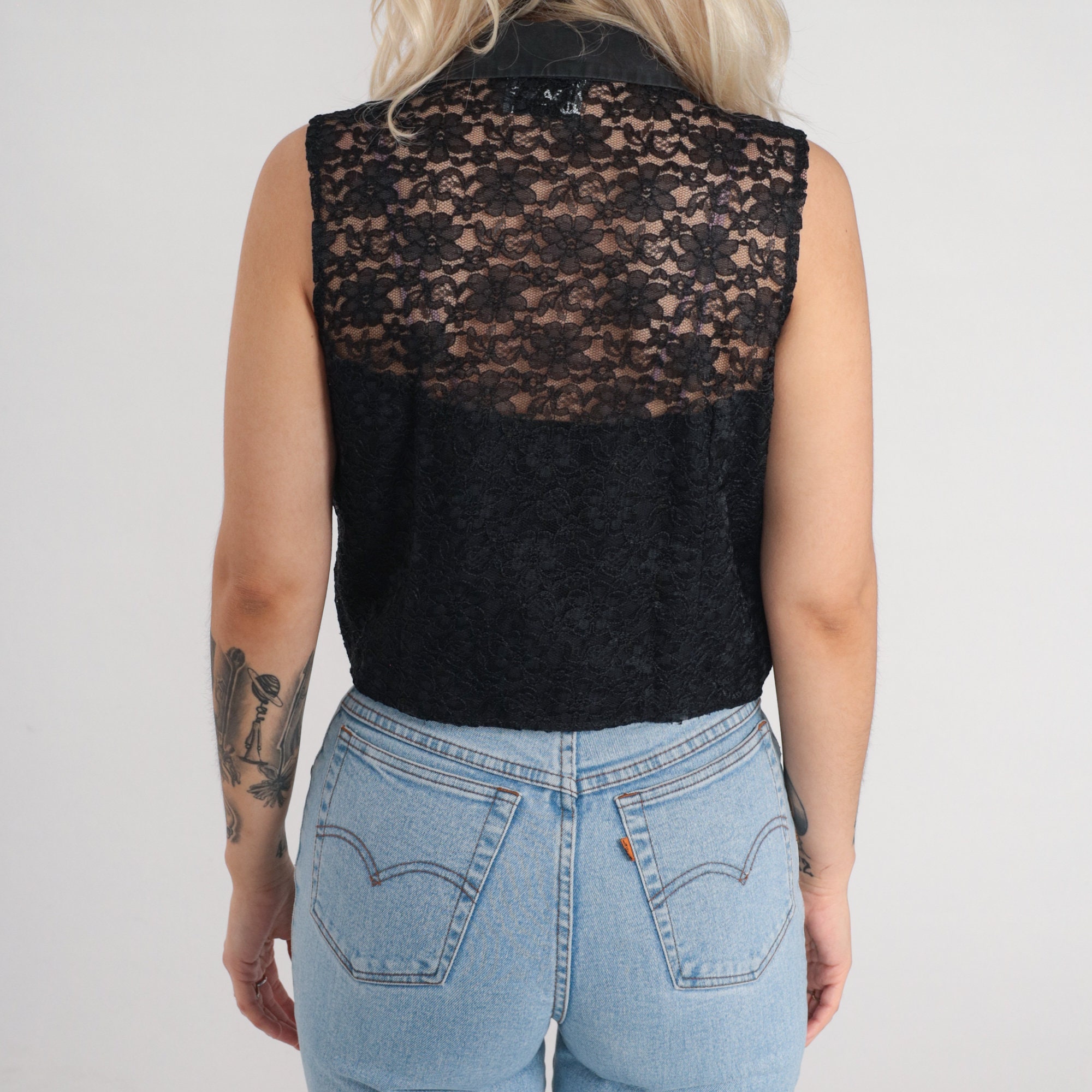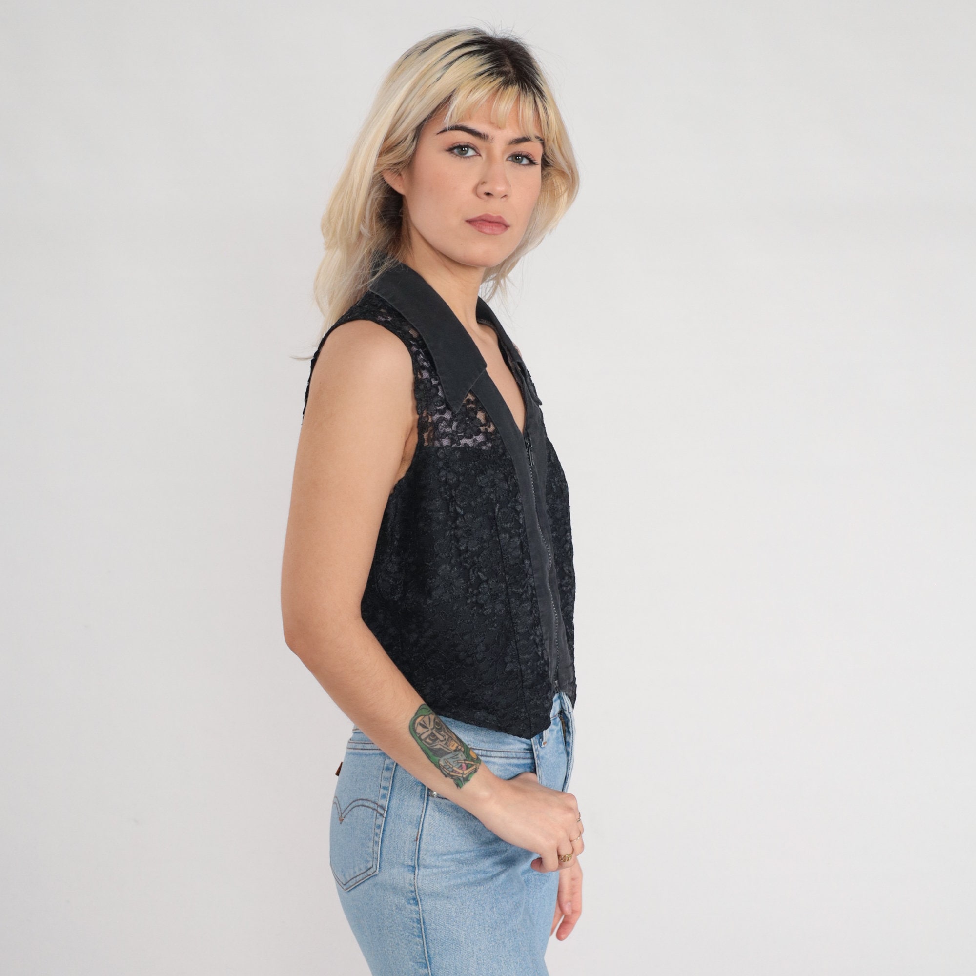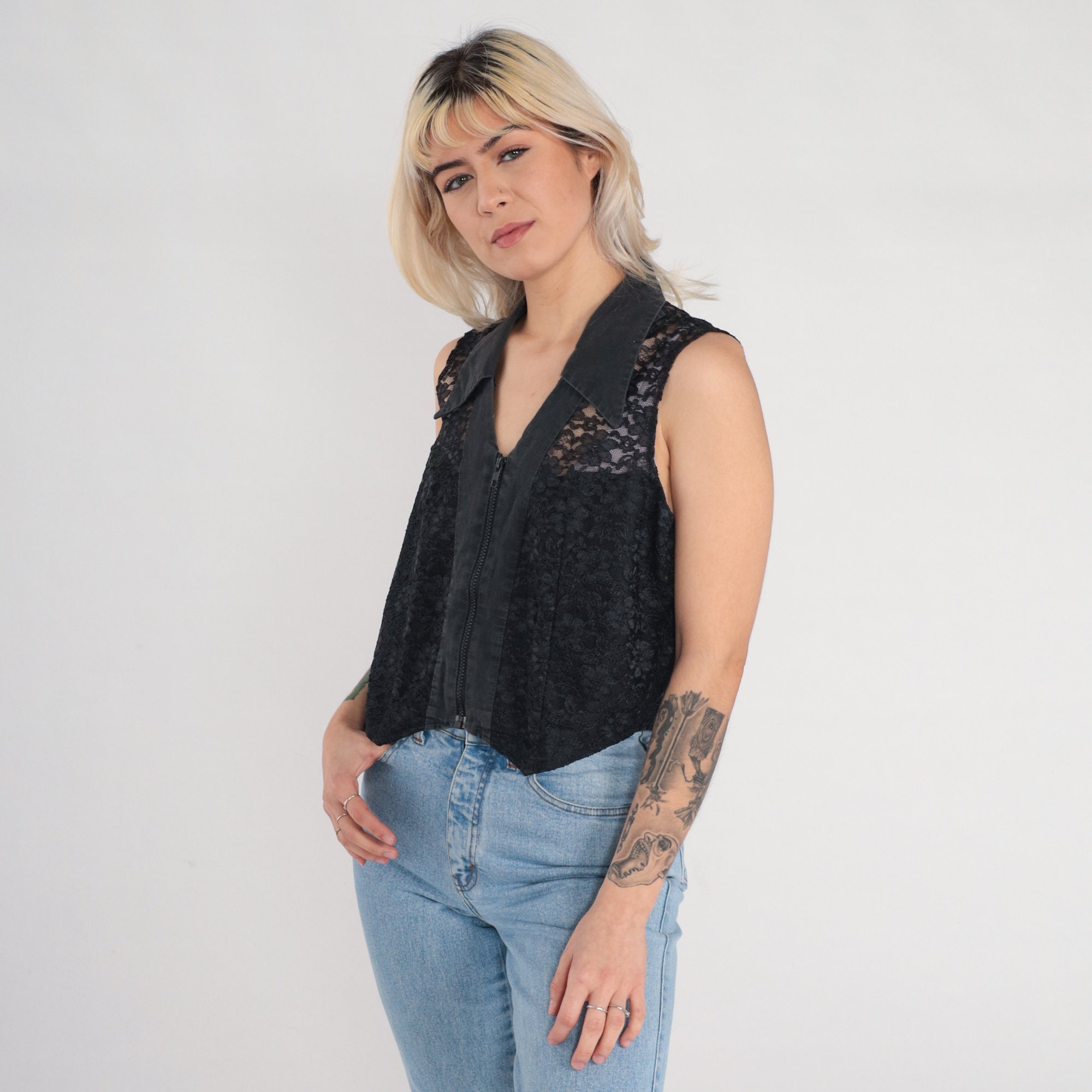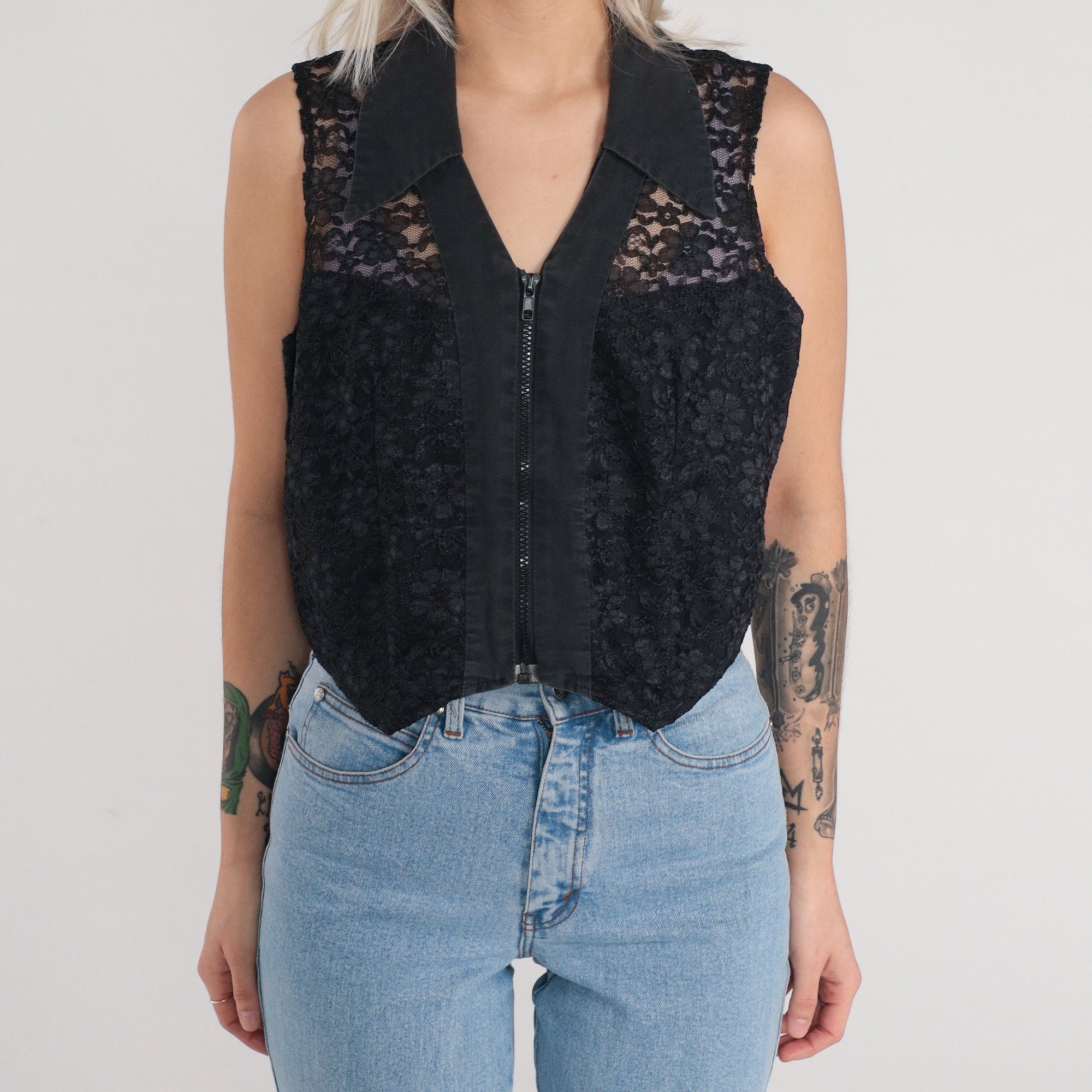 Vintage 90s vest top in sheer floral lace with a zipper up the front. Shown with a purple bra underneath which is not part of the top.