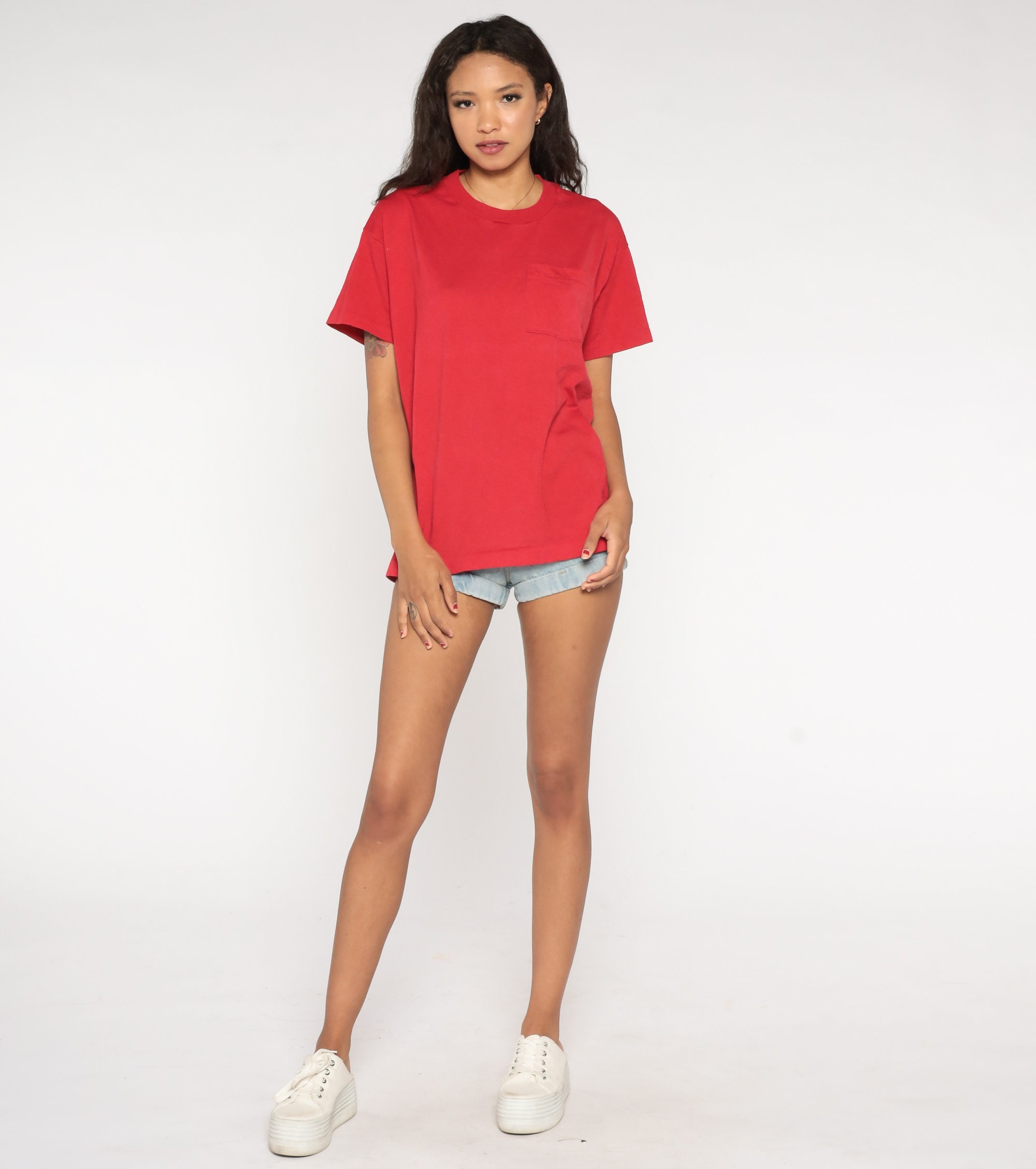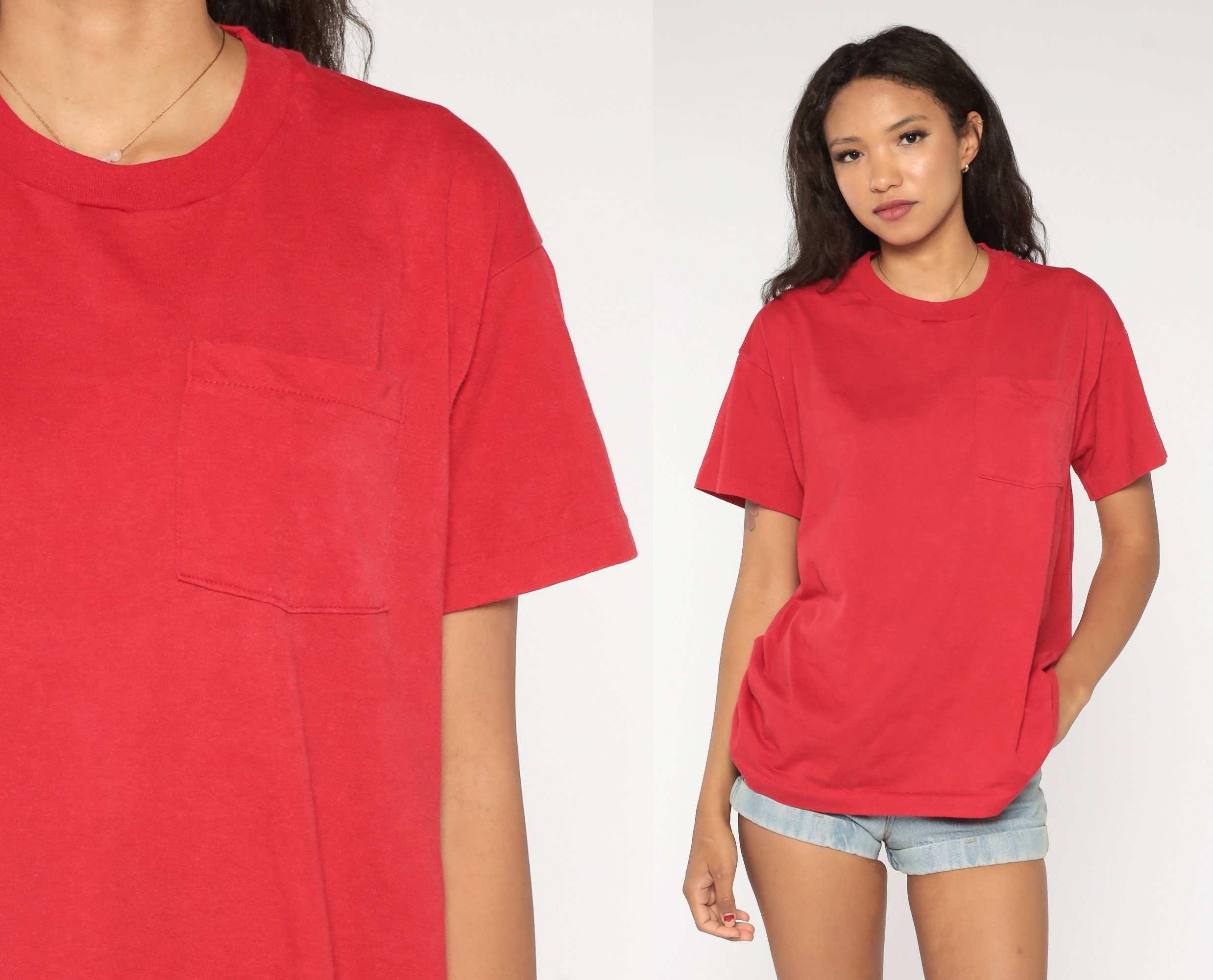 Vintage 80s 90s t shirt in red cotton/poly. Has a chest pocket and short sleeves.