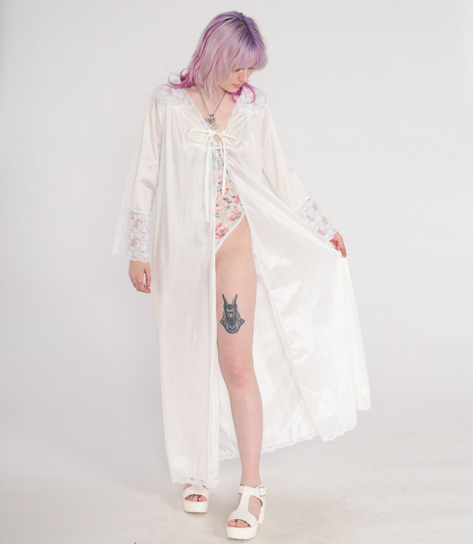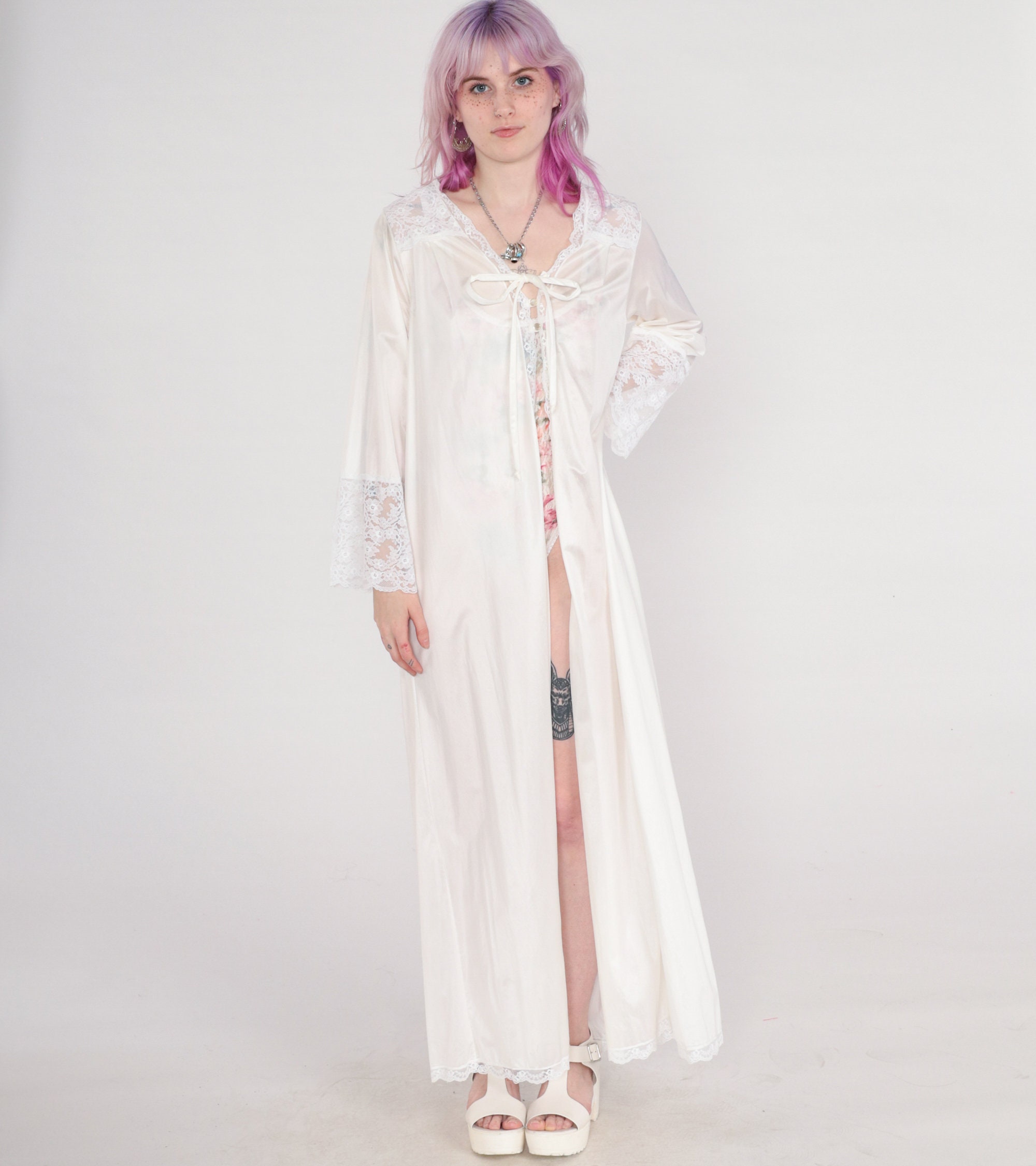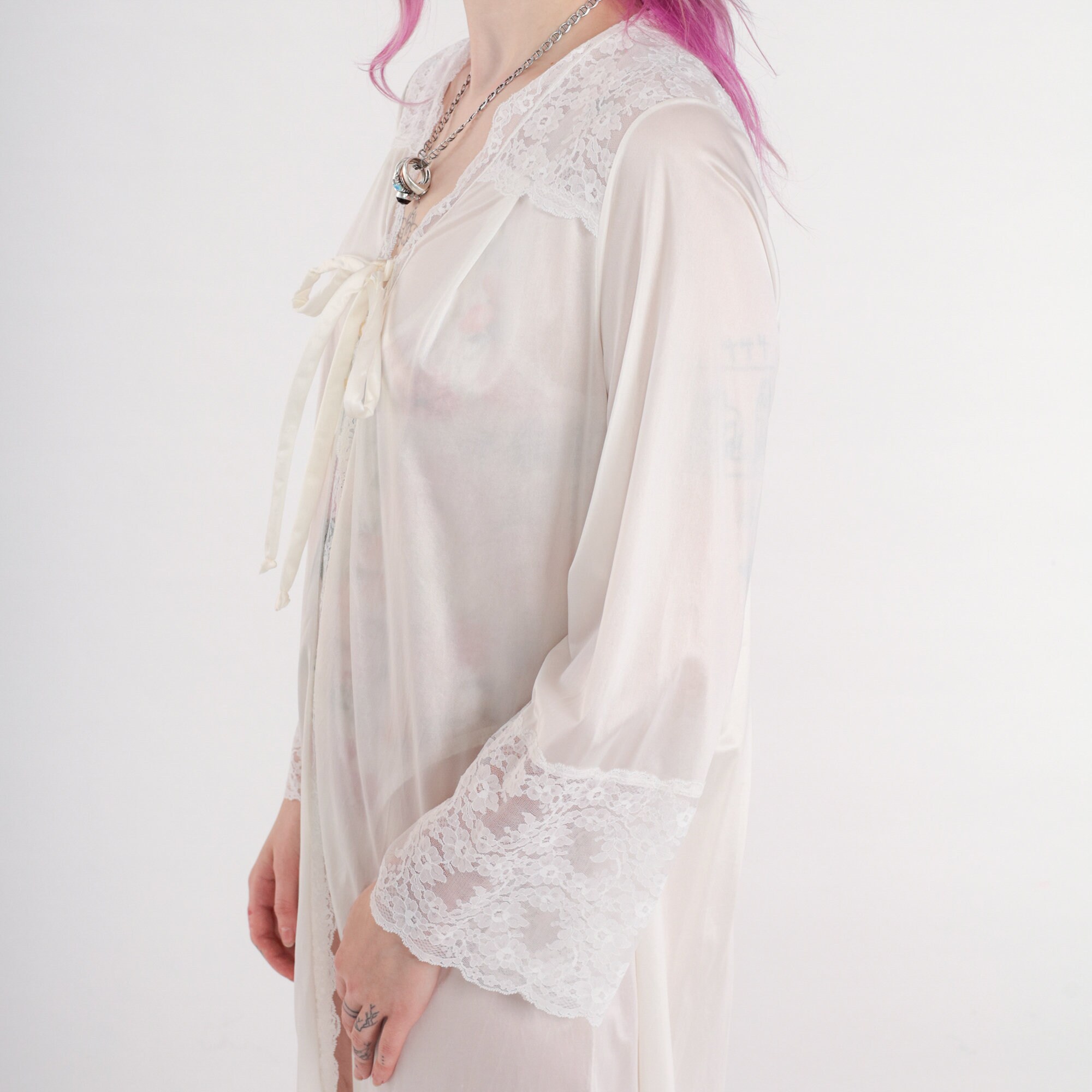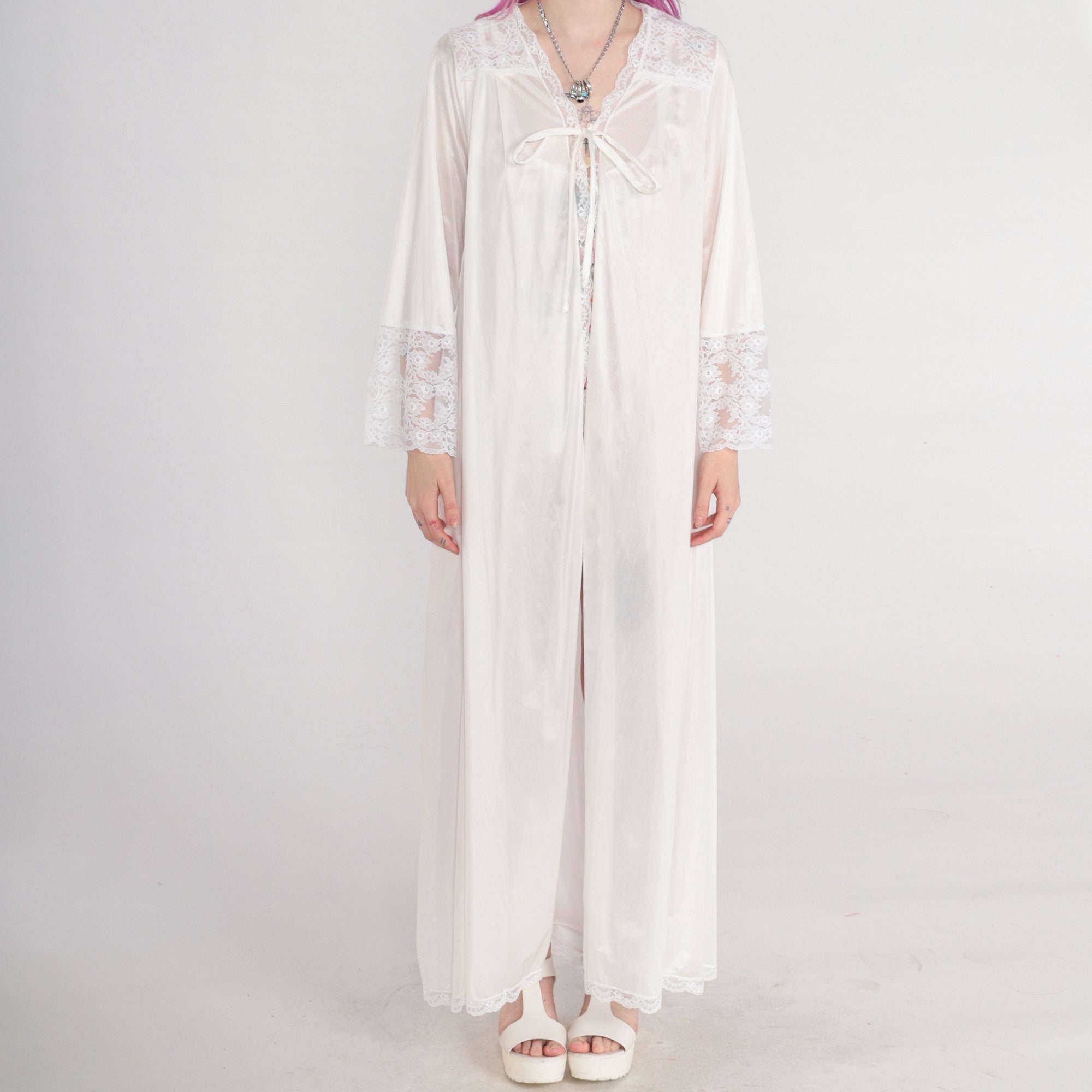 Vintage 70s lingerie robe by Gilead in white nylon with lace trim and a tie at the chest. Maxi length.