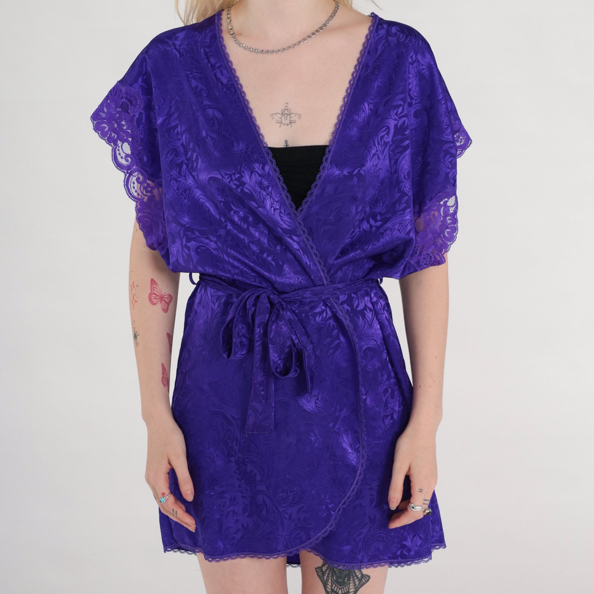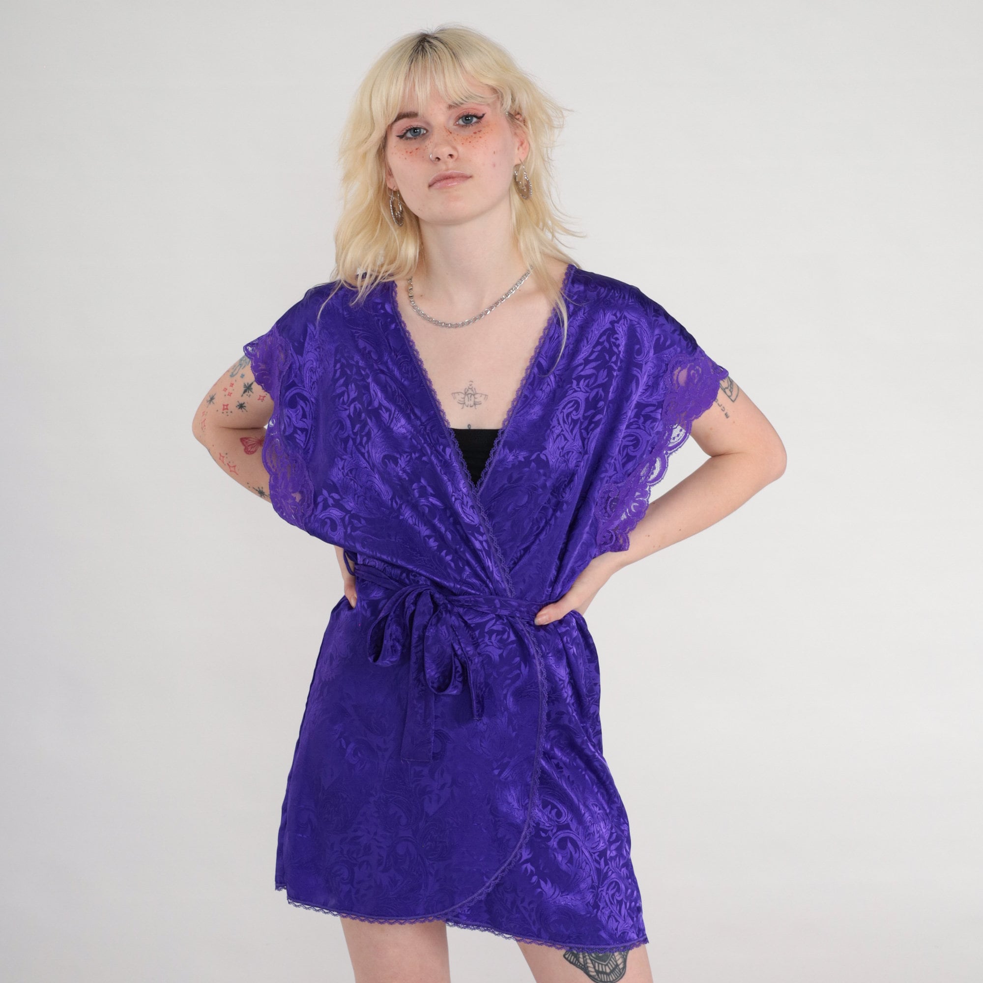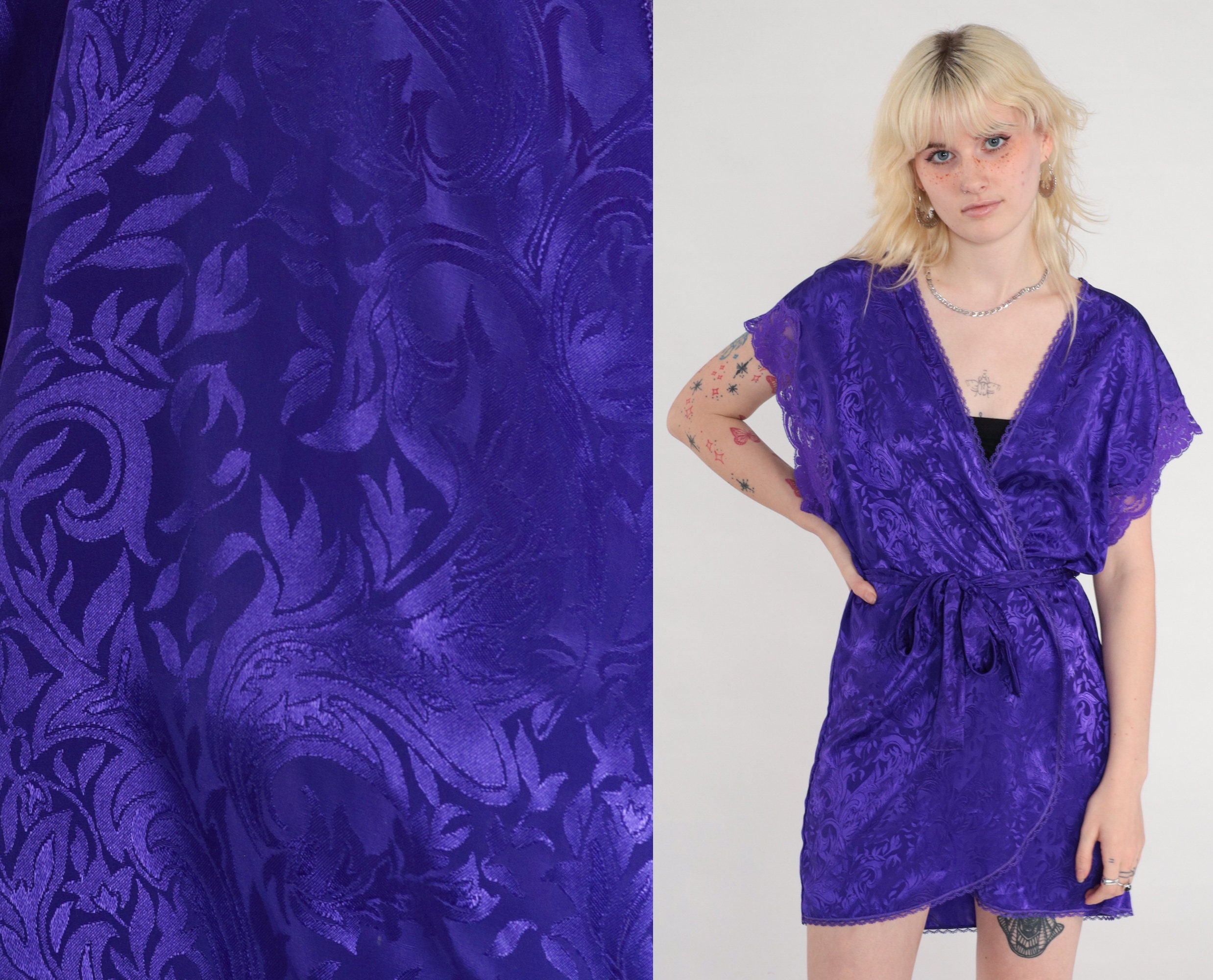 Vintage 80s 90s lingerie robe in embossed purple with lace trim, a wrap cut and a belt.