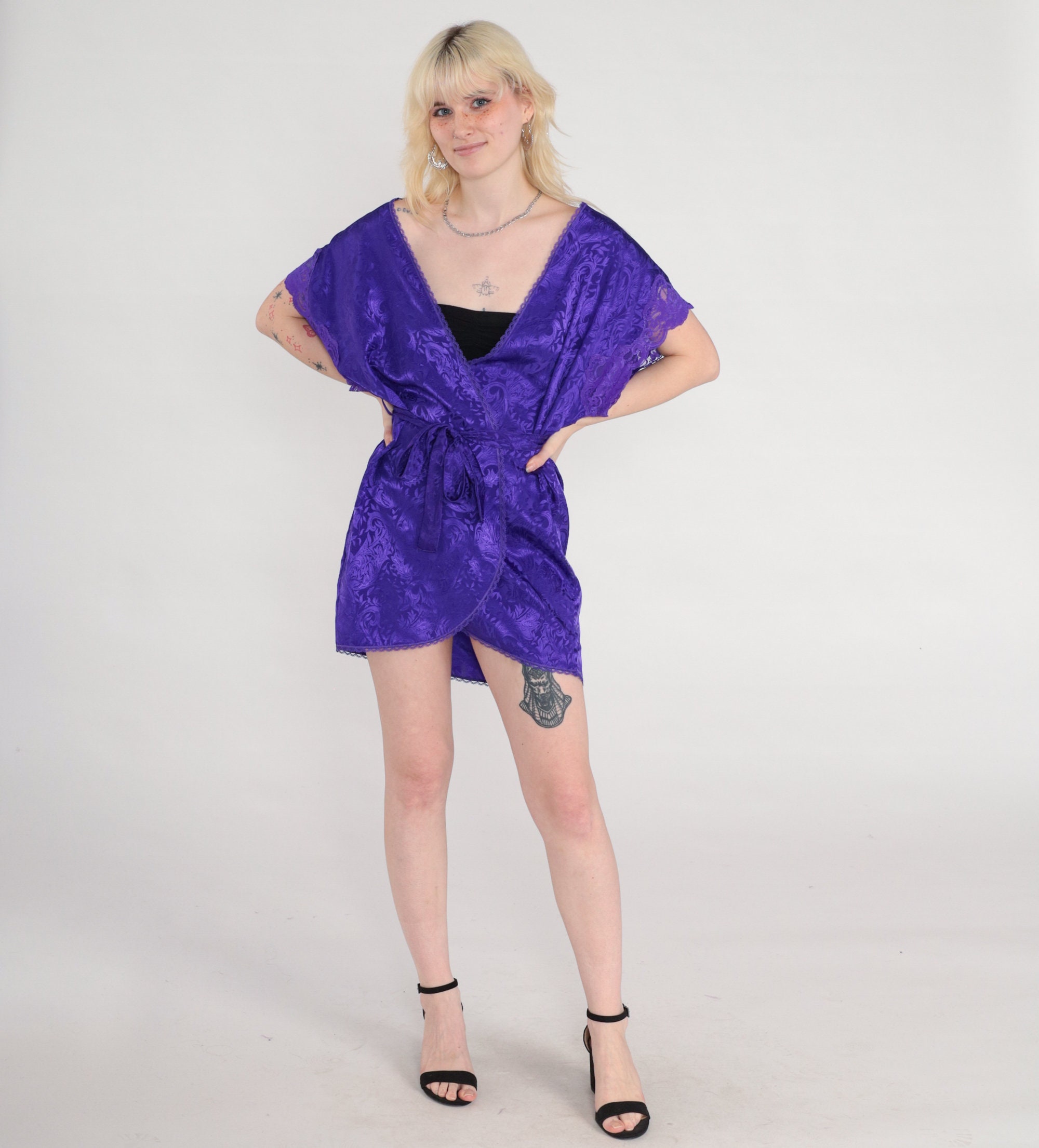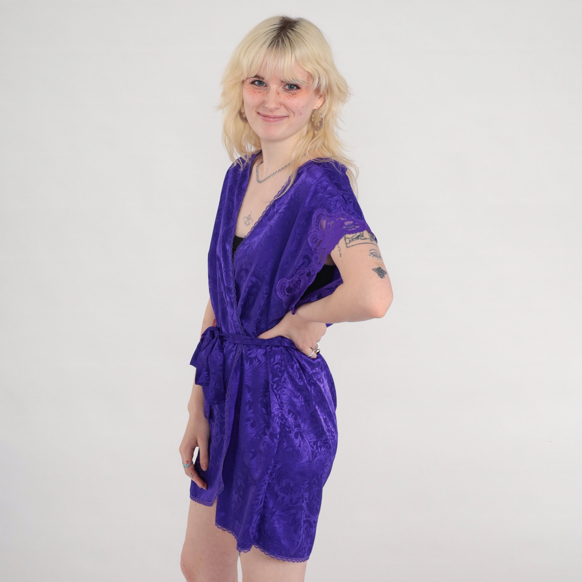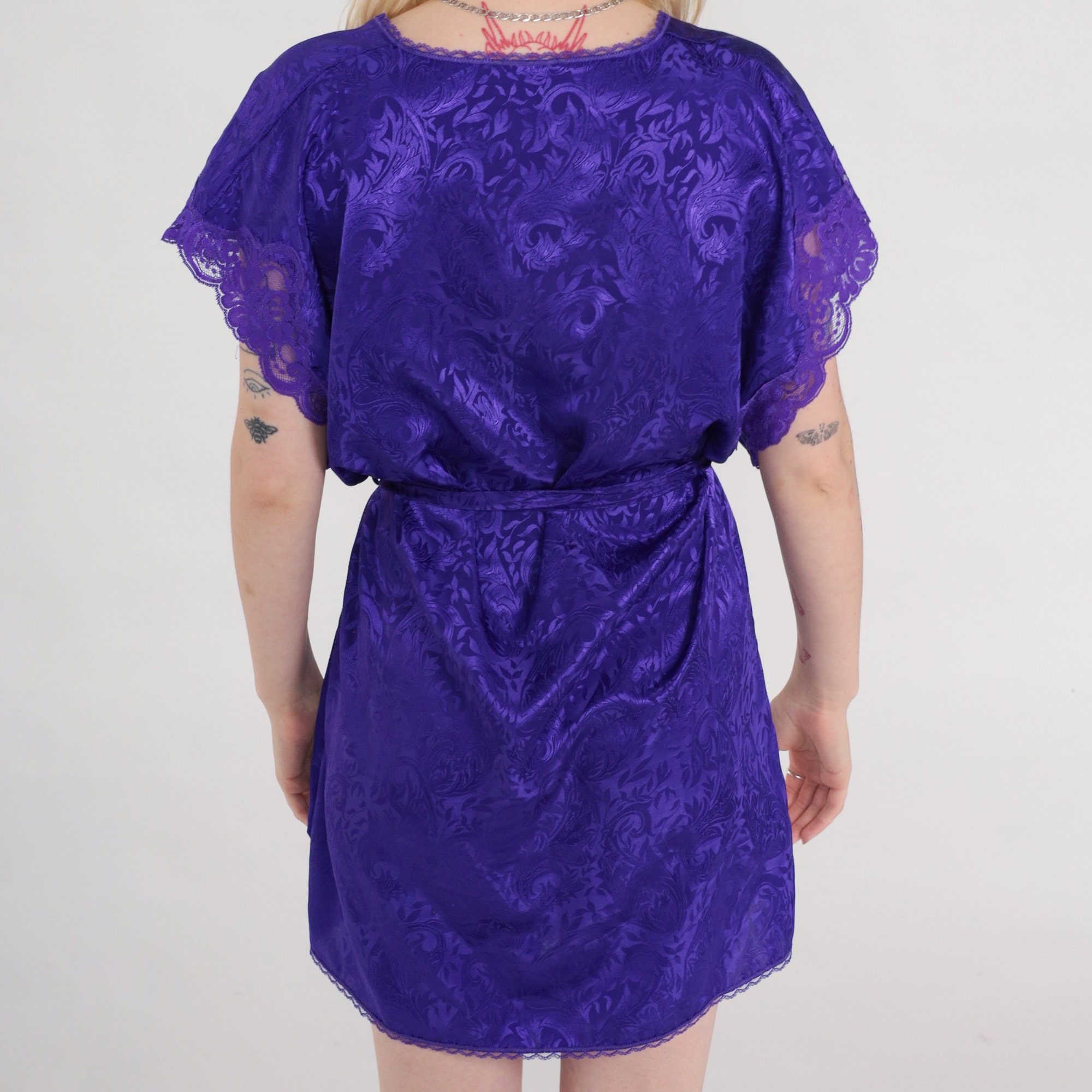 Vintage 80s 90s lingerie robe in embossed purple with lace trim, a wrap cut and a belt.