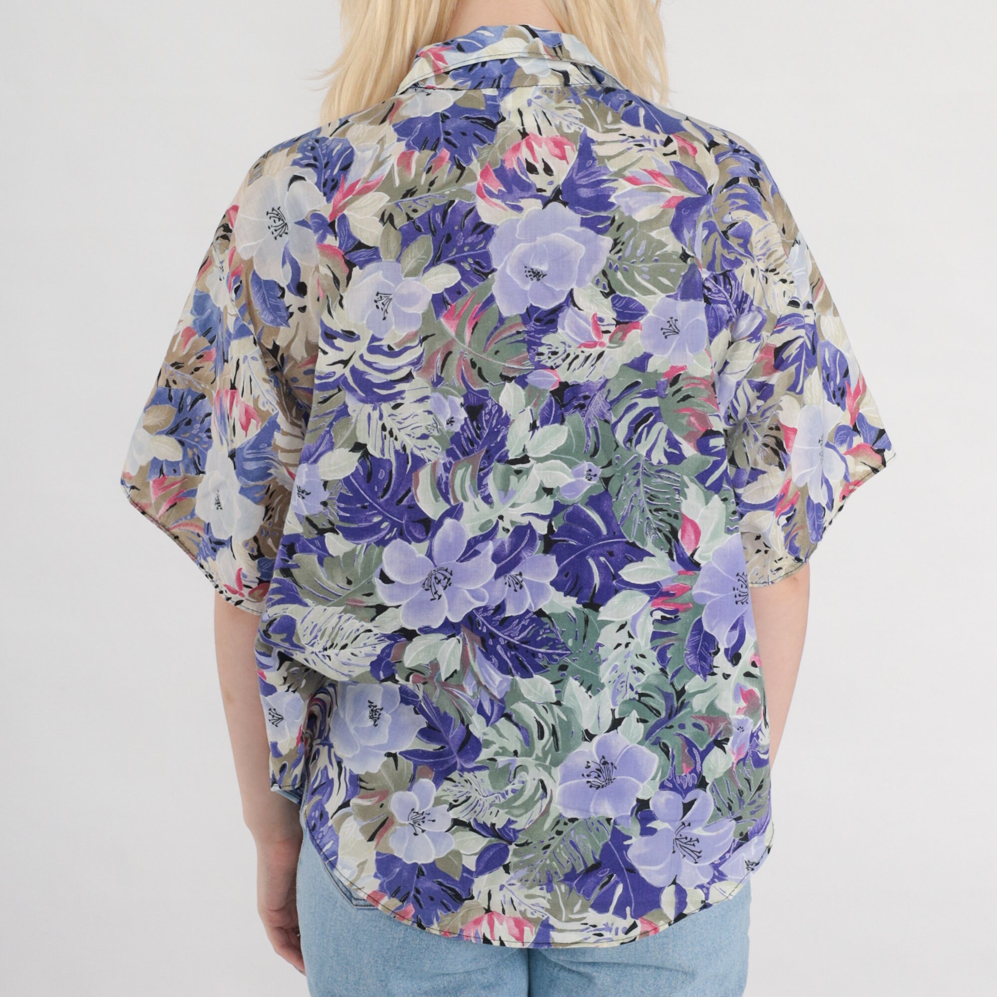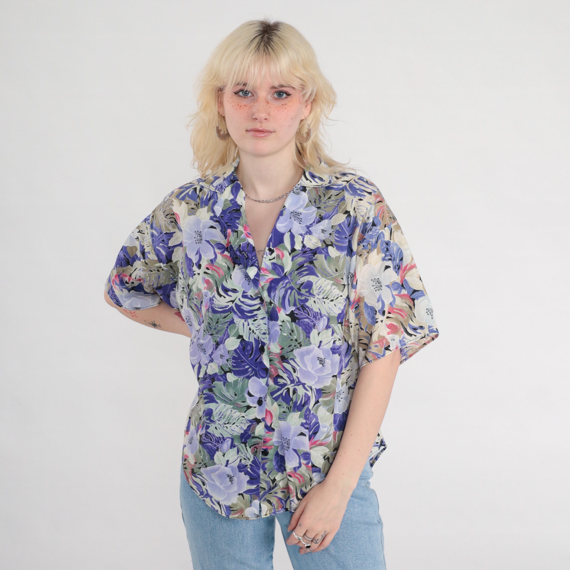 Vintage 80s 90s shirt with a floral print. It has short sleeves and buttons up the front.