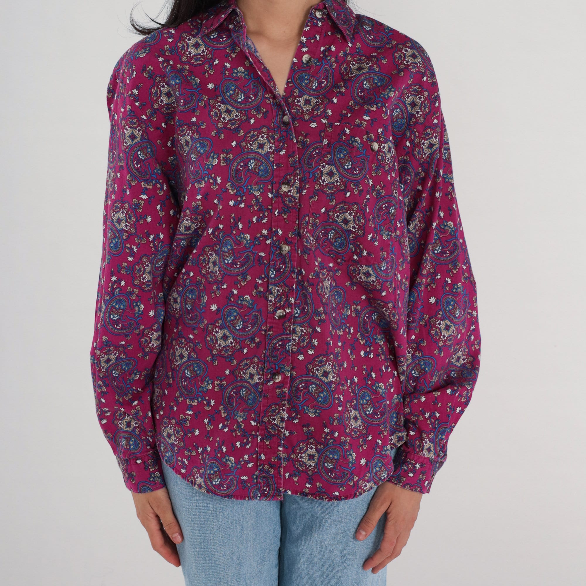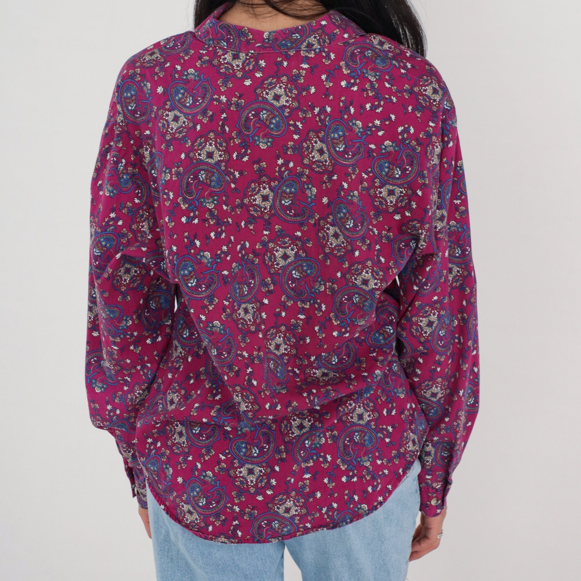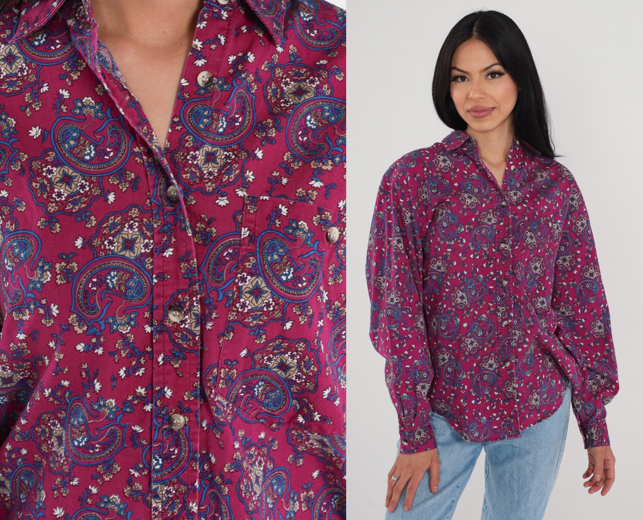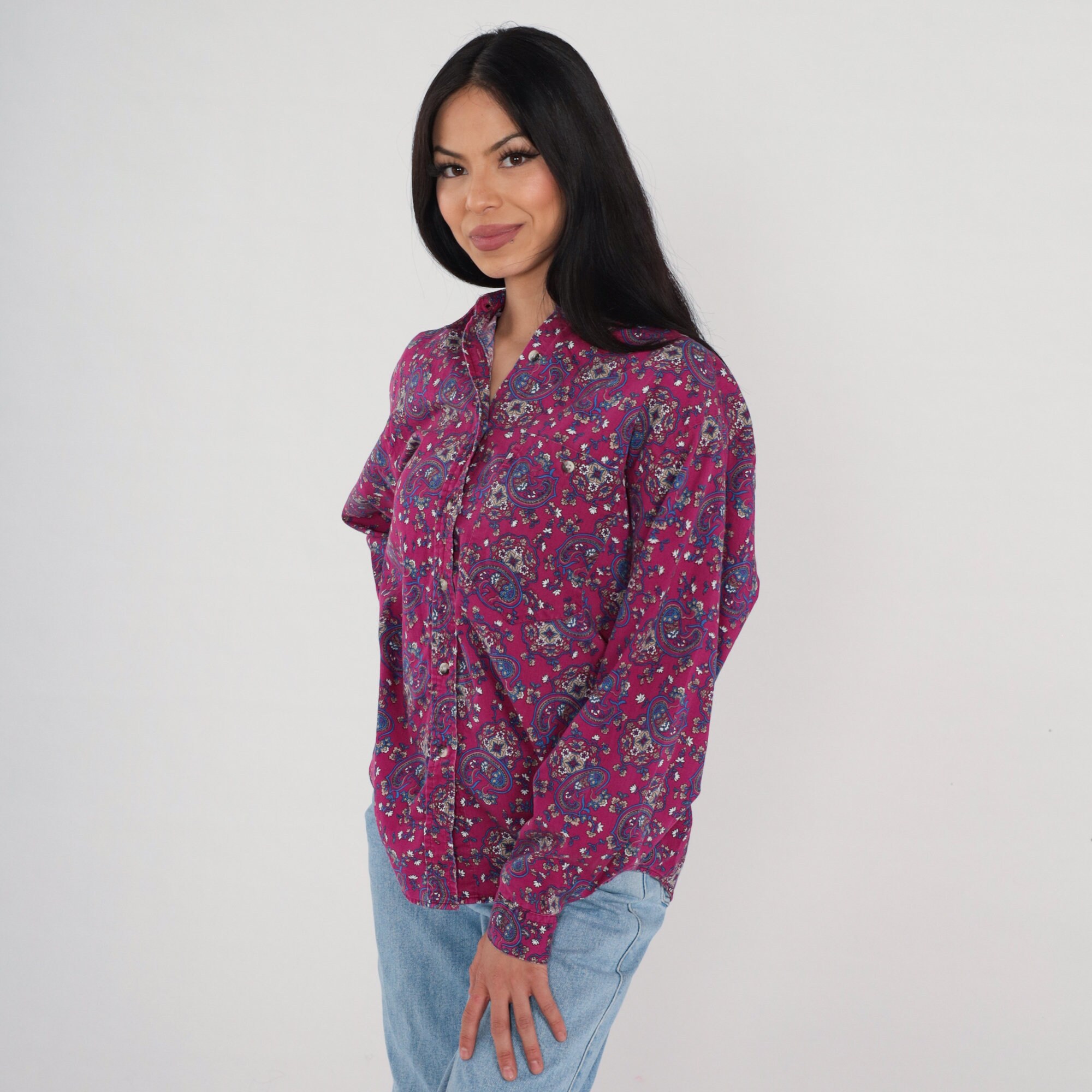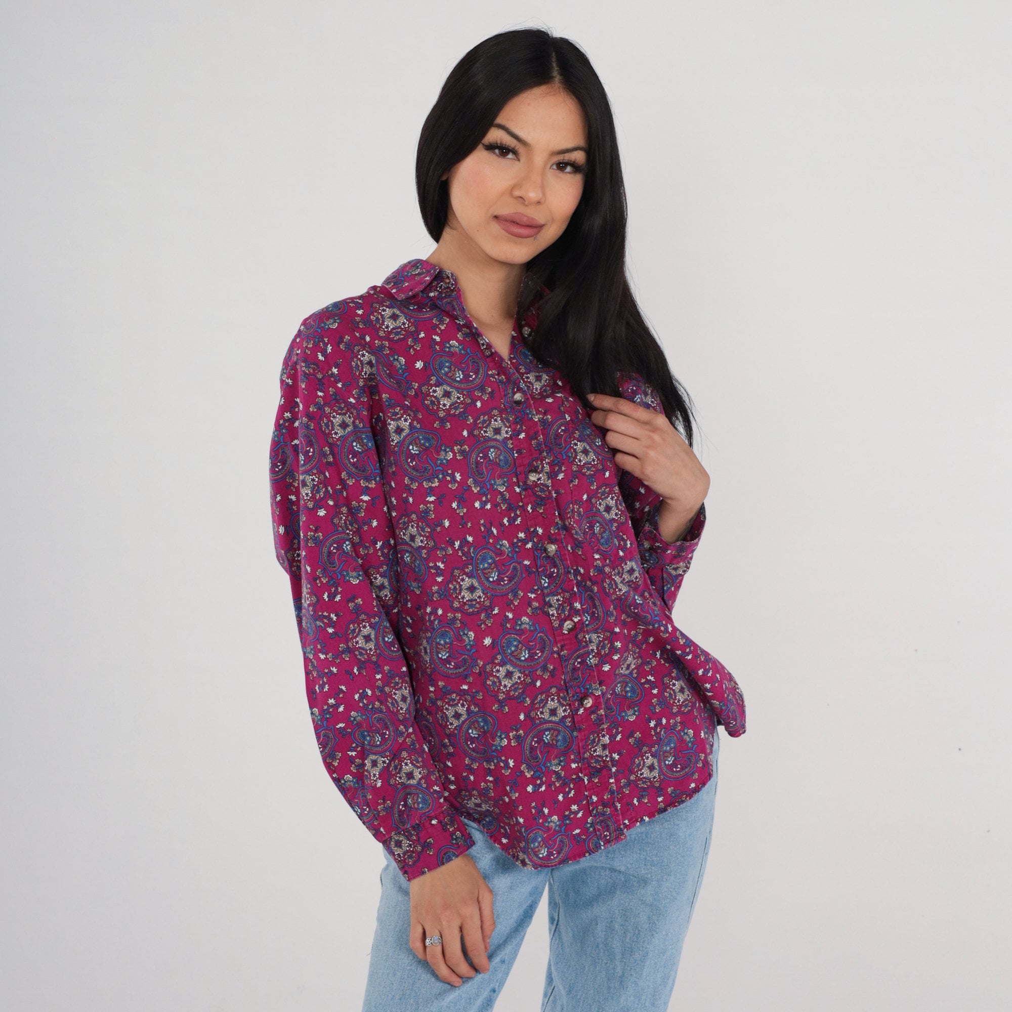 Vintage 90s blouse in a magenta paisley print. Long sleeves, buttons up the front.