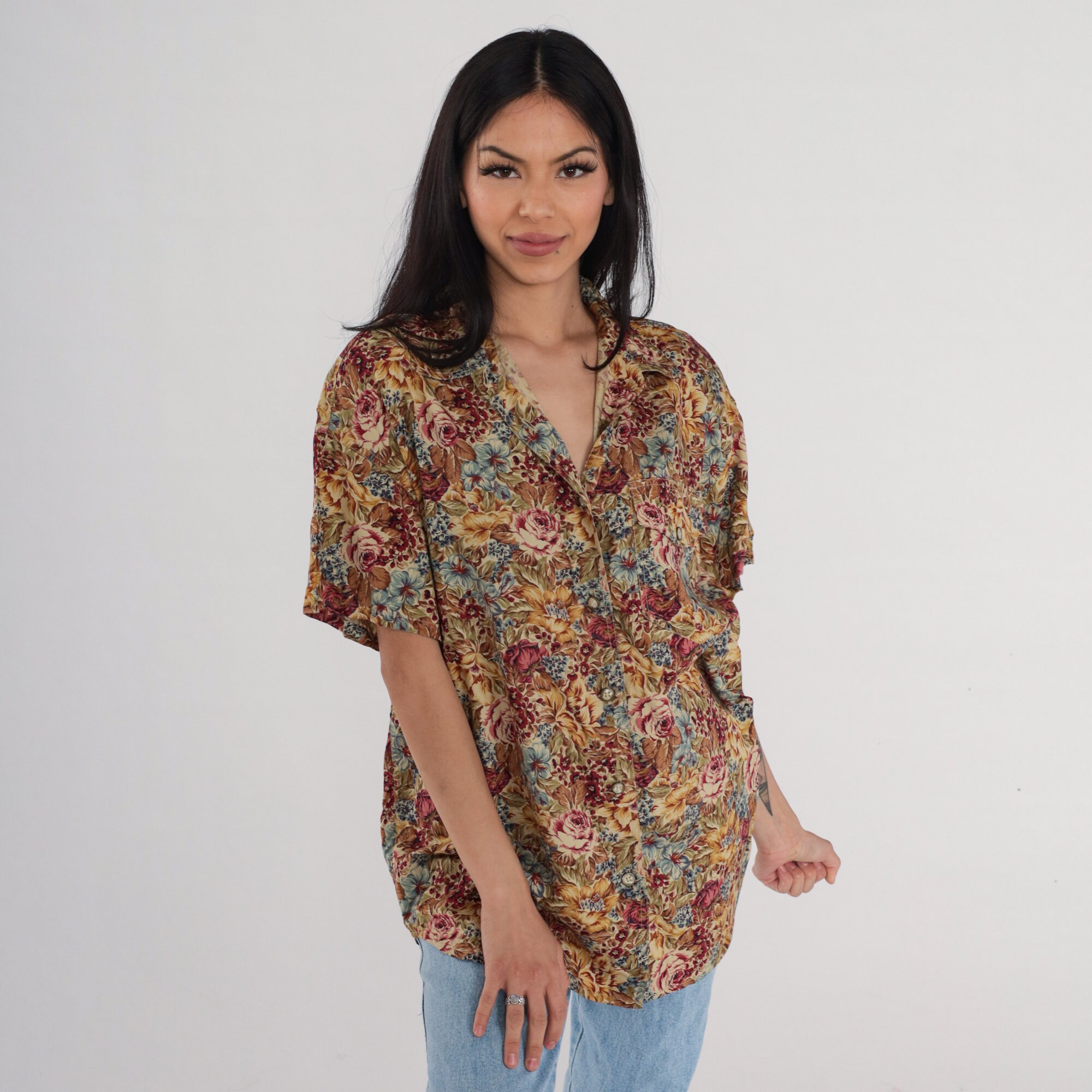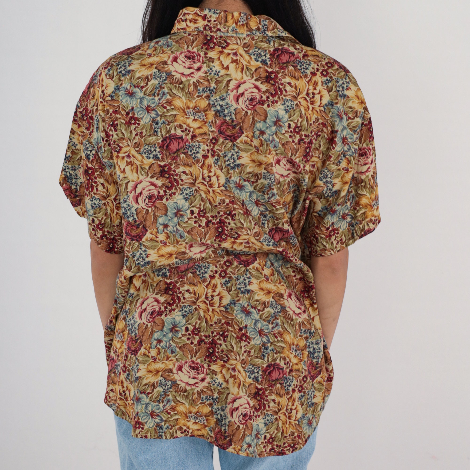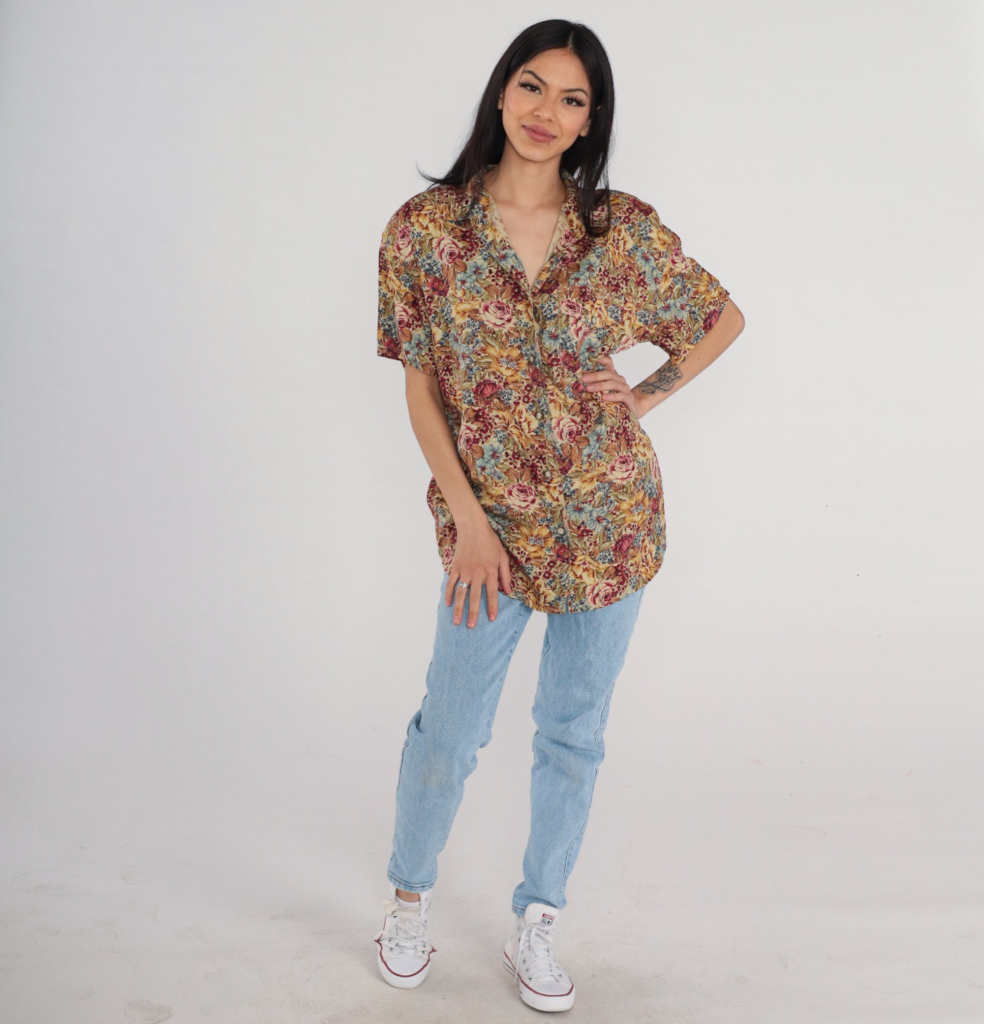 Vintage Y2K blouse in a floral print. It has short sleeves, a collar, and buttons up the front.