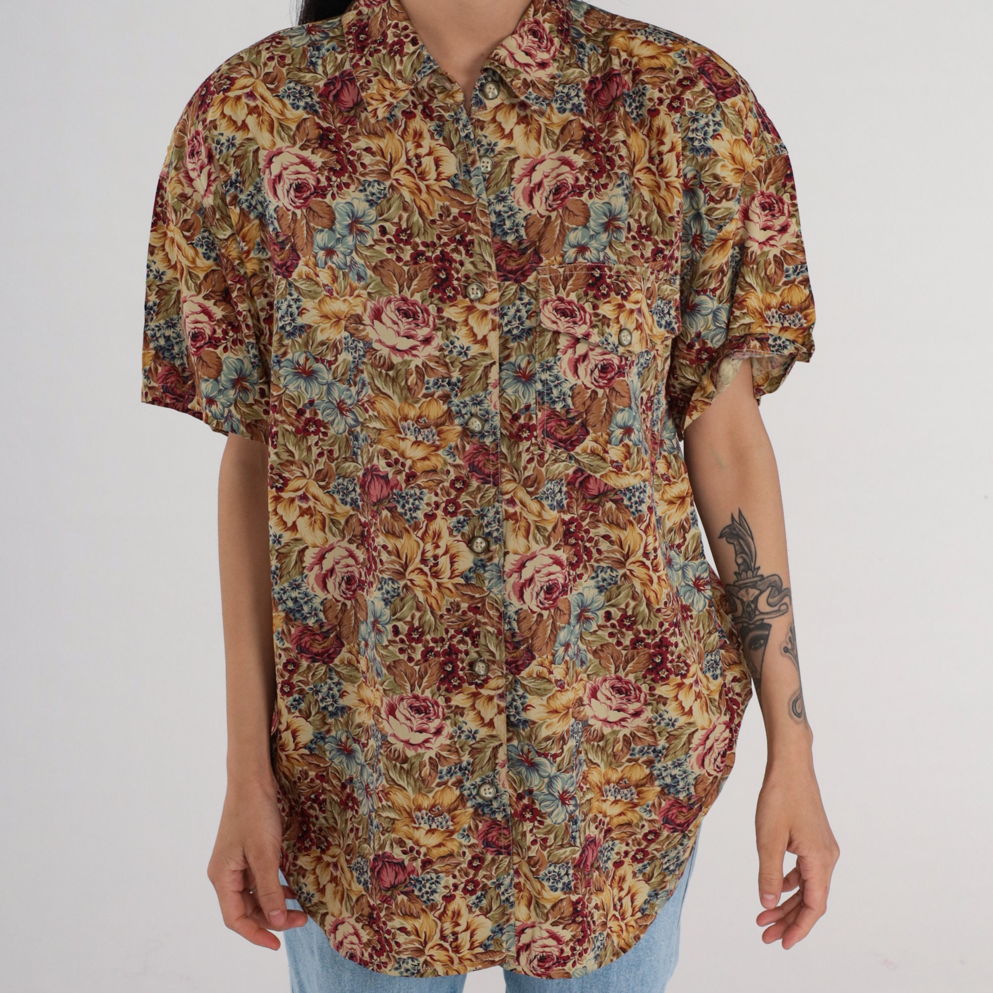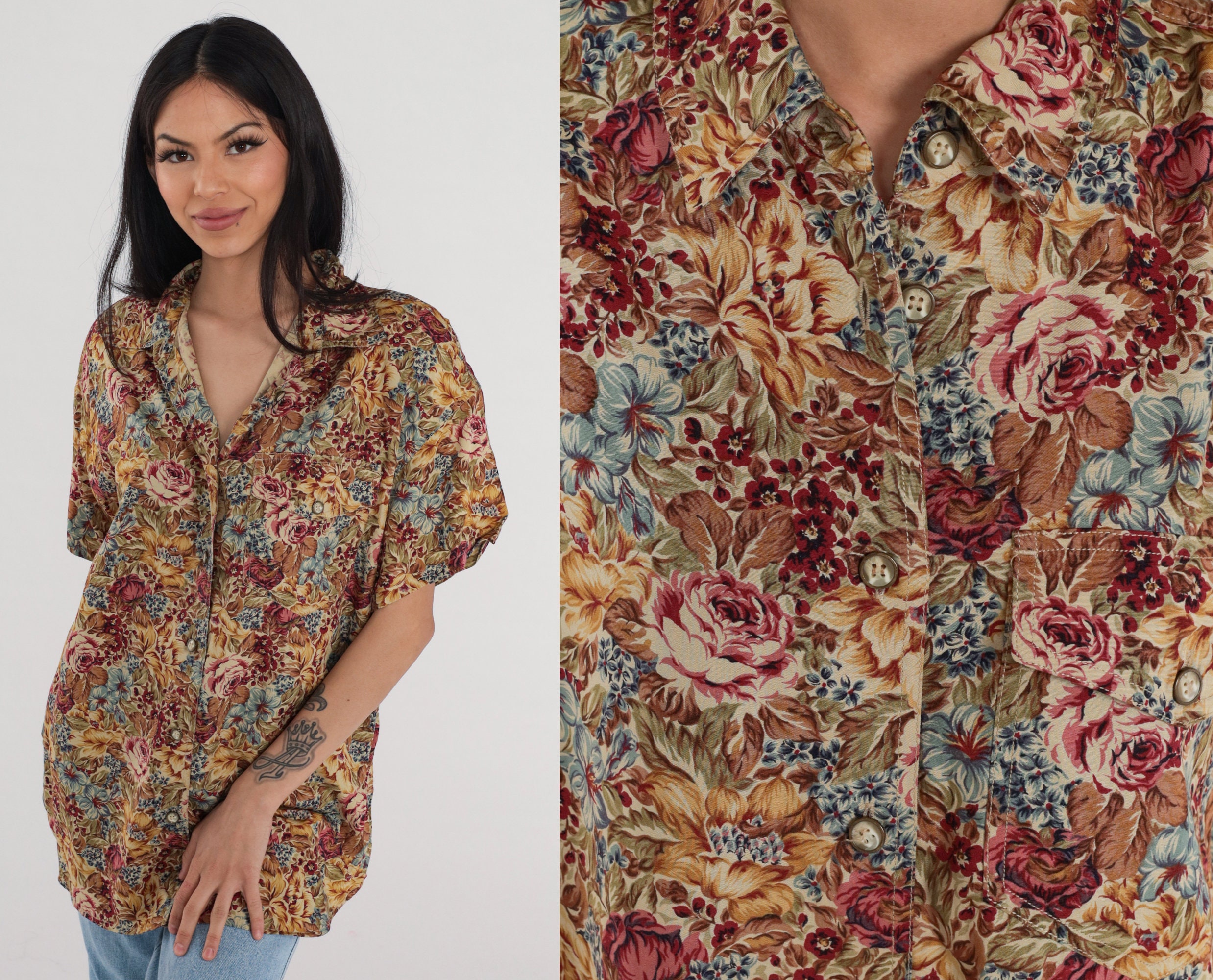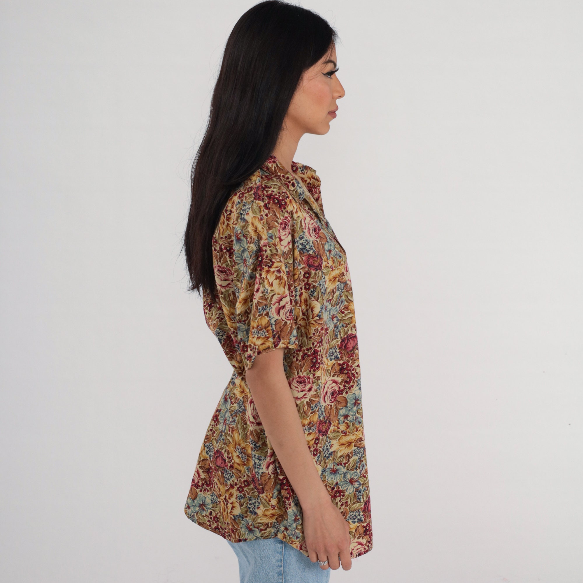 Vintage Y2K blouse in a floral print. It has short sleeves, a collar, and buttons up the front.