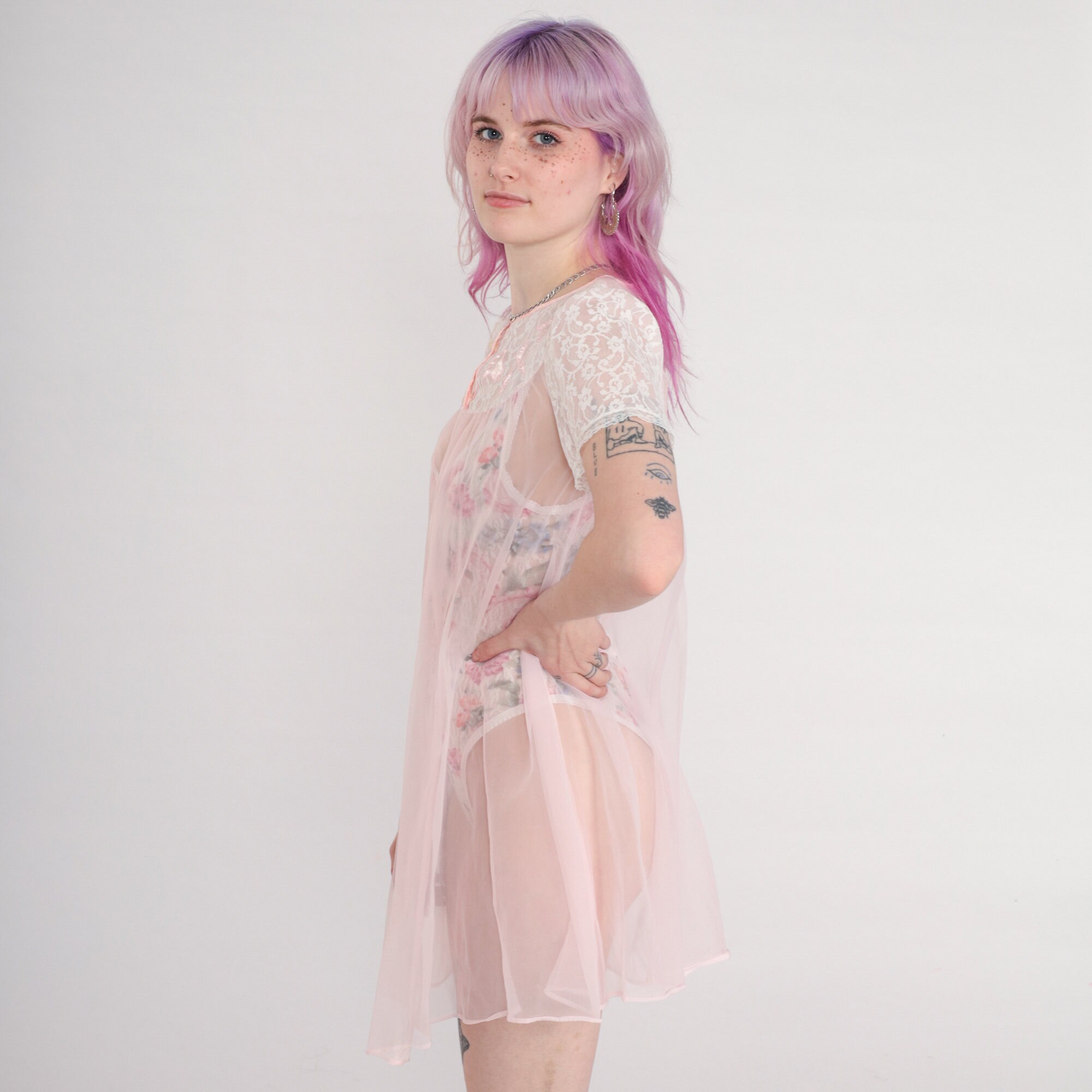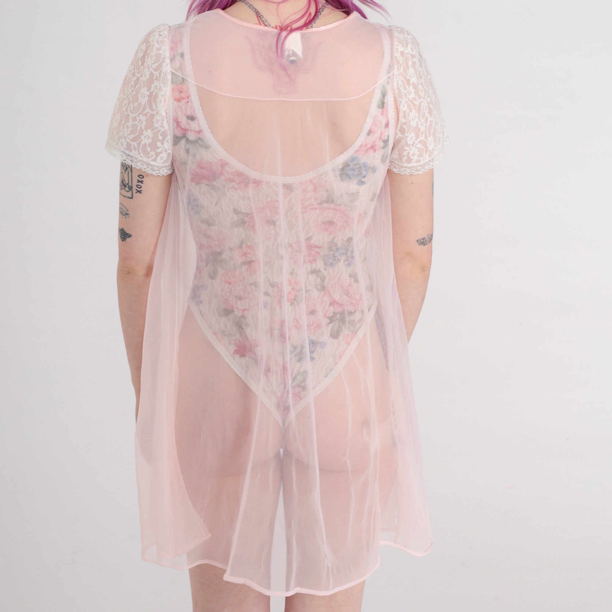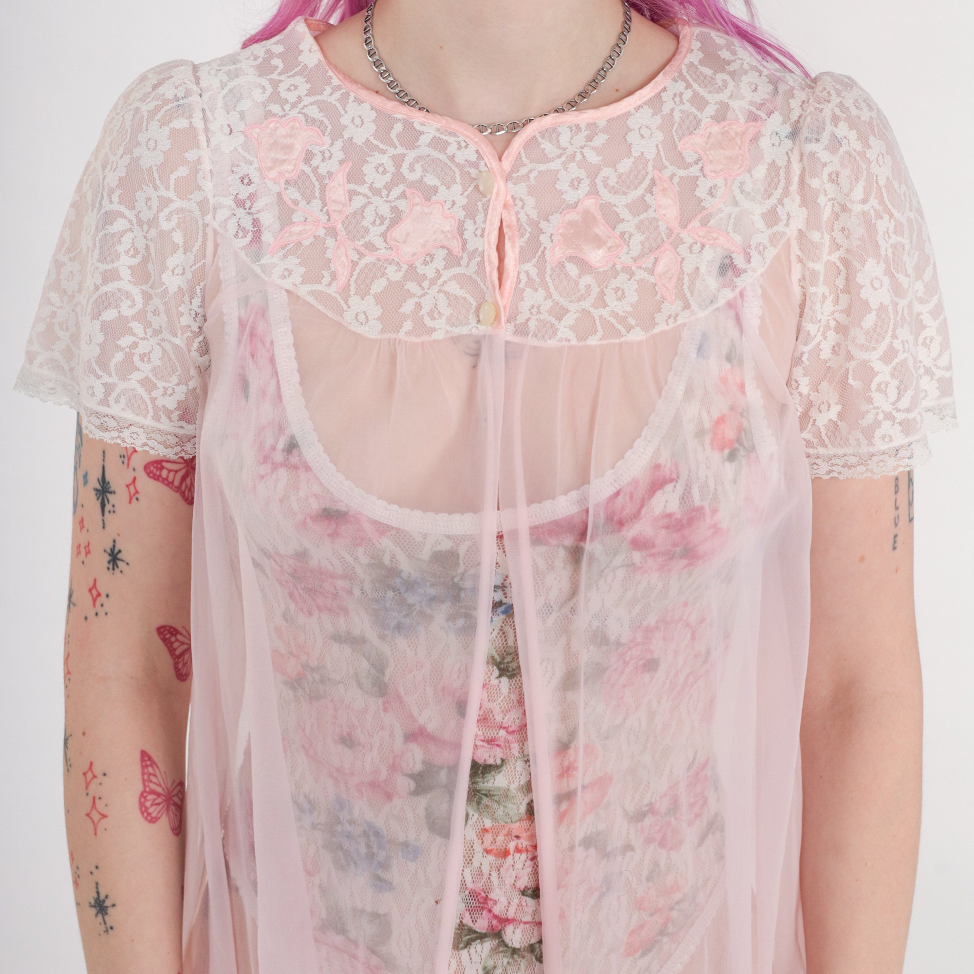 Vintage 70s lingerie robe in sheer baby pink nylon with lace trim and puff sleeves. Buttons at the chest.
