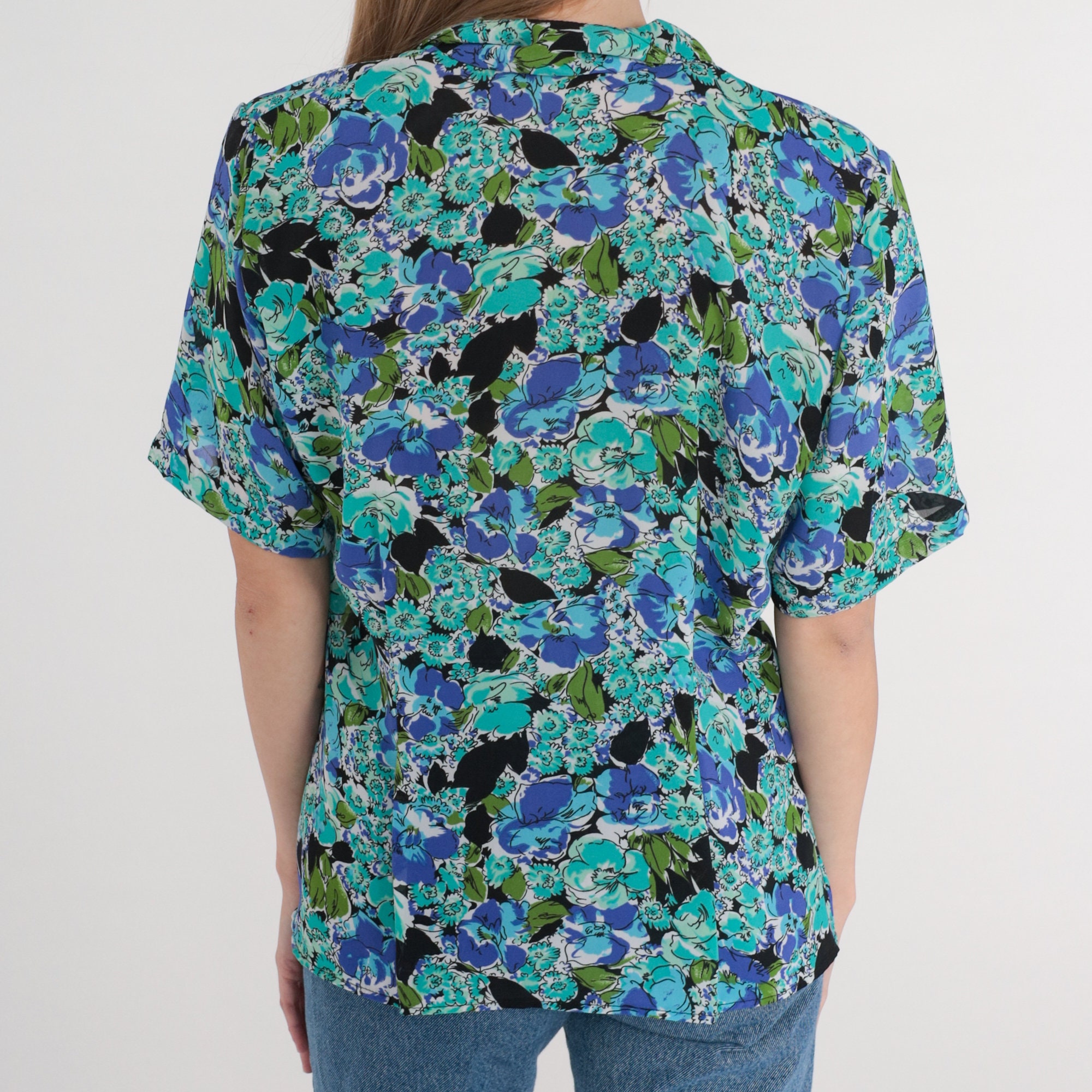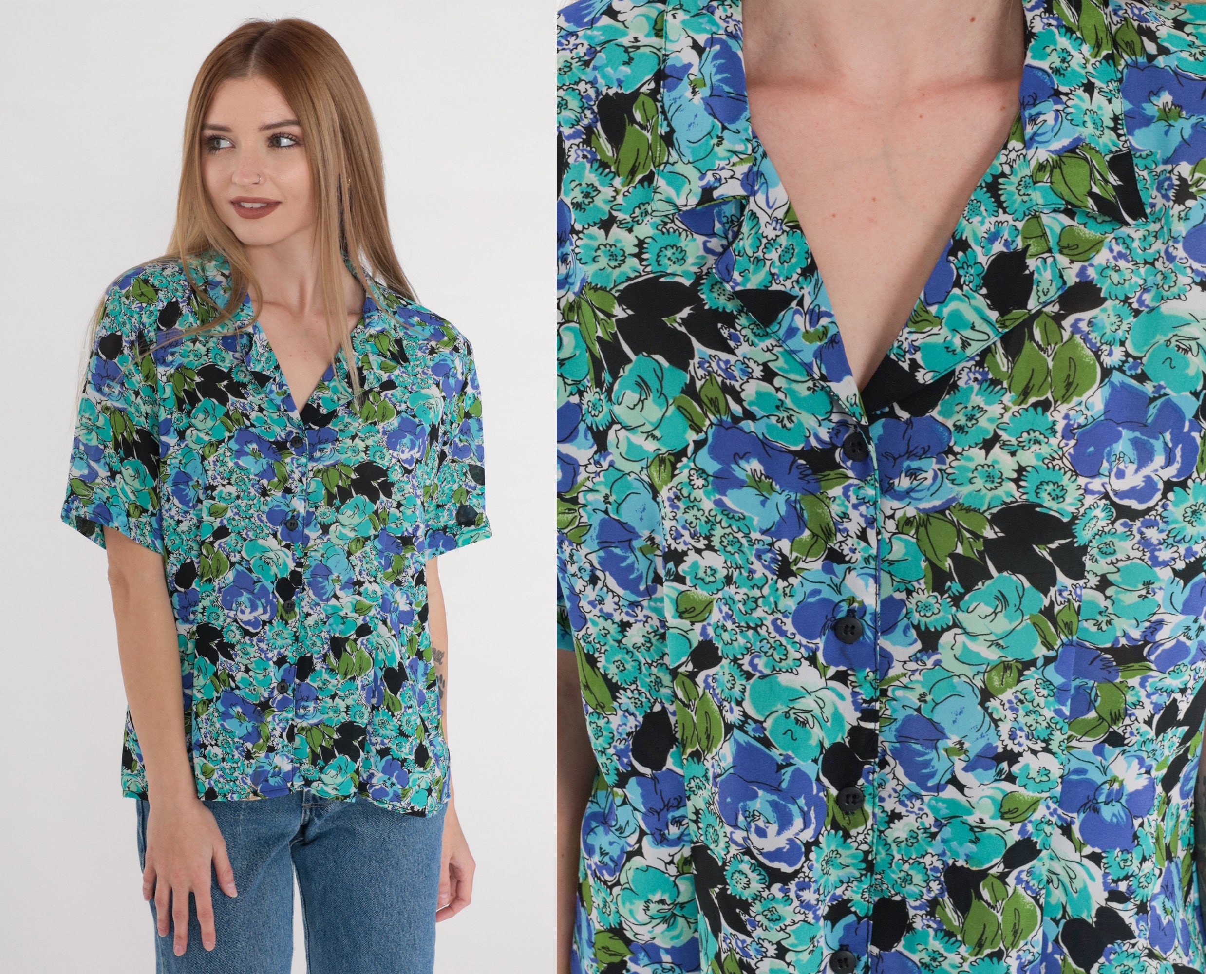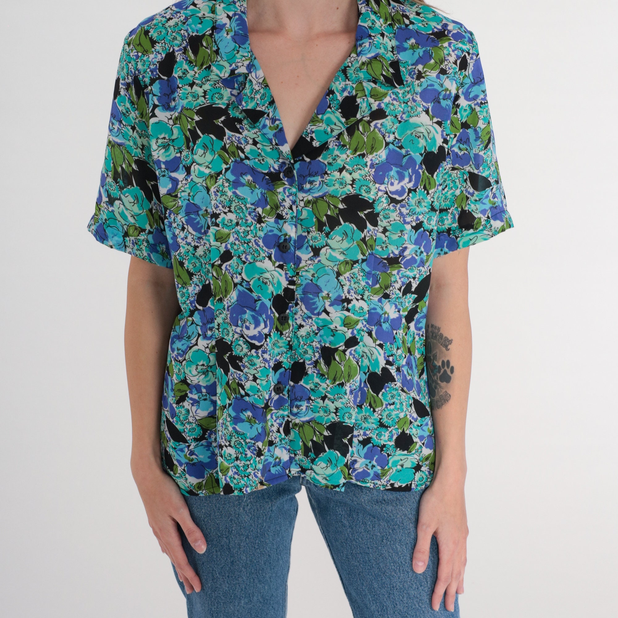 Vintage 90s shirt in a blue, black, and green floral print with short sleeves and buttons up the front.