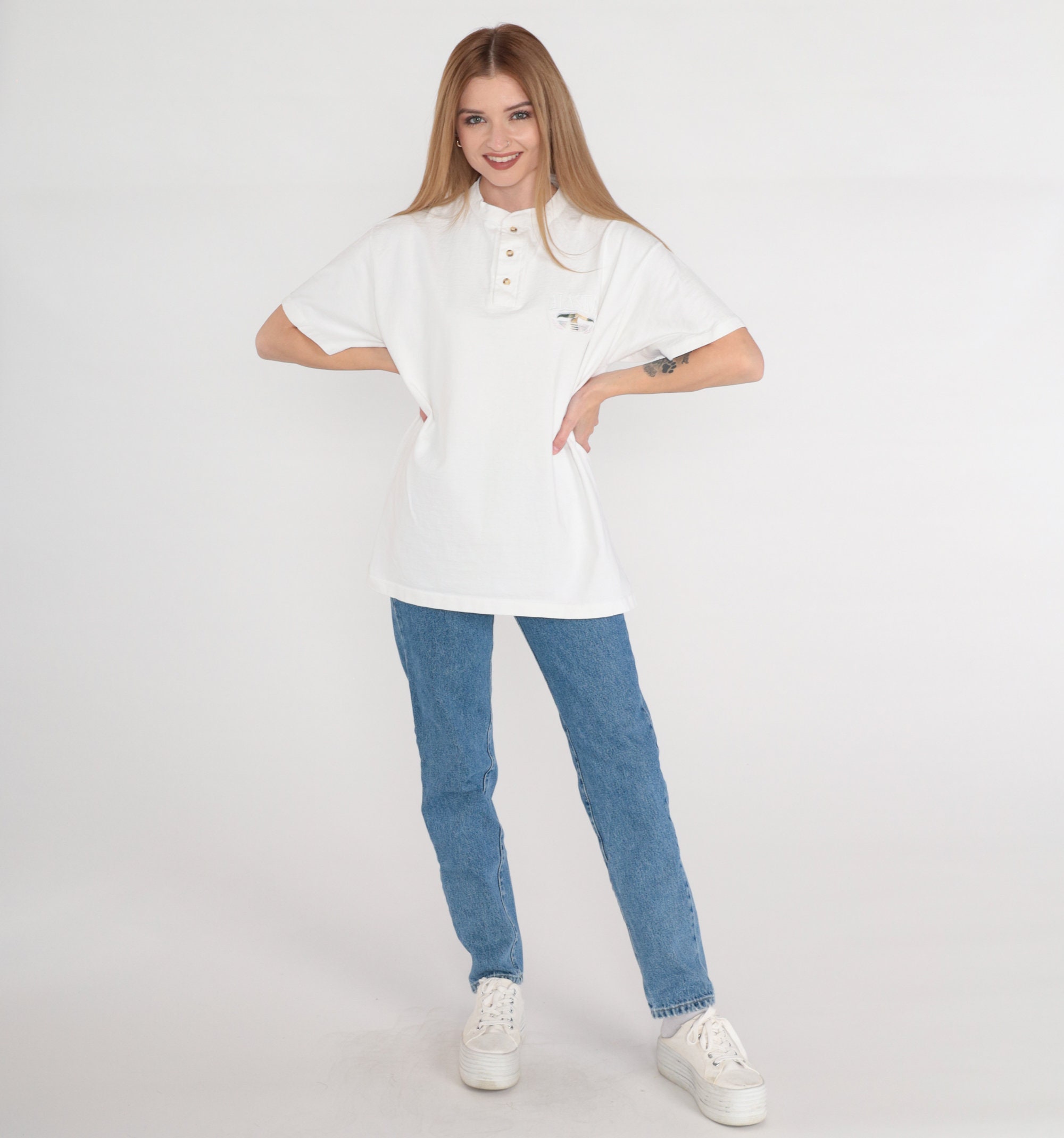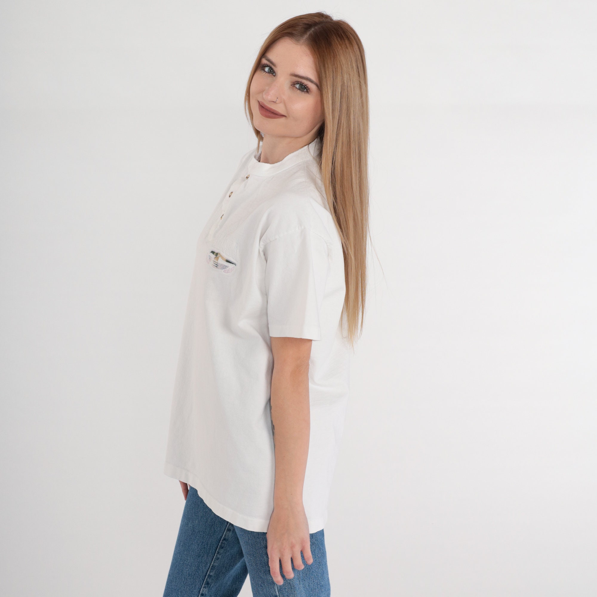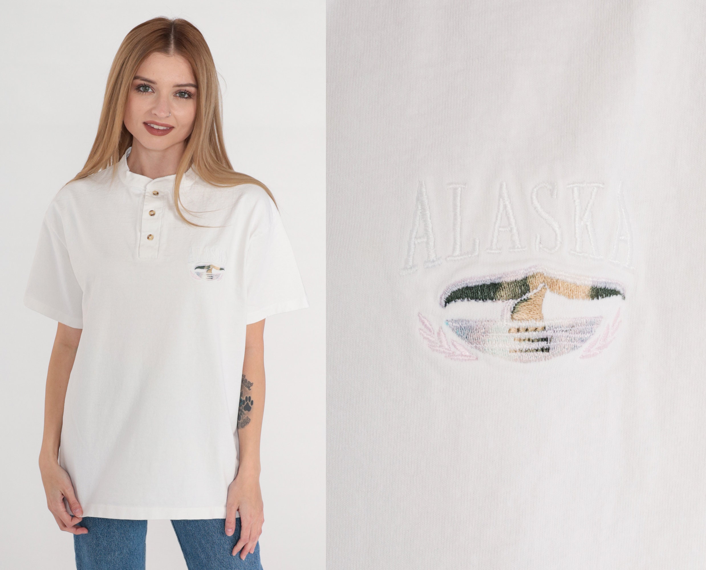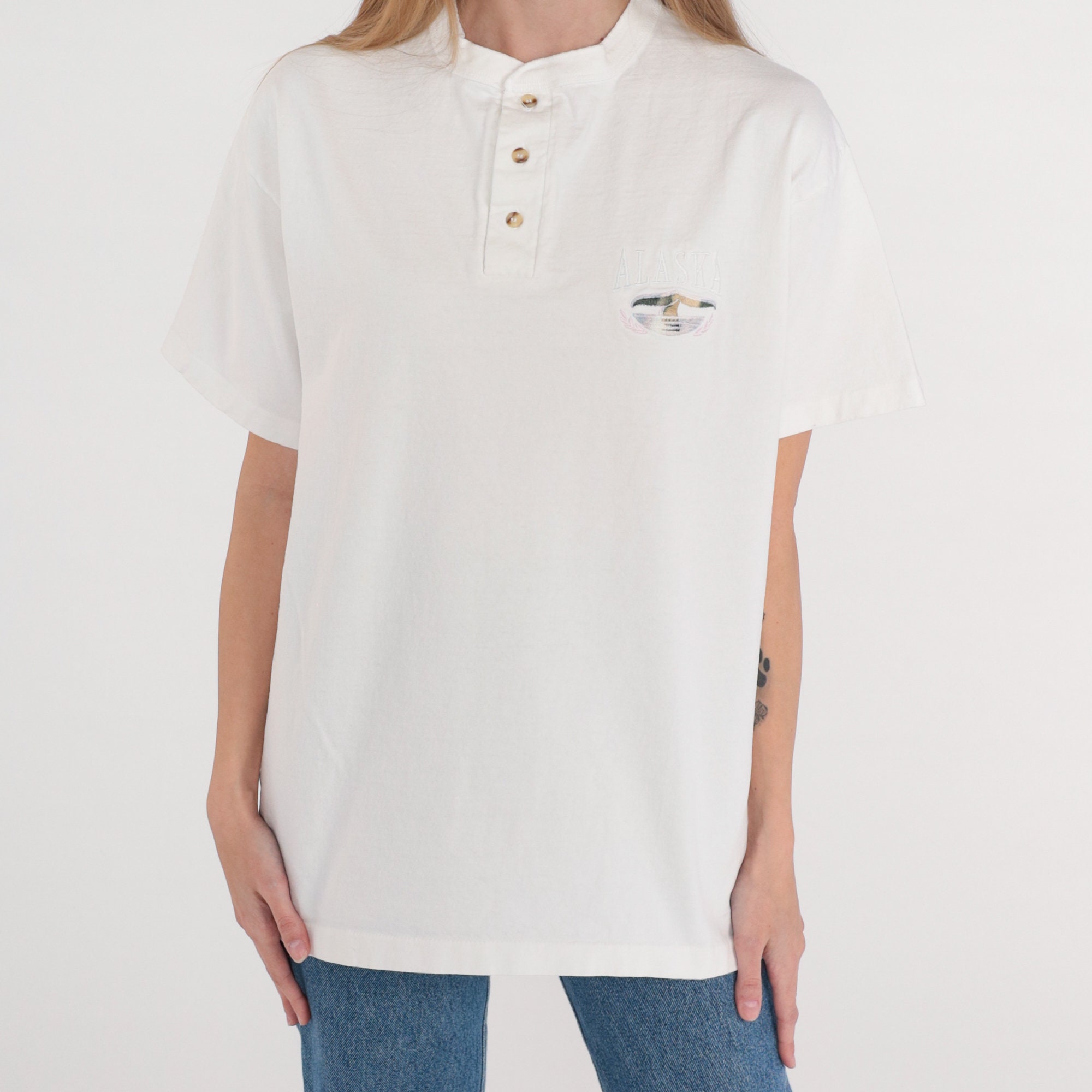 Vintage 90s t shirt in in white with an embroidered whale tale and "Alaska" on the chest. Short sleeves and henley buttons up the chest.
