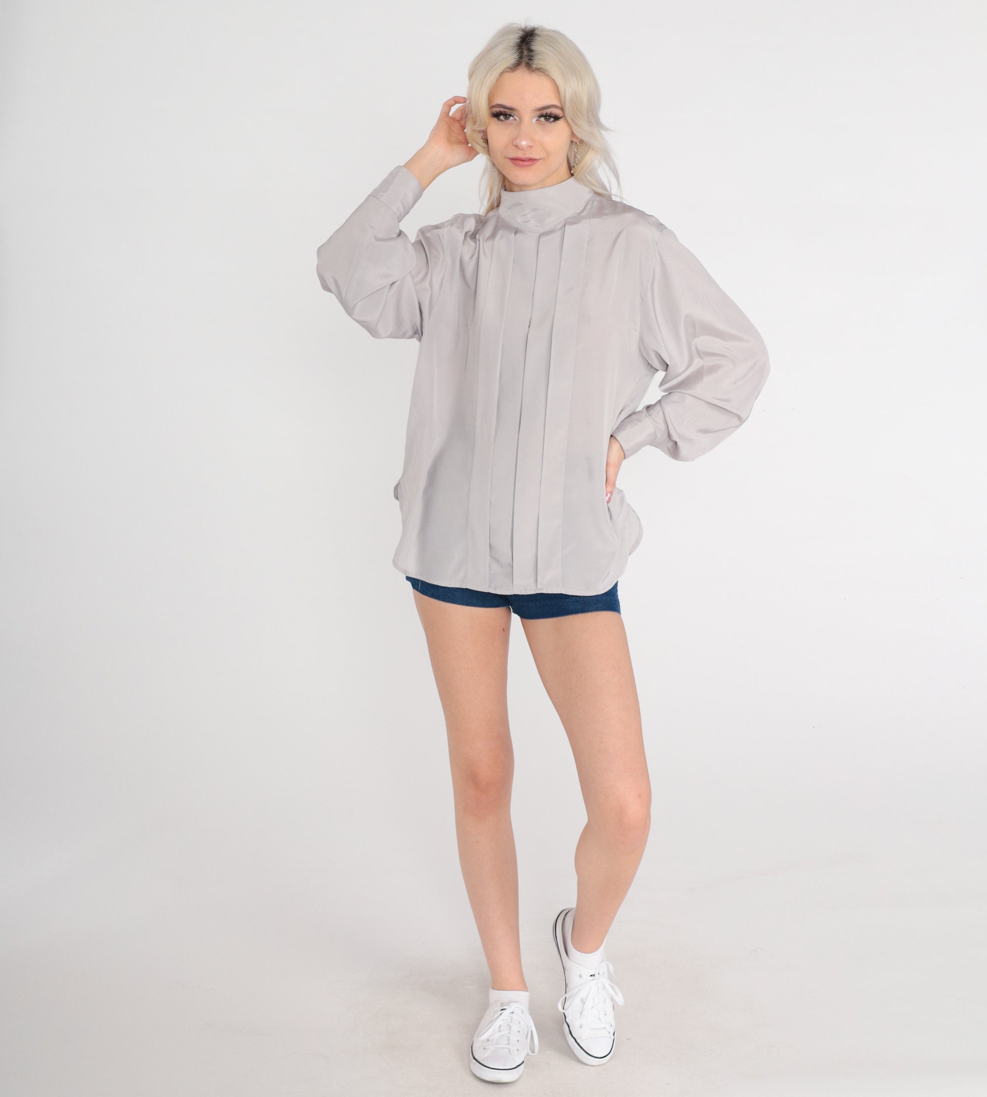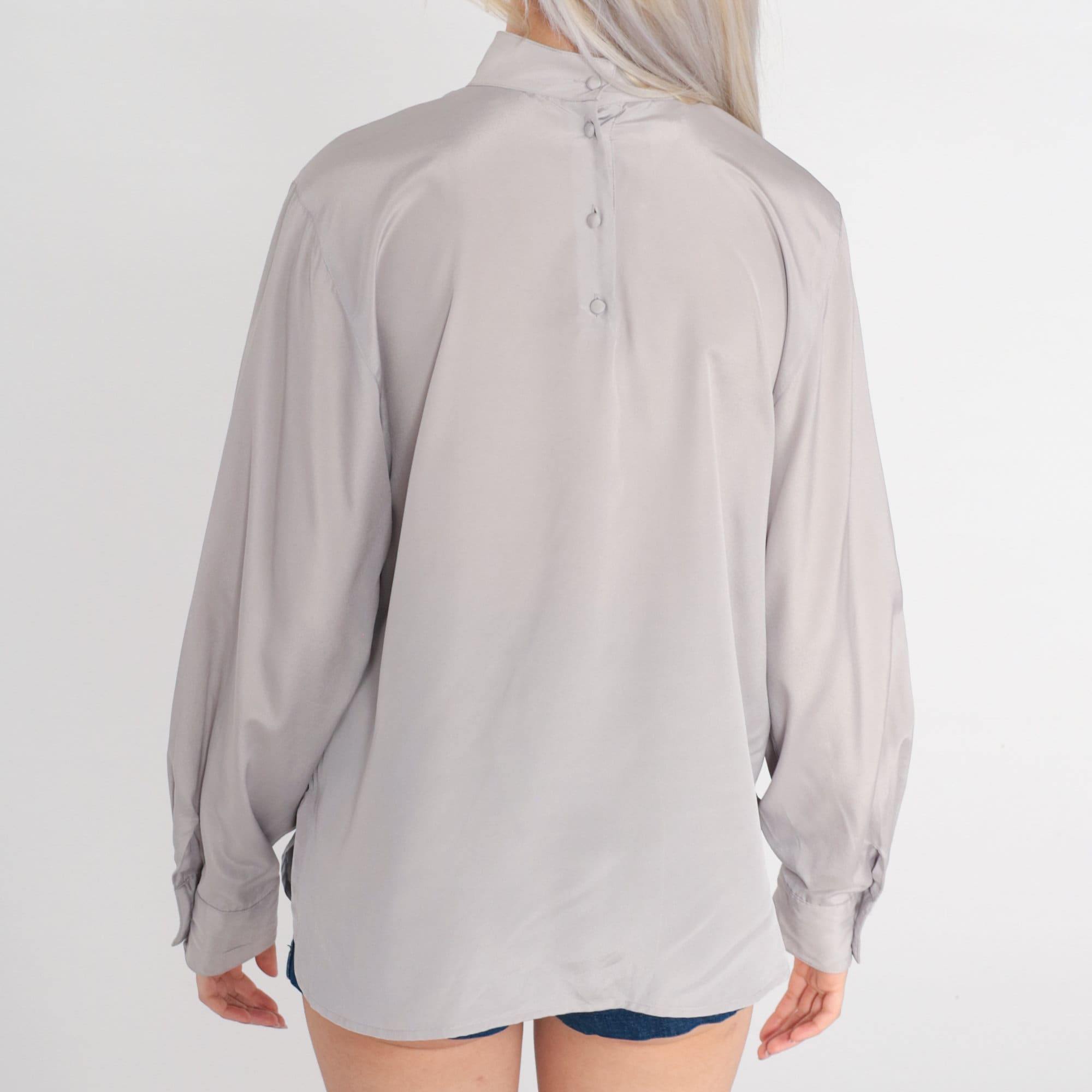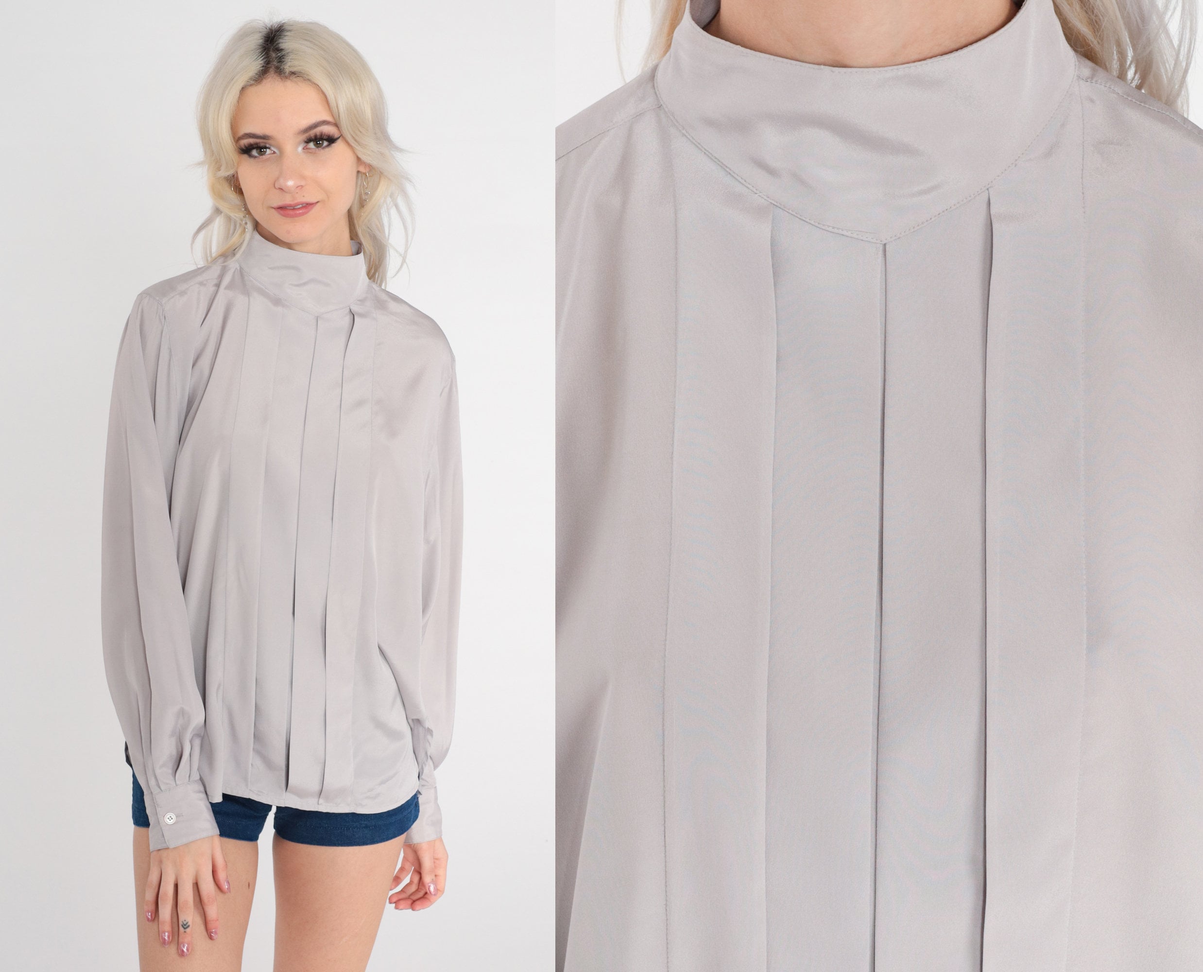 Vintage 80s shirt in grey with a mock neck, pleats down the front, and buttons at the upper back.
