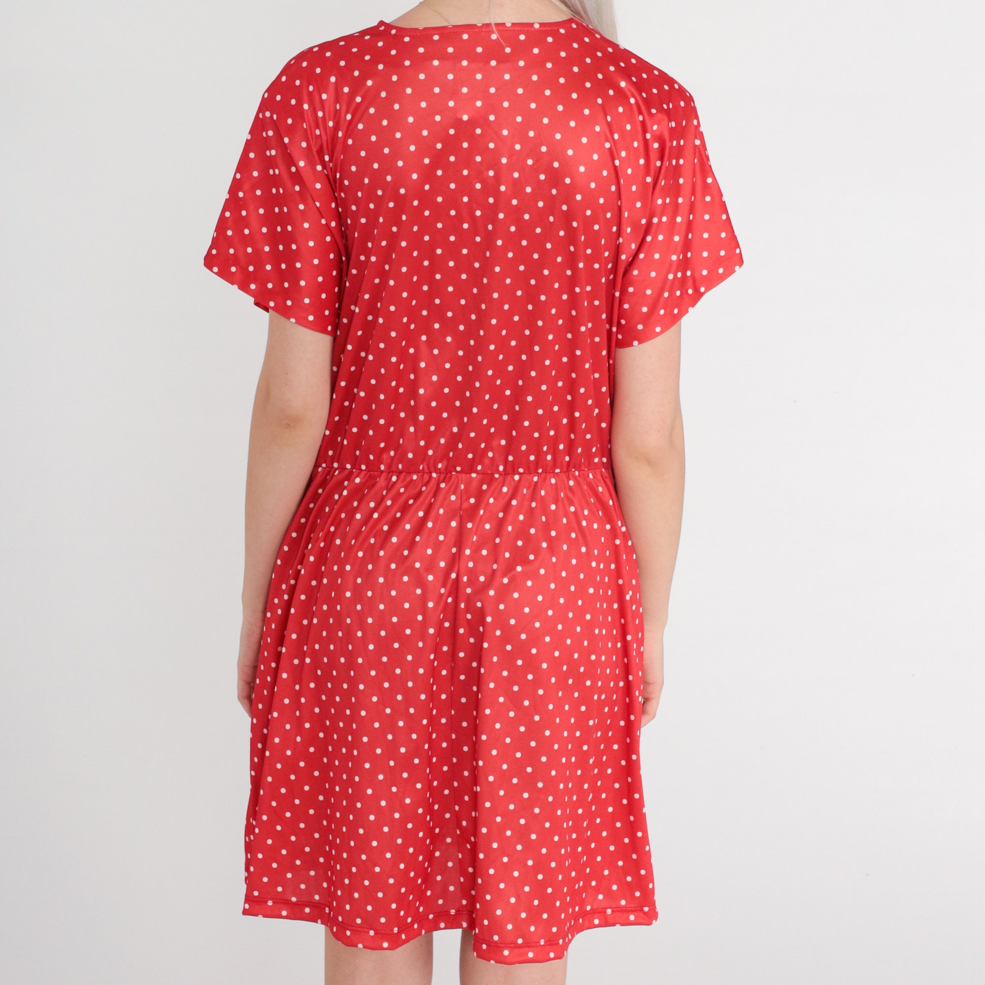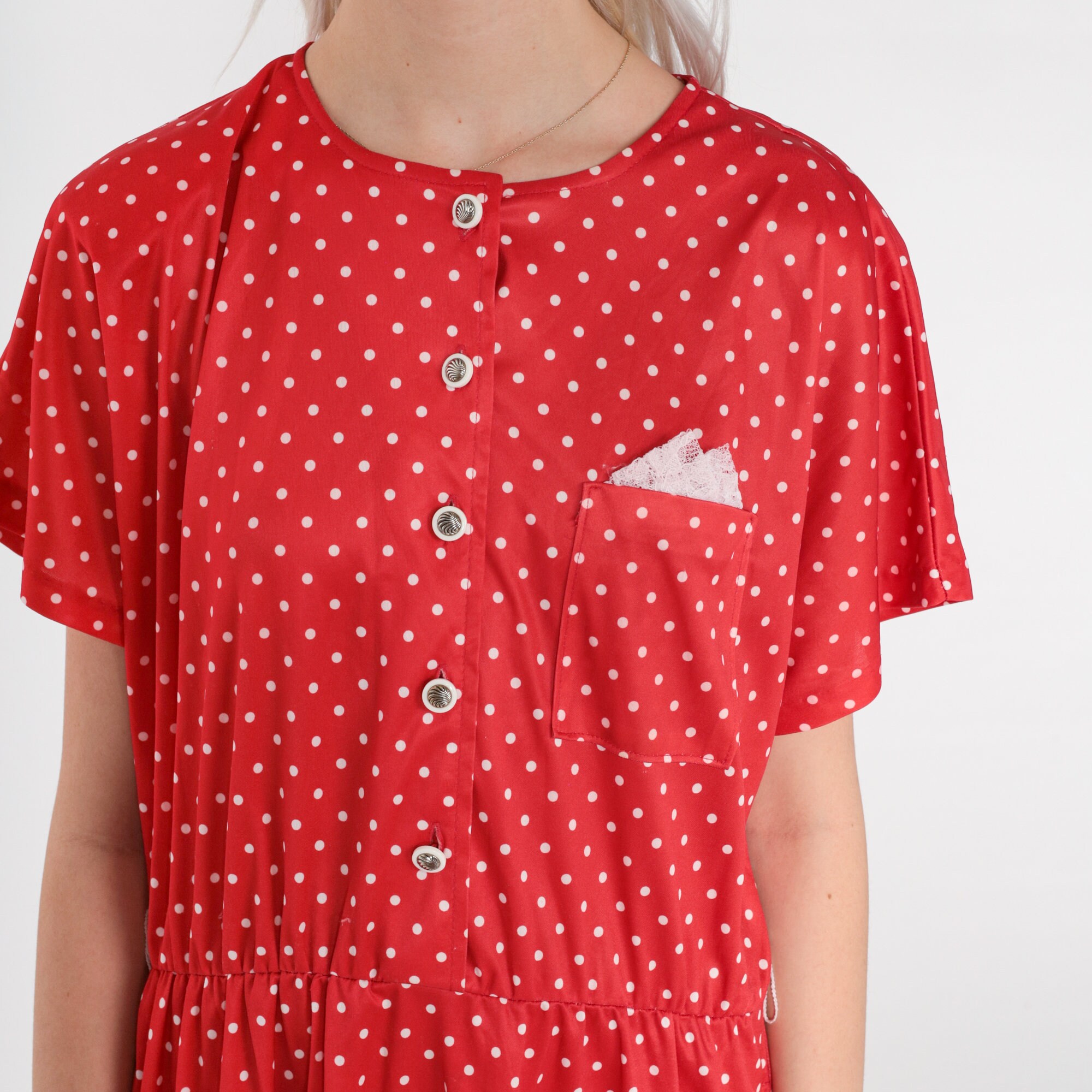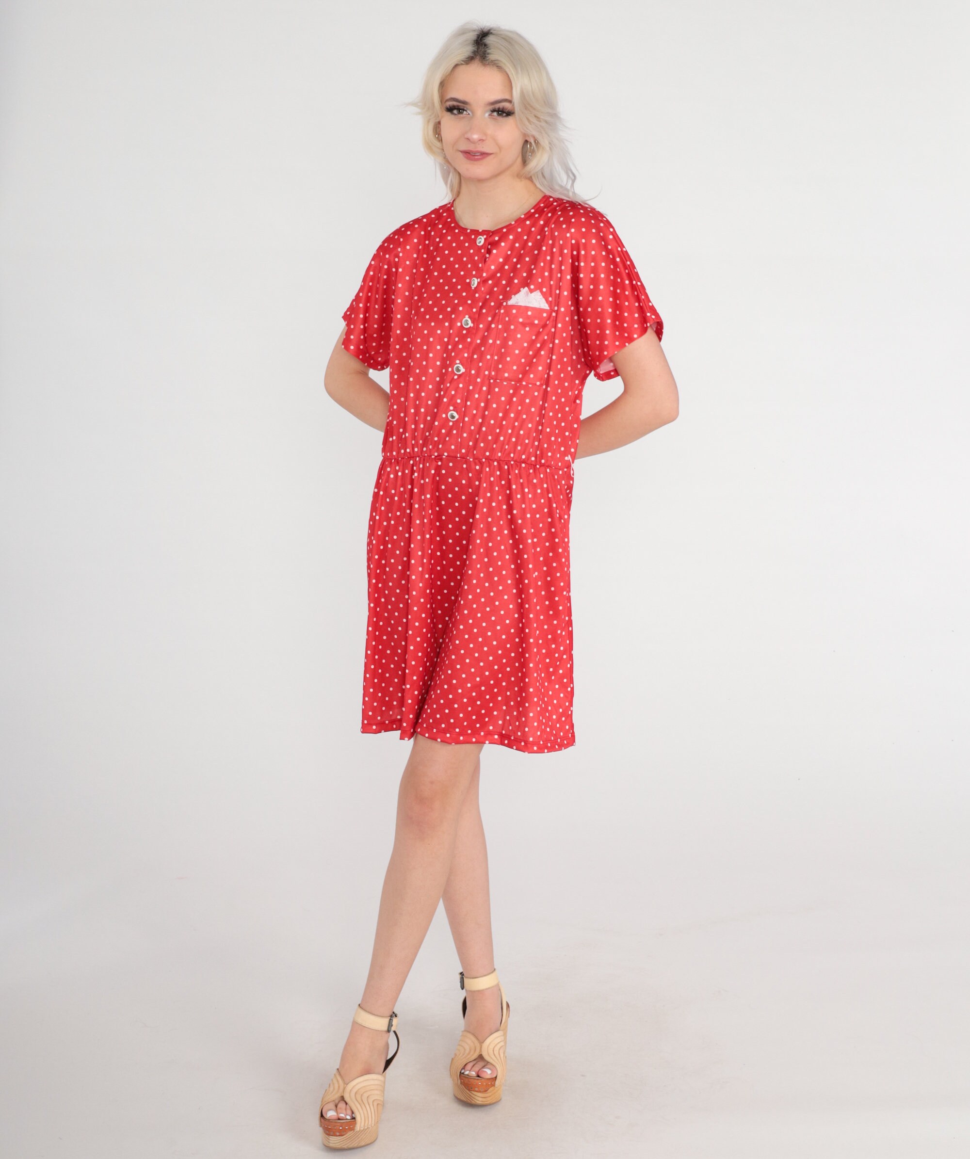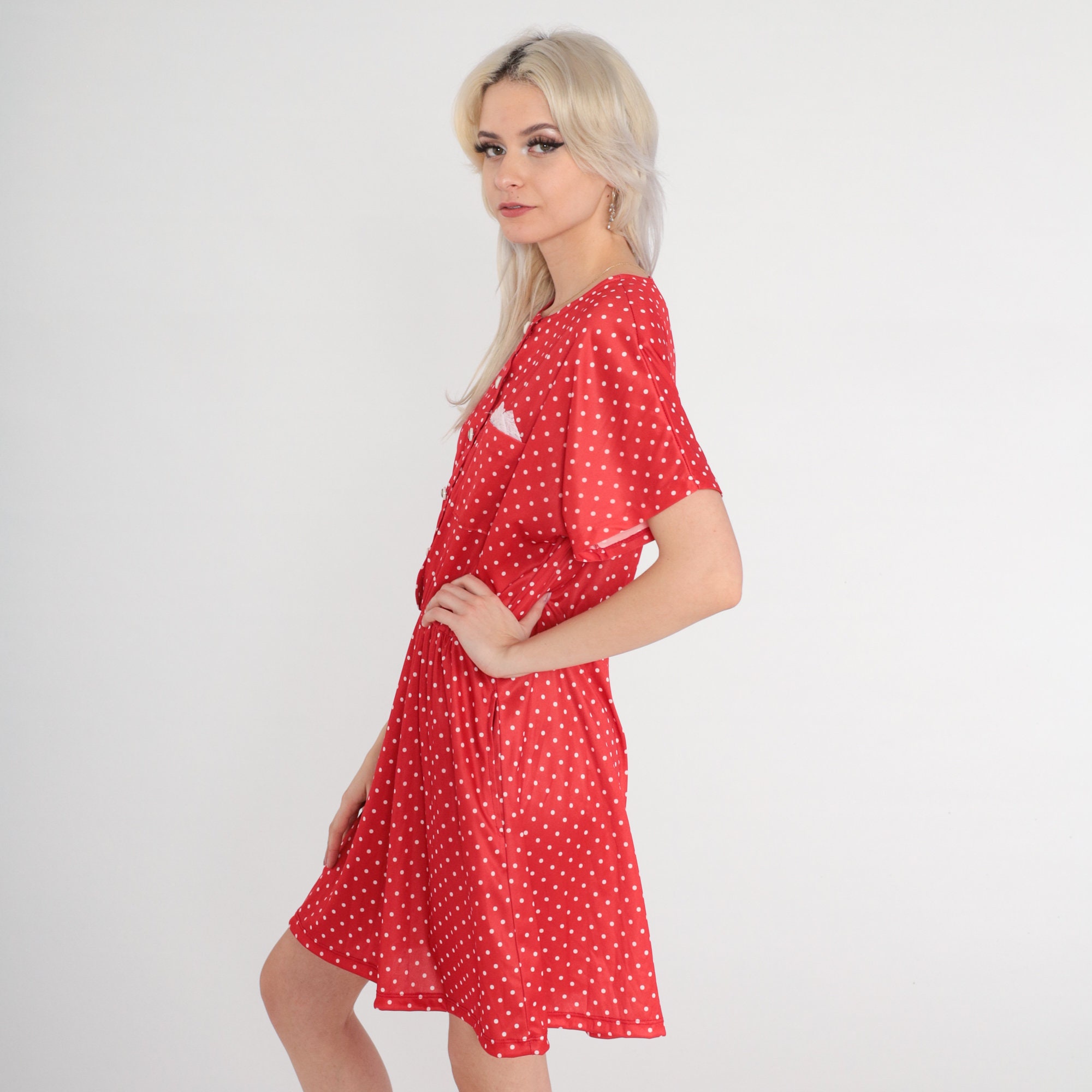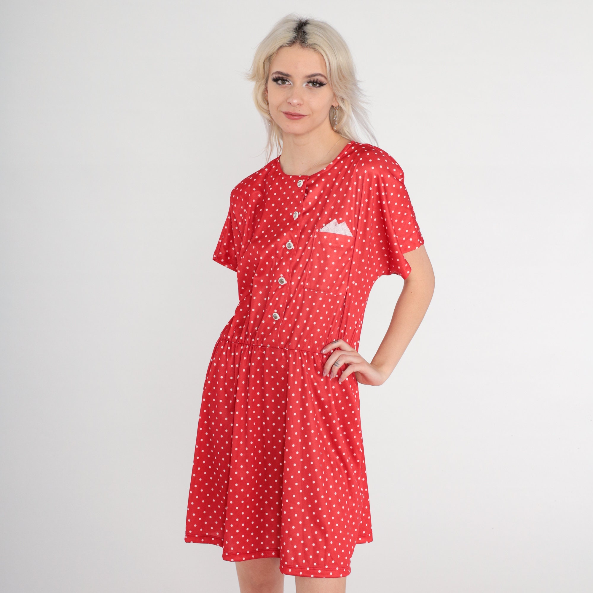 Vintage 80s dress with a red polka dot print. Buttons up the front with a high elastic waist.