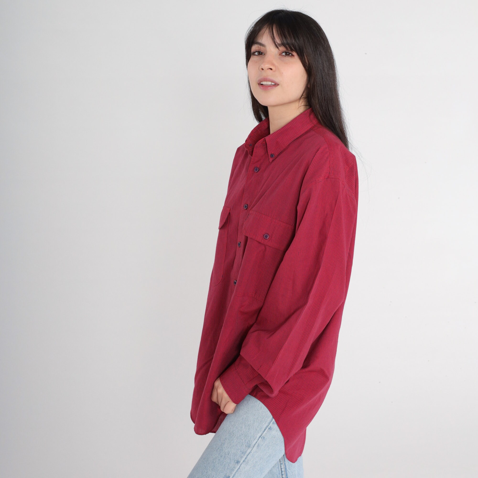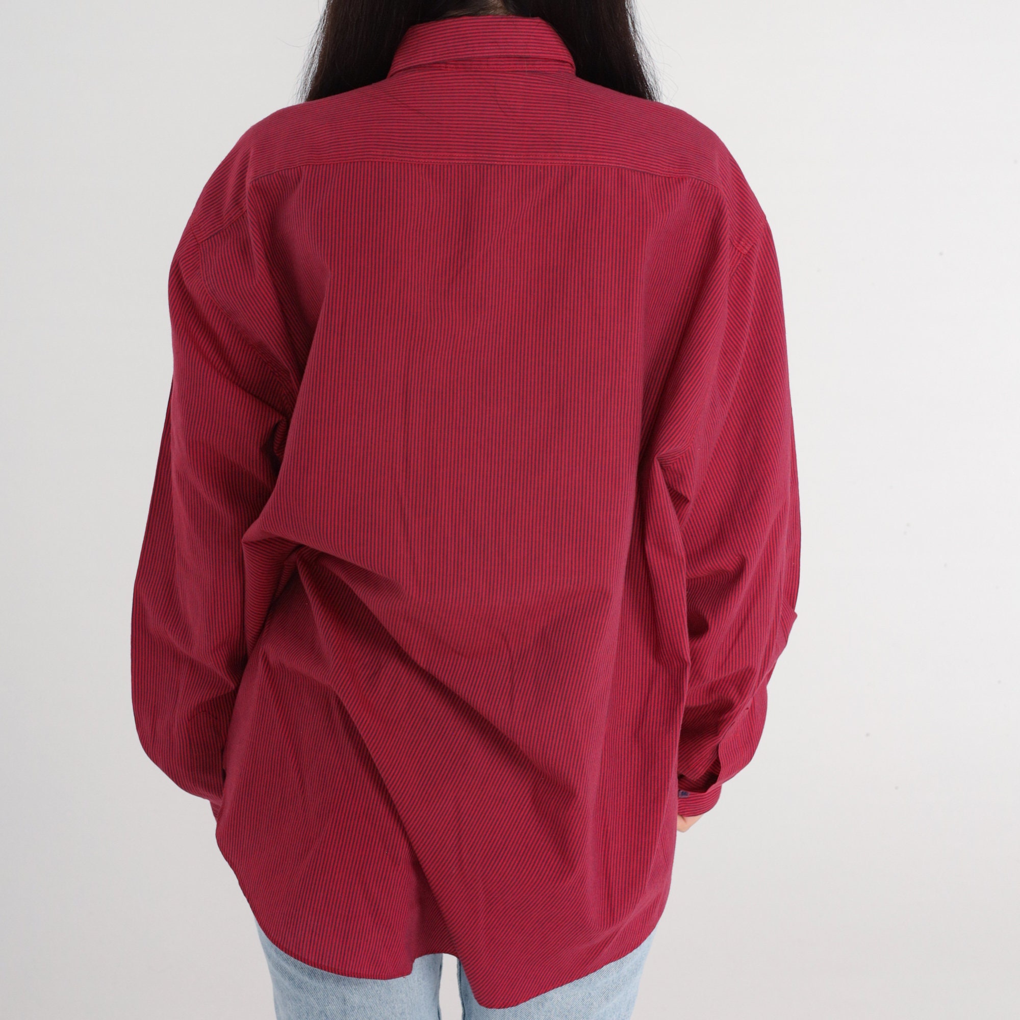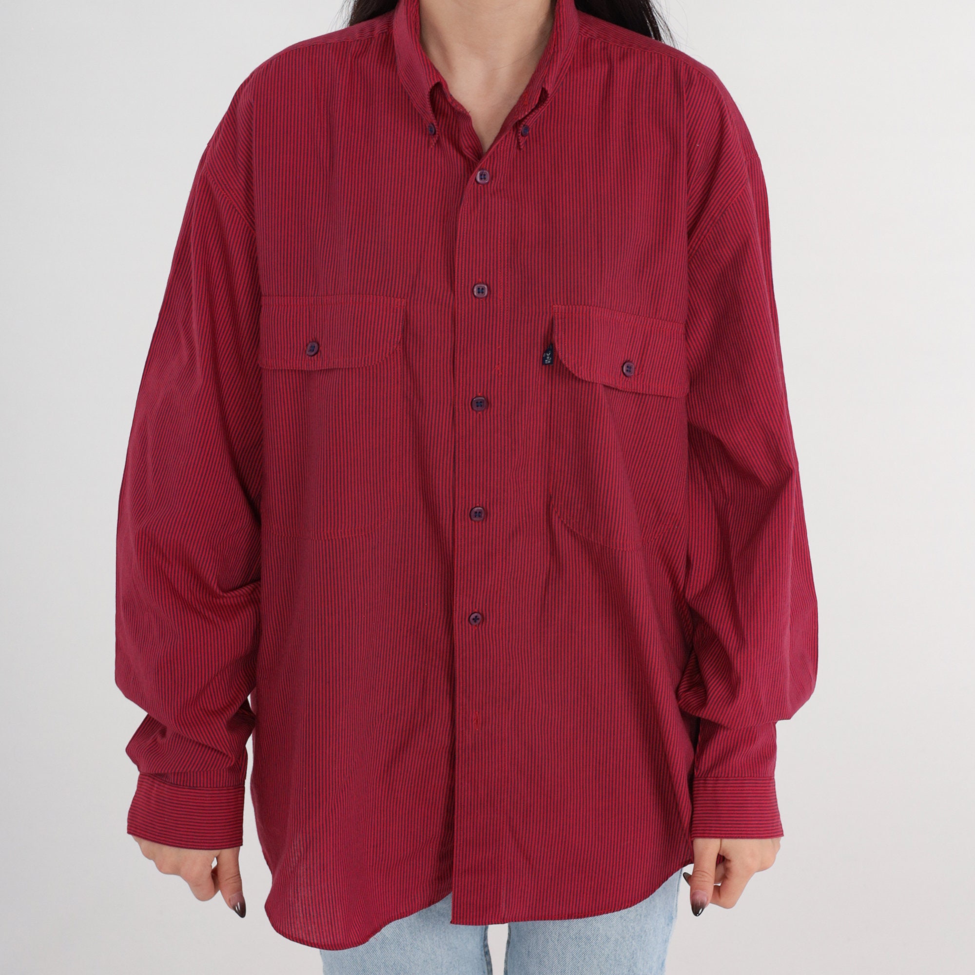 Vintage 80s Levis shirt in red with navy railroad stripes. Buttons down the front with chest pockets and long sleeves. Unisex.