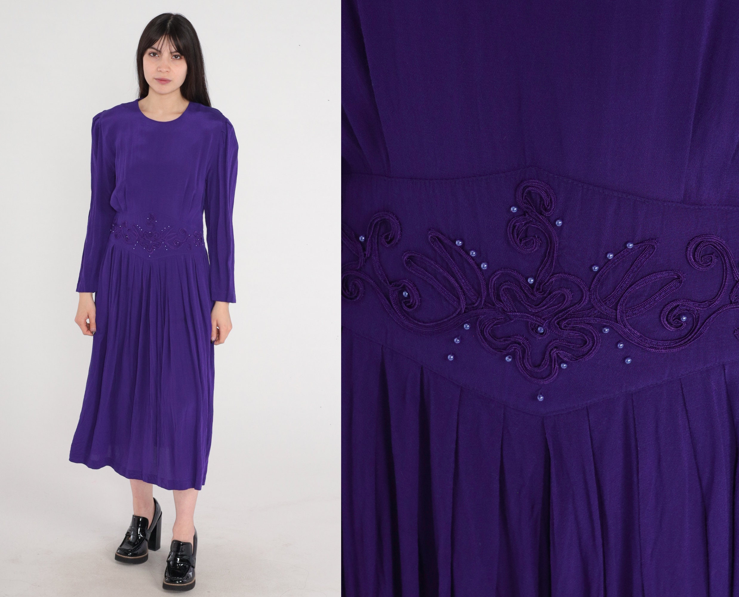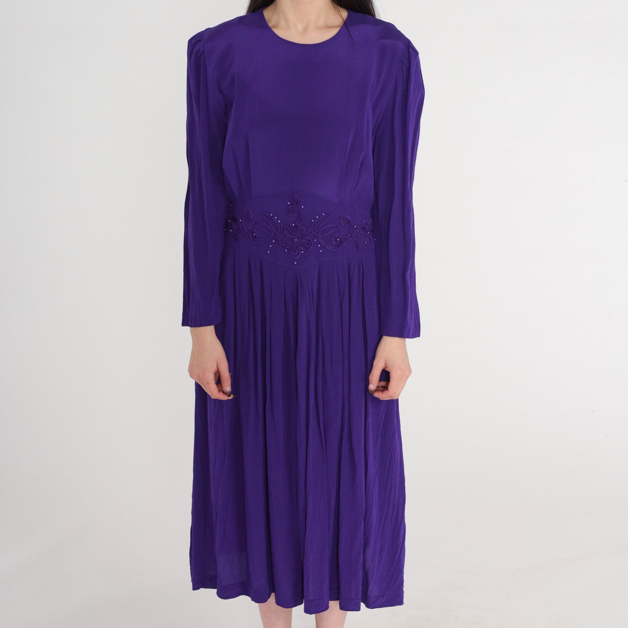 Vintage 80s dress in royal purple with a beaded floral waistline. Long puff sleeves and a pleated skirt. Midi length with a rear zipper and pockets.