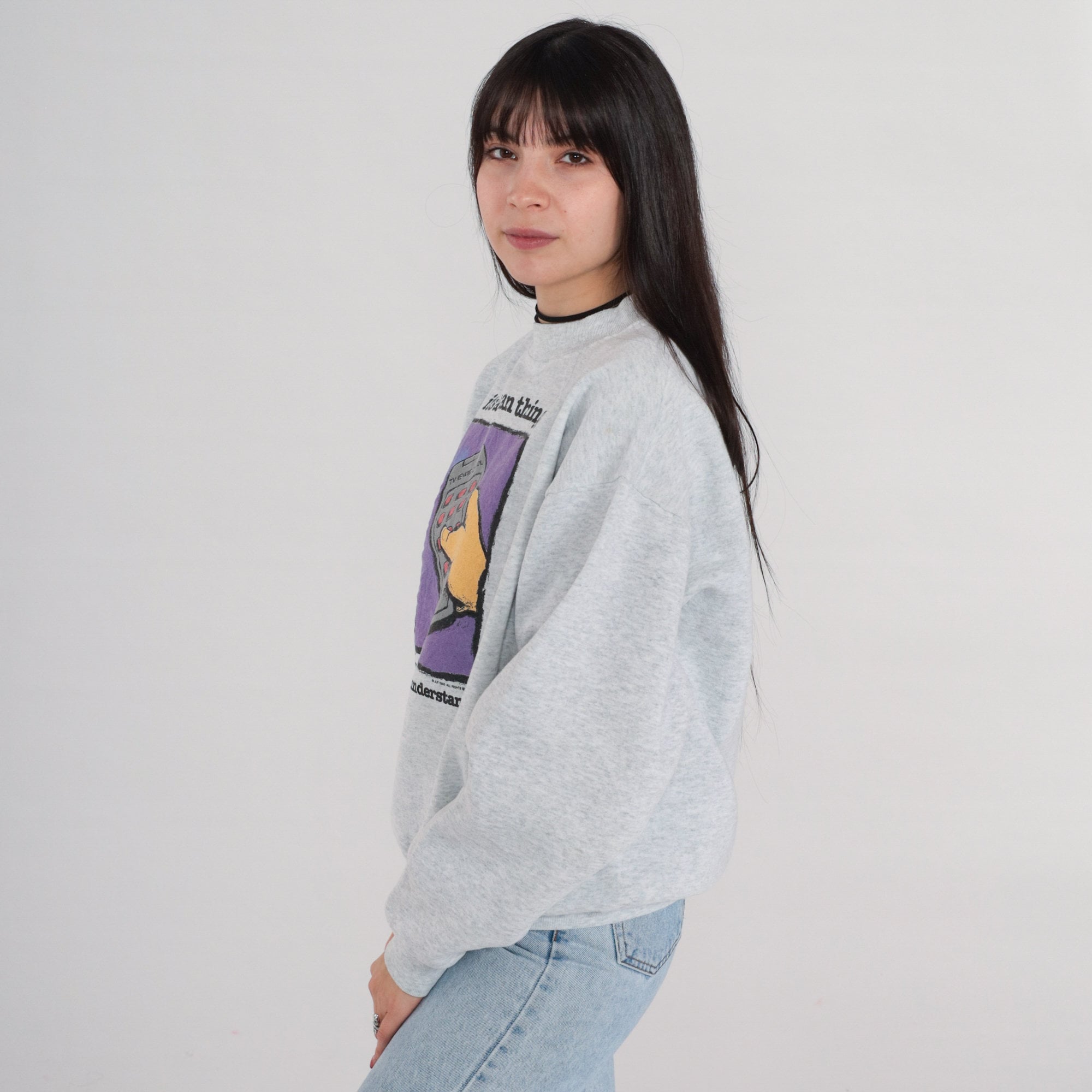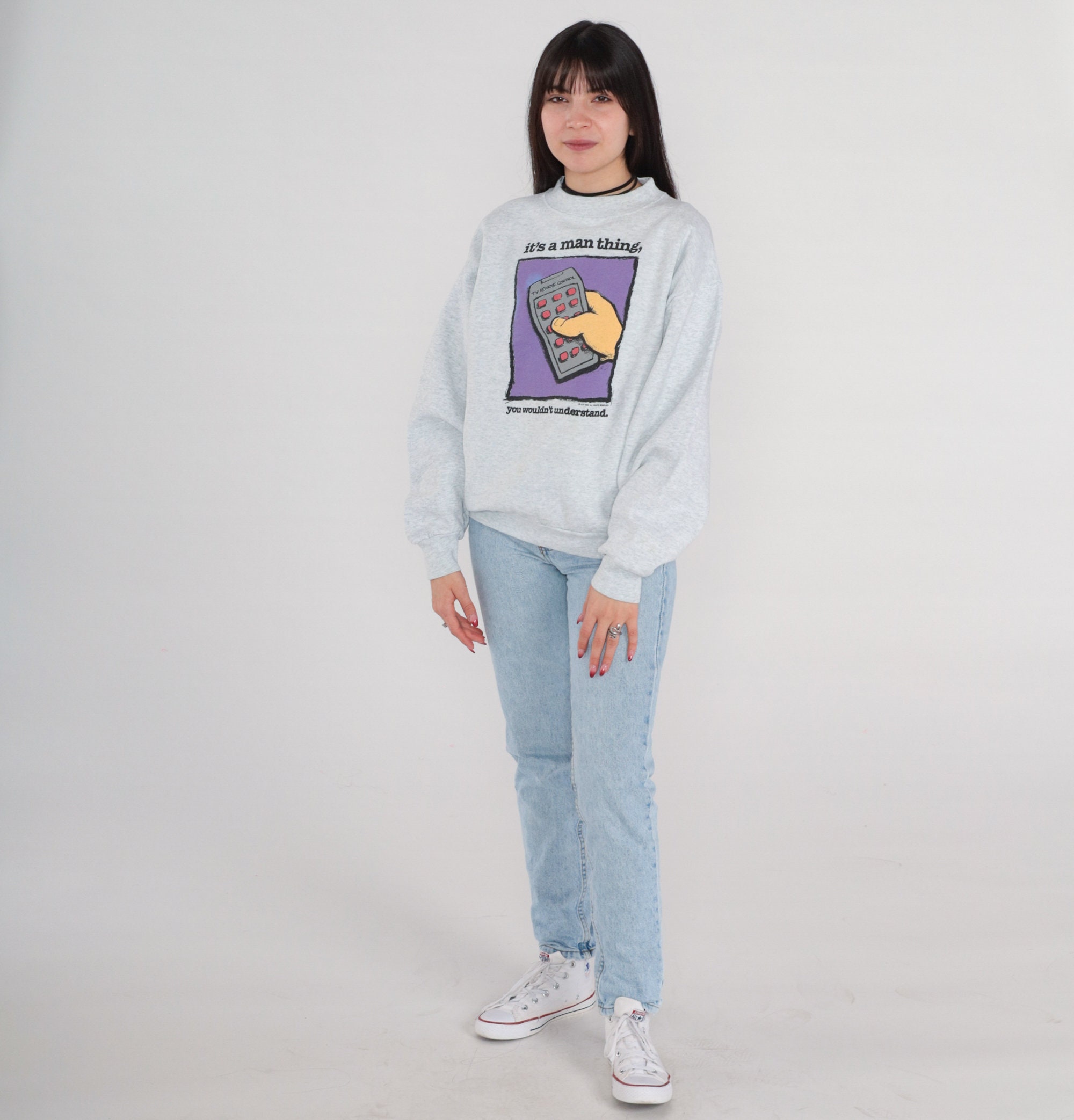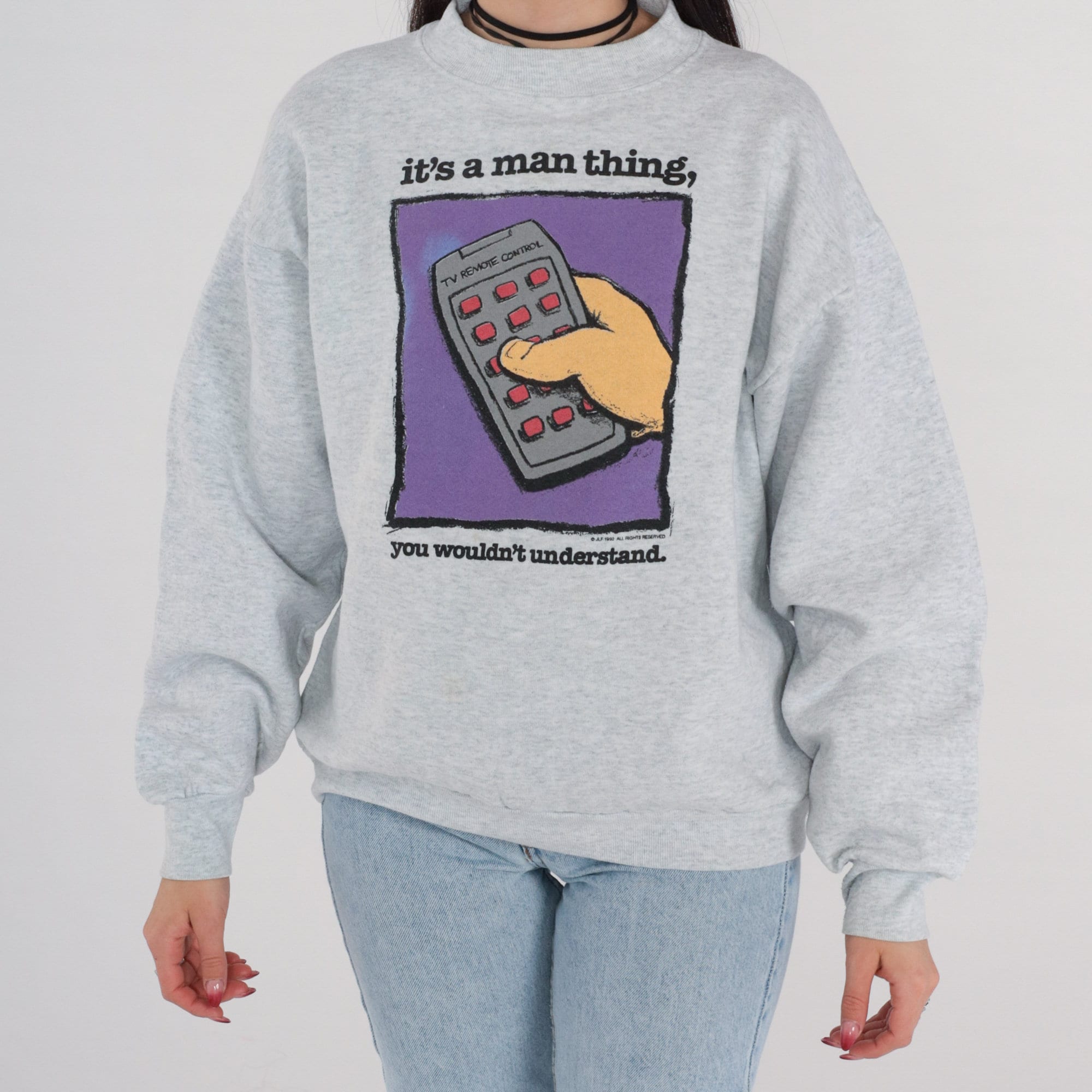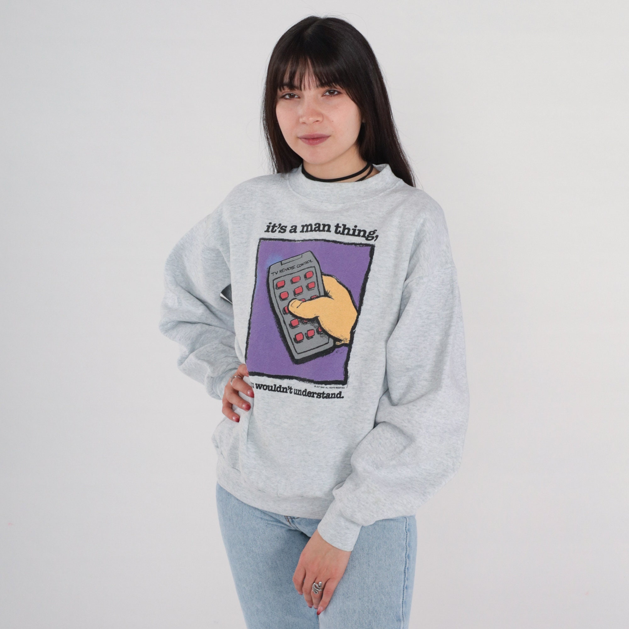 Vintage 90s sweatshirt with a remote control print and "It's a man thing, you wouldn't understand" on the front.