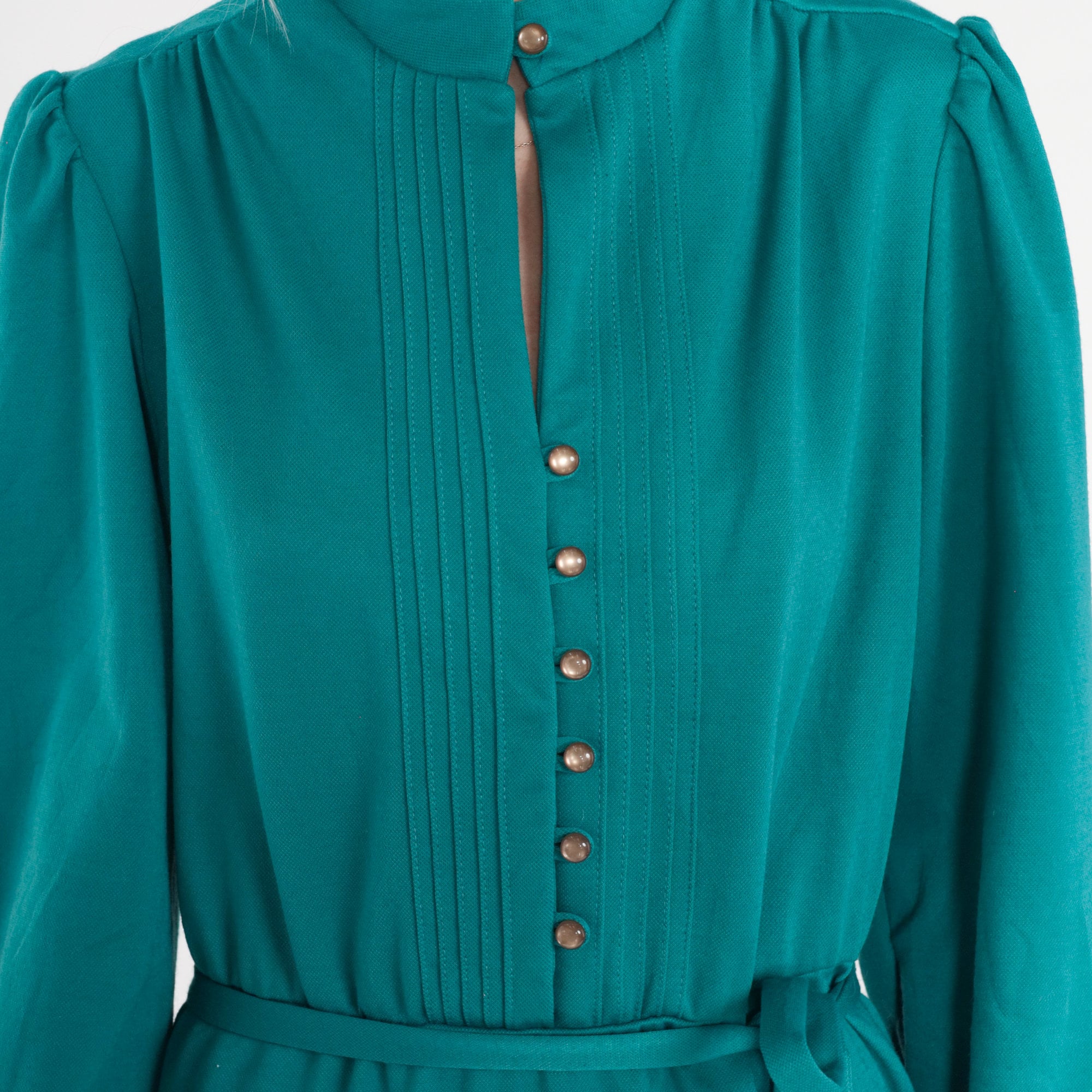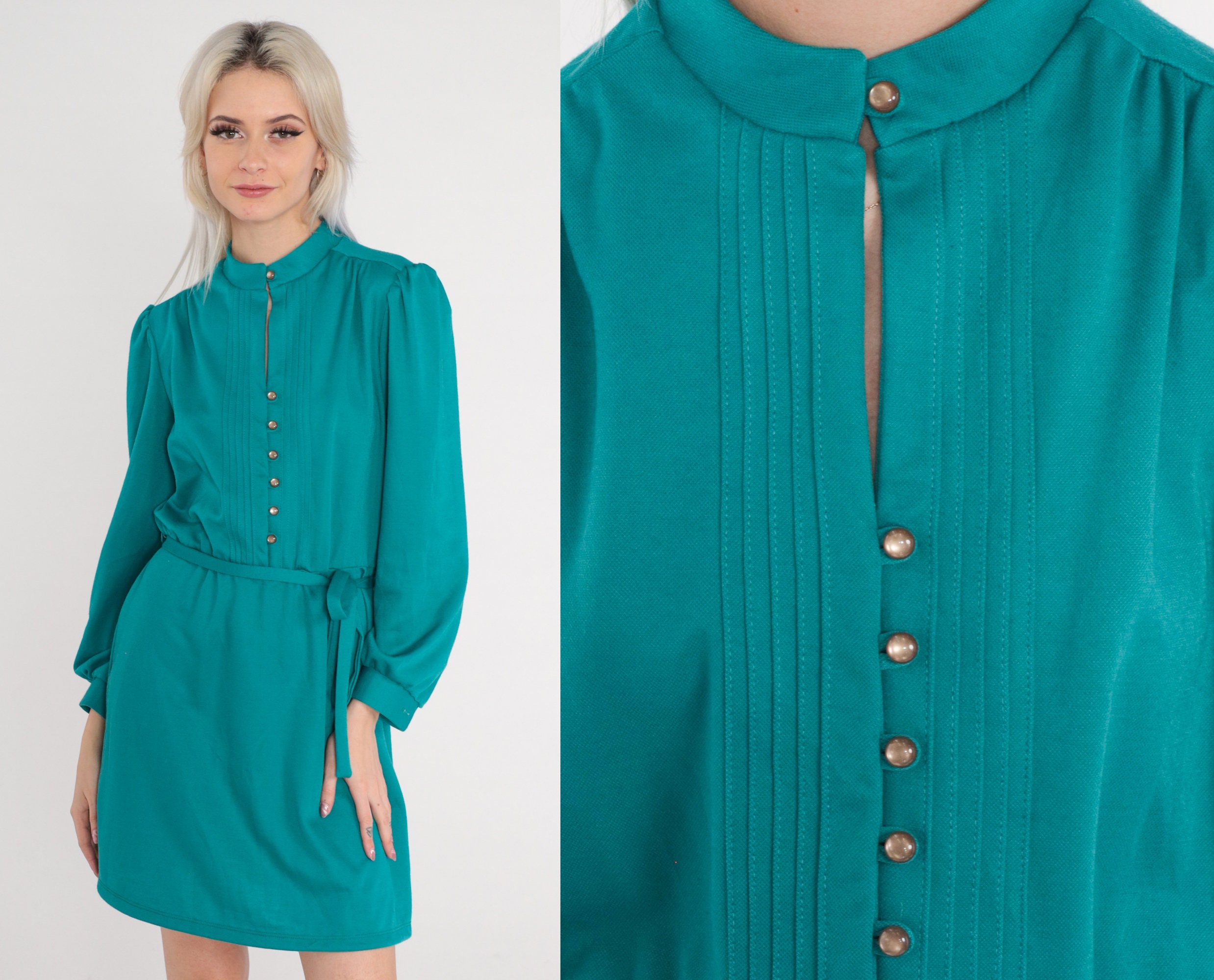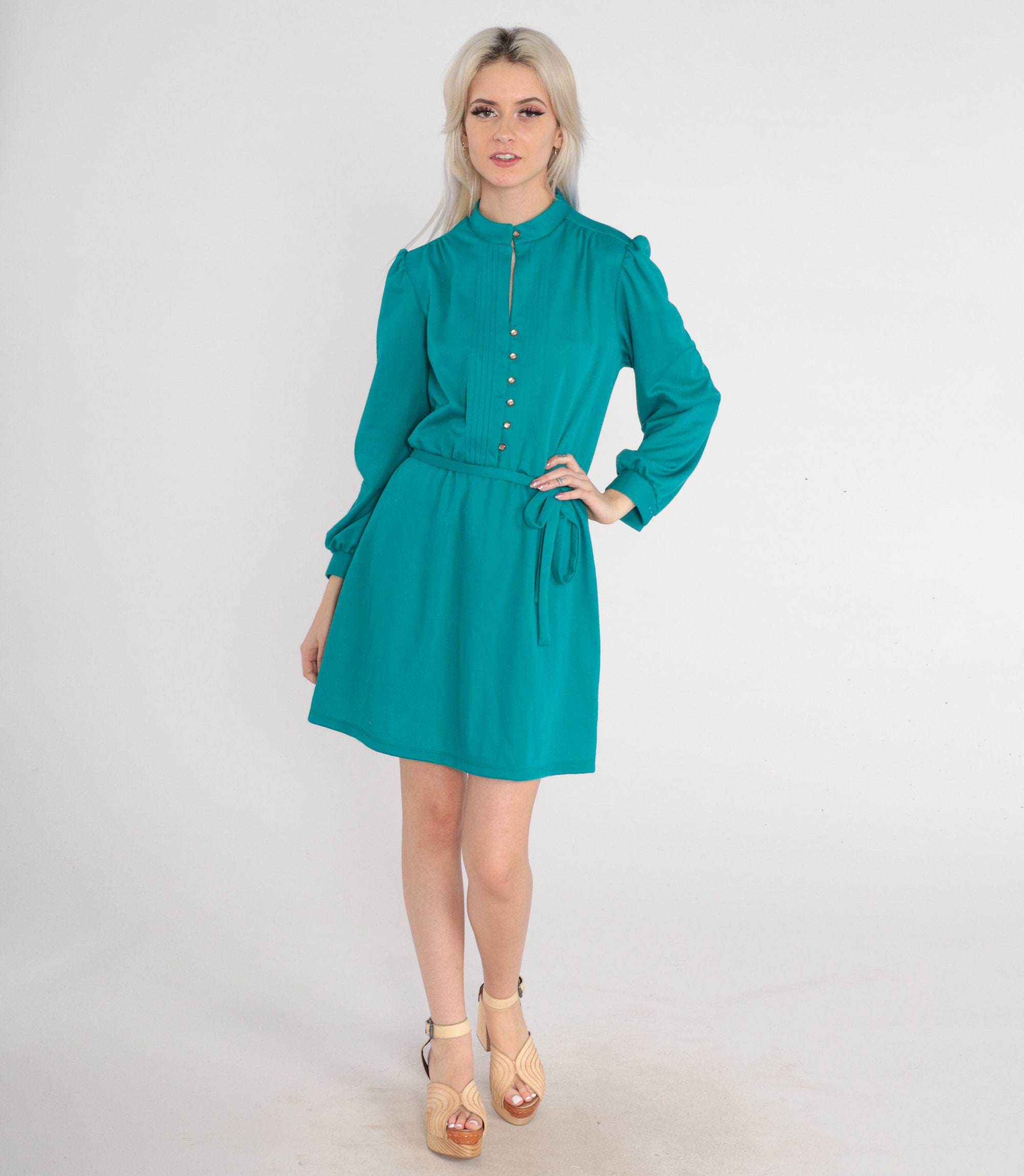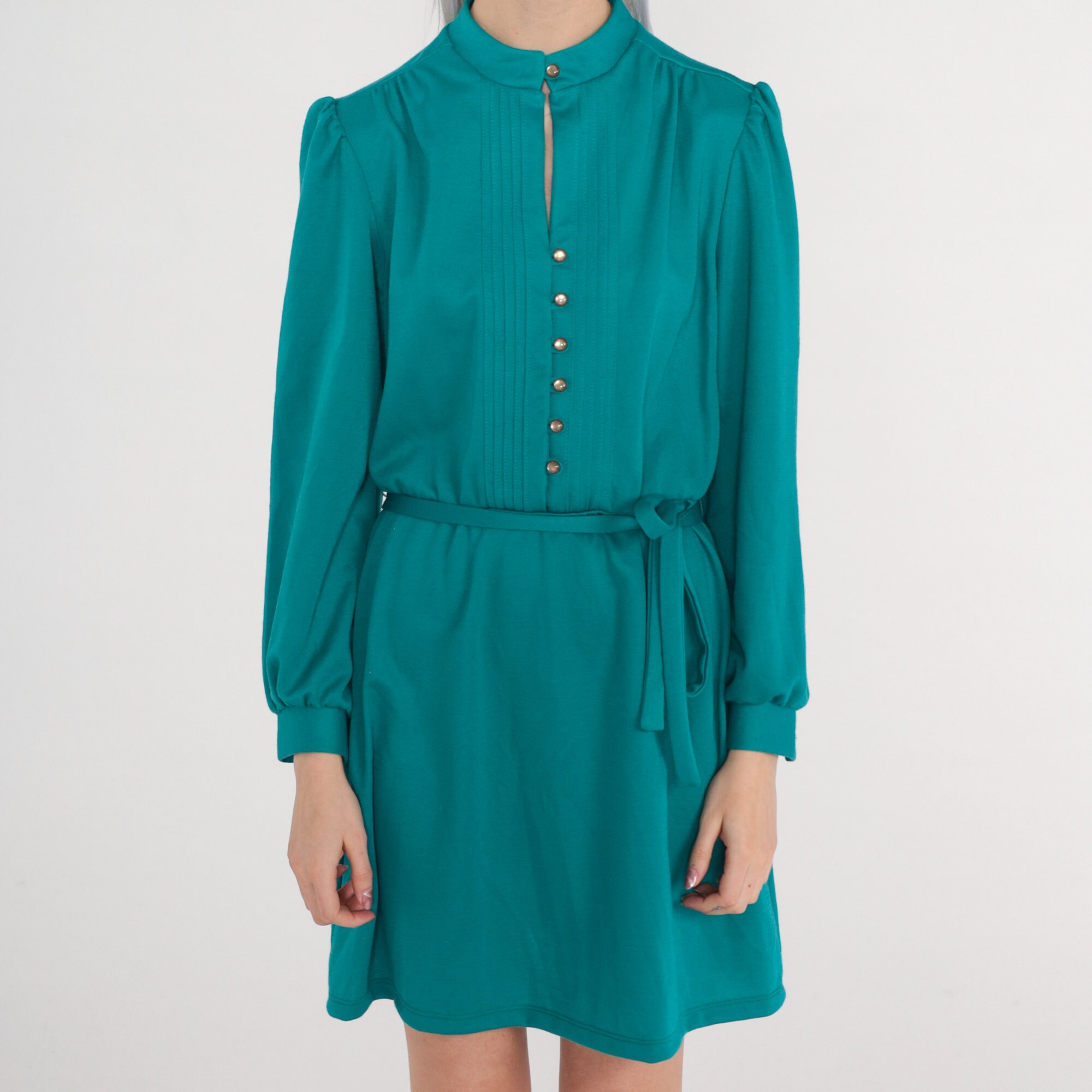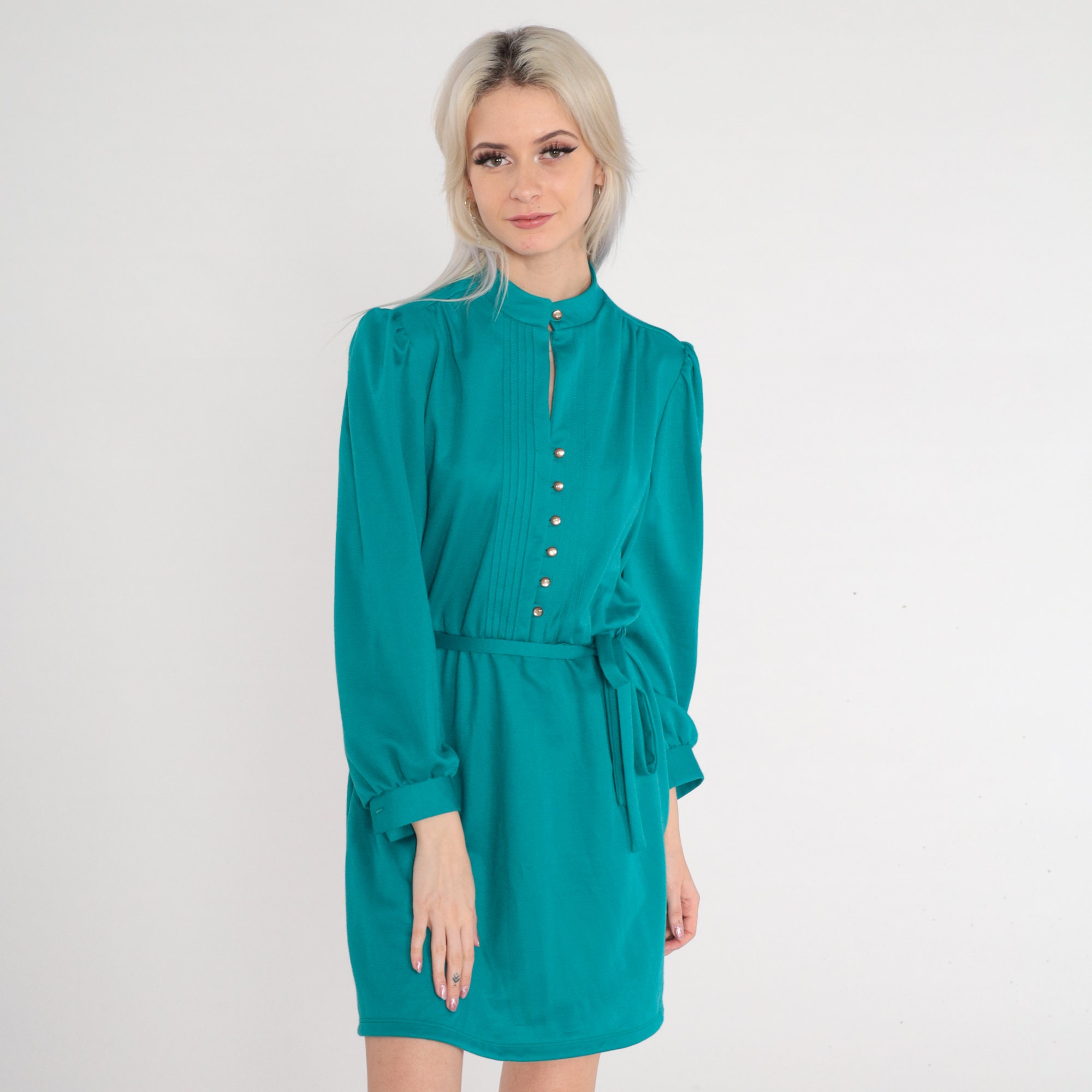 Vintage 80s dress in a teal green wool blend. High waisted with a tie belt, a pleated bodice, long puff sleeves, and buttons up the chest. Mini length.