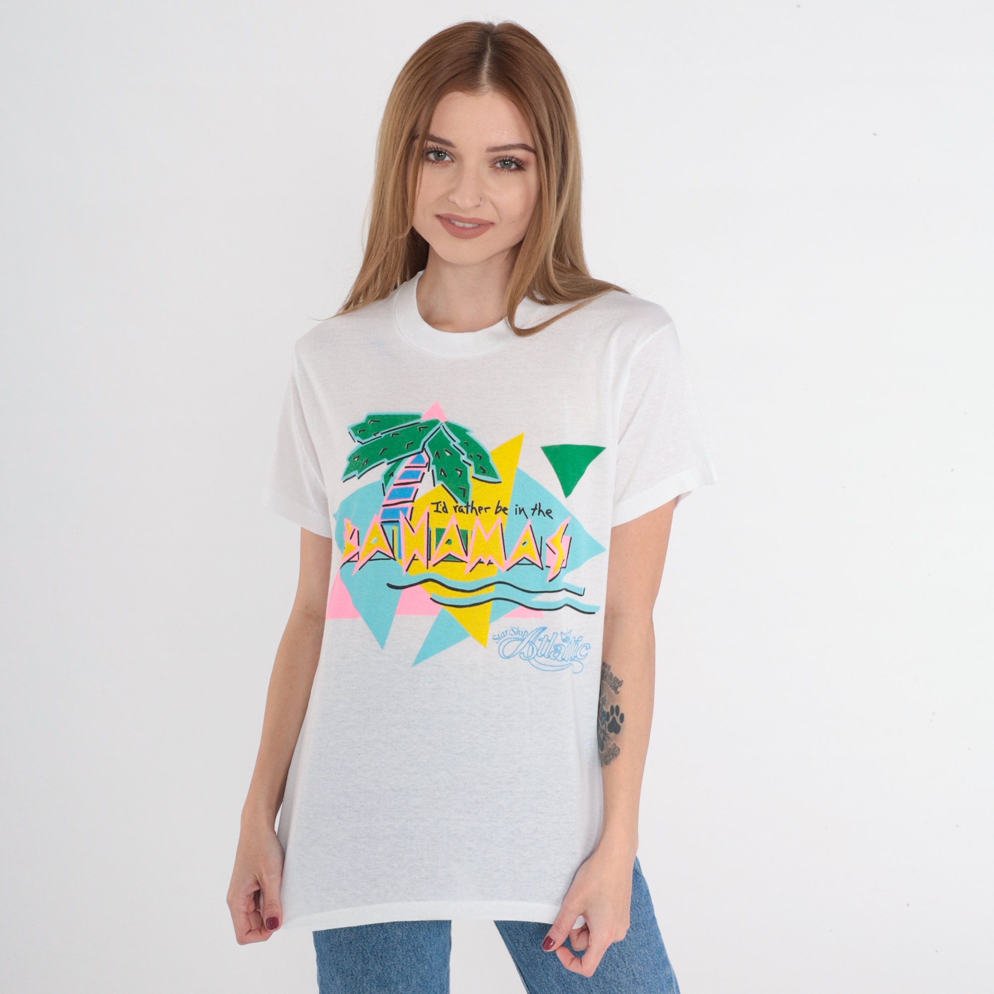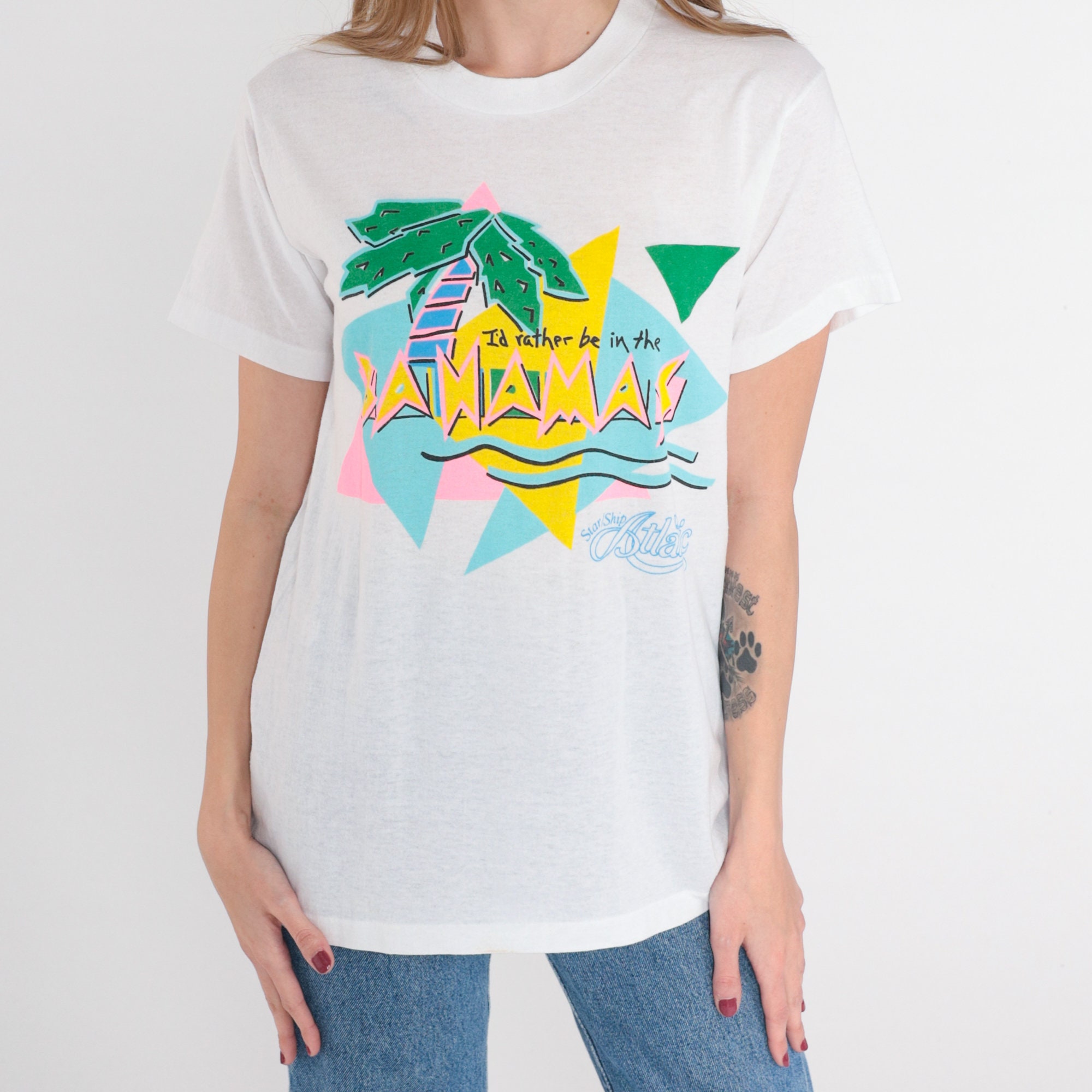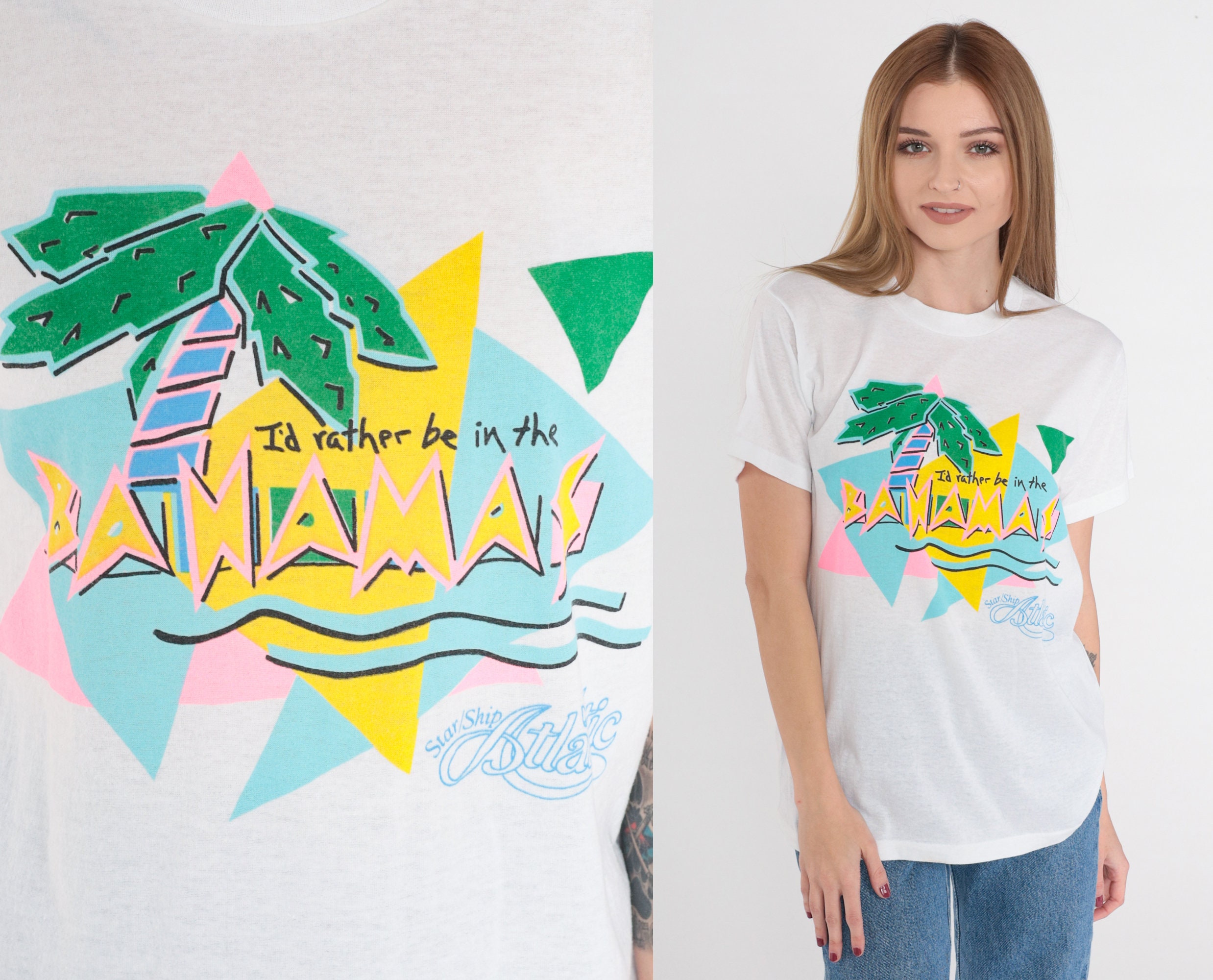 Vintage 80s t shirt with "I'd Rather Be in the Bahamas" and beach print with palm trees and a Star Ship Atlantic graphic on the front.