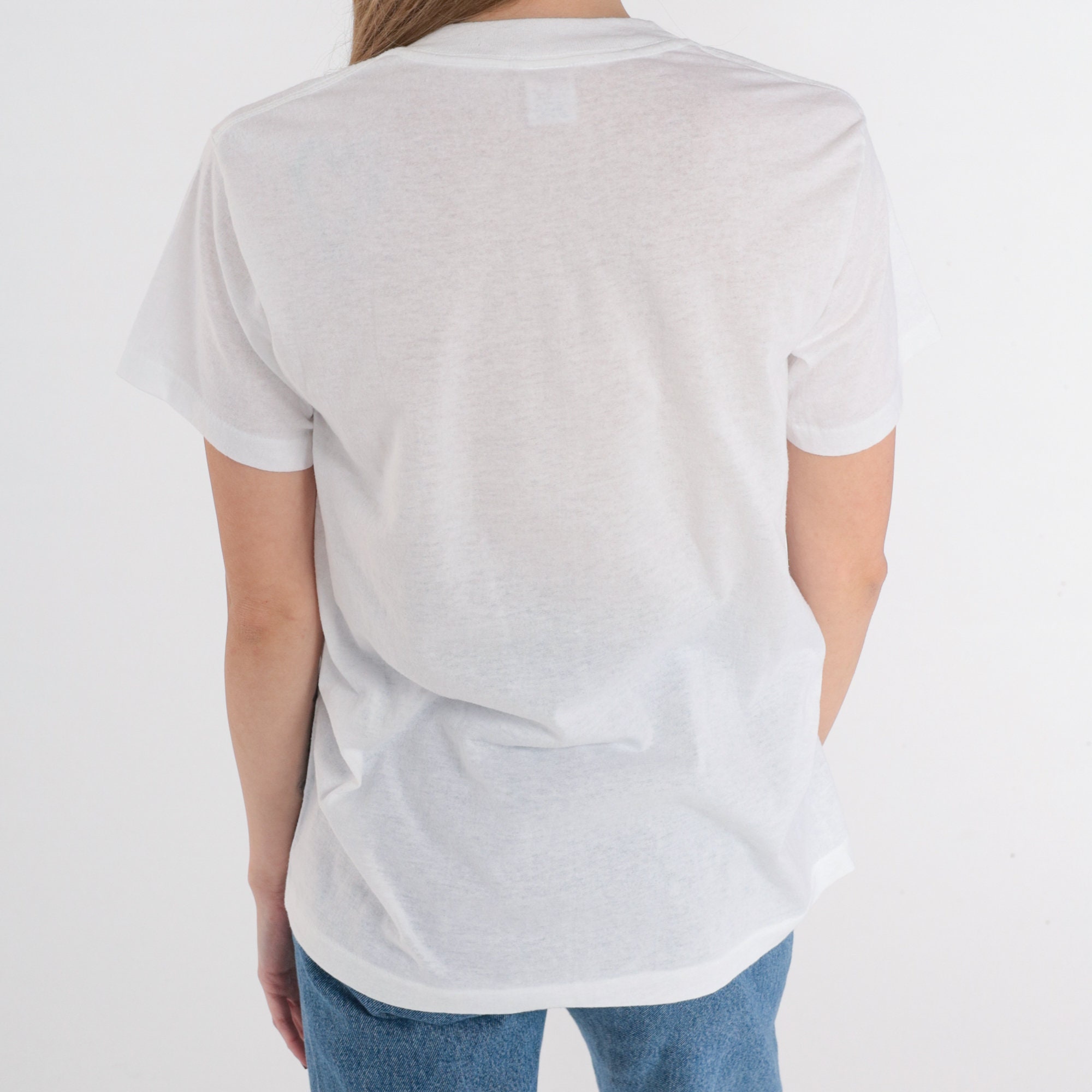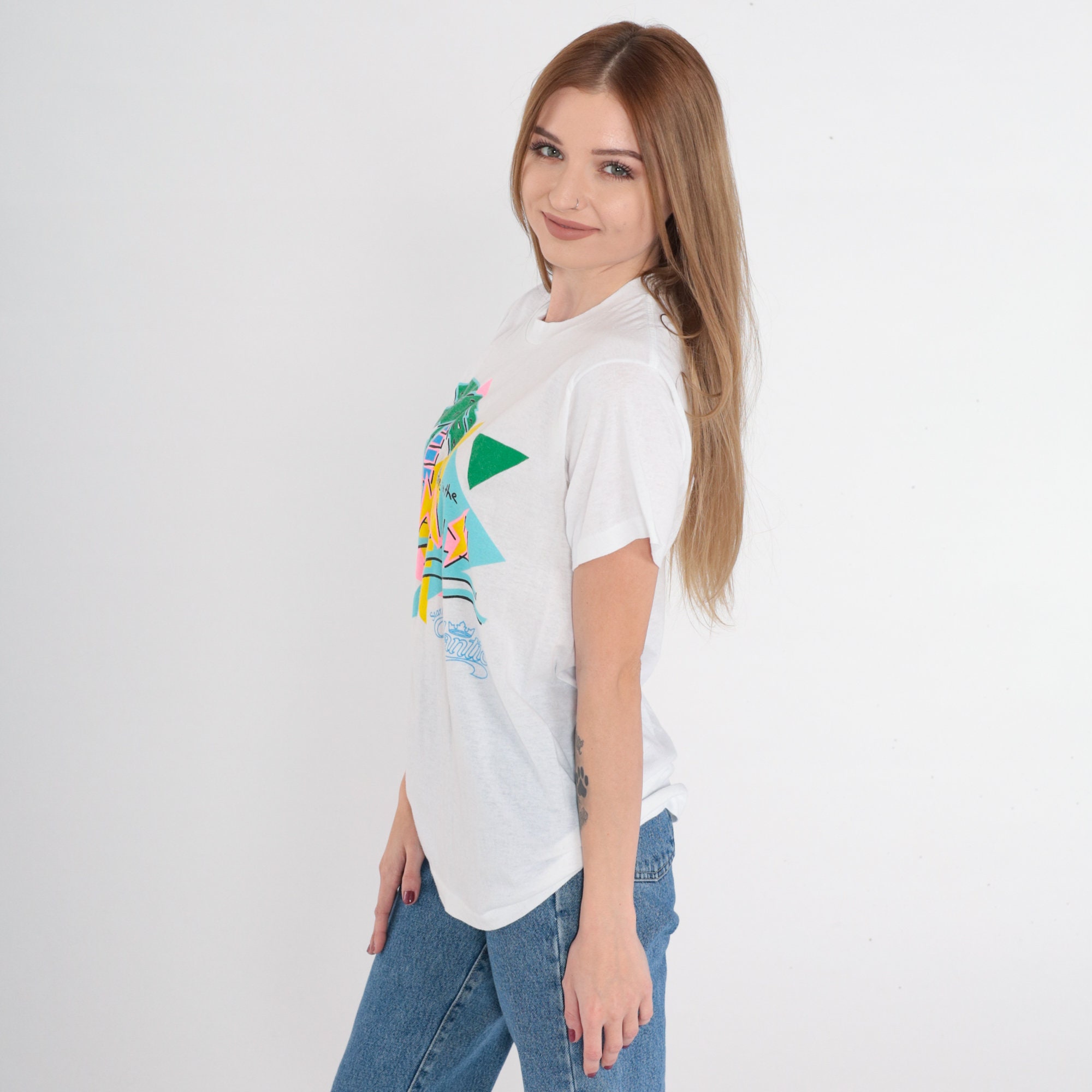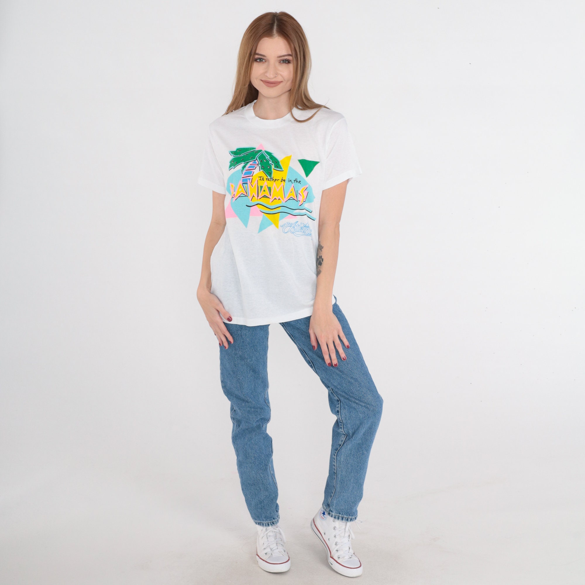 Vintage 80s t shirt with "I'd Rather Be in the Bahamas" and beach print with palm trees and a Star Ship Atlantic graphic on the front.