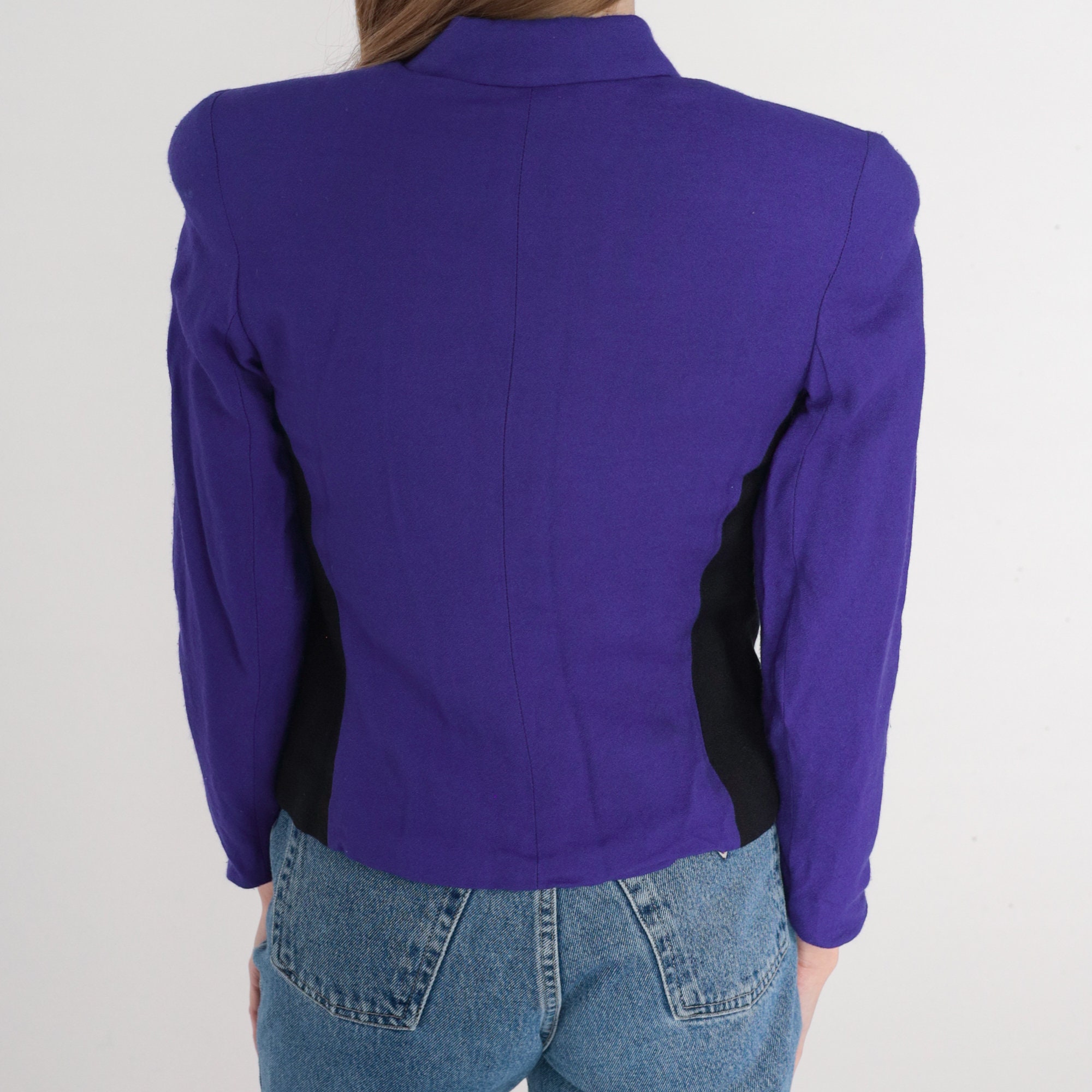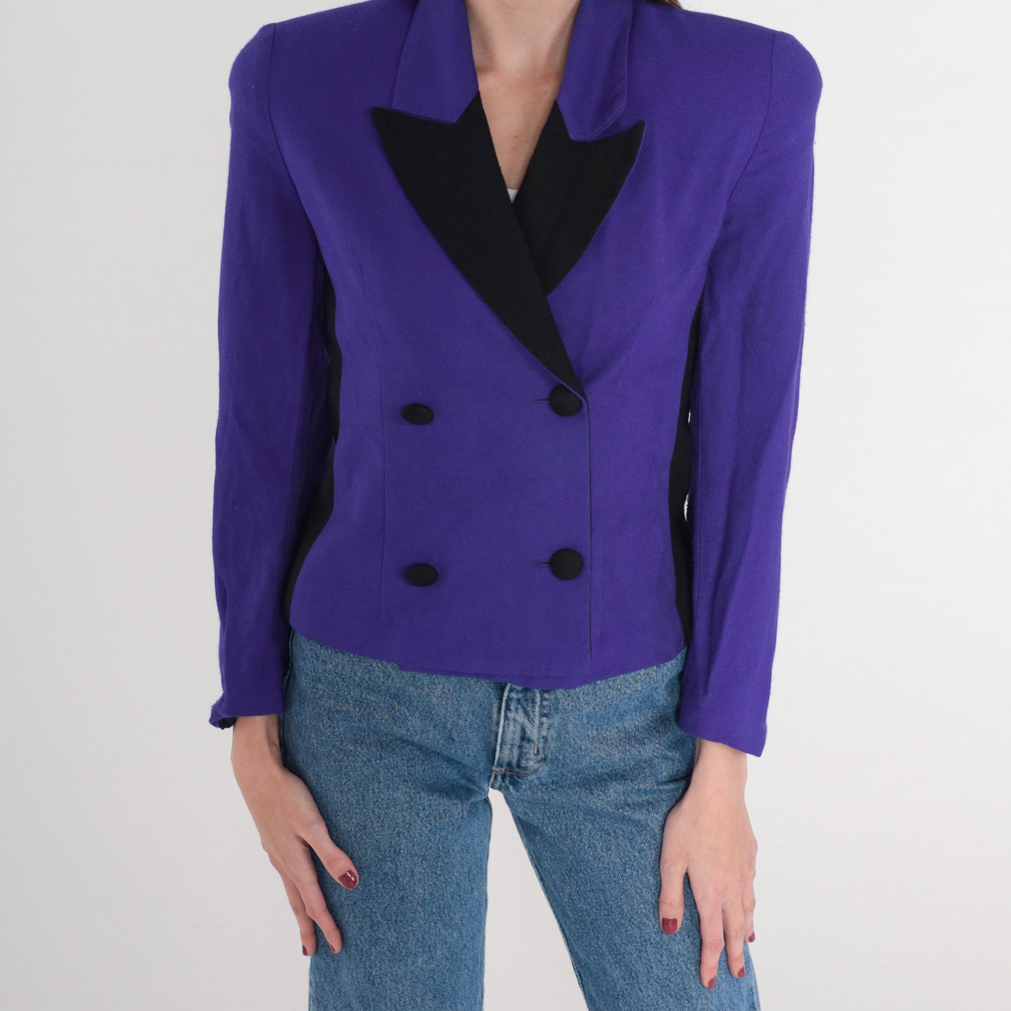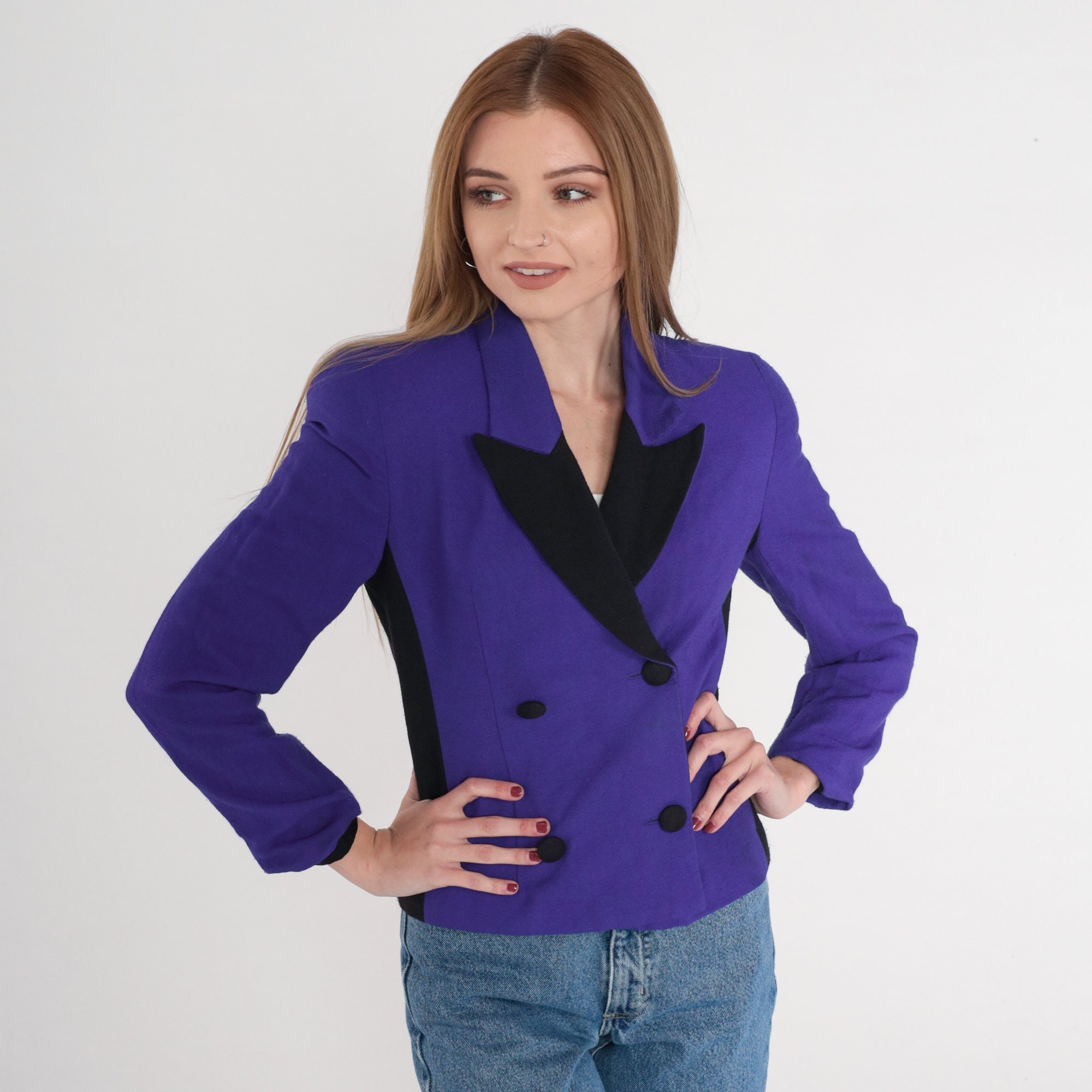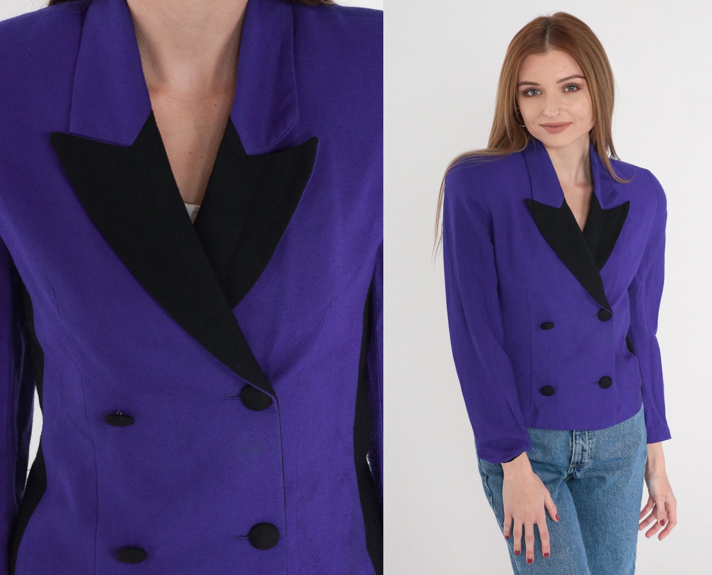Vintage 90s blazer jacket in royal purple with black trim and double breasted buttons up the front. Power shoulders.