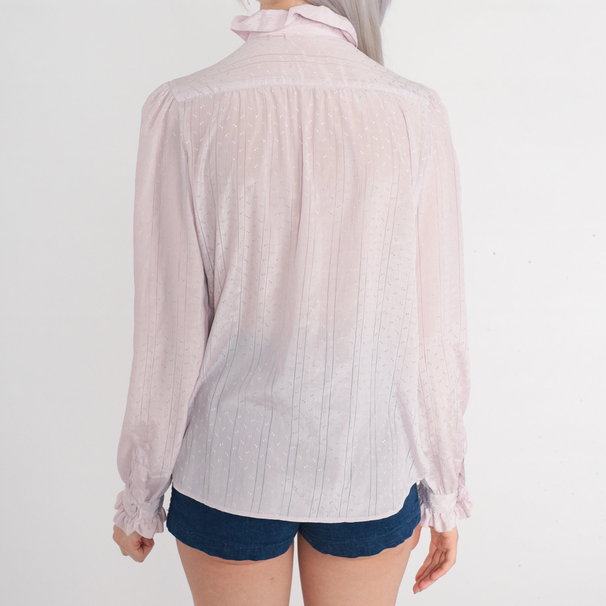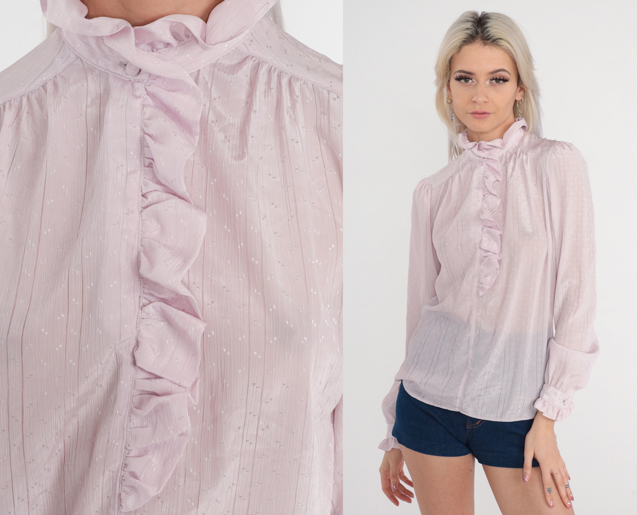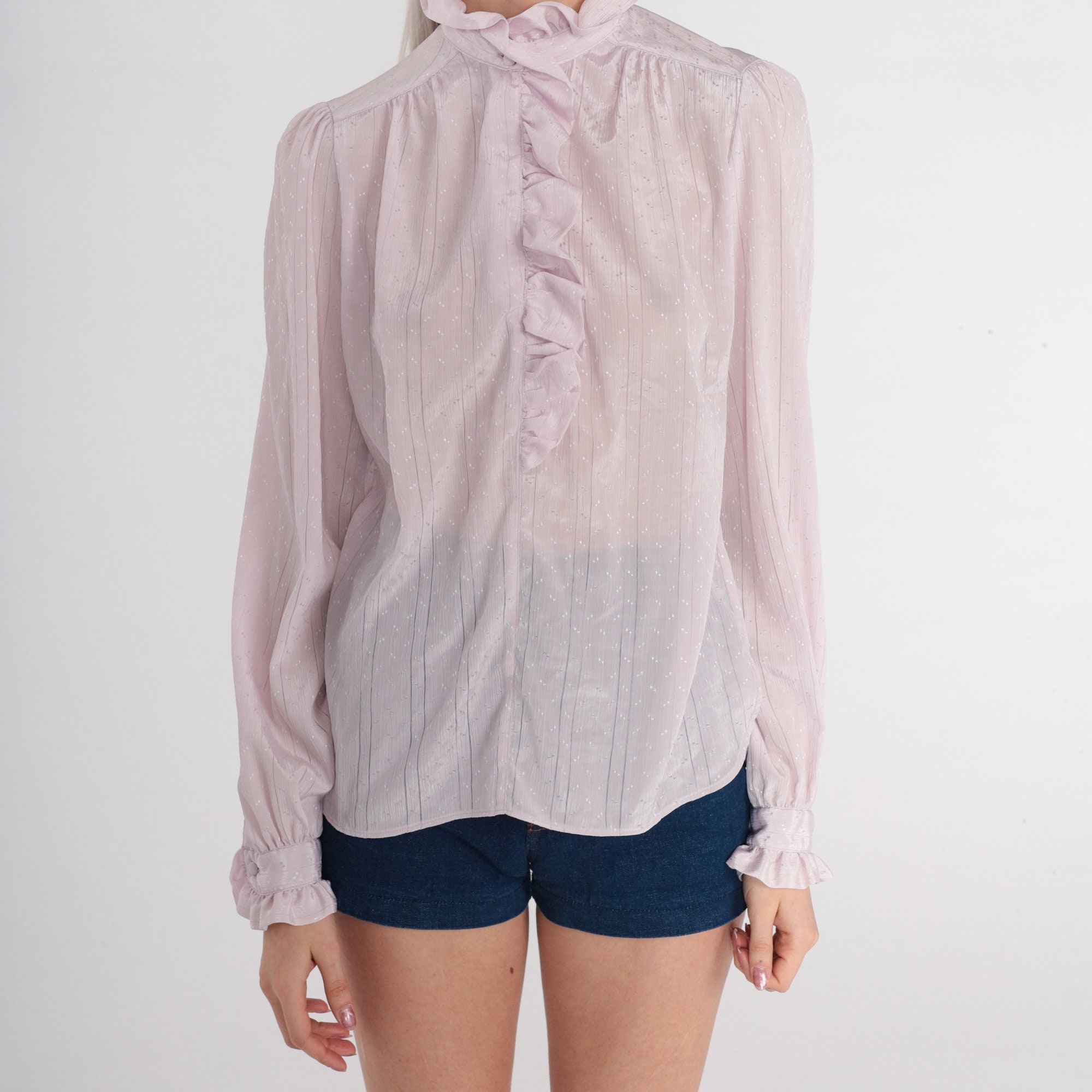 Vintage 80s blouse in Semi-Sheer lavender with a subtle shiny striped and dot print and a high ruffled neck. Buttons up the front with long puff sleeves.