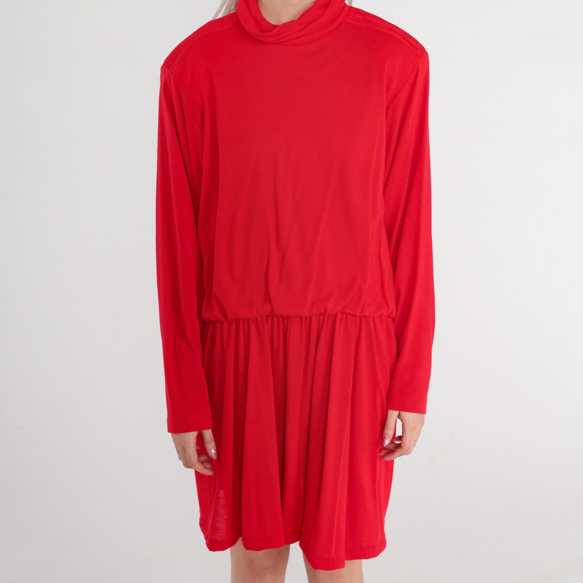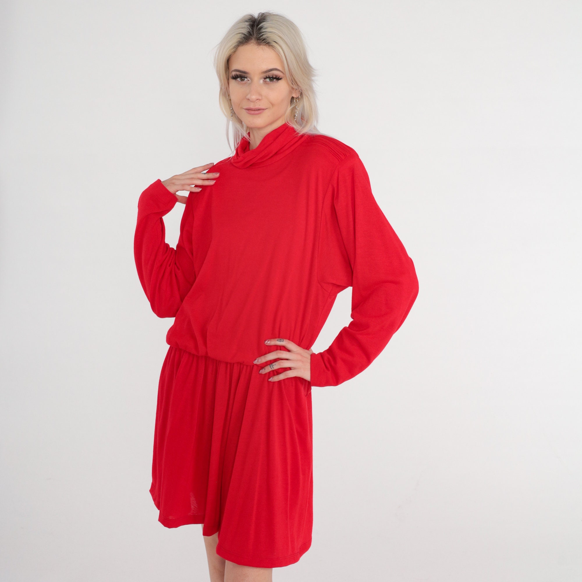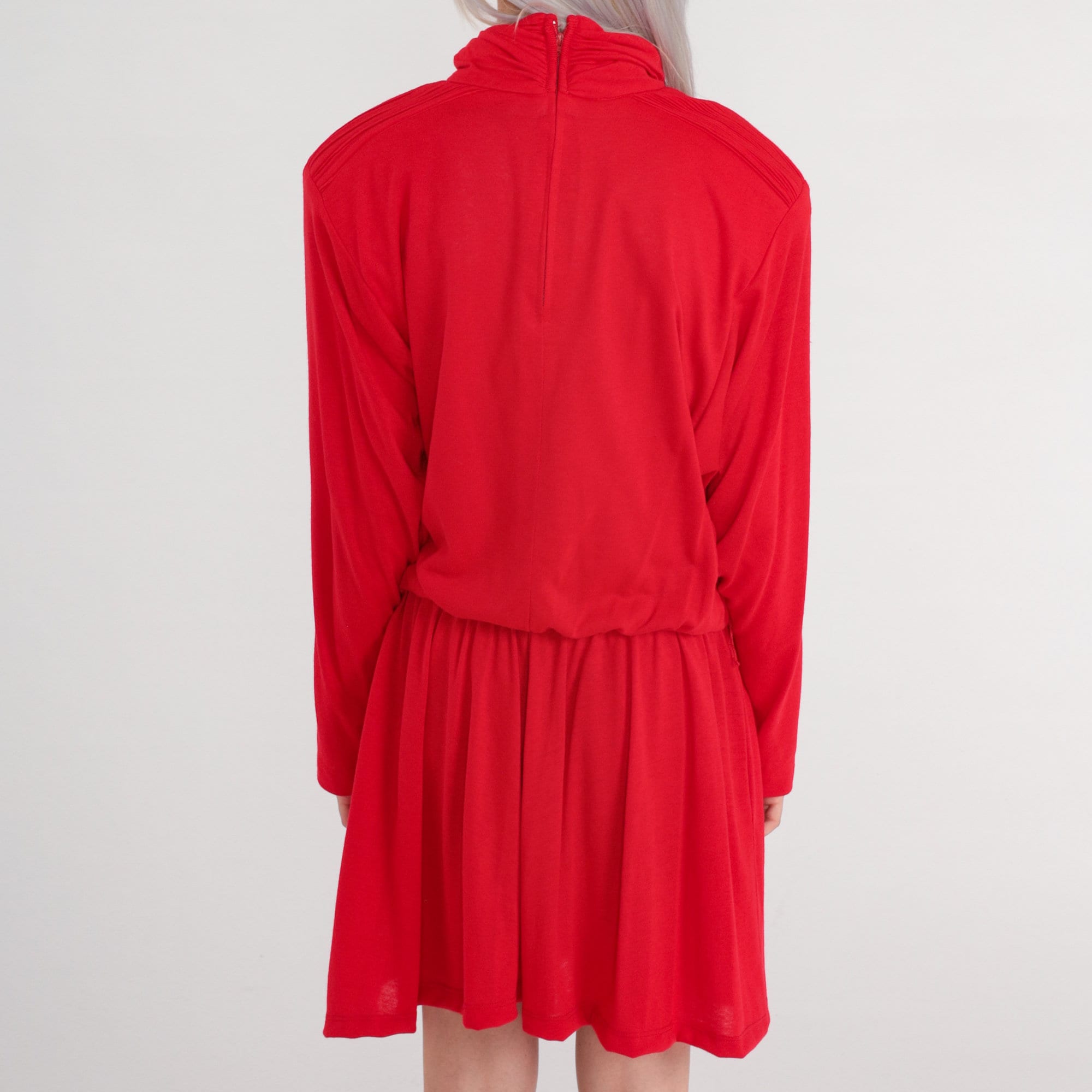 Vintage 80s dress in red with a blouson bodice and a pleated skirt. High waisted with a slouchy turtleneck, a pocket at the hip, and long sleeves. Mini length with a rear zipper.
