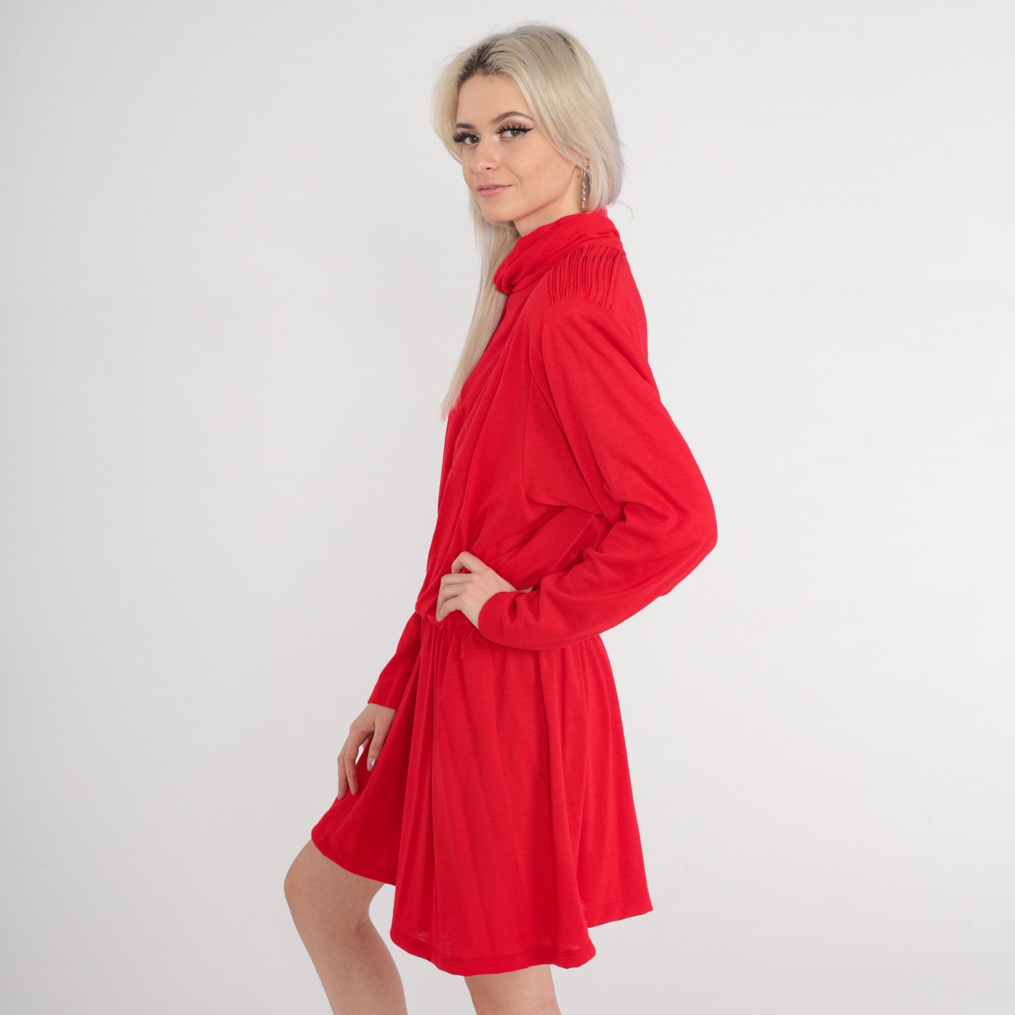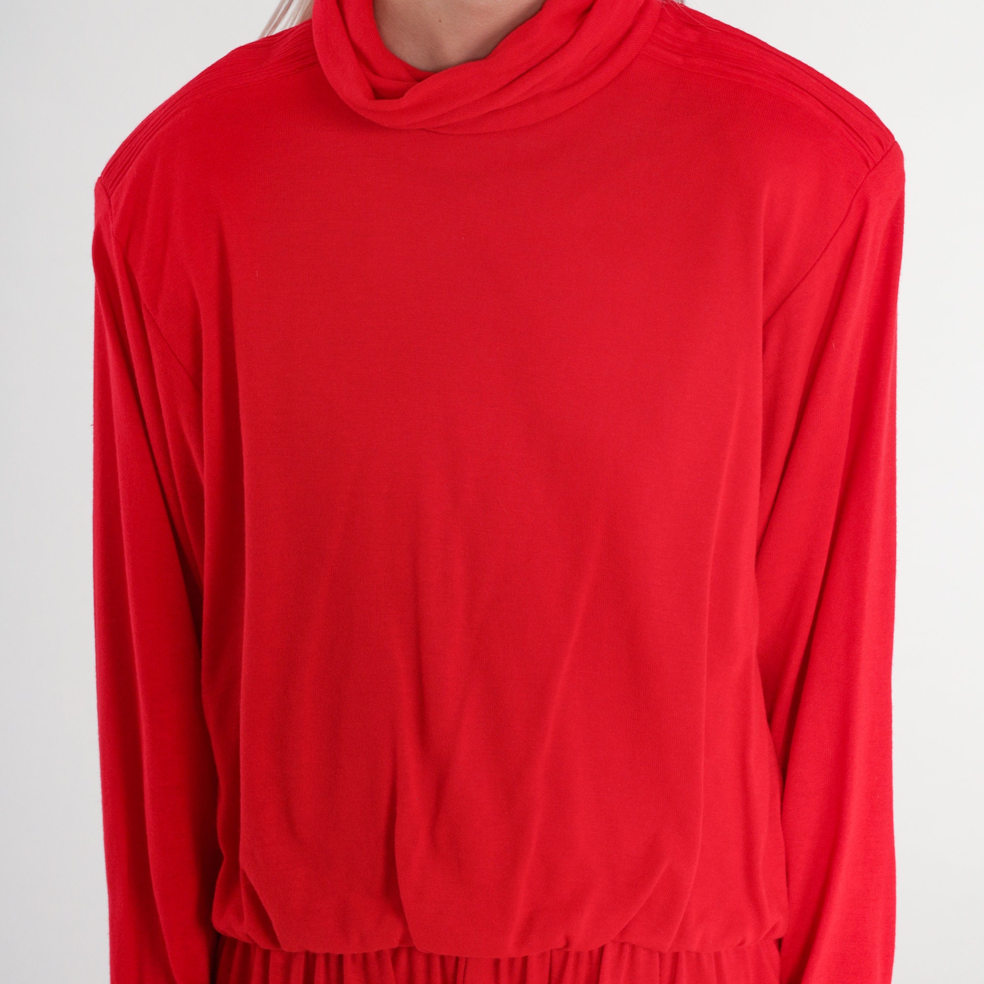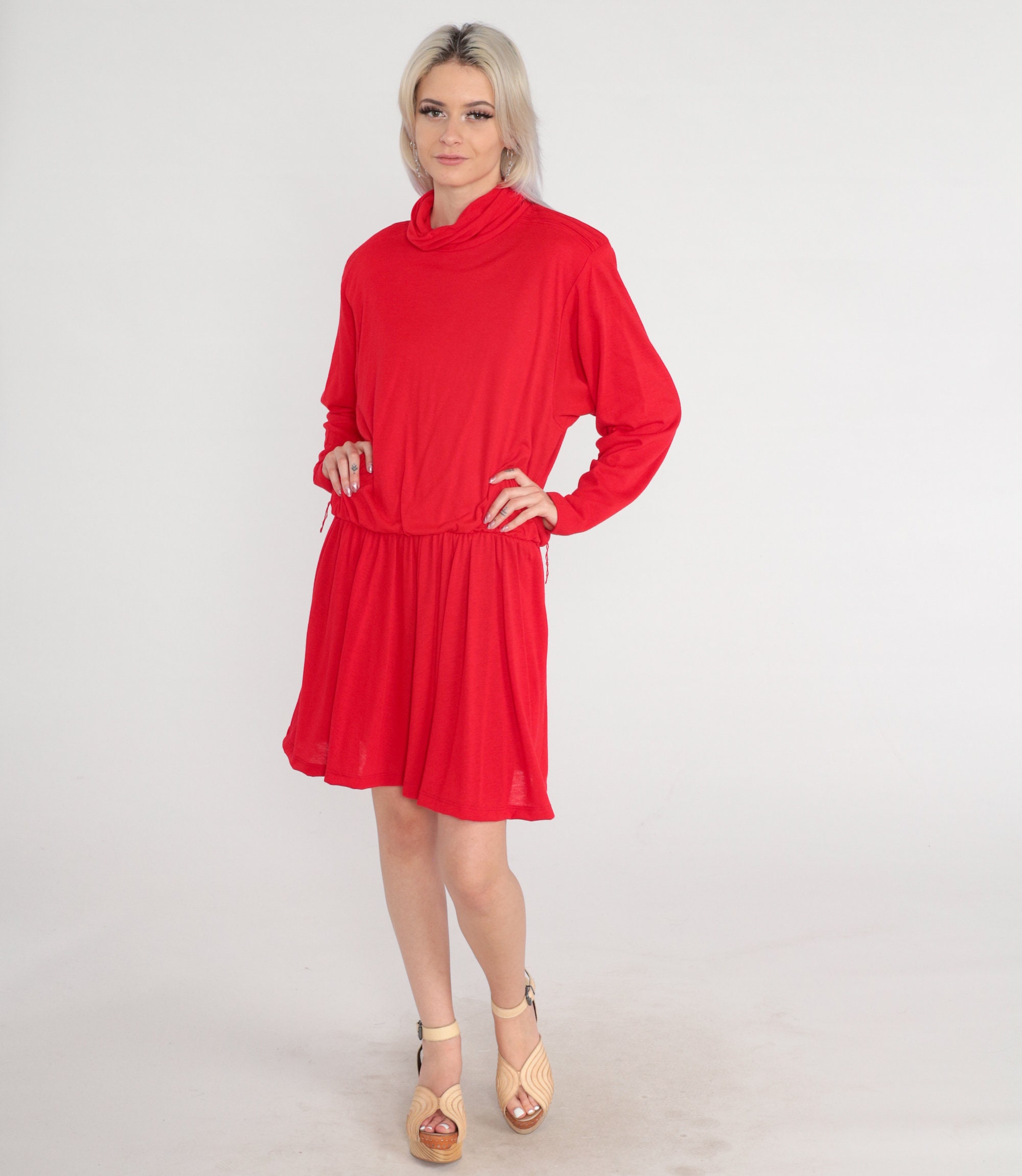 Vintage 80s dress in red with a blouson bodice and a pleated skirt. High waisted with a slouchy turtleneck, a pocket at the hip, and long sleeves. Mini length with a rear zipper.